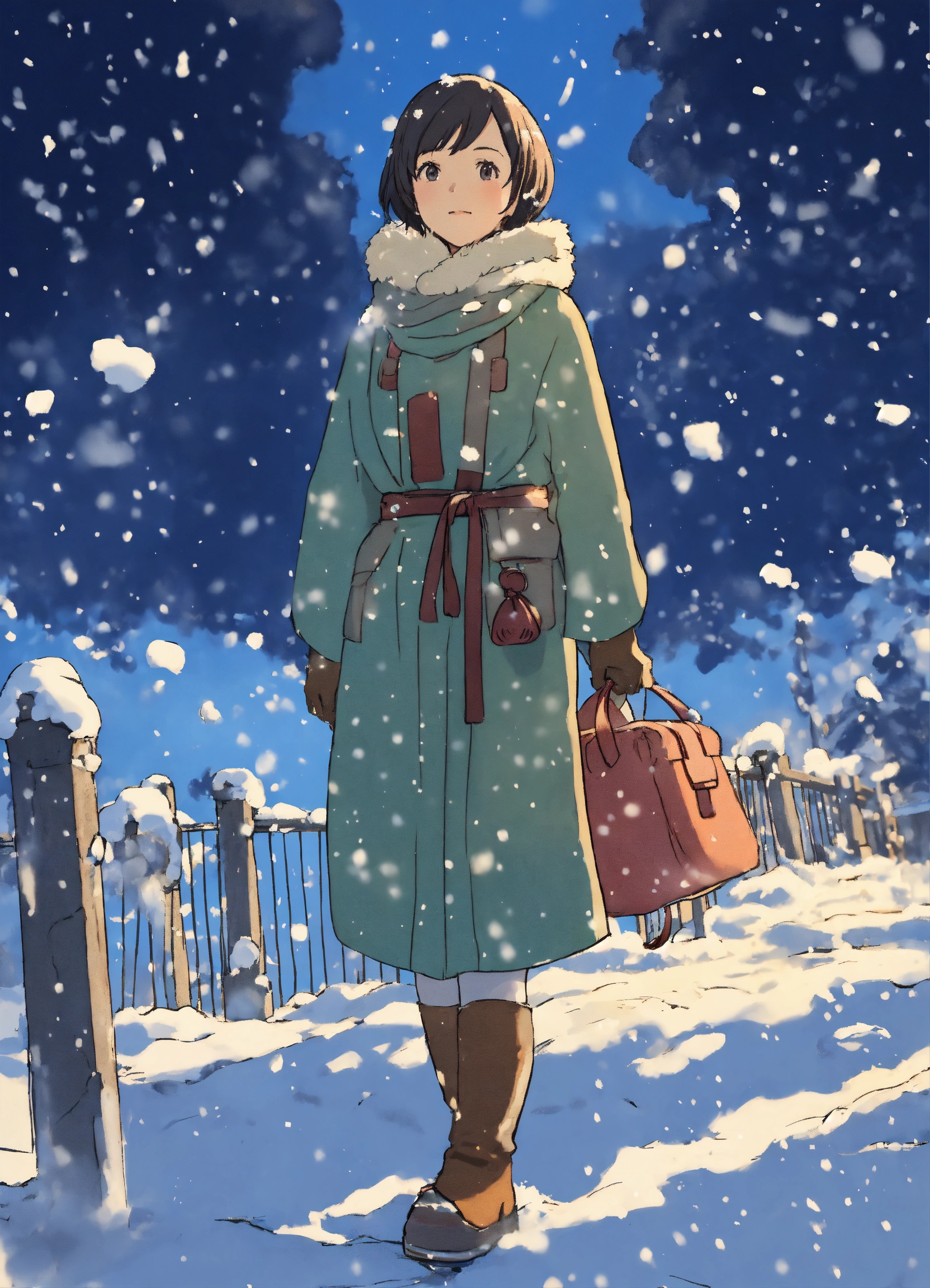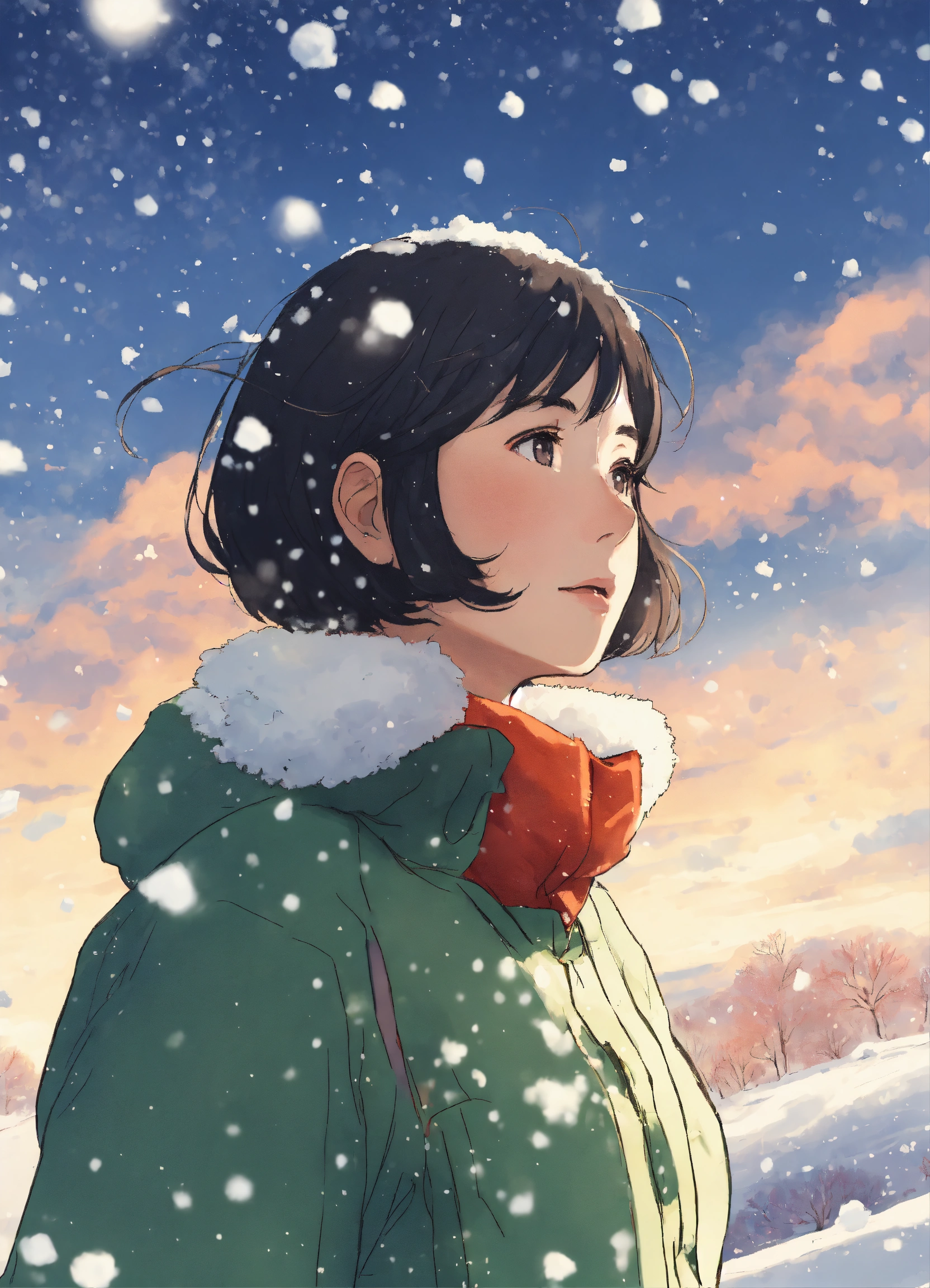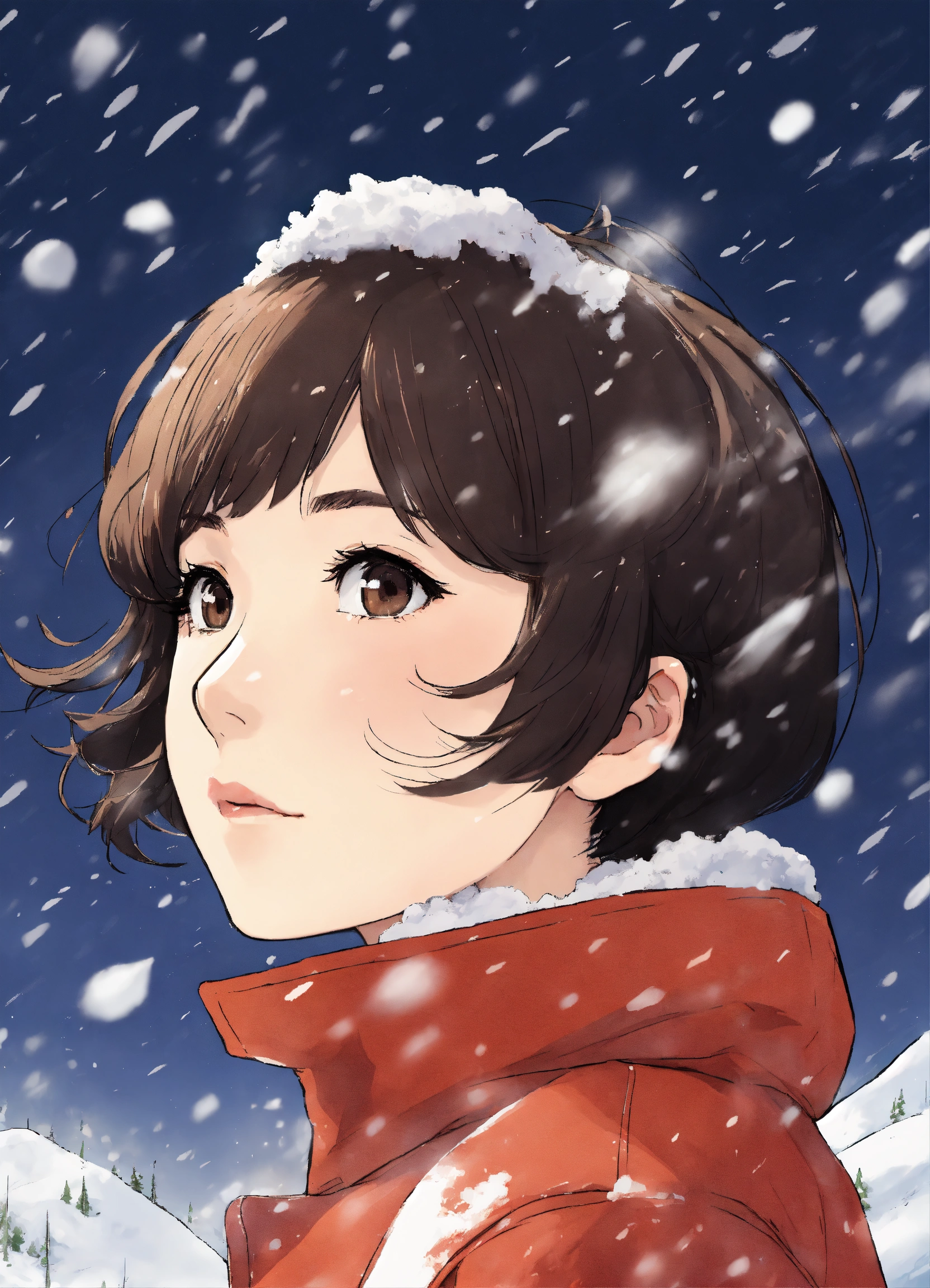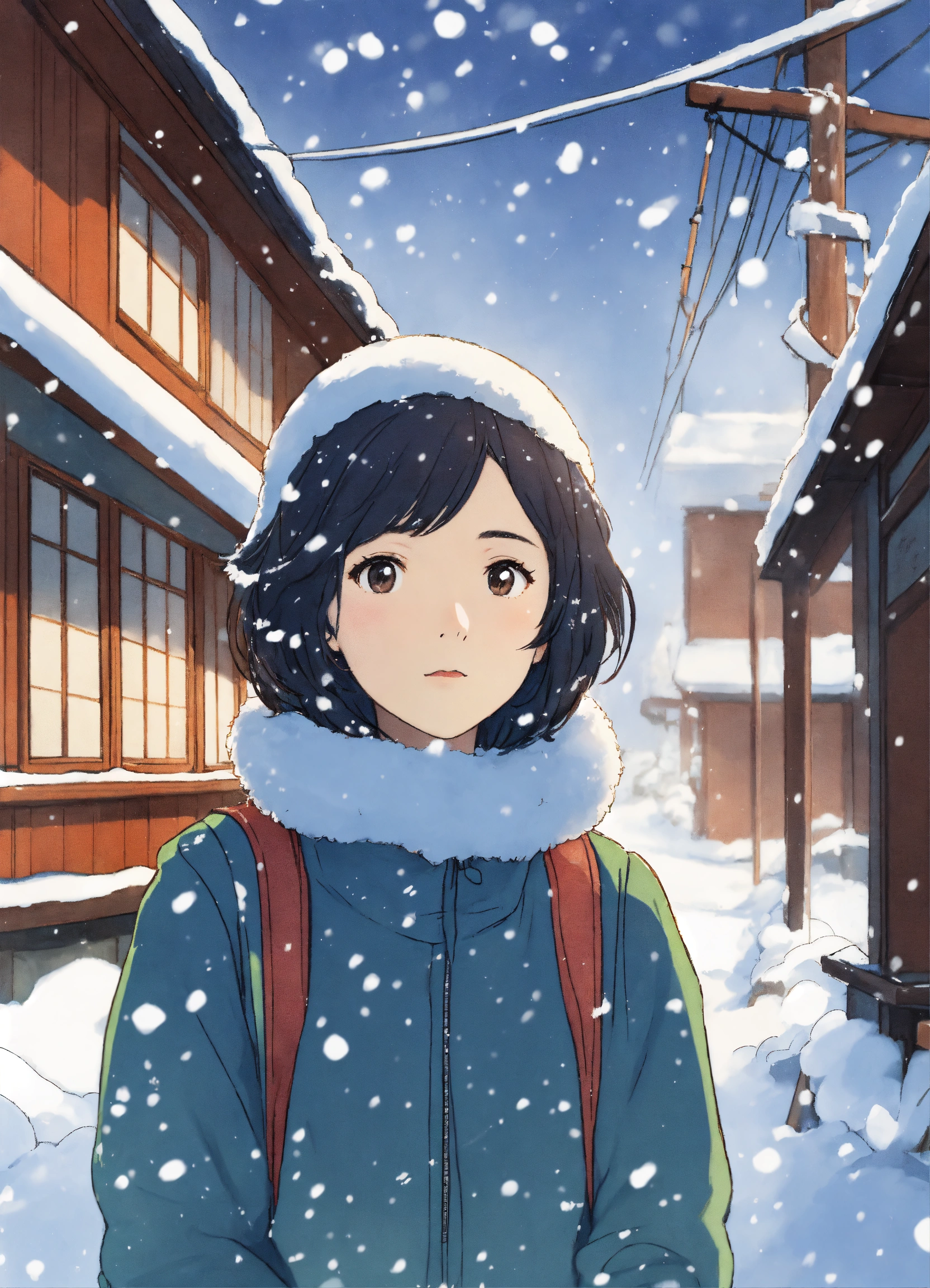1 woman, japanese, short hair, 25 years old, powdery snow falling, studio ghibli style illustration, wide angle