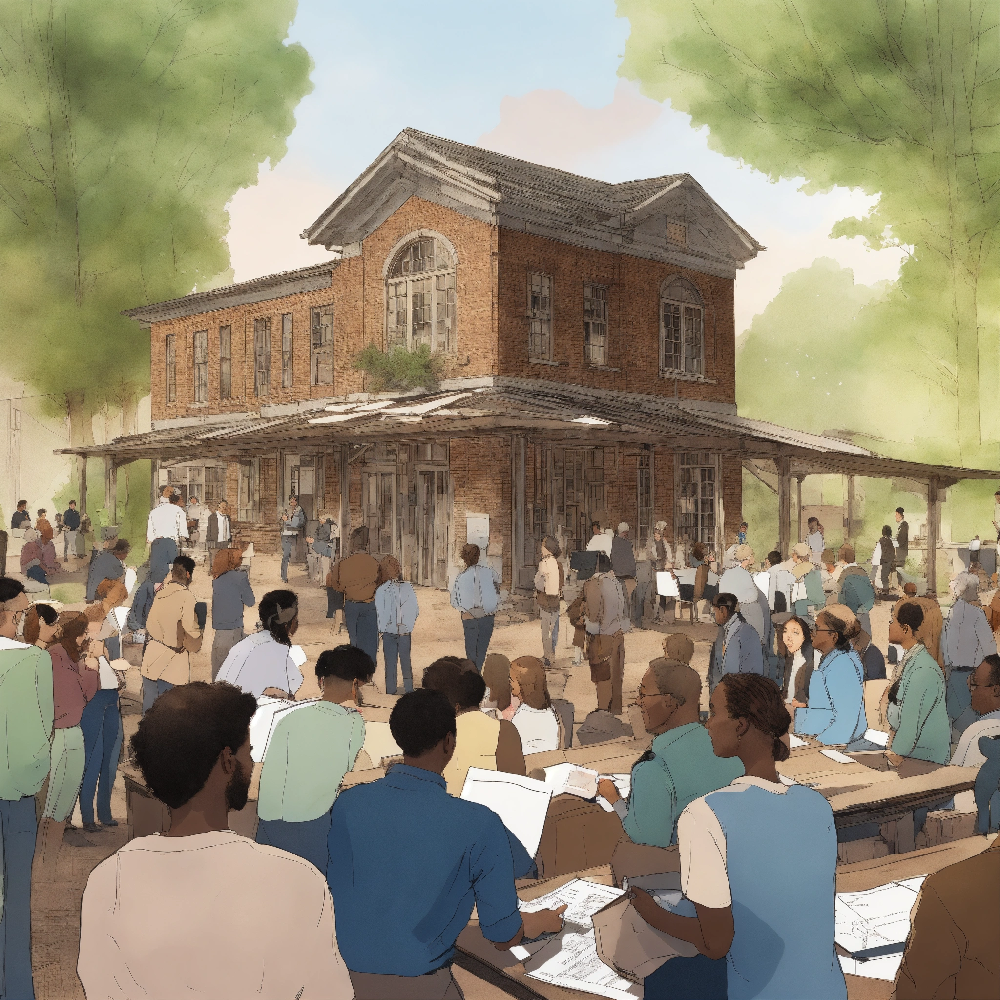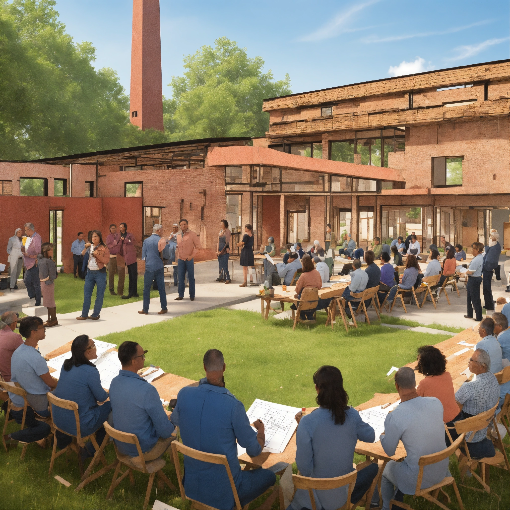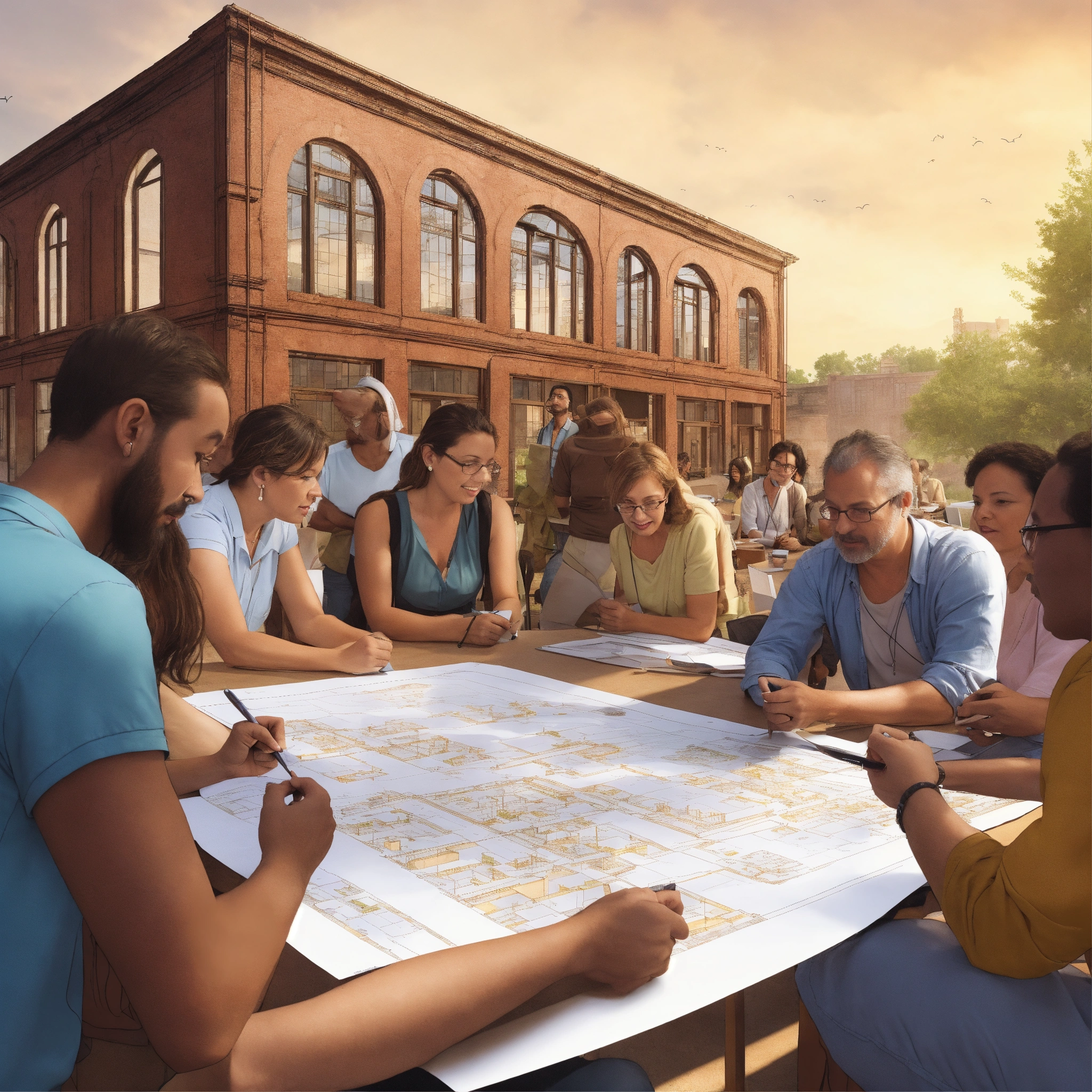 Illustrate a bustling community meeting where members are passionately discussing a blueprint of a sustainable building, with old structures being repurposed in the background.