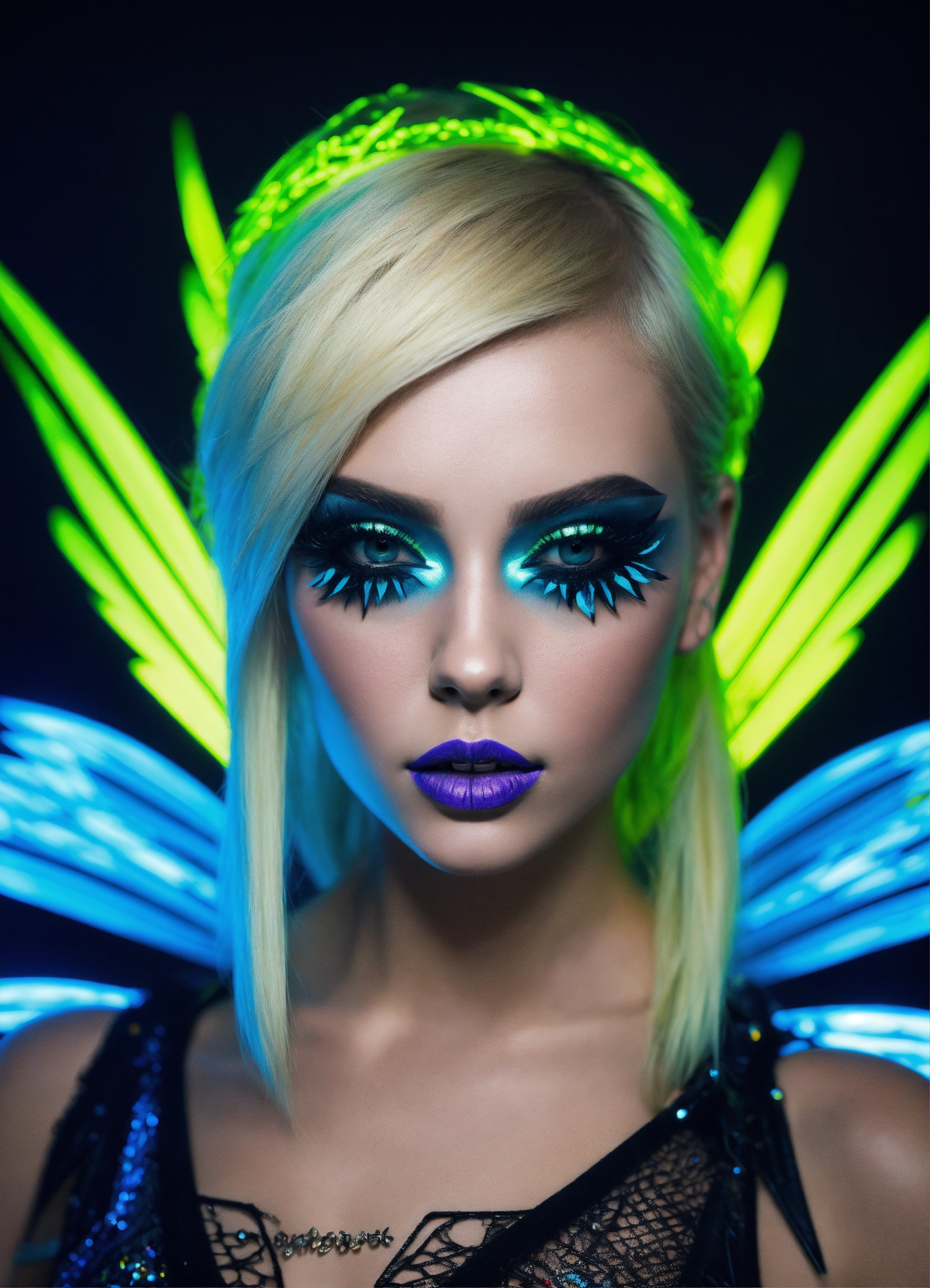 A beautiful blonde female pop artist in avant-garde avant-goth attire, with huge angelwings center piece, dramatic smokey eyes, with depth of field, fantastical edgy and regal themed outfit, captured in neon fluorescent shades, embodying the essence of fantasy, minimalist.
