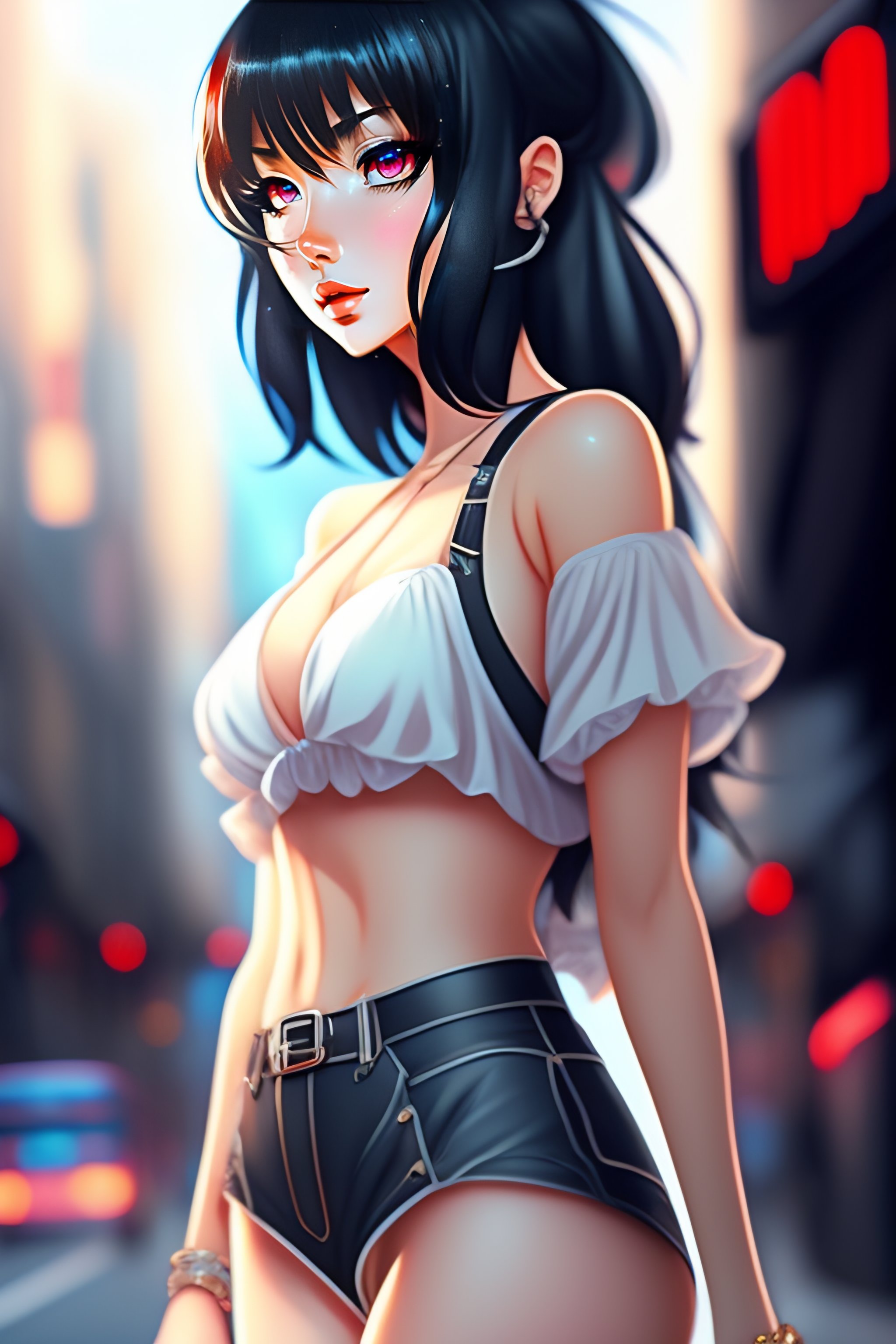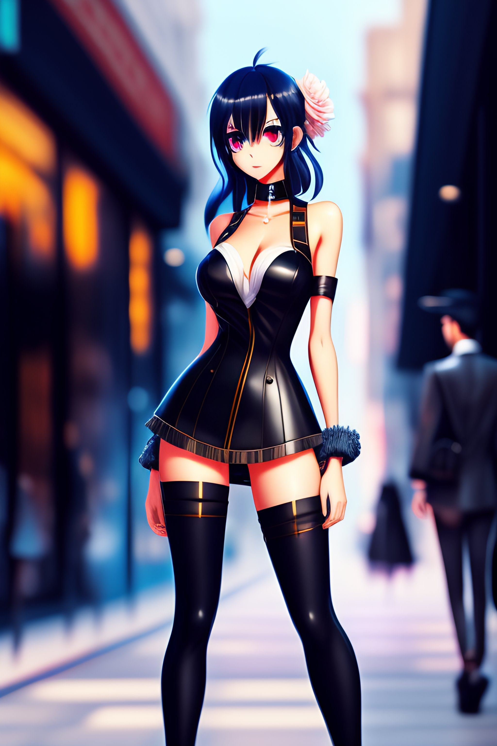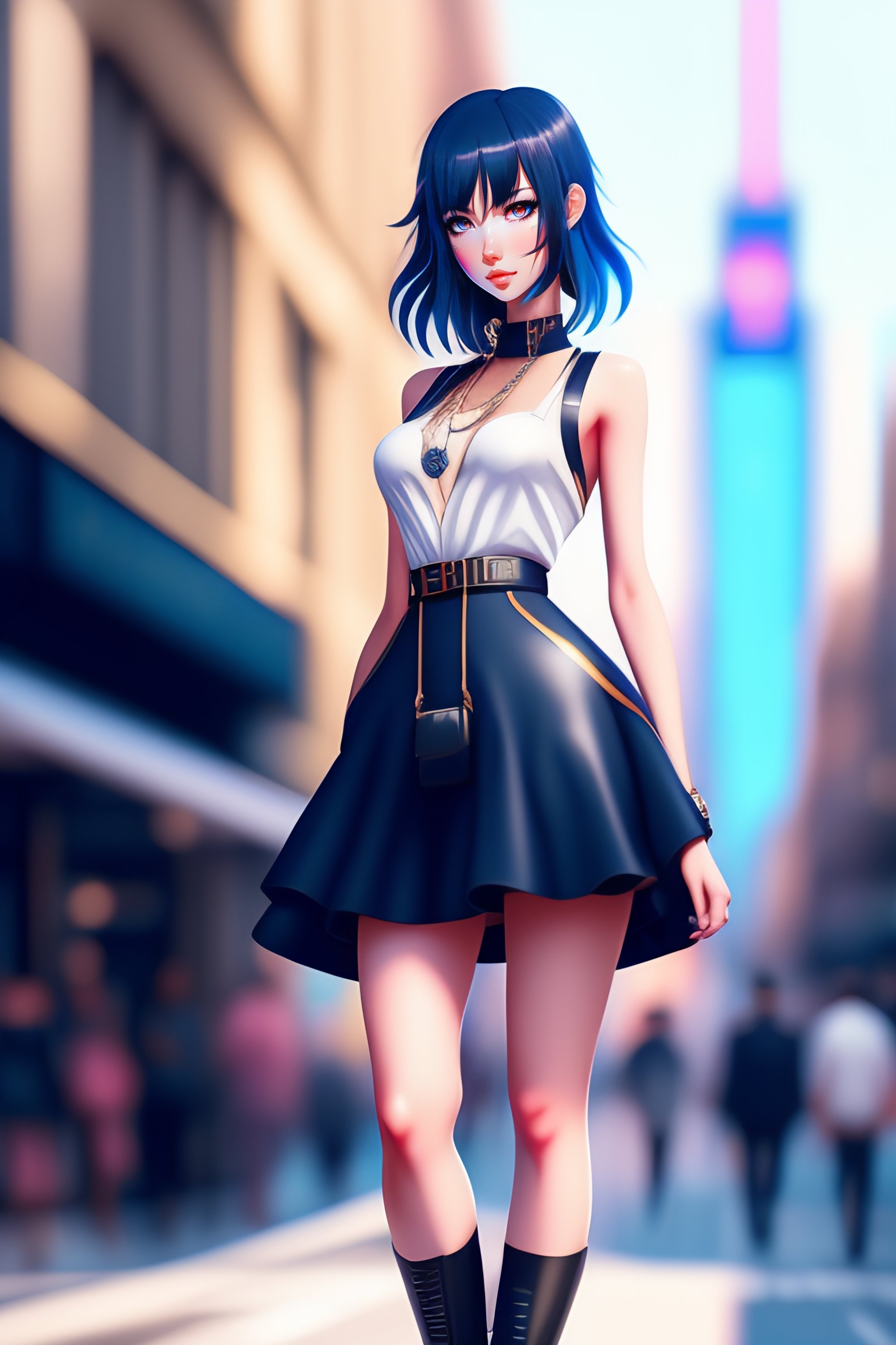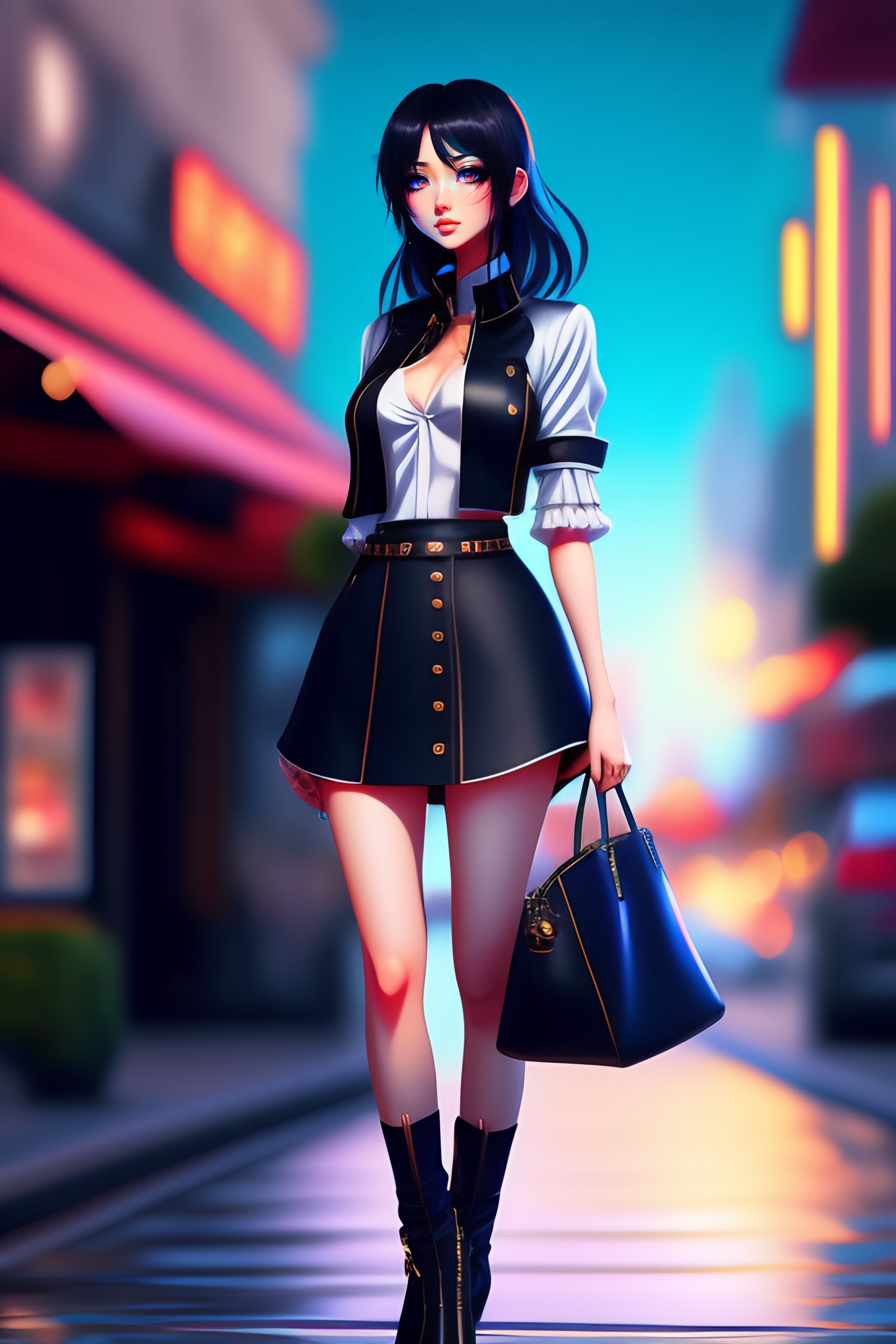 Full body anime style model girl, black hair, walking, blue eyes realistic detailes, 2d illustration, glamour, fashion style, 8k, city street, brands shops, friends party