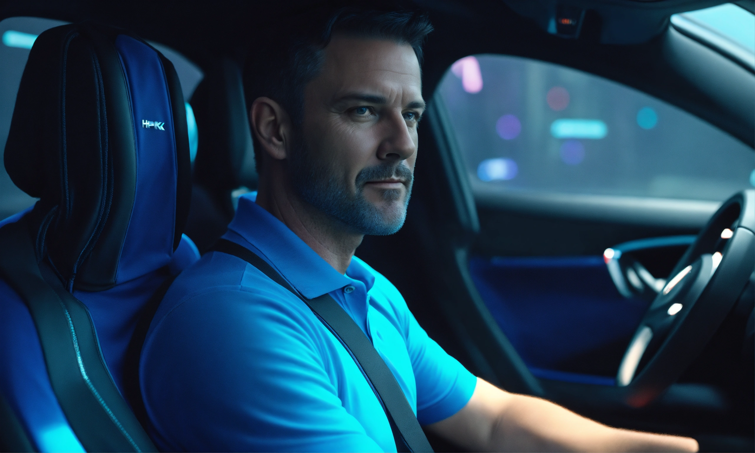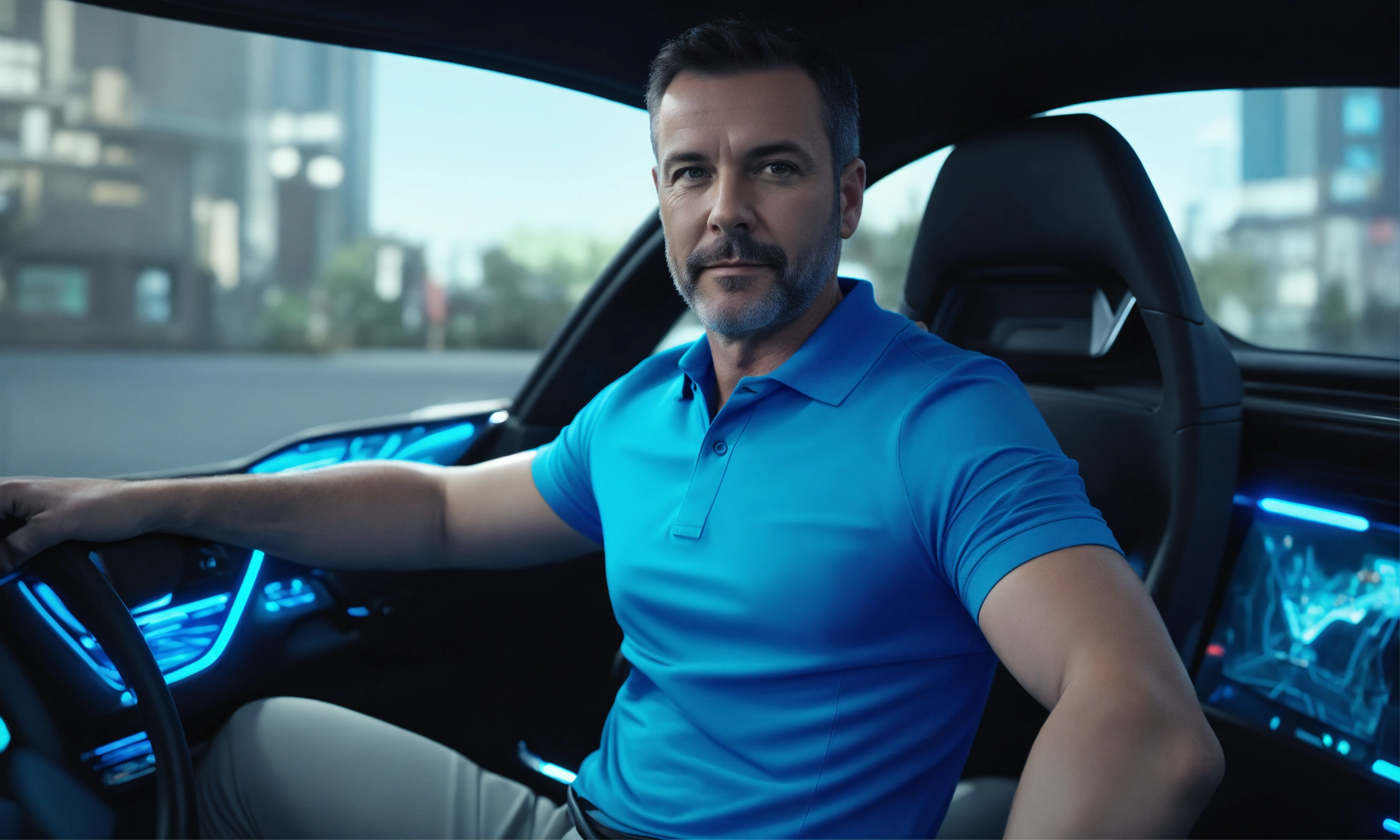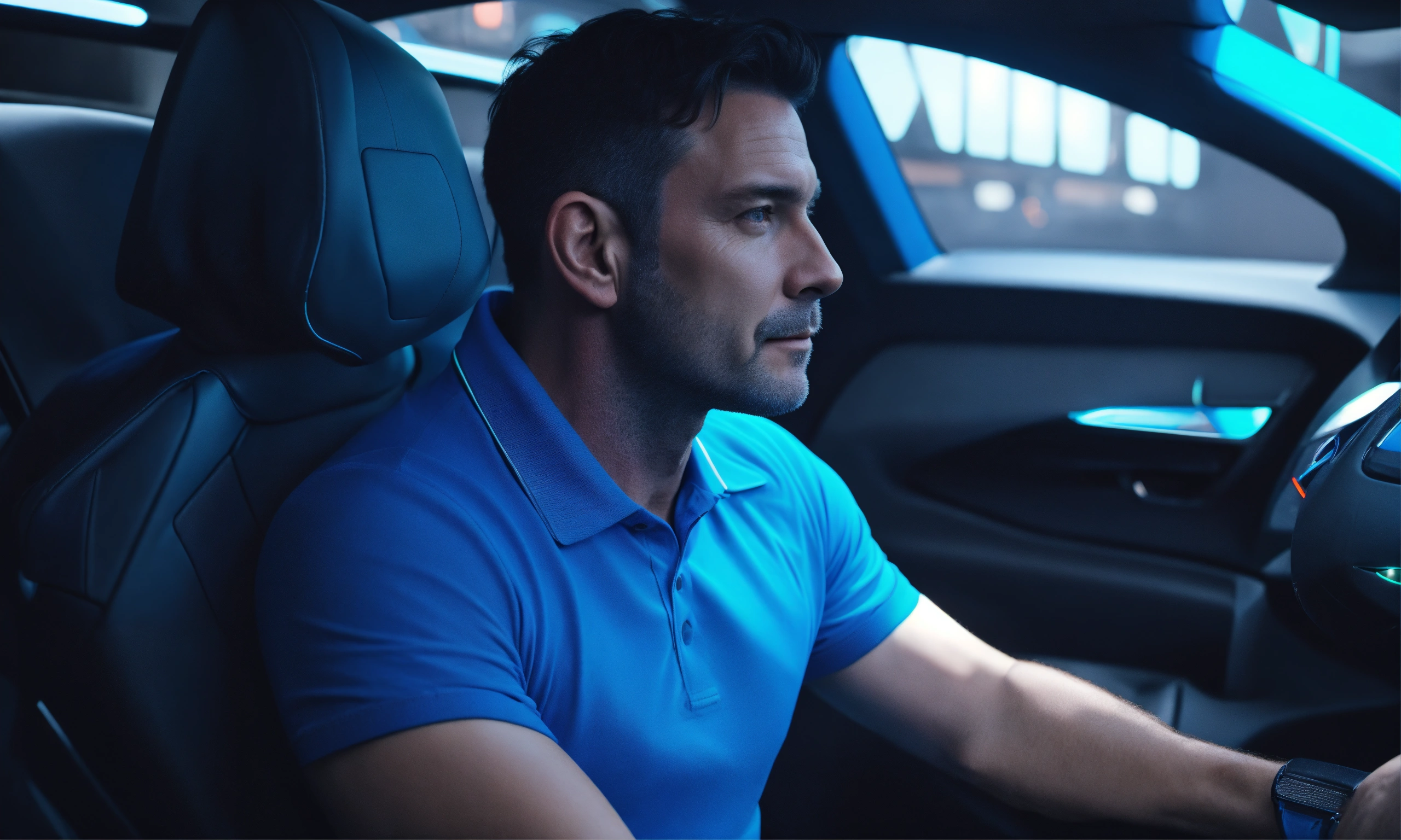 Middle aged gay man solid bright blue polo shirt short dark hair looking content sitting in back of a futuristic autonomous car hyper real monochromatic 4k hdr