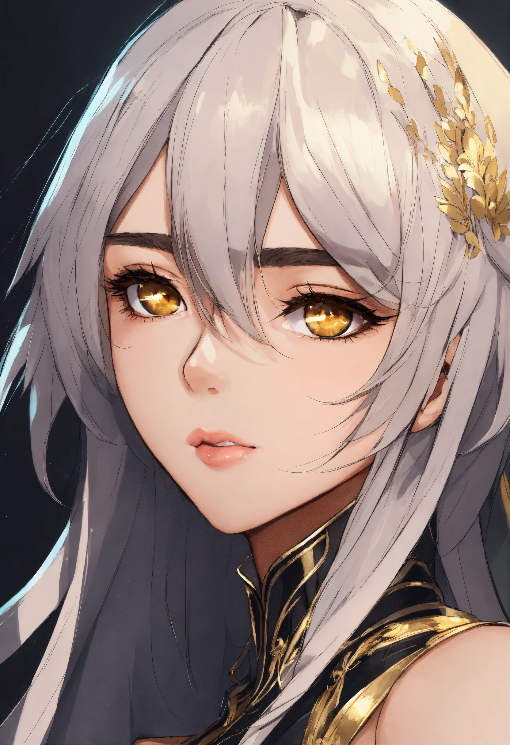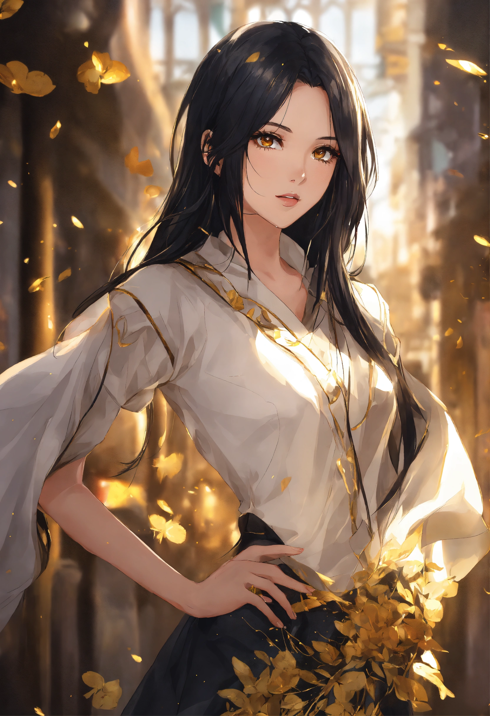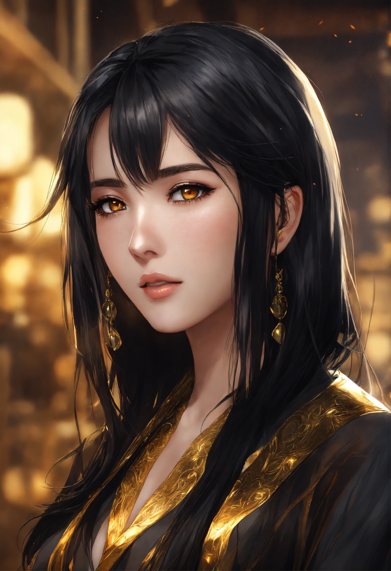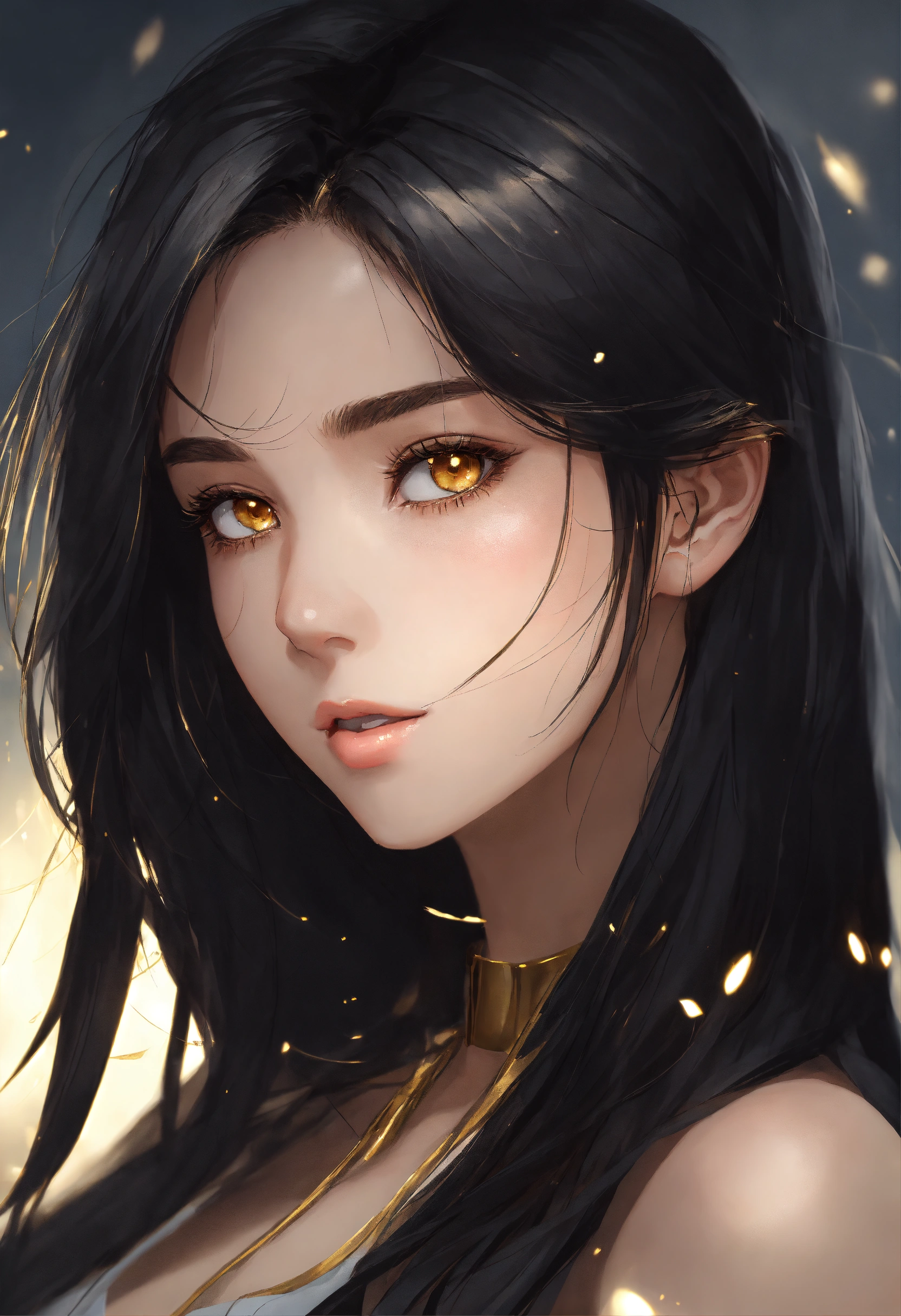 Woman 25 years old. shoulder length black straight hair. golden eyes. the face is beautiful, but not flashy. anime reskin style