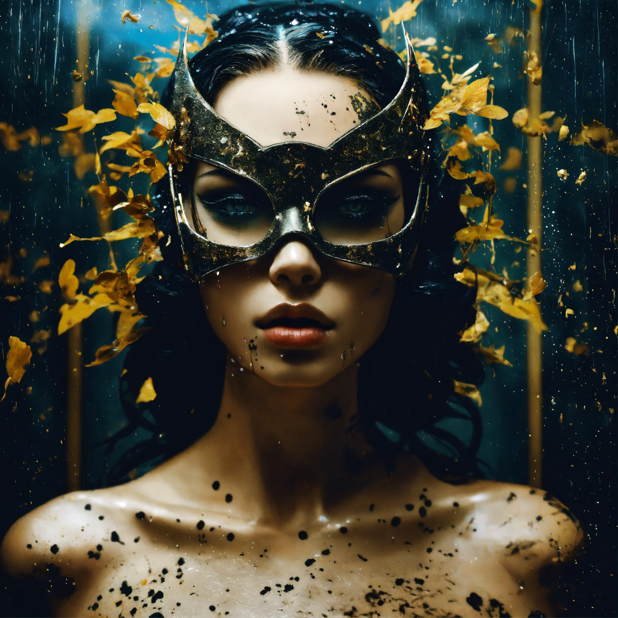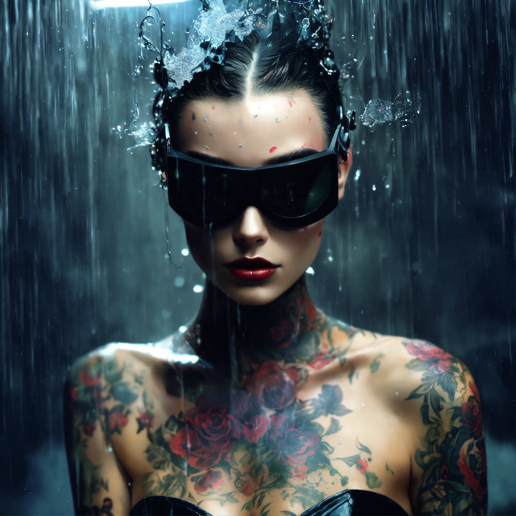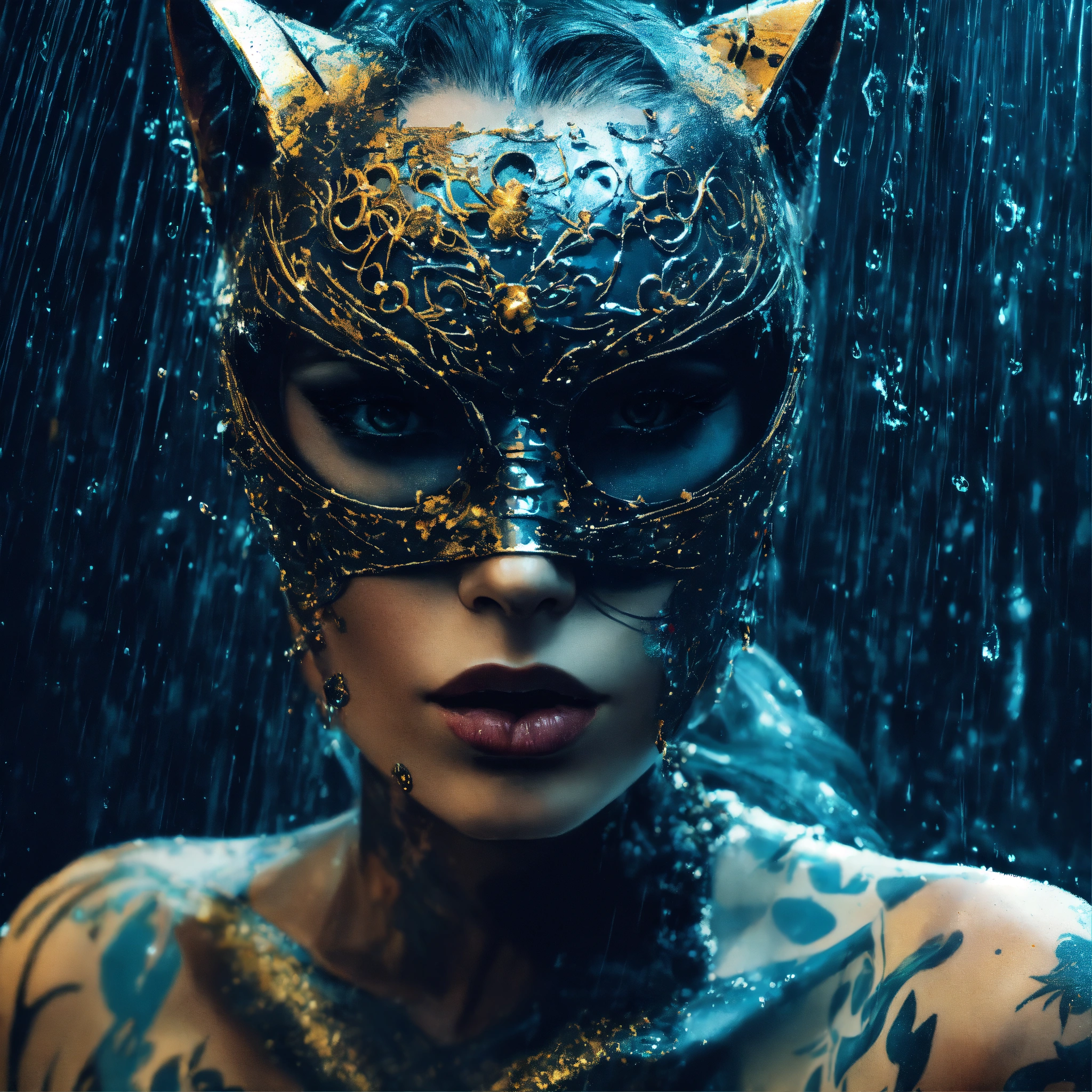 Tv plot shot photography, a tattooed gorgeous woman's face with rain in a thunderstorm, in an euro american cat woman mask with sunglasses, emerges from diagonal black ink splatters, an attractive metal body, 80 degree view, art by sergio lopez, natalie shau, james jean and salvador dali