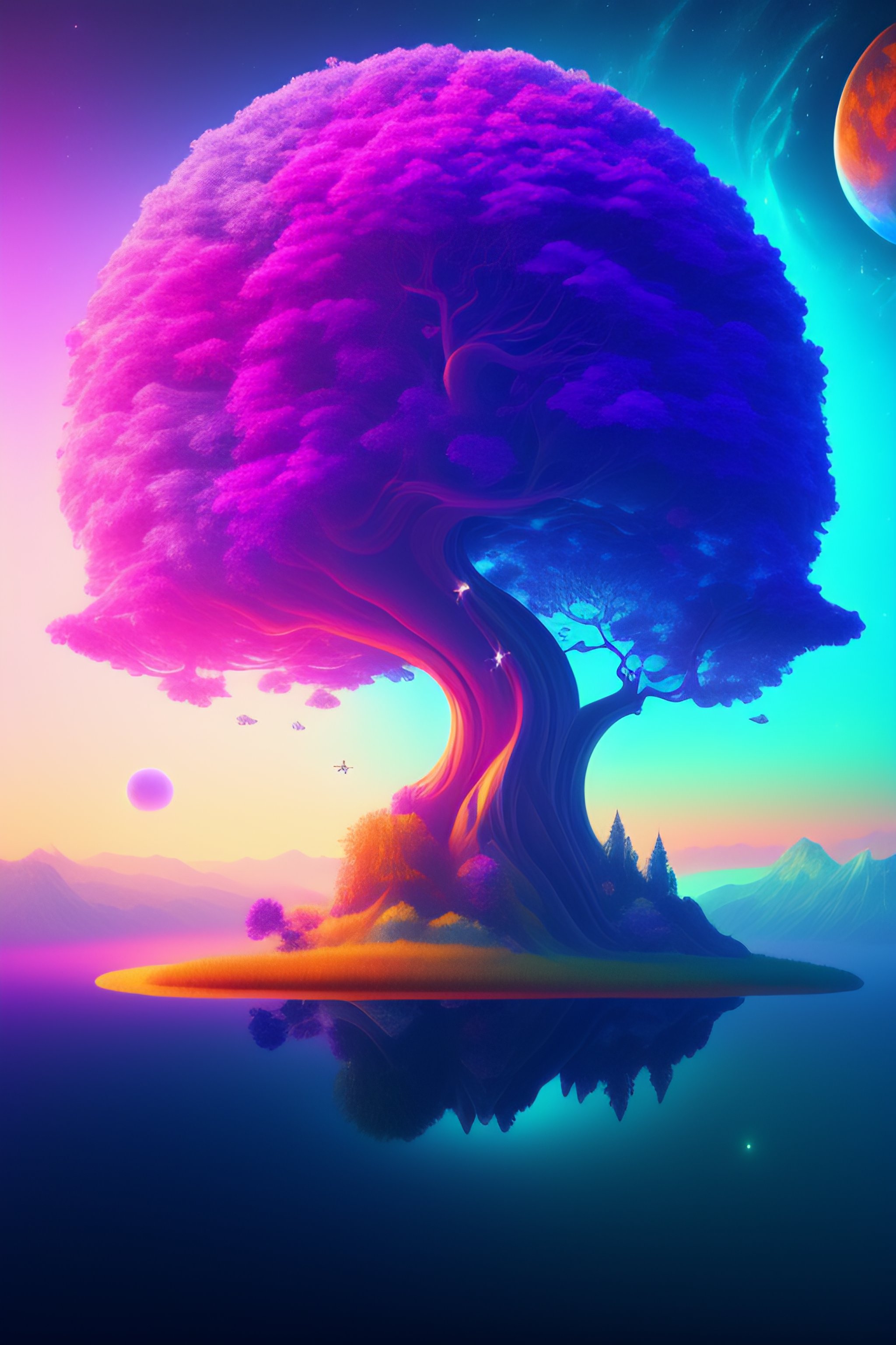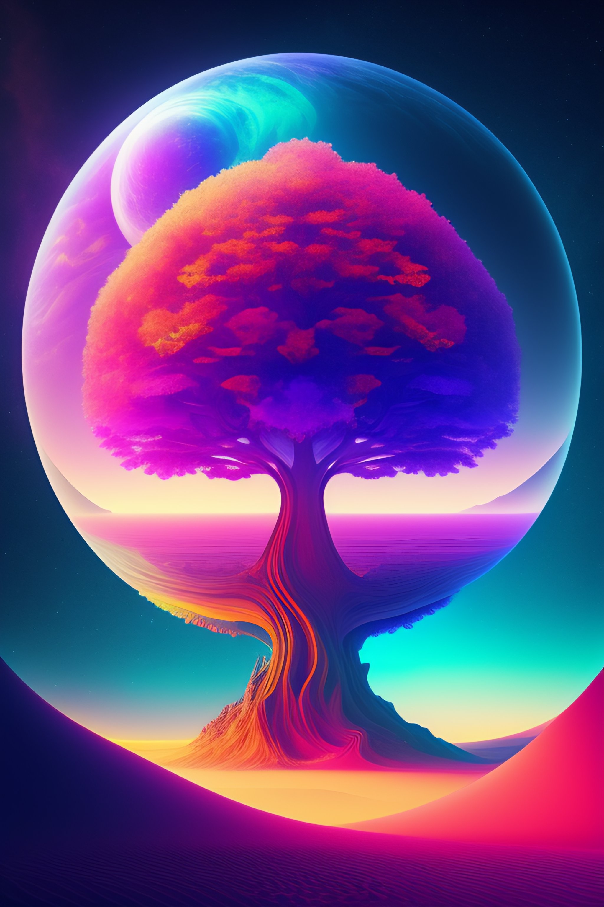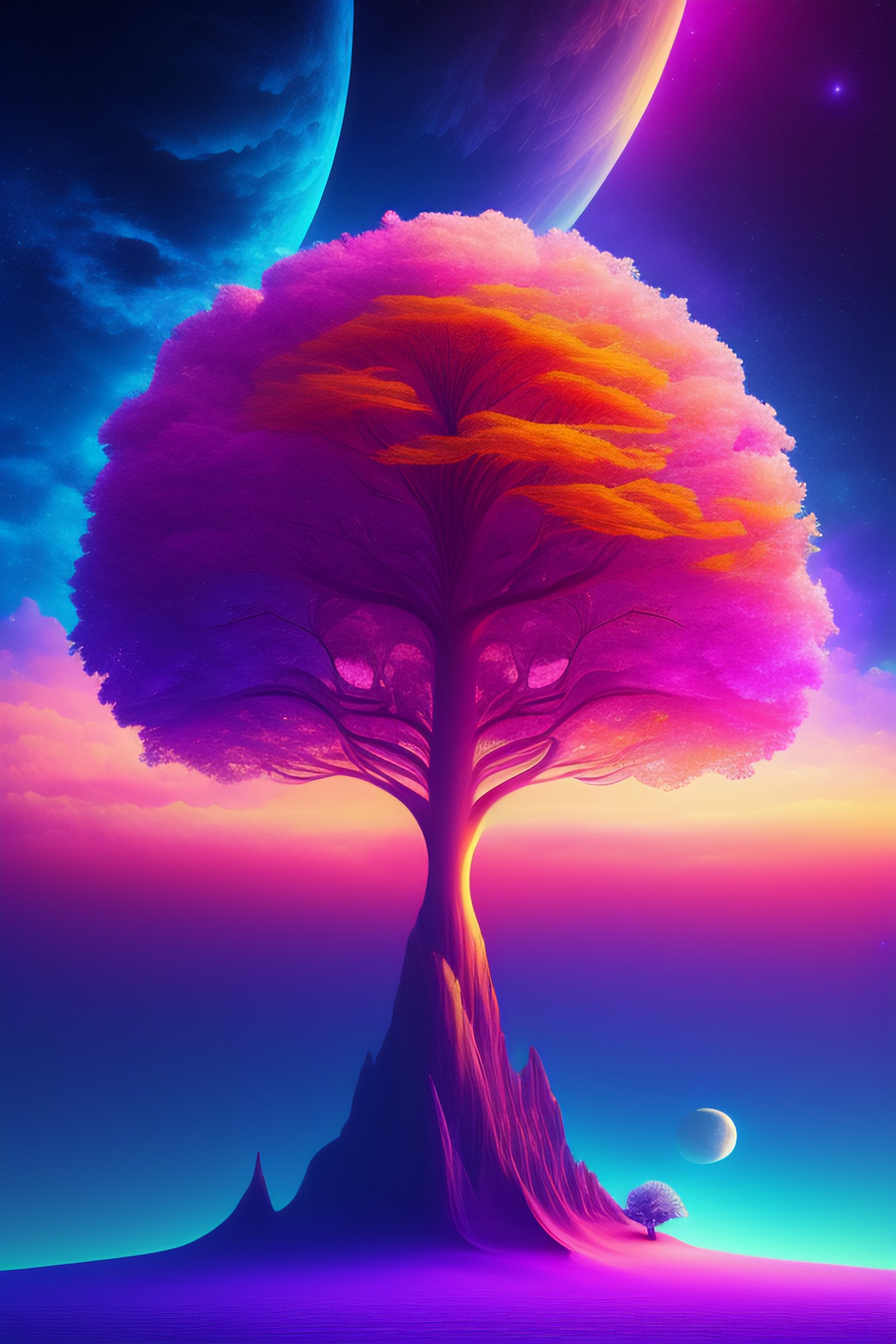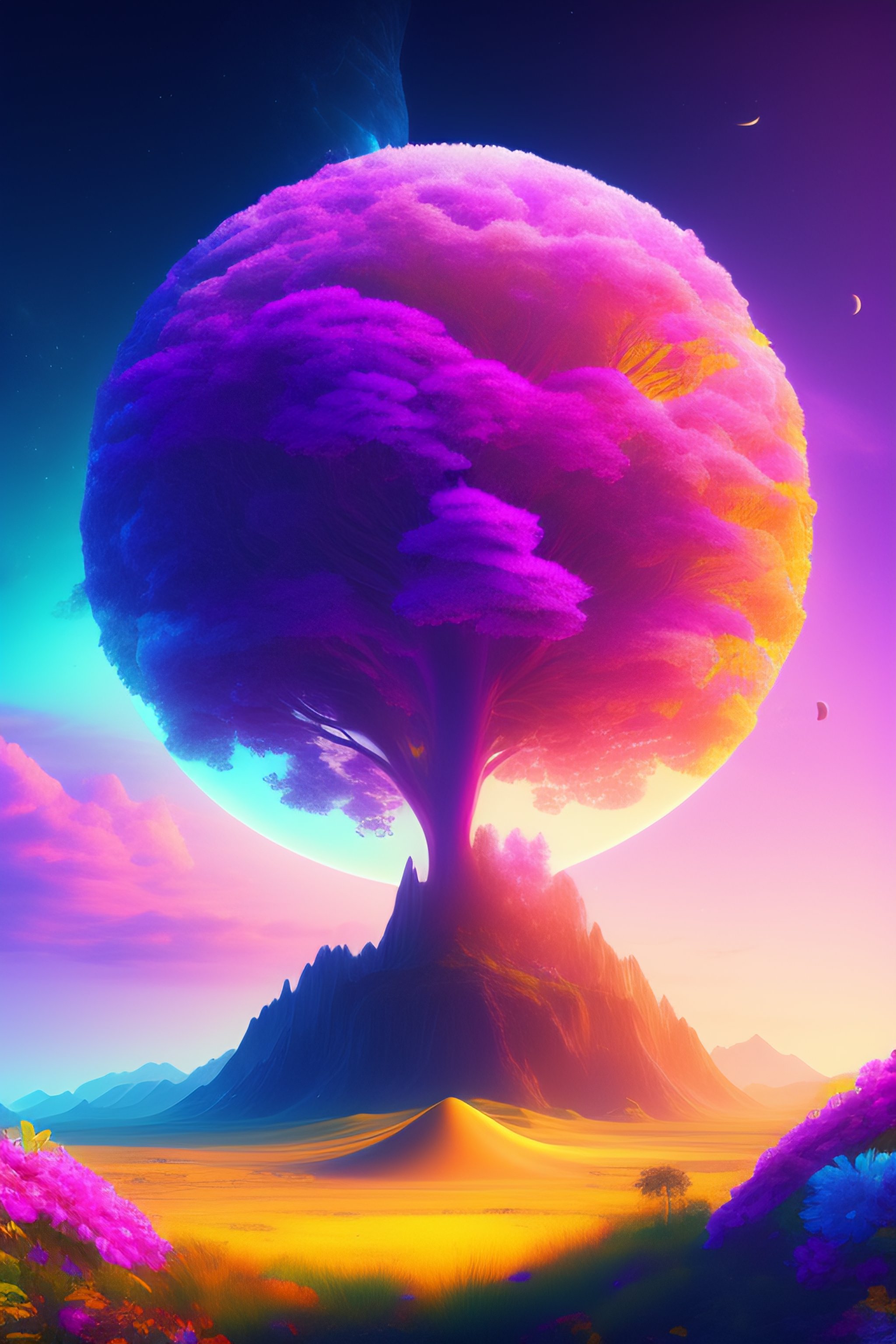 An 8k resolution matte painting of a mystical tree in futuristic heaven with vibrant flowers and a magical planet in the sky neon