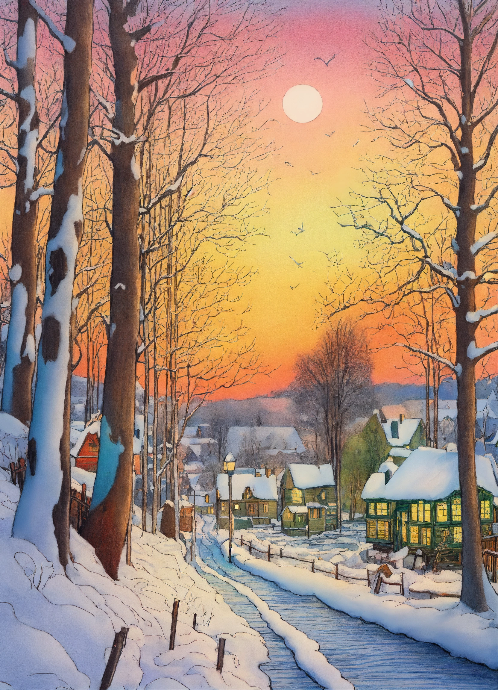 Drawing a winter landscape in flanders. ultra hd, perfect clarity, line drawing, clean clear lines, coloring book style, bright colors, intricate details, elegant, magical, serene, fine details, pastel pencils, winsor mccay style, brueghel style