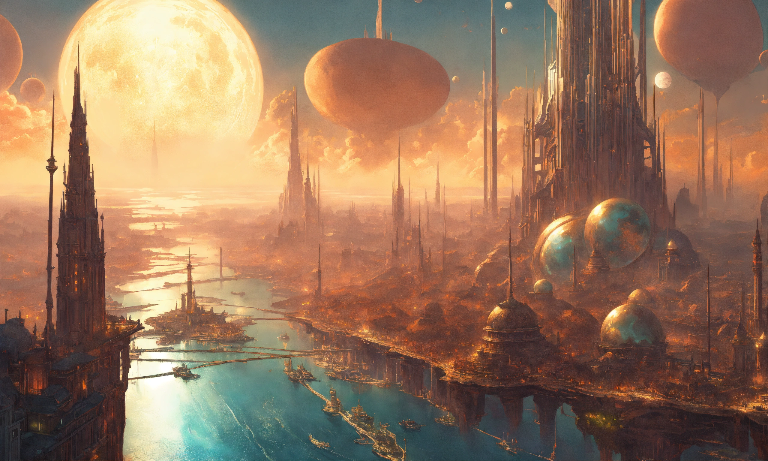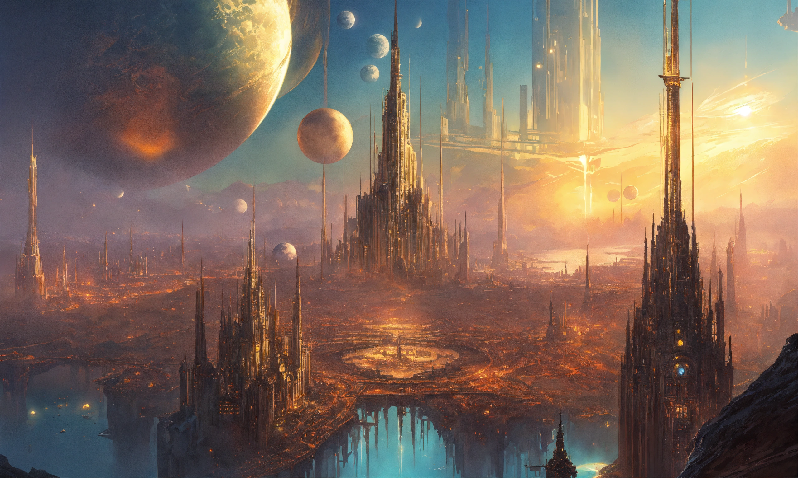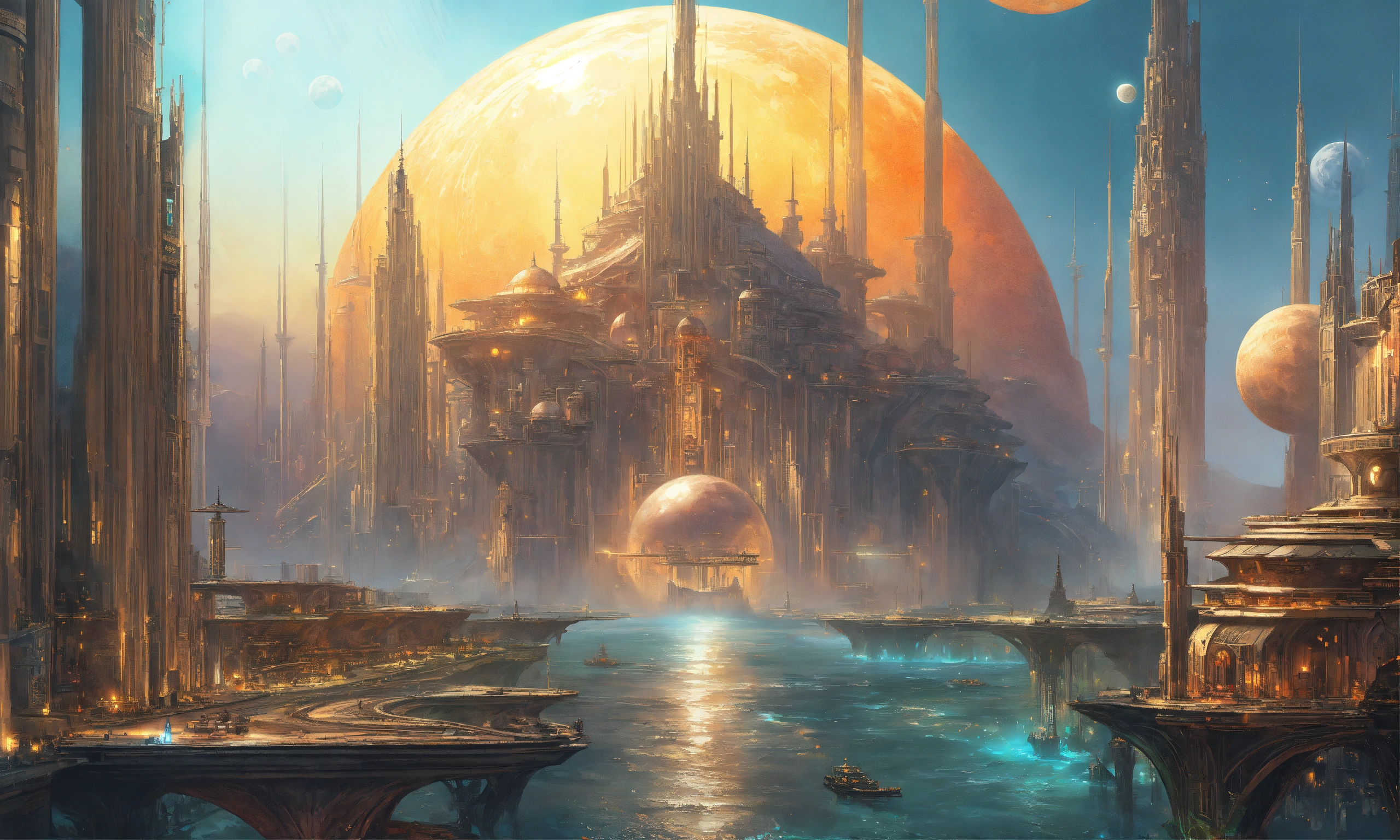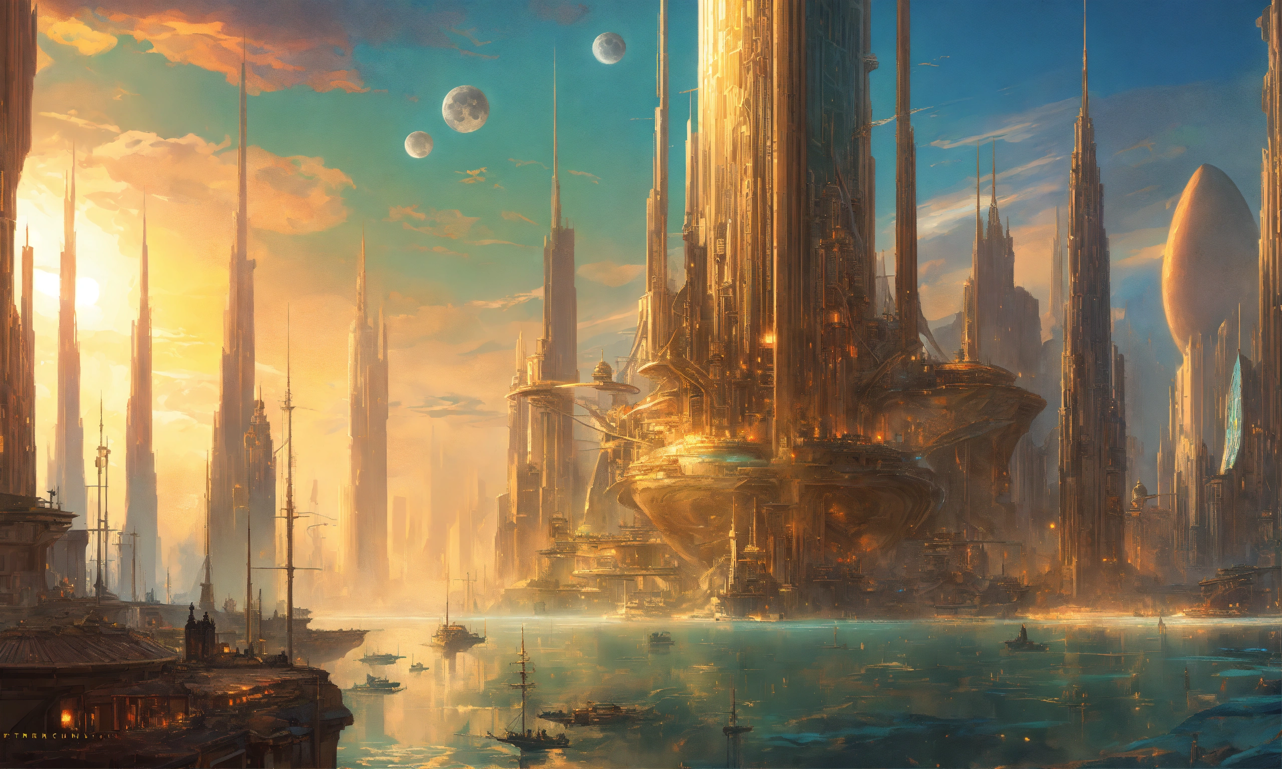 A cover art of a shining city with tall technological spires on an alien ocean, moons, fantasy, hyperrealistic, by jon foster, stanley artgerm lau, artstation, deviantart, smooth, detailed, stunningly beautiful, aesthetic, highly detailed