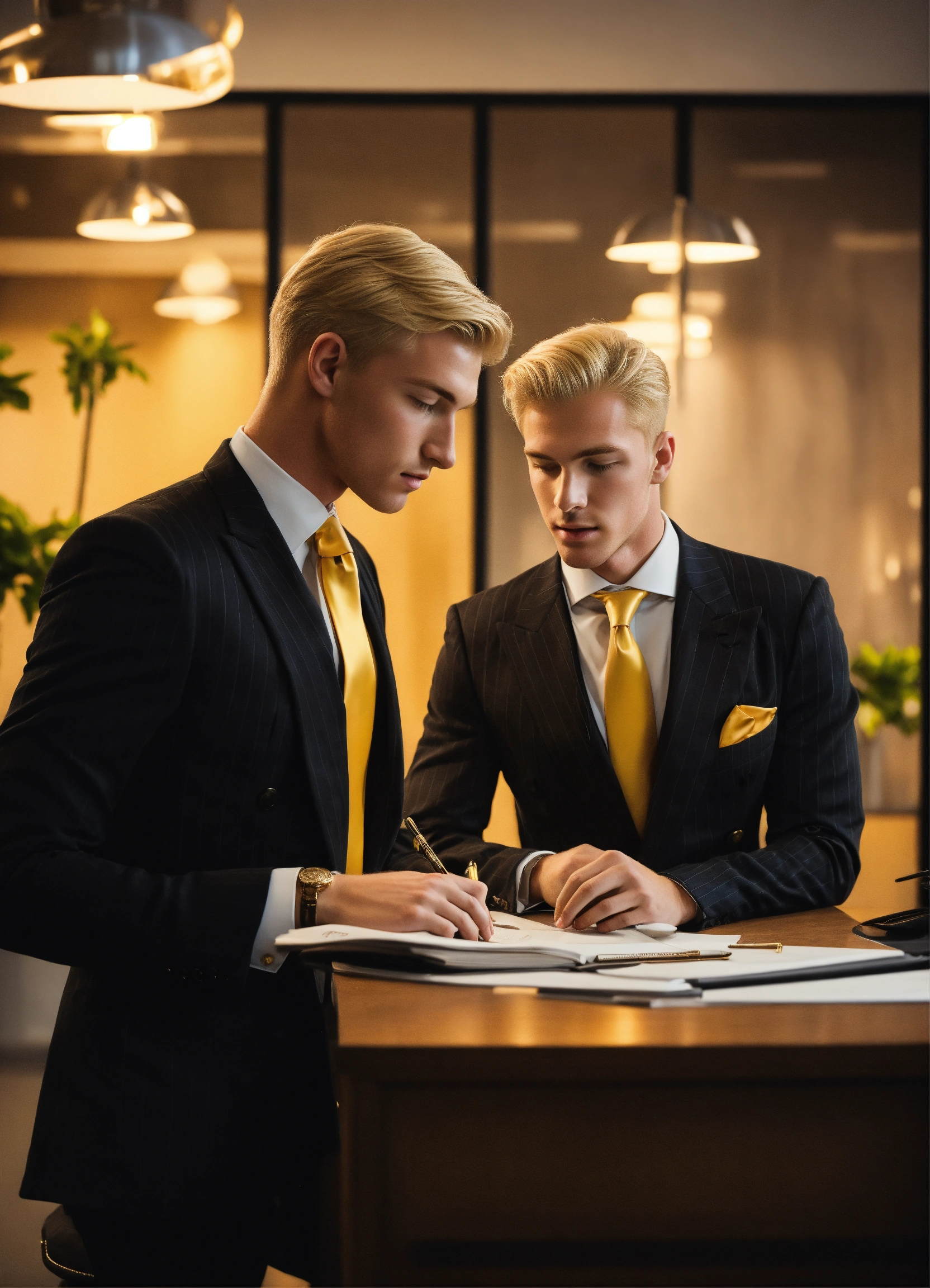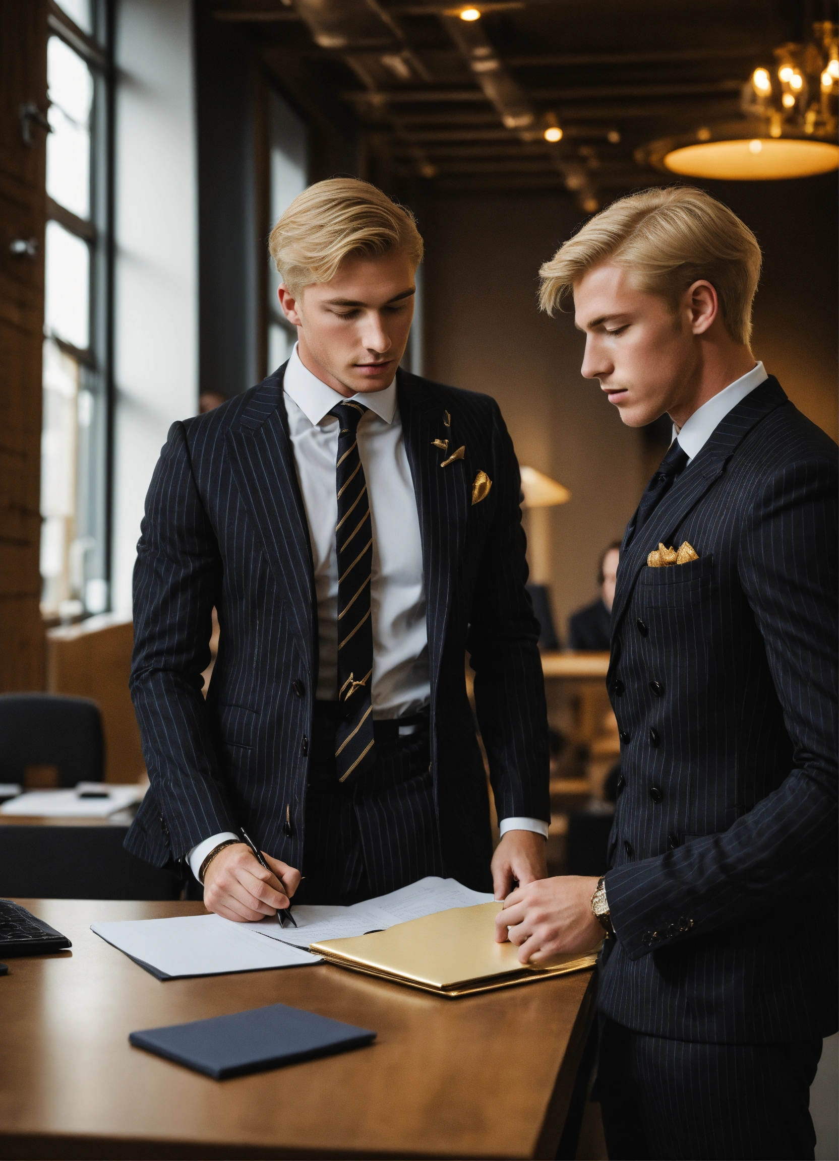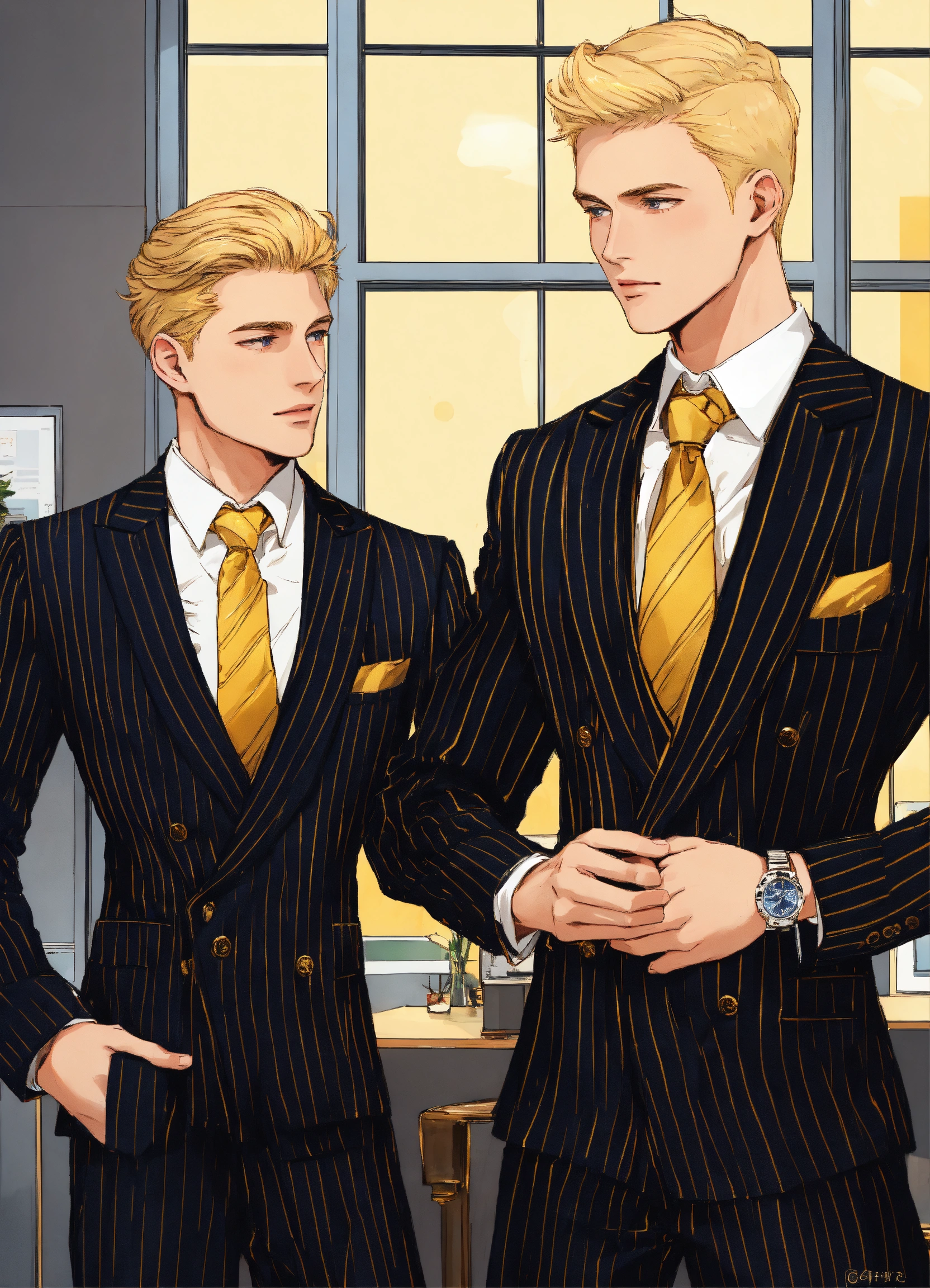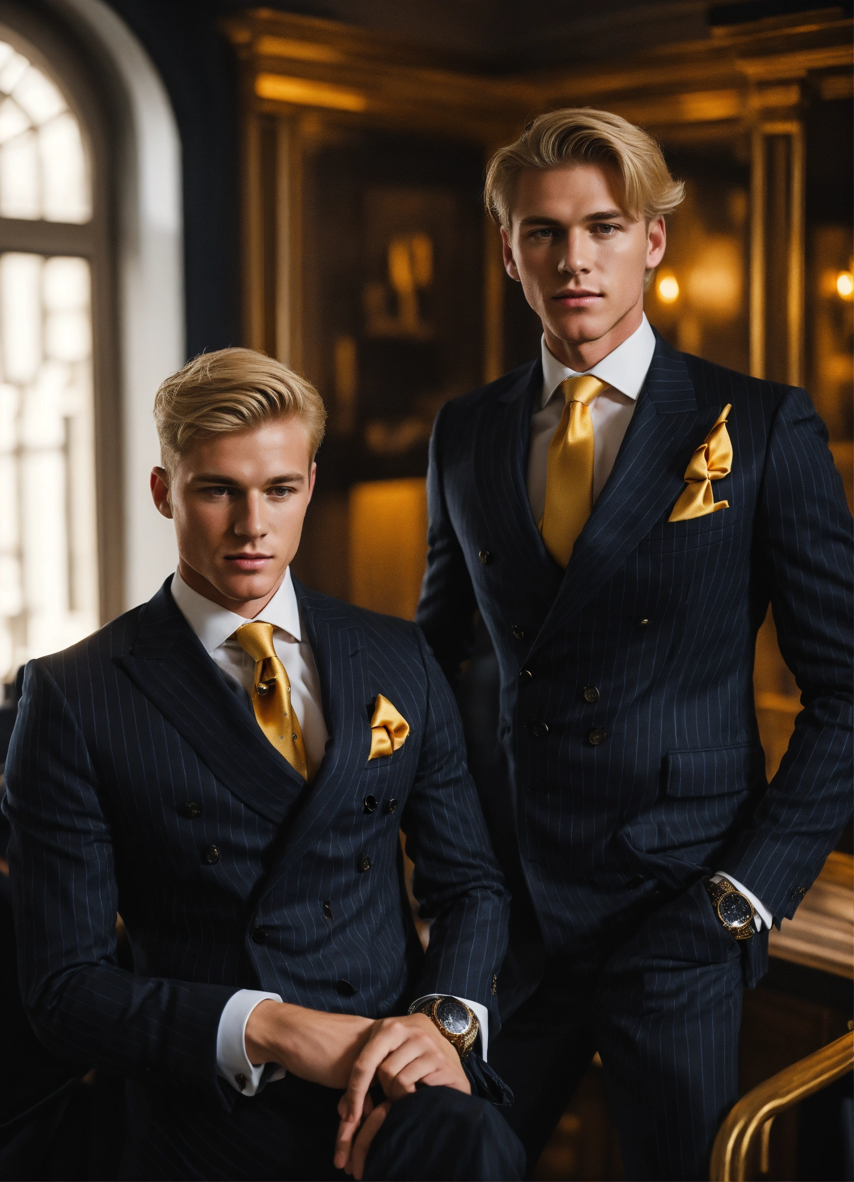 Two blonde young gentlemen in black pinstripe double breasted suit