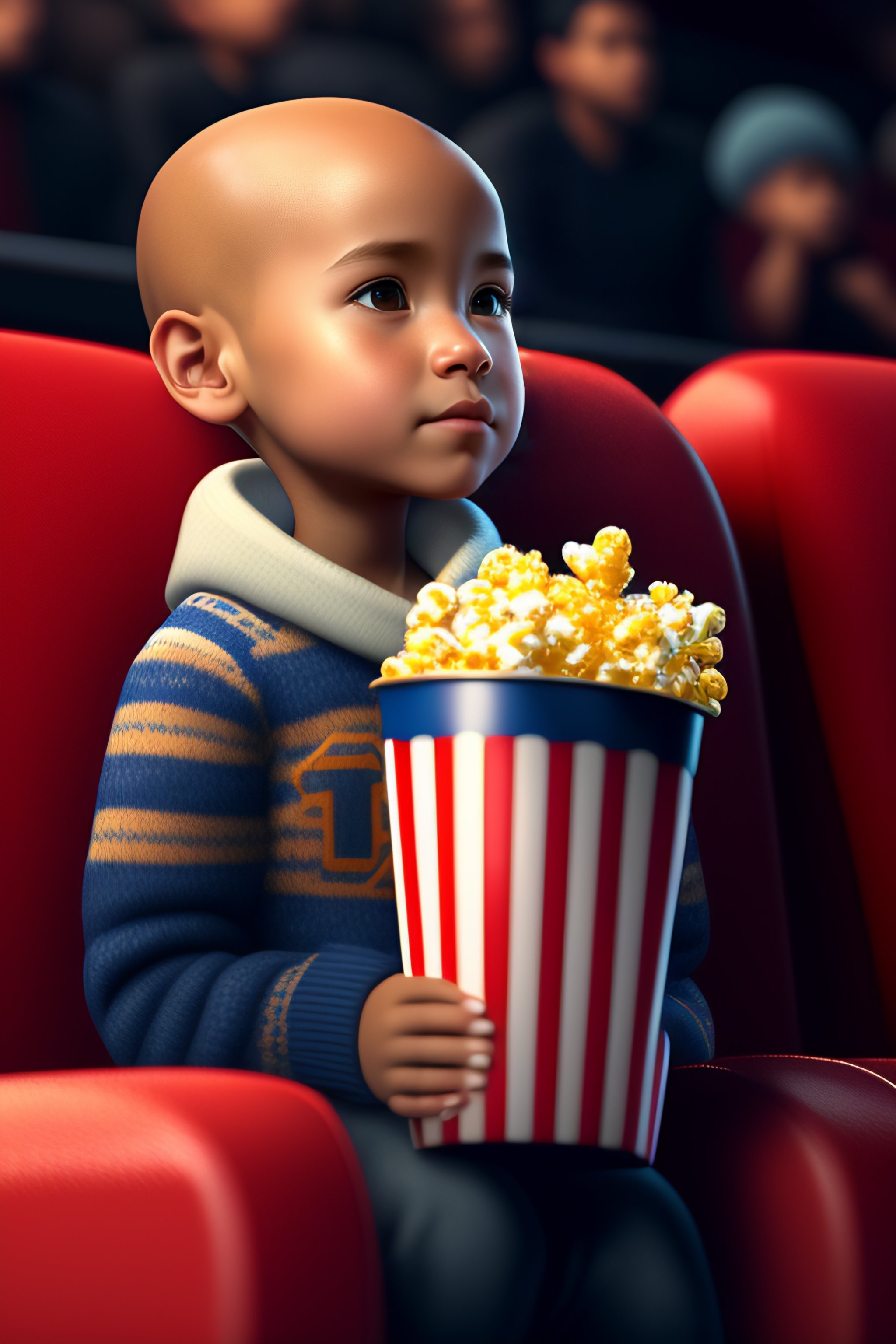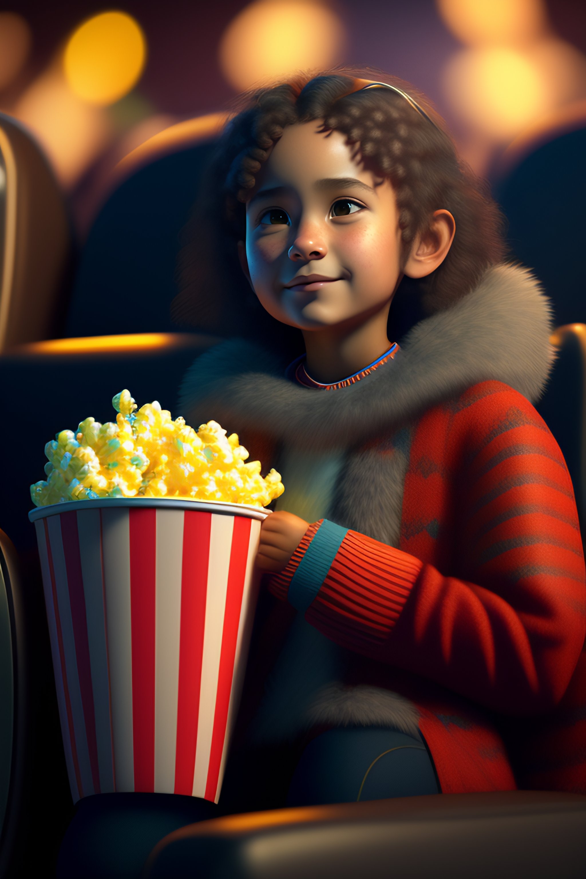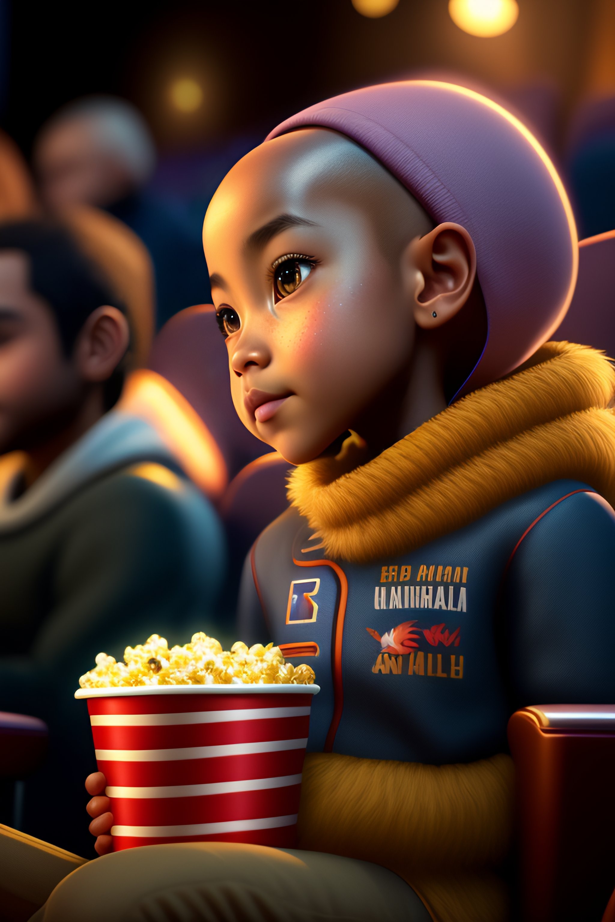 Cute small young humanoid bald eagle woman sitting in a movie theater eating popcorn watching a movie, unreal engine, cozy indoor lighting, artstation, detailed, digital painting, cinematic, character design by mark ryden and pixar and hayao miyazaki, unreal 5, daz, hyperrealistic, octane render