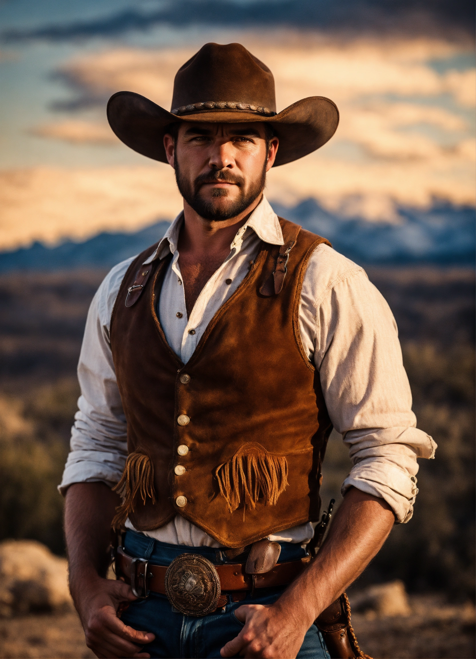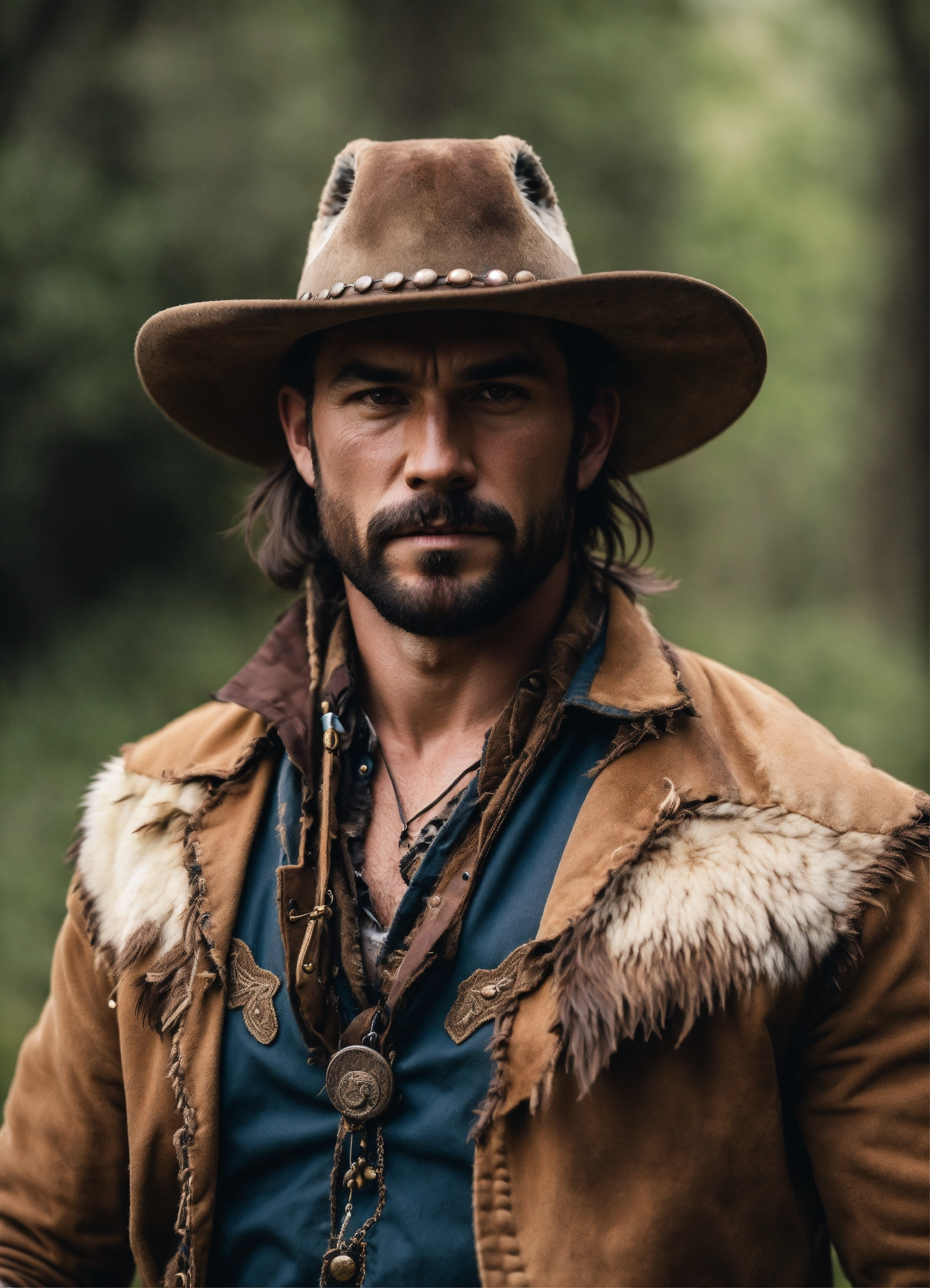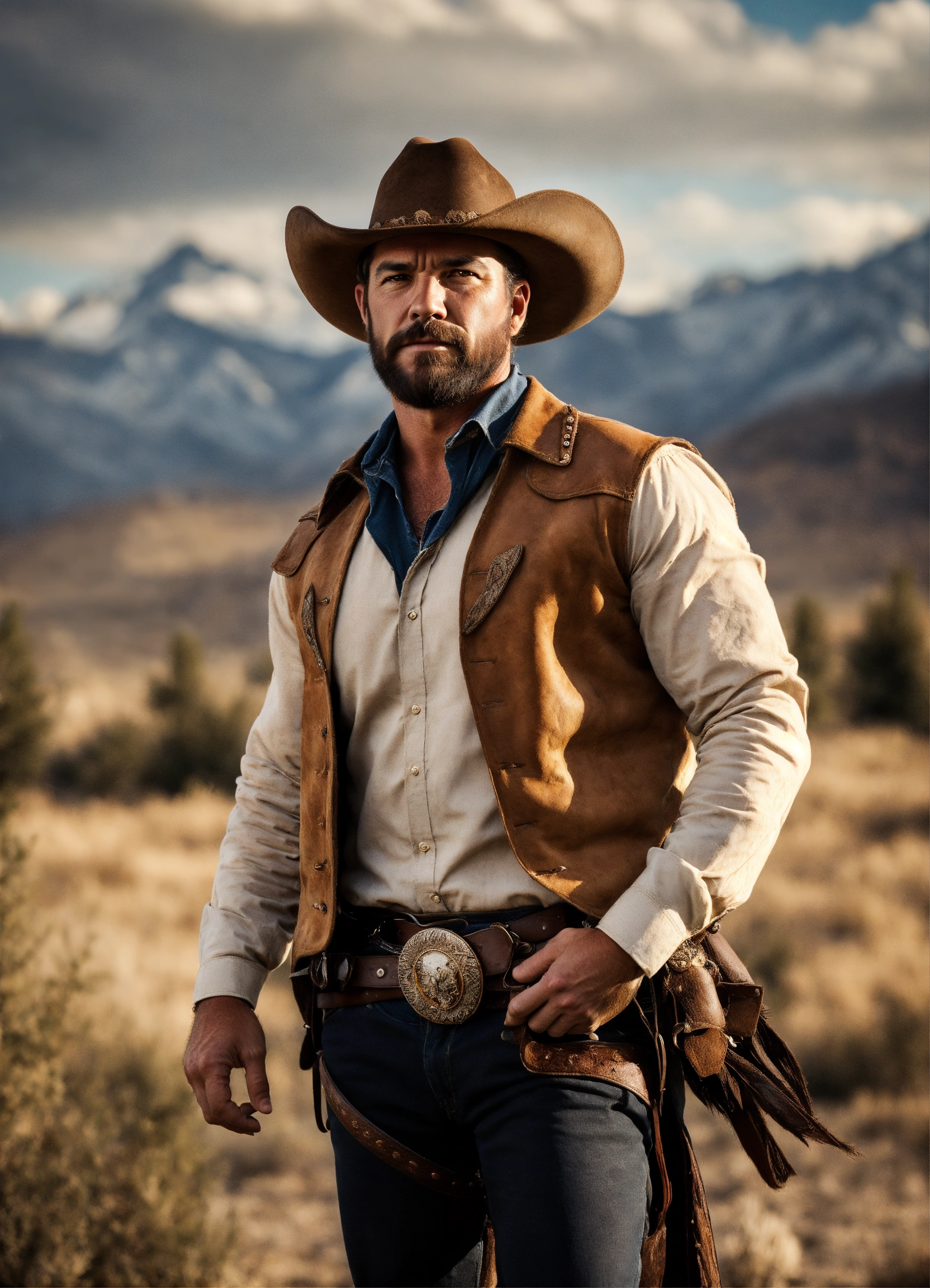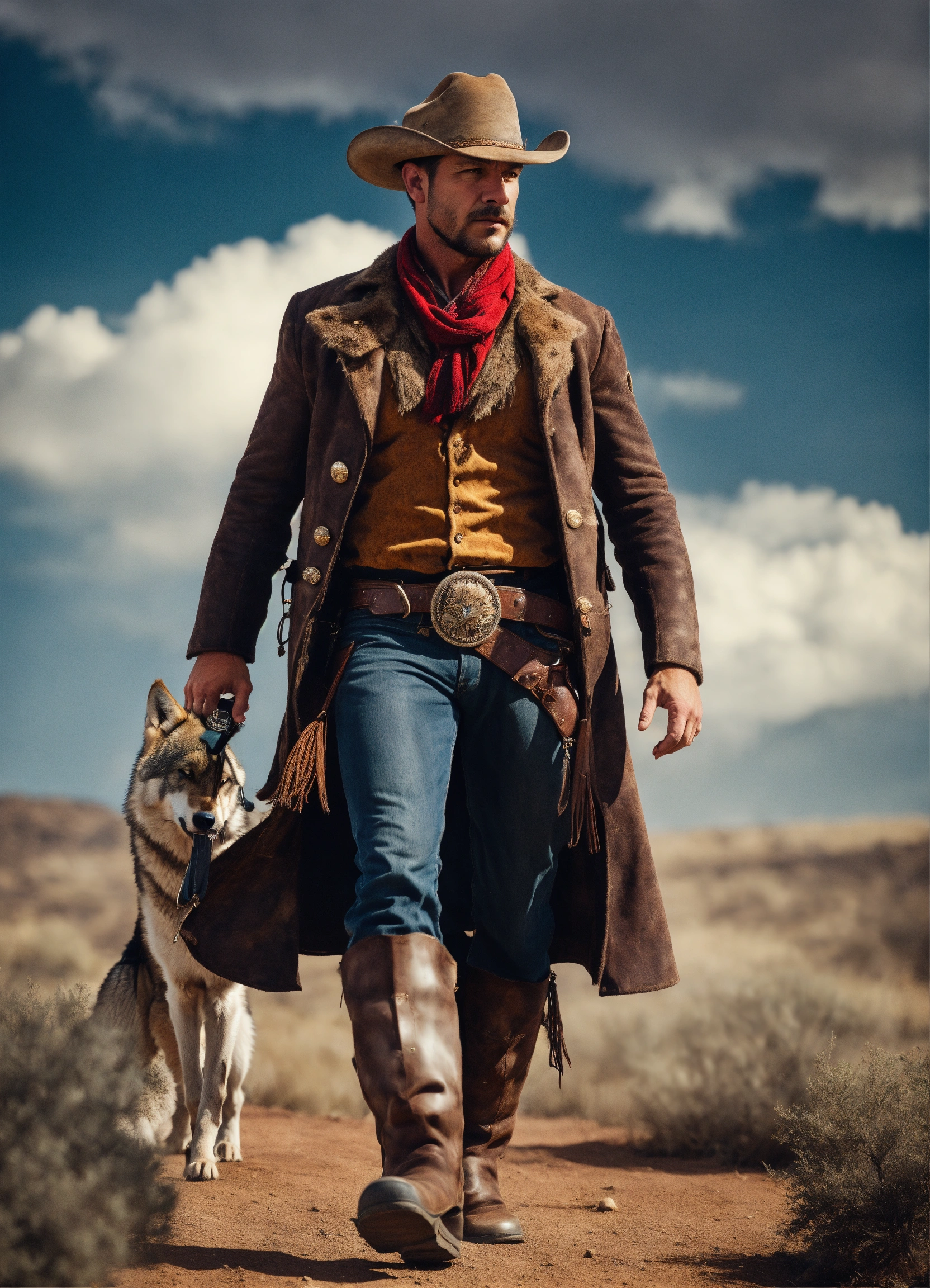 A strong man with wolf characteristics dressed like a cowboy in the wild west