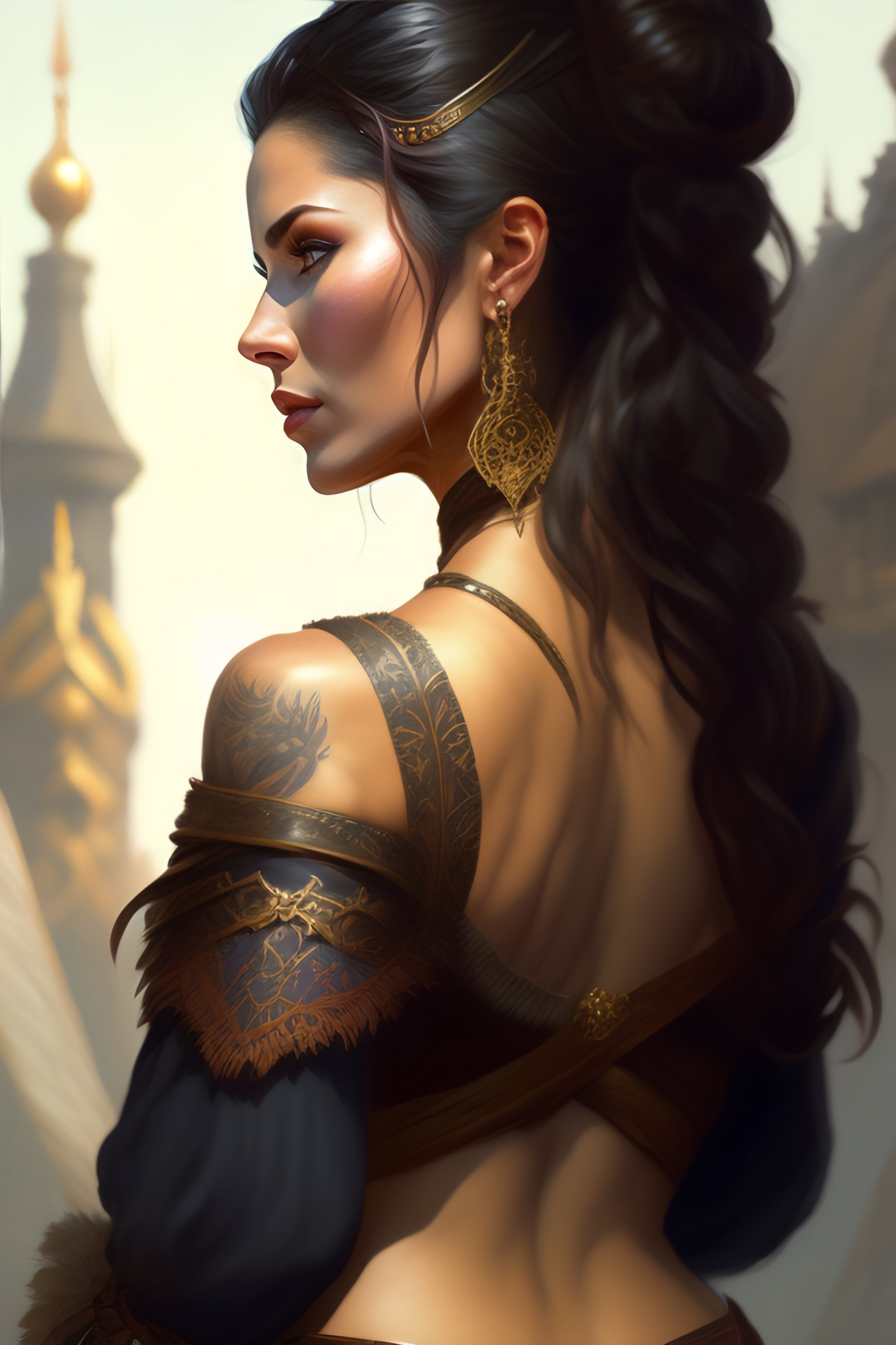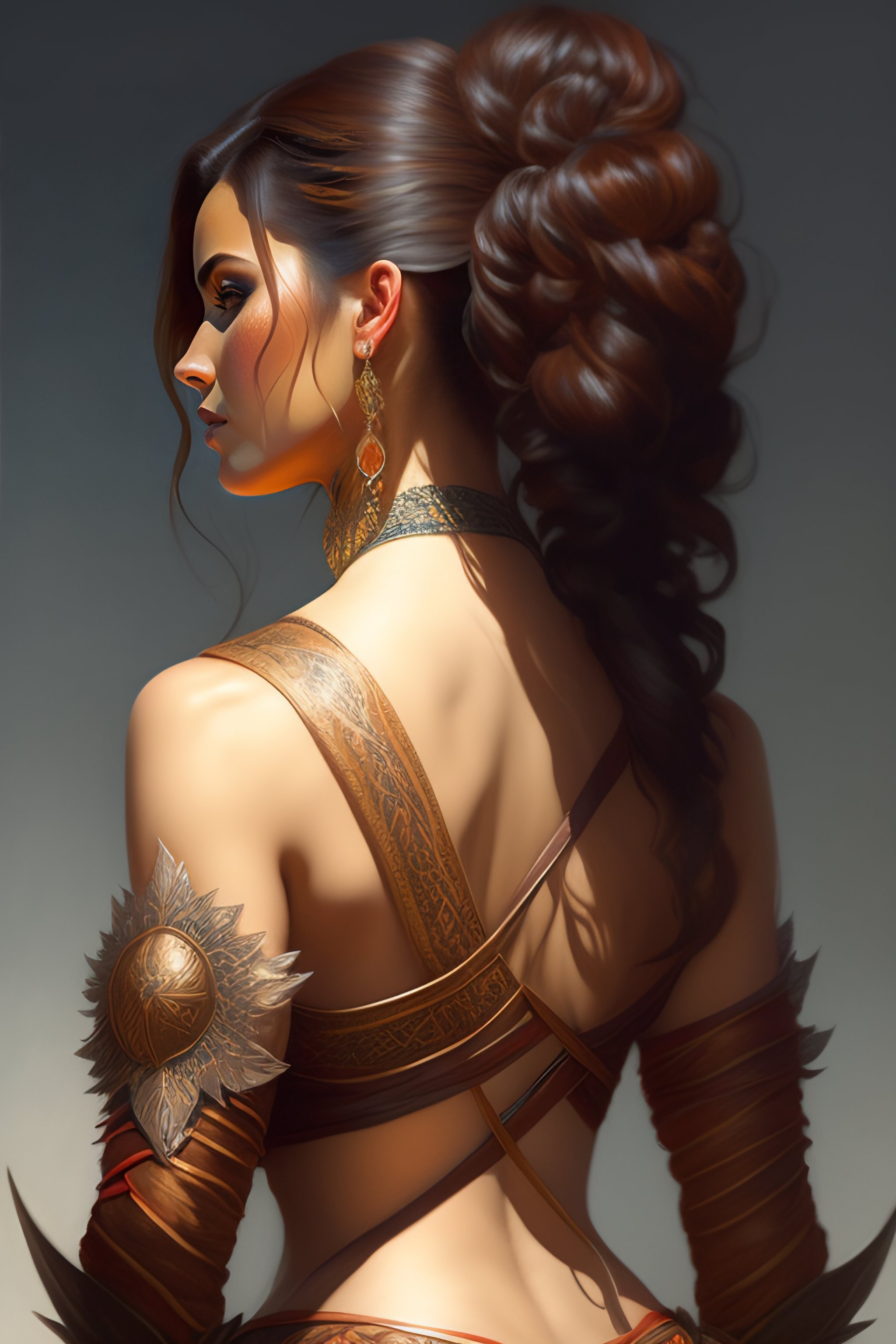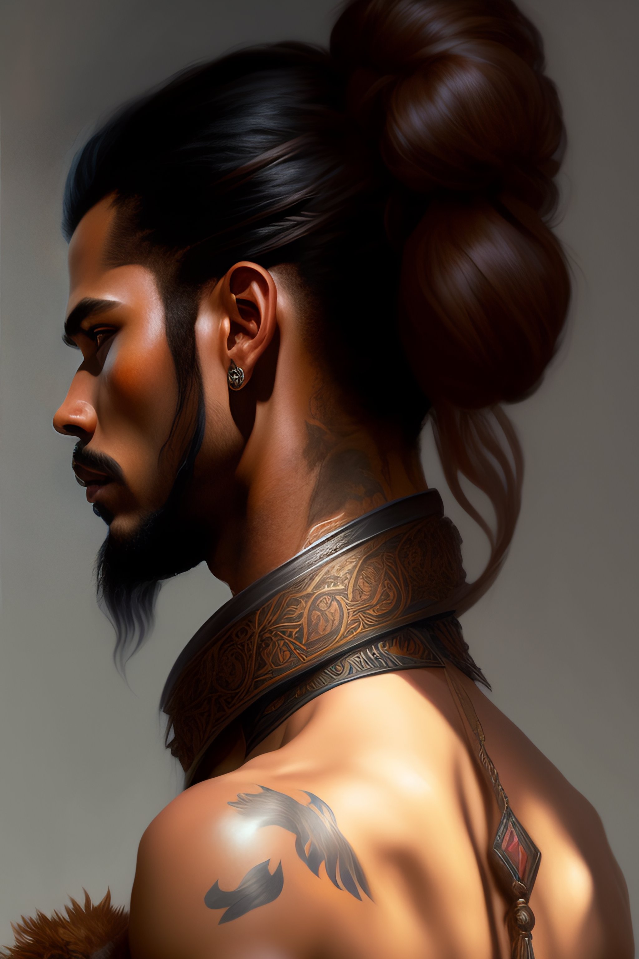 Back portrait of a scarred rogue warrior, full body, hairy torso, half bun, d&d, fantasy, intricate, elegant, highly detailed, digital painting, artstation, concept art, matte, sharp focus, illustration, art by artgerm and greg rutkowski and alphonse mucha