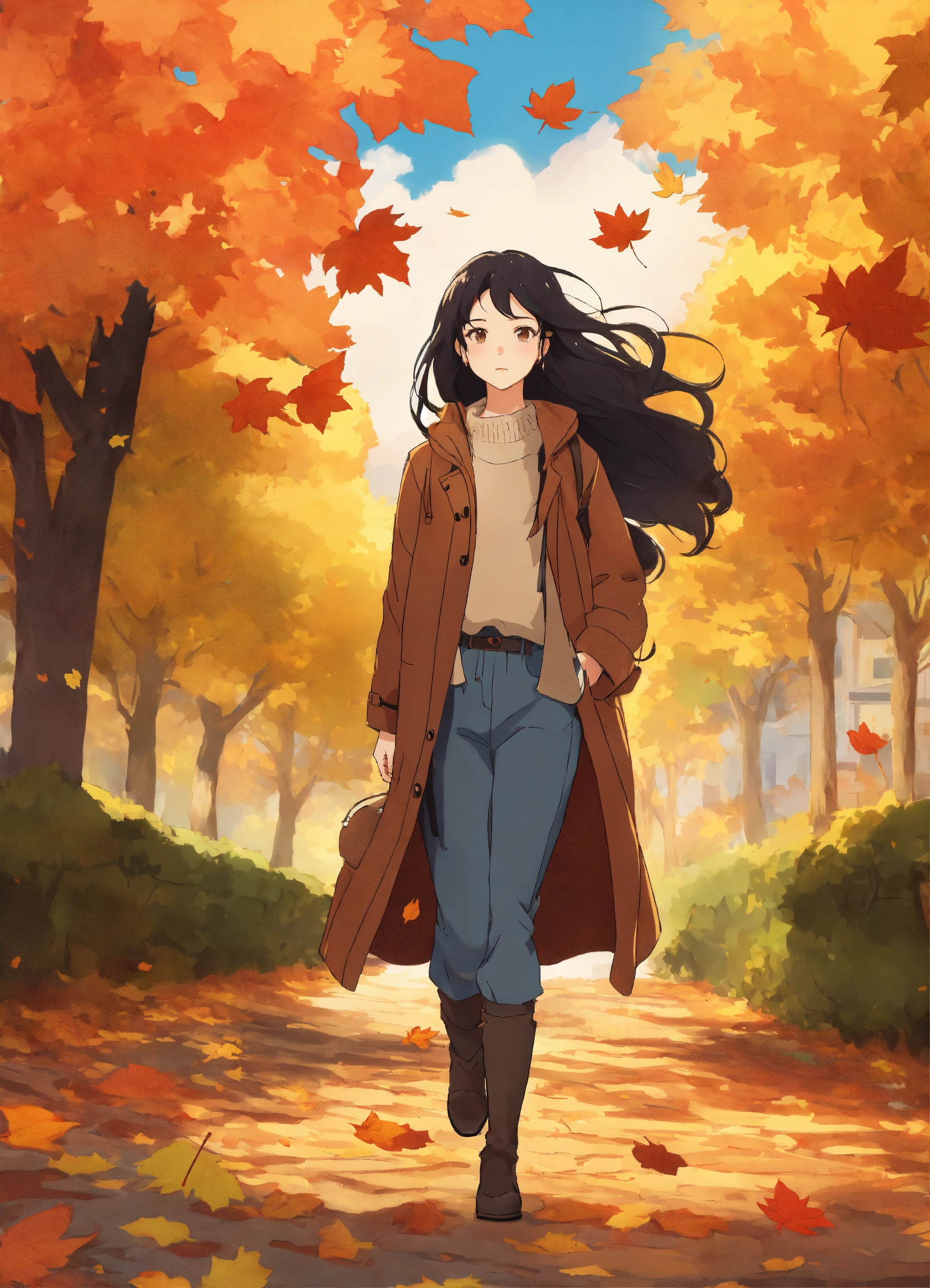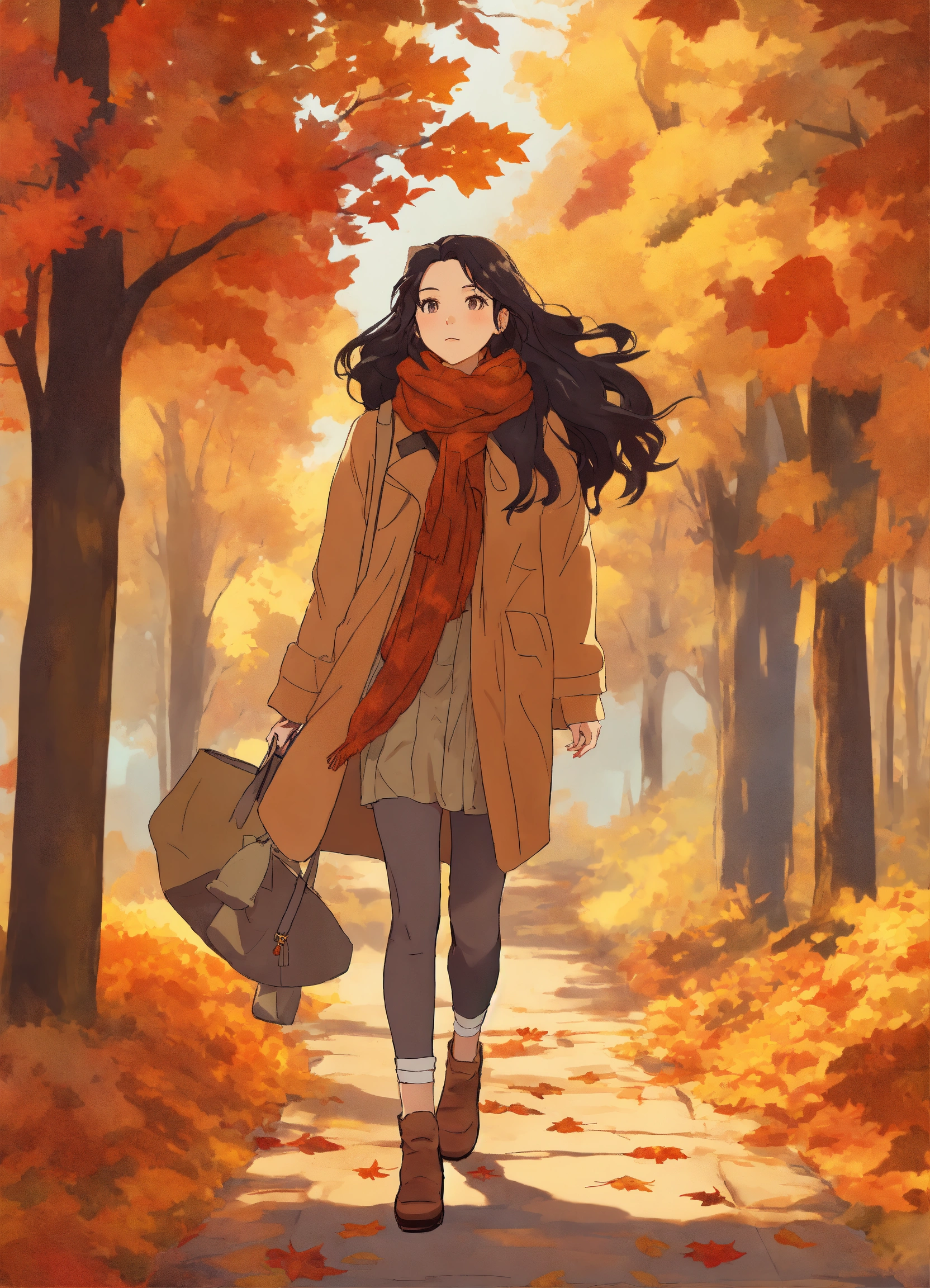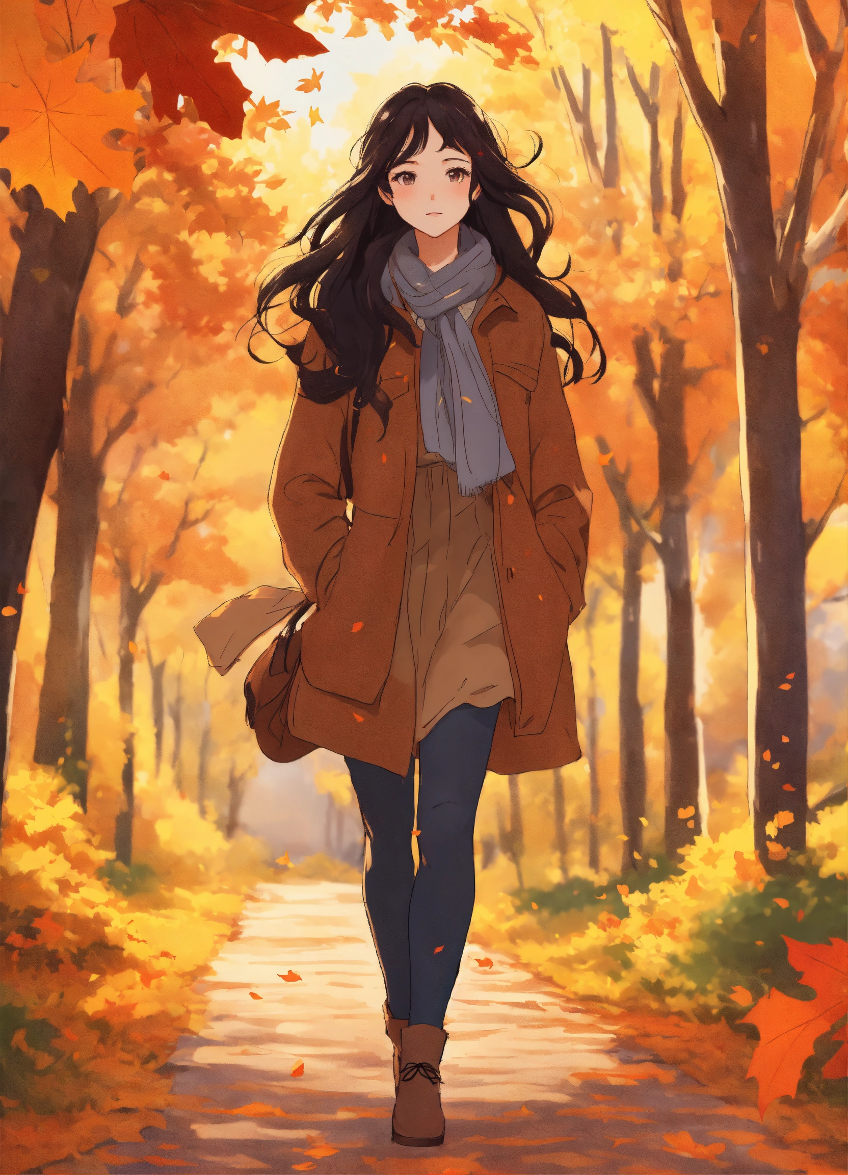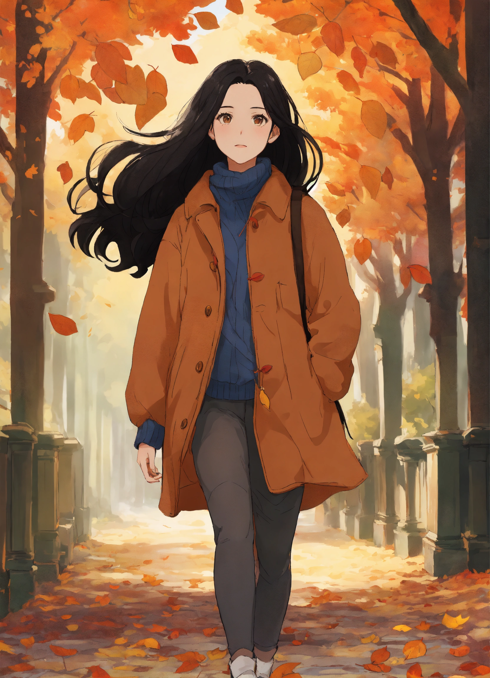 In a studio ghibli-inspired style, depict a girl with long flowing black hair gently tousled by the breeze as she walks on a path lined with autumn leaves. she's dressed in cozy autumn attire, fitting for the season.