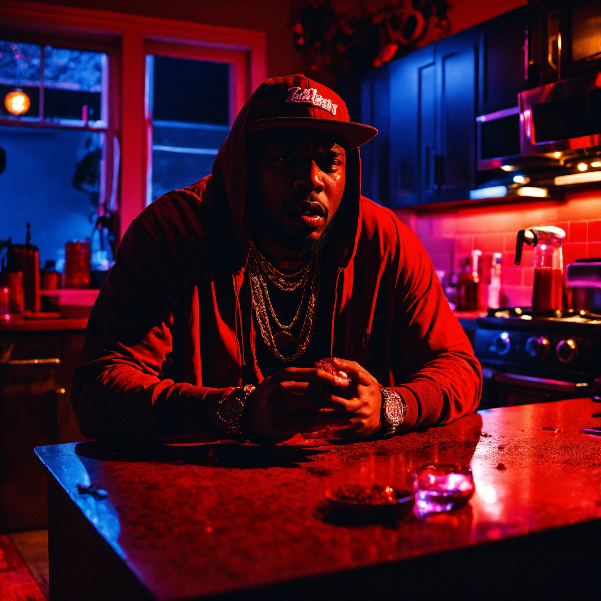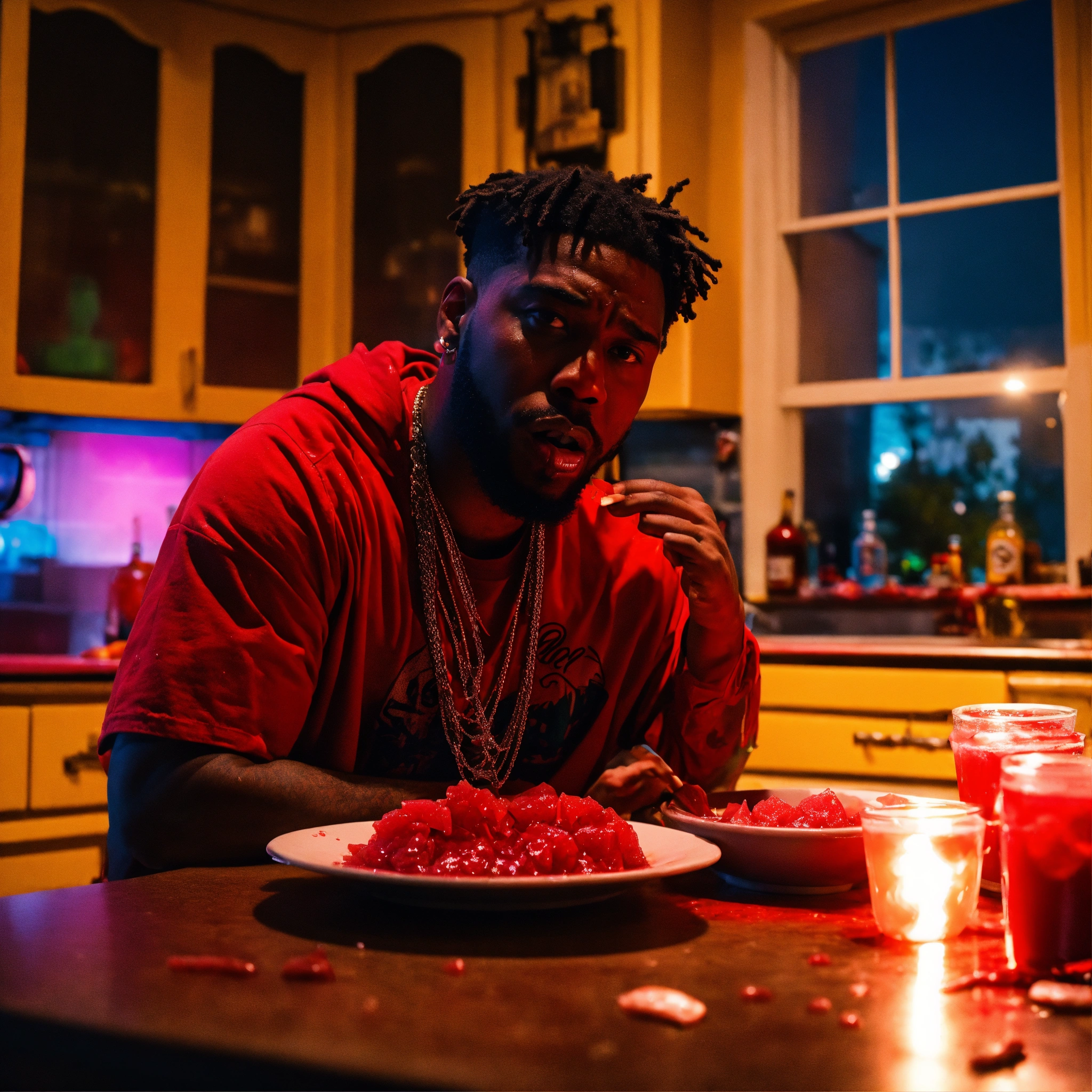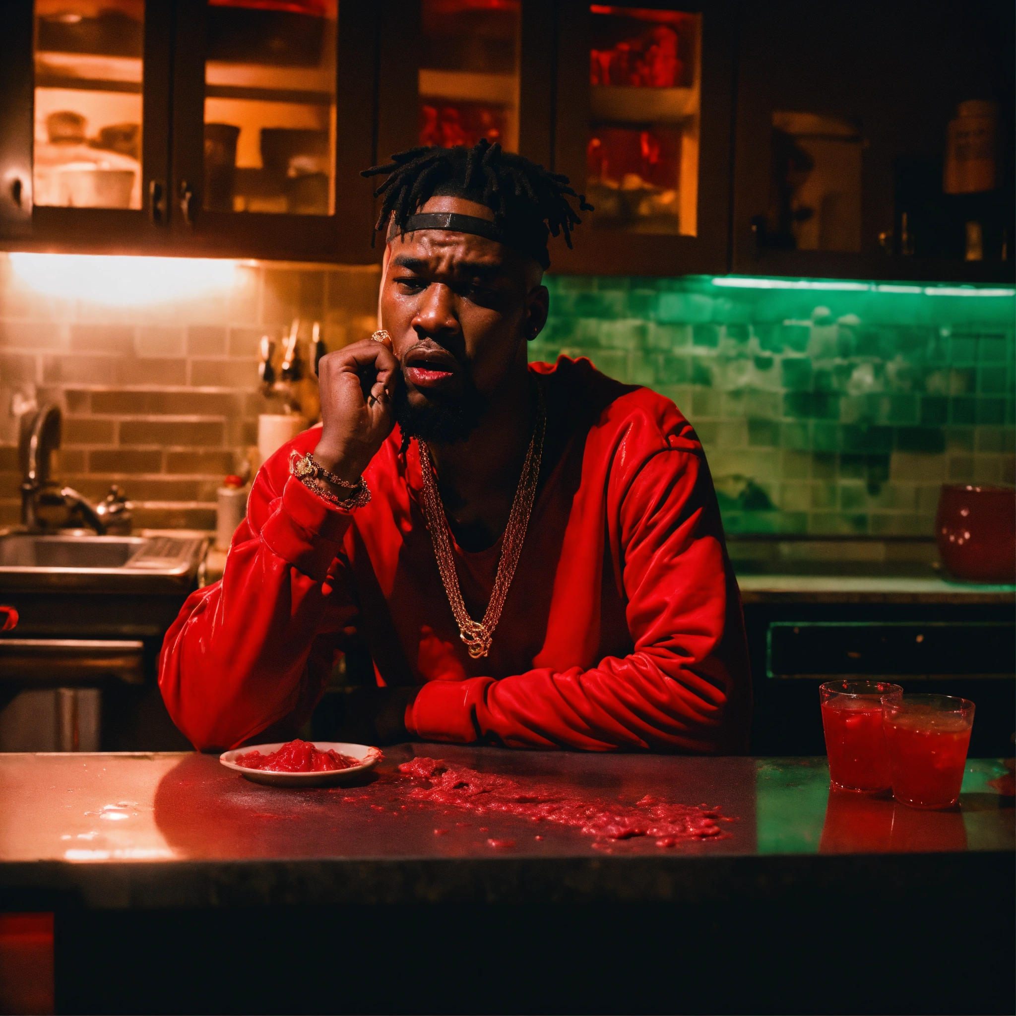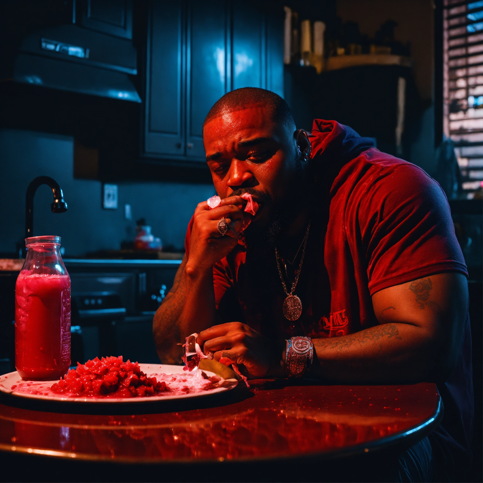 Interior view rapper antron singleton "big lurch" mean face eating raw meat in kitchen, soaked in red kool aid juice girlfriend crying on floor in a south-central los angeles house, stunning photo, dark moody aesthetic, at night, city lights in background. surreal, 8k