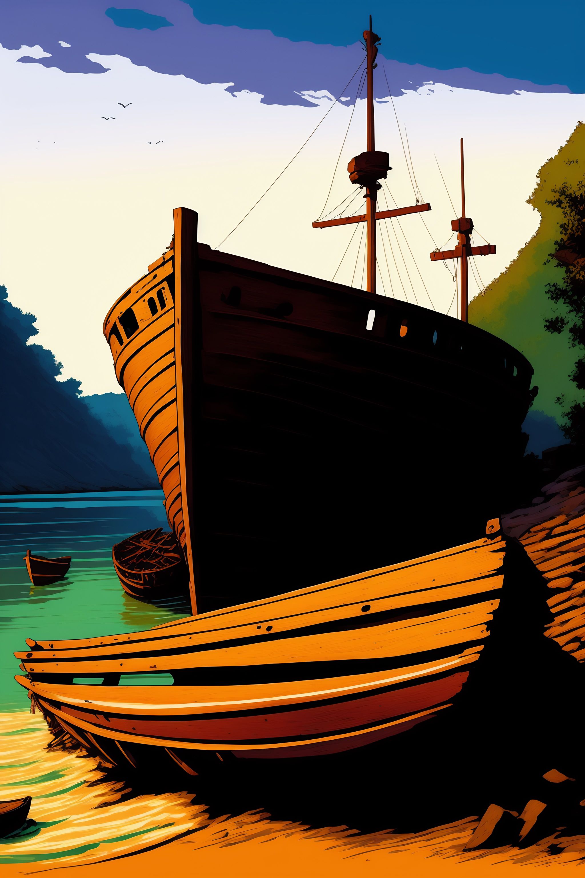 Wreck of an abandoned broken wooden boat in a port in ruins and stones and woods, illustrated by hergé, style pen and ink, warm color palette, dark atmosphere, chiaroscuro, painterly, chalk art, cautious pose