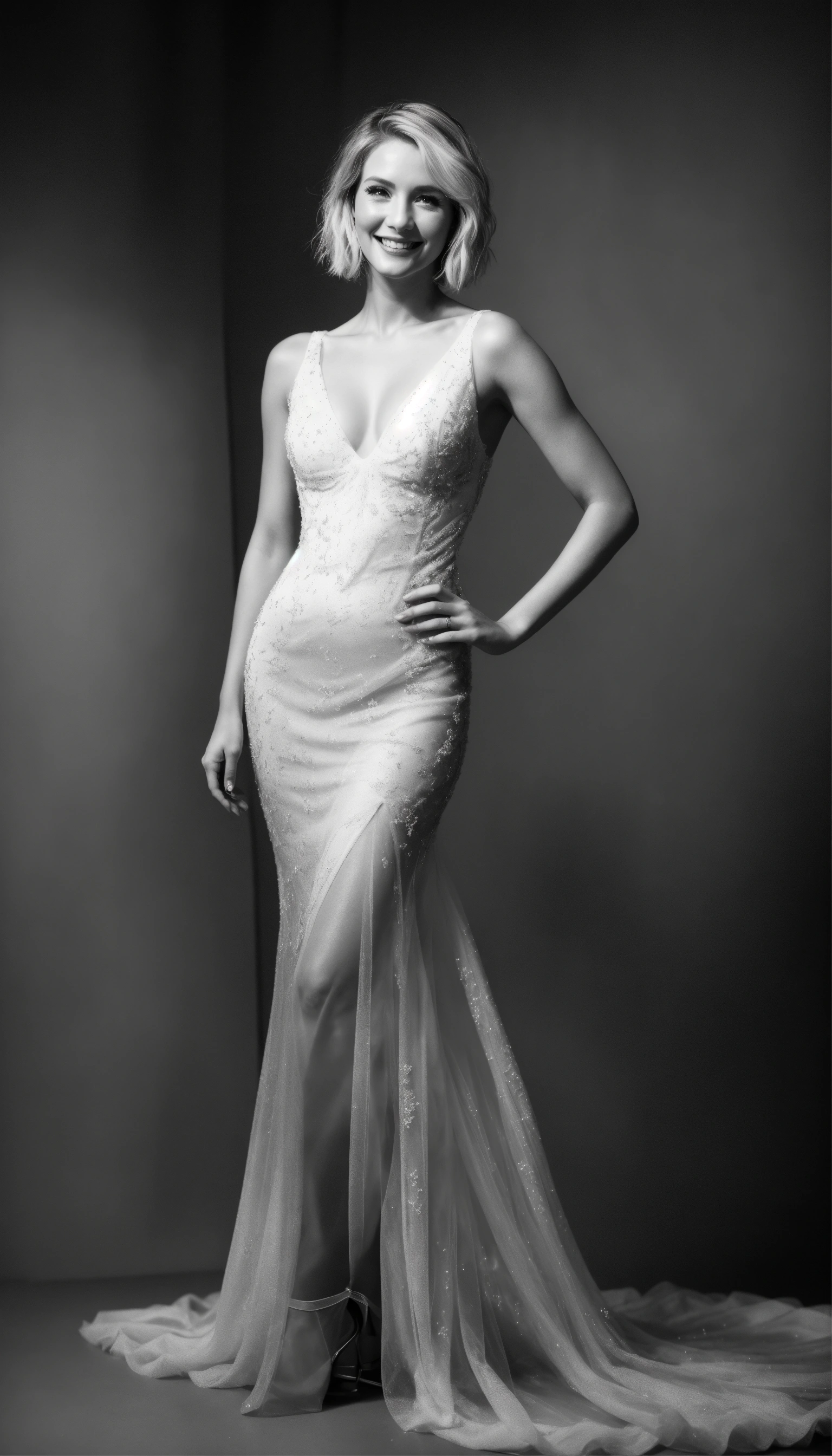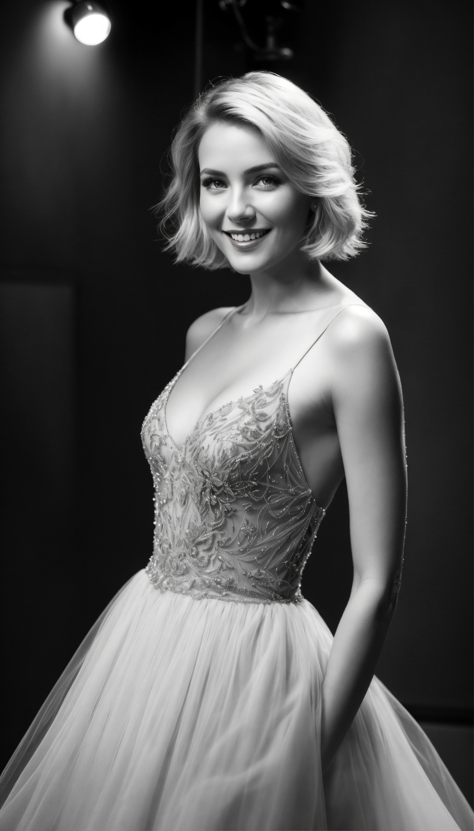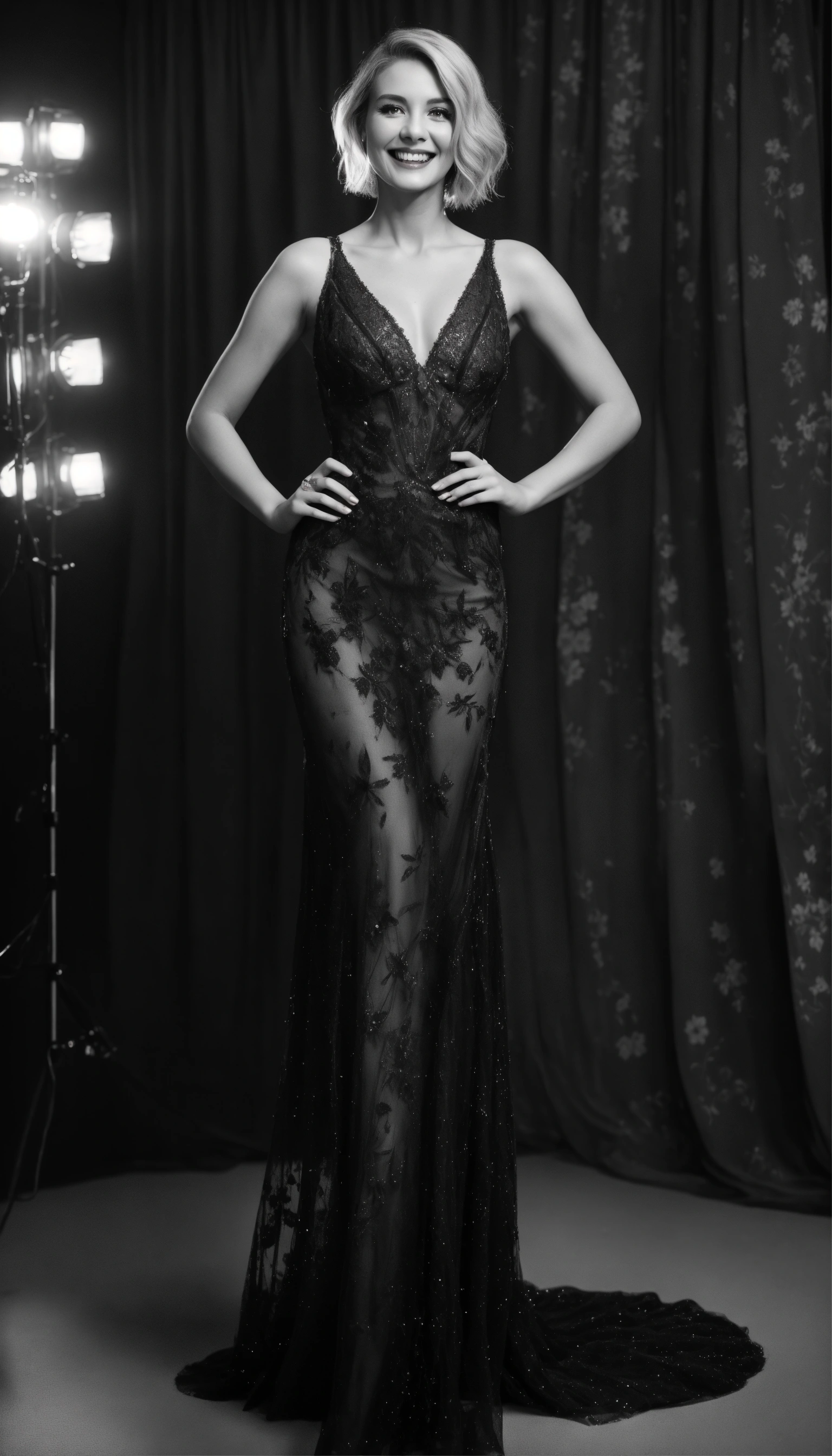 Studio photo, with knowing smile of an actress standing full length with a transparent dress, with a large neckline, woman of 35 years old, blonde, with short hair, with natural skin detail and small mole, studio photo in black and white, clear eyes, cinematic atmosphere, harcourt studio style lighting, ultra-detailed, 4k quality
