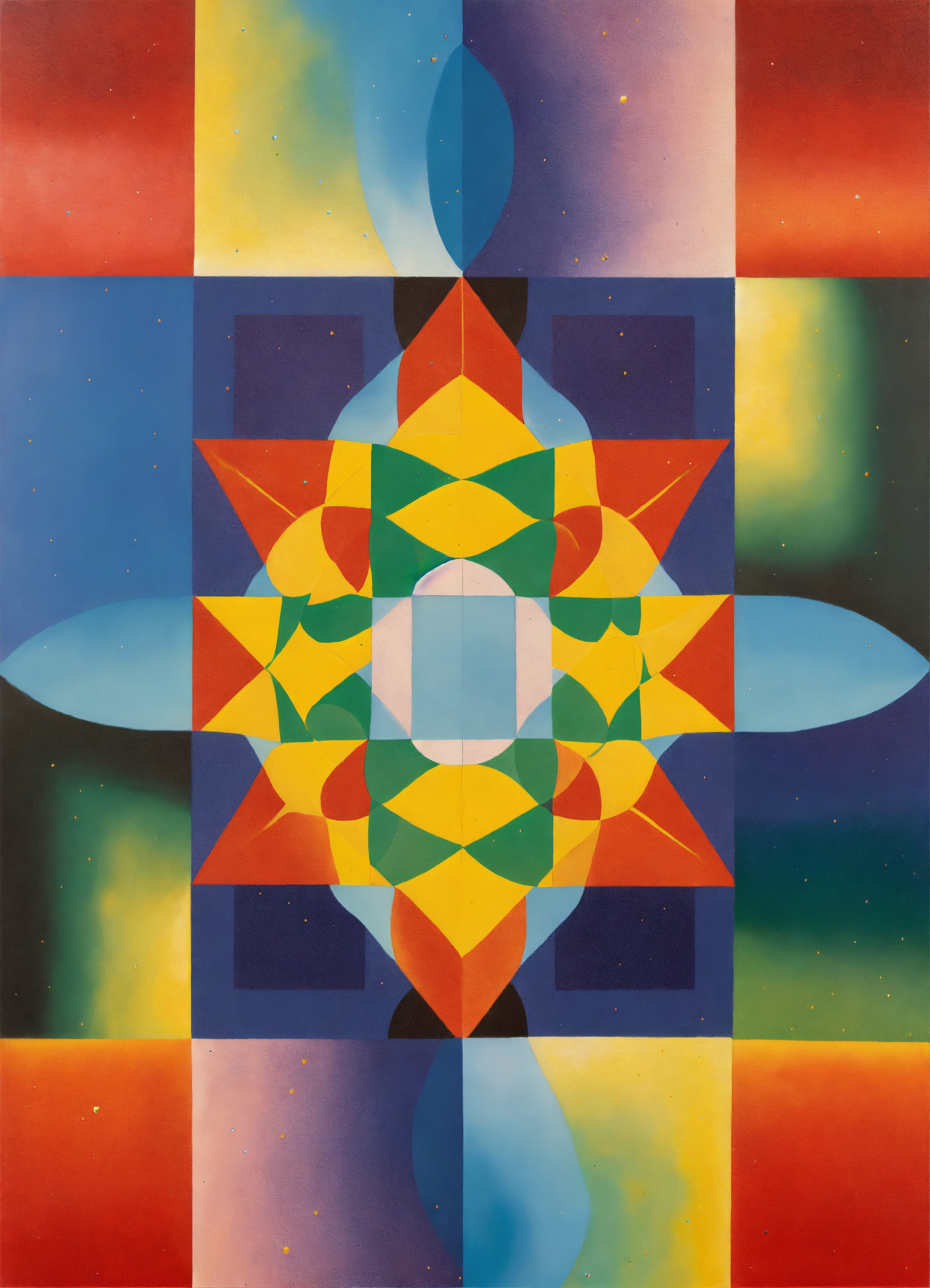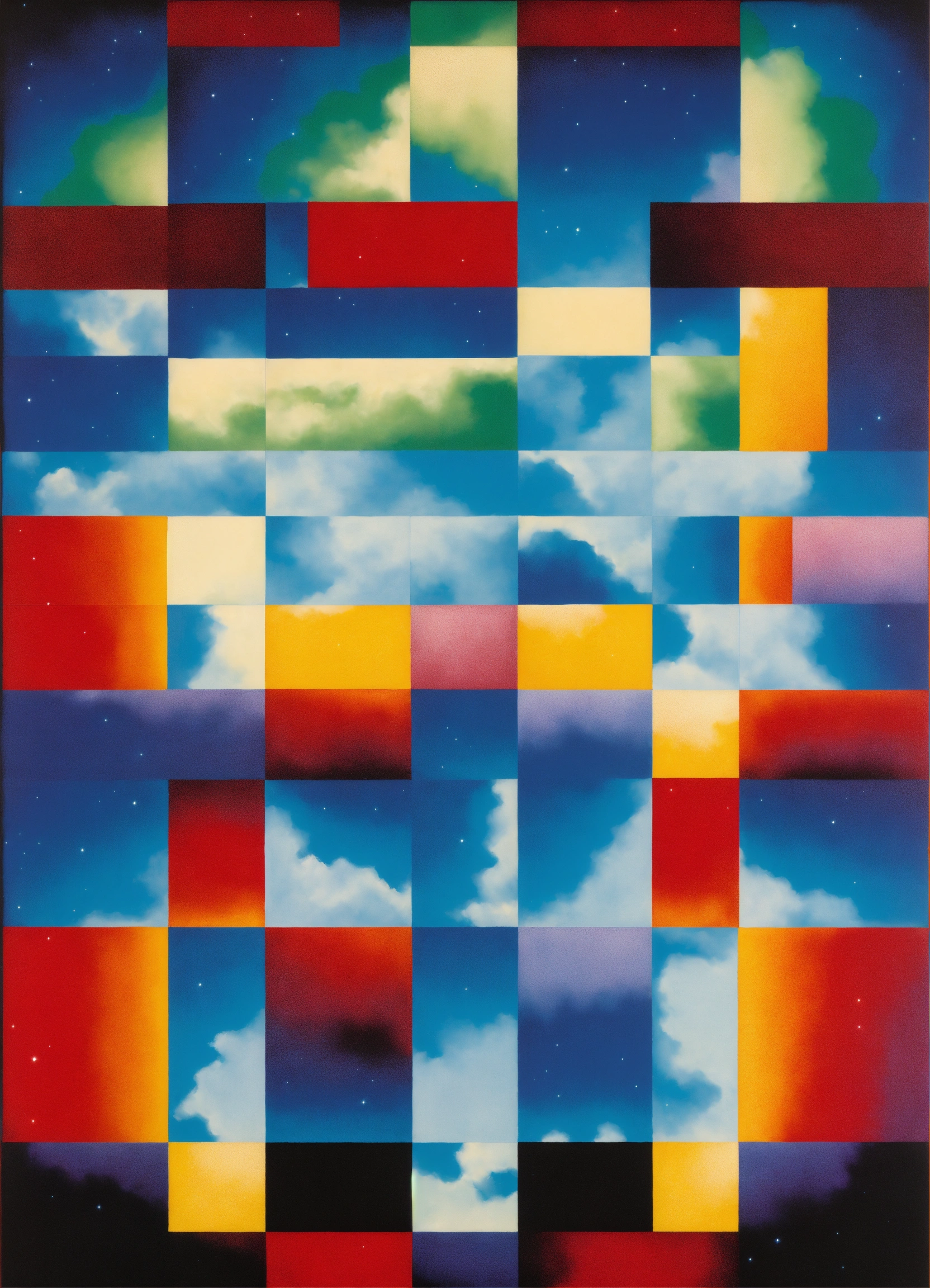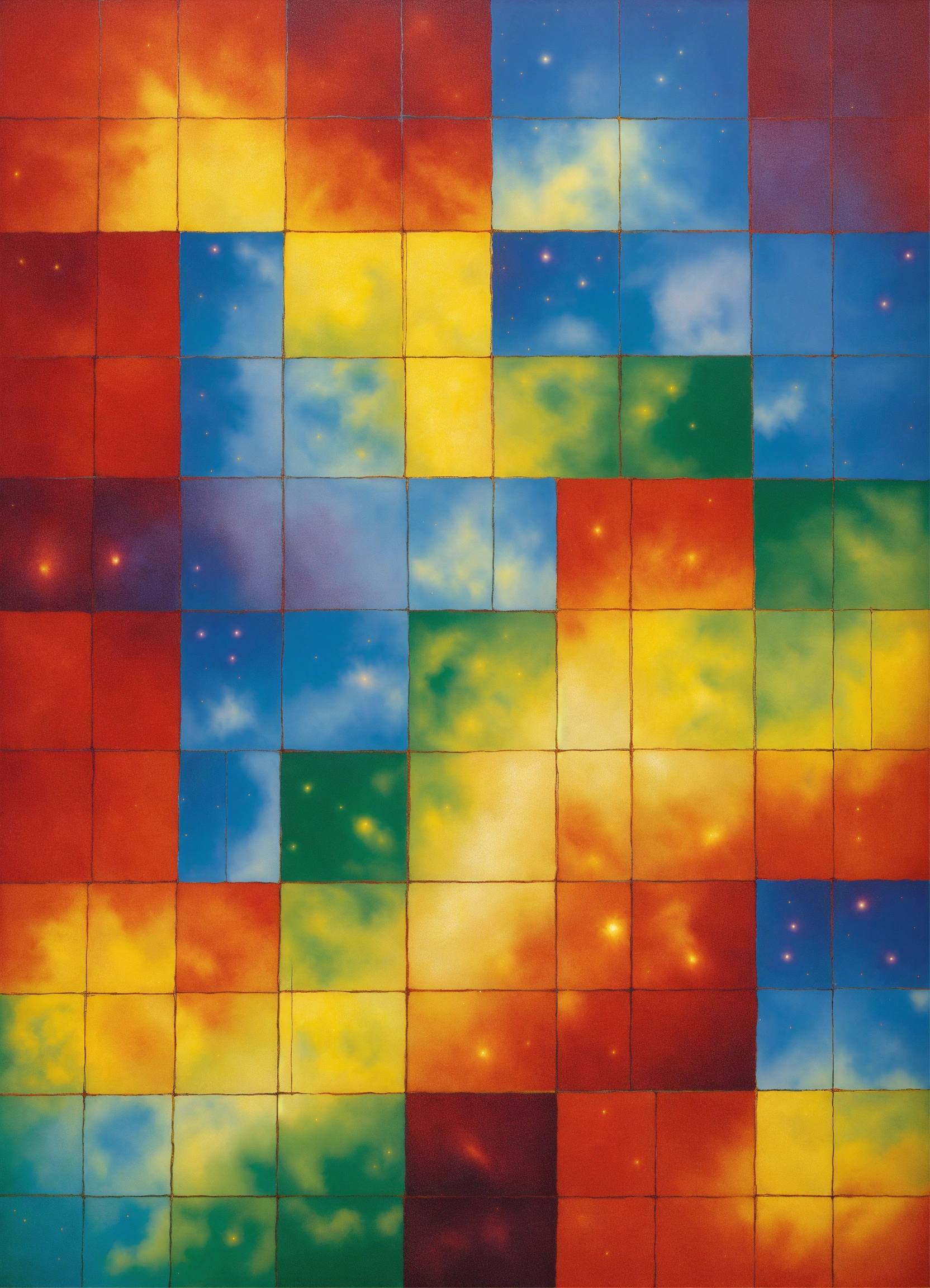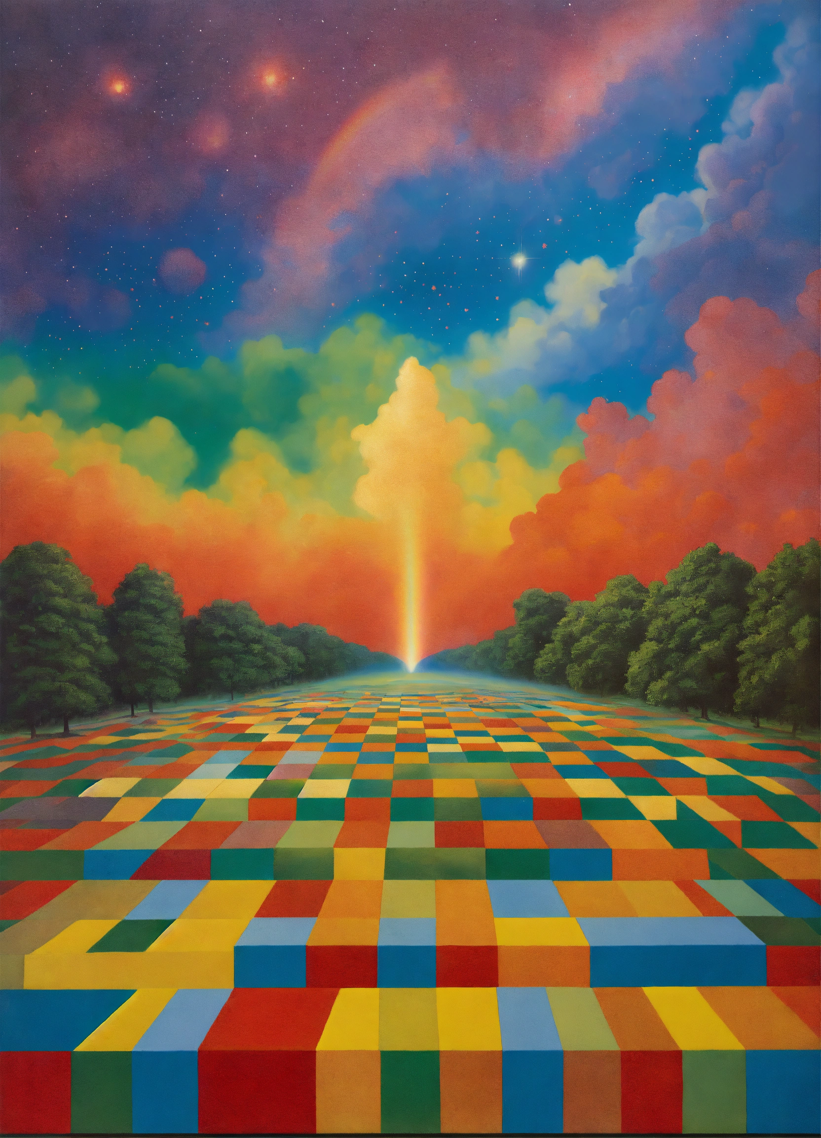 Nebula merging into nebula, psychedelic, the four corners of the cosmos, rainbow checkerboard patterns by rene magritte