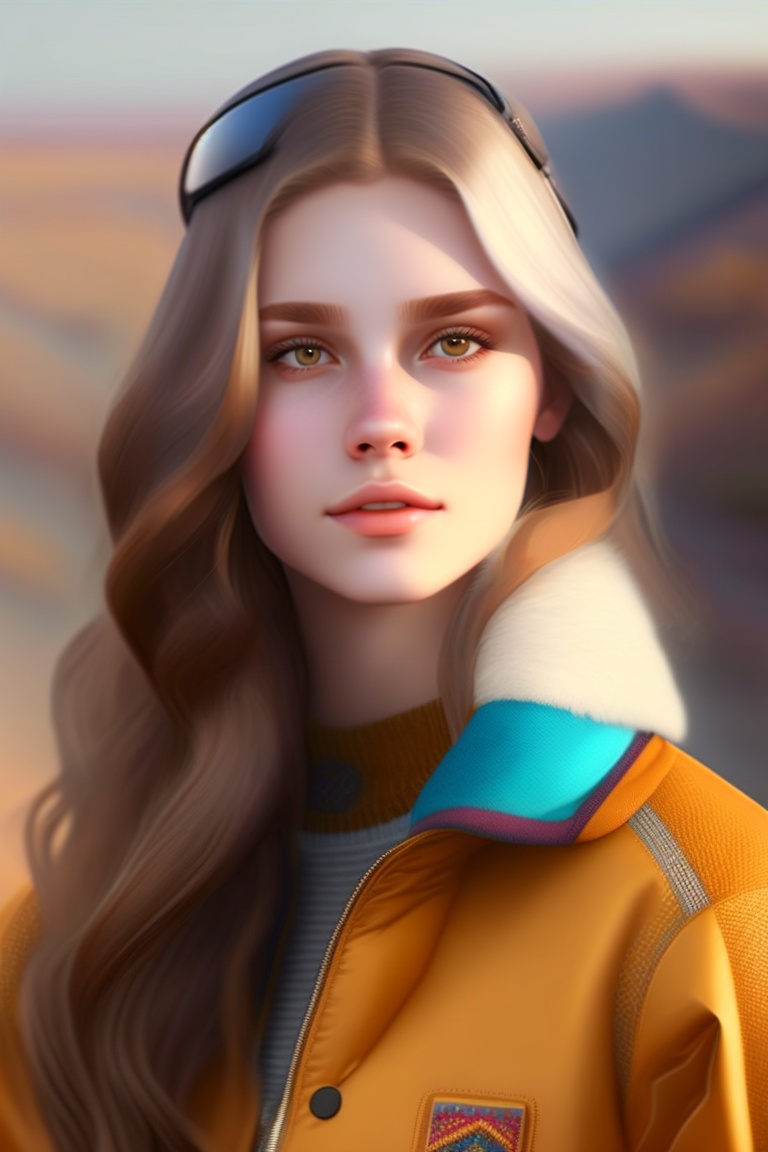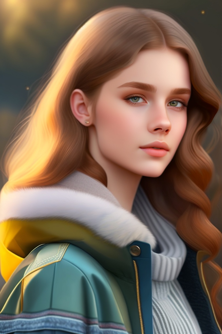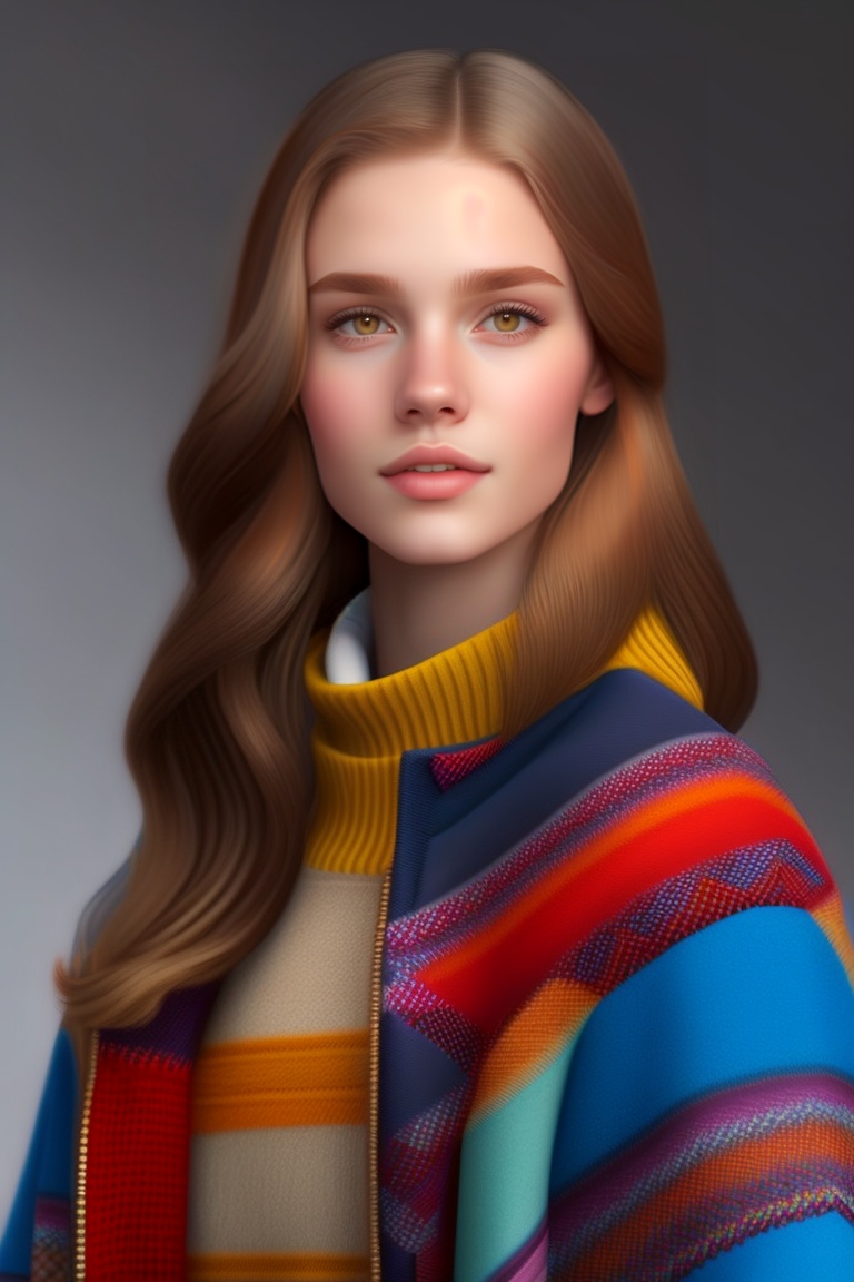 A teenage slavic girl with pale skin, shoulder-length brown hair with blonde layer underneath, brown eyes and soft features wearing colorful clothes