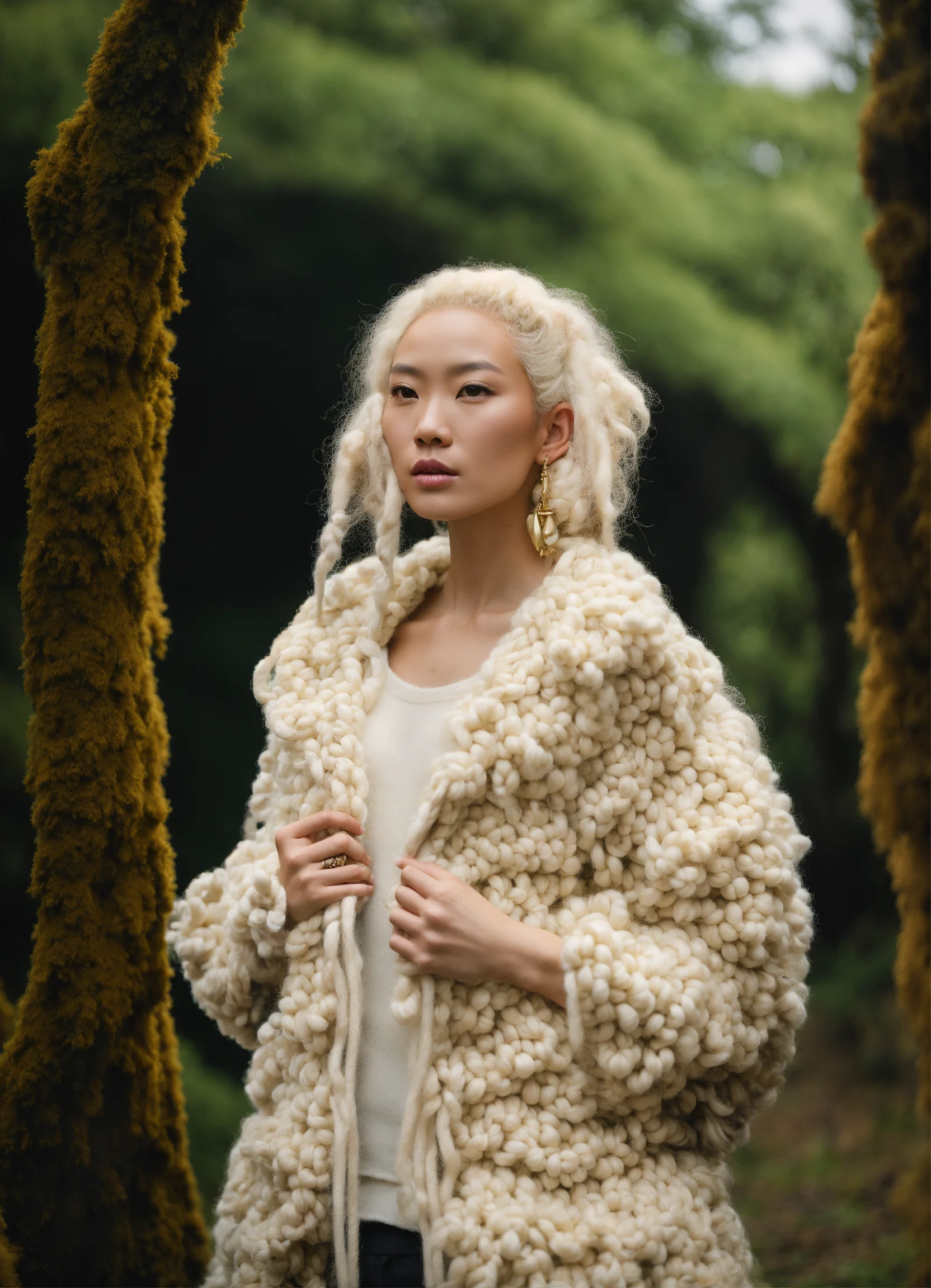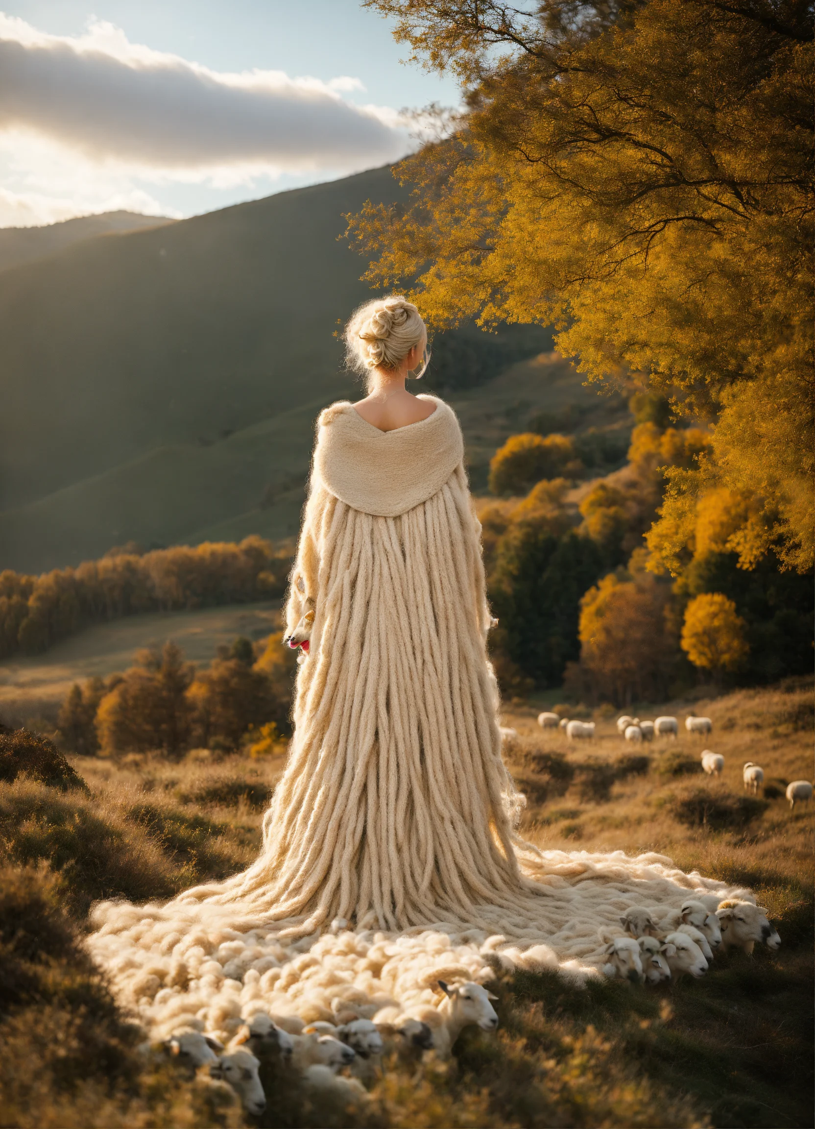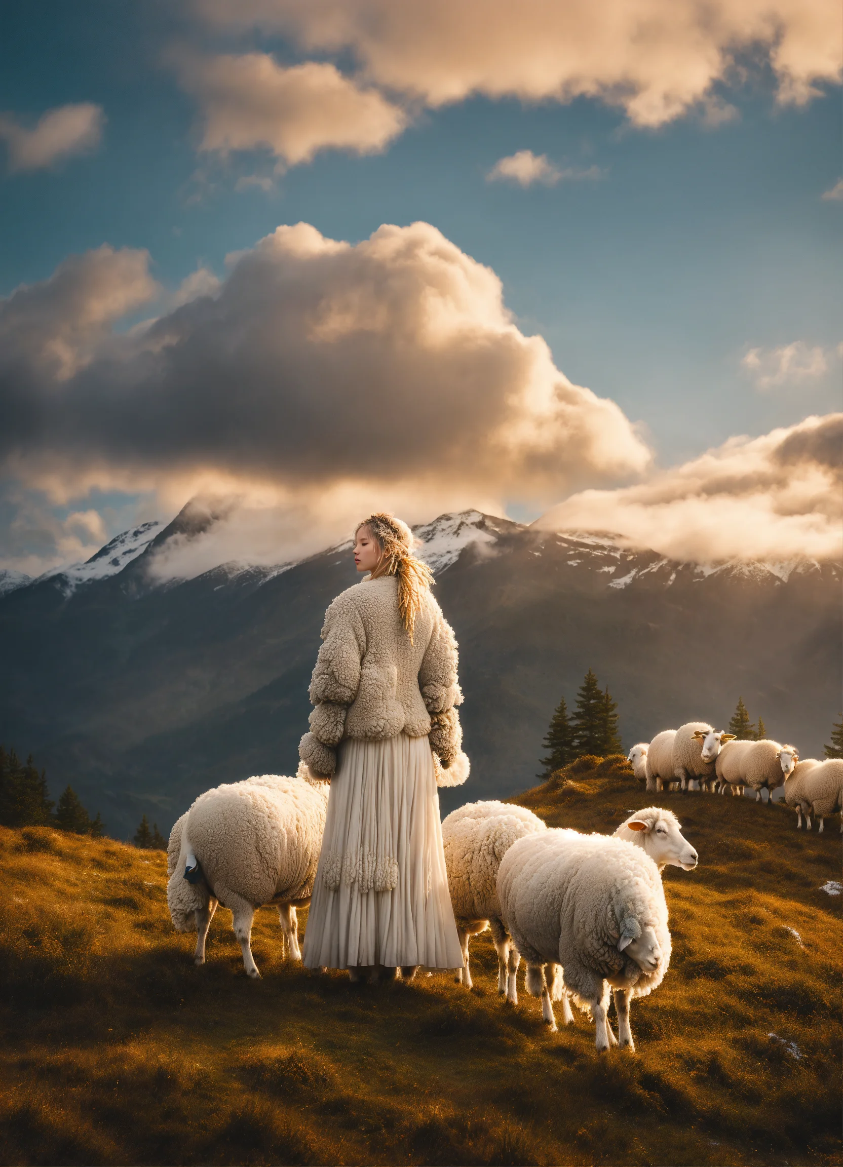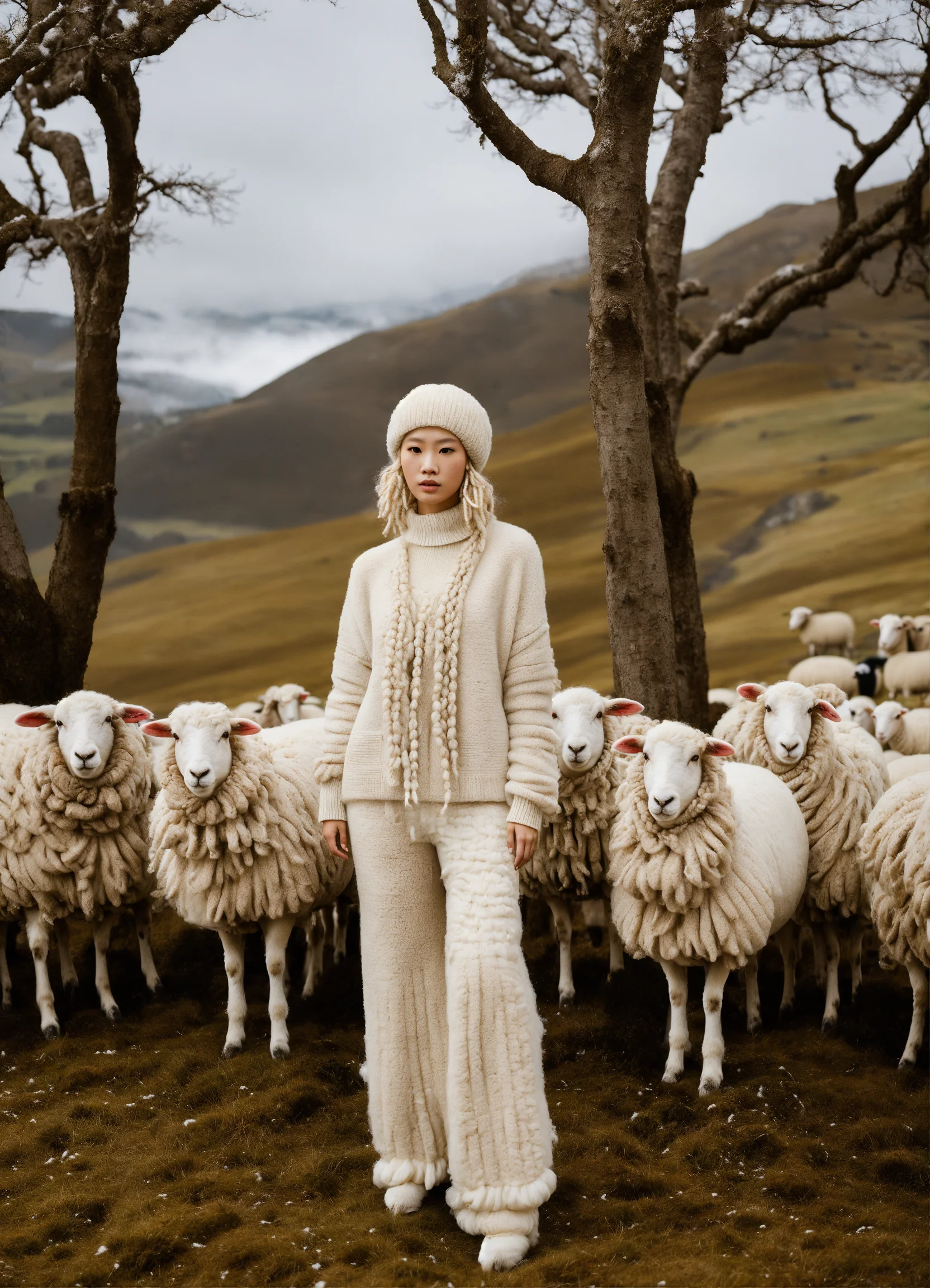 Albino-asian model, thick, wild, giant albino-beige wool dreadlocks. very large, thick, beige woolly sheep’s clothes. surrounded by sheep and big wool trees. everything is made out of sheep’s wool. model matches the sheep. mountain top