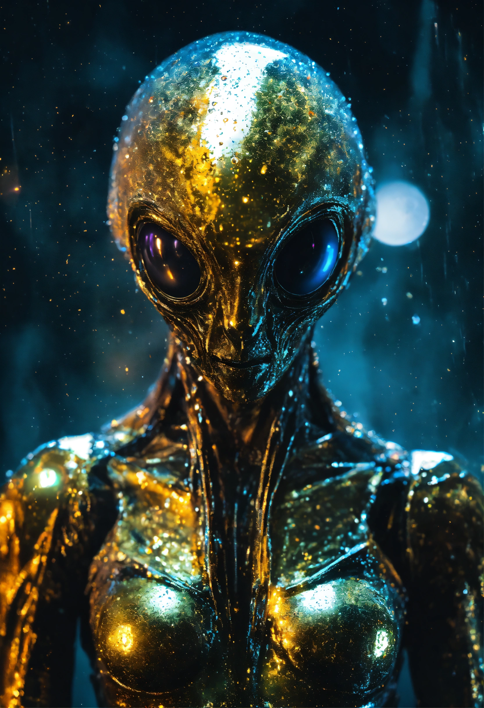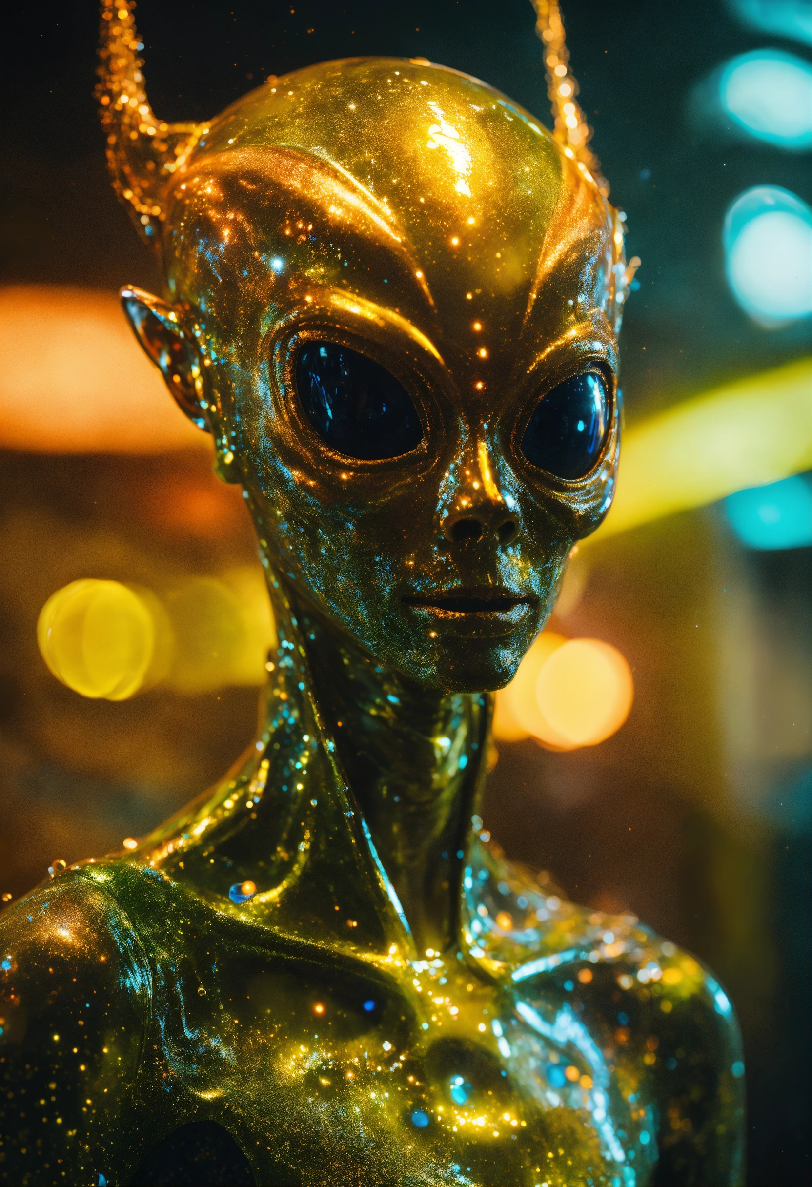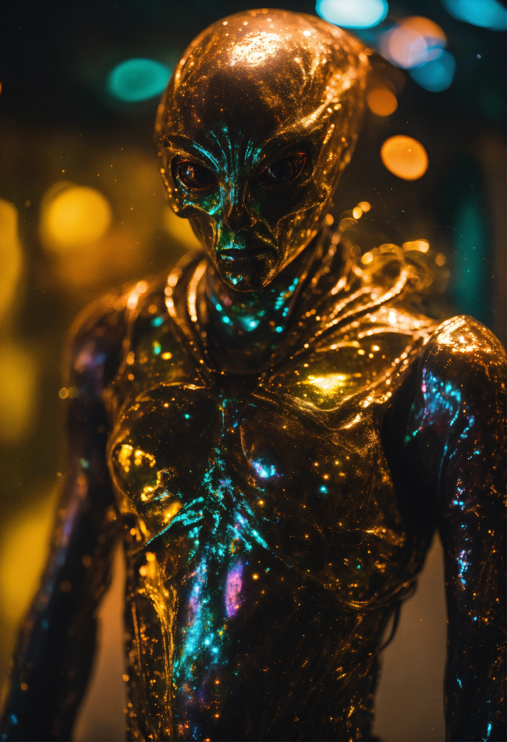 An sterotypical alien dressed up like a human for halloween, glowing eyes in the style of translucent liquid metal filled with swirling galaxies, ray tracing, raw character, 32k uhd, schlieren photography, conceptual portraiture, wet - on - wet blending