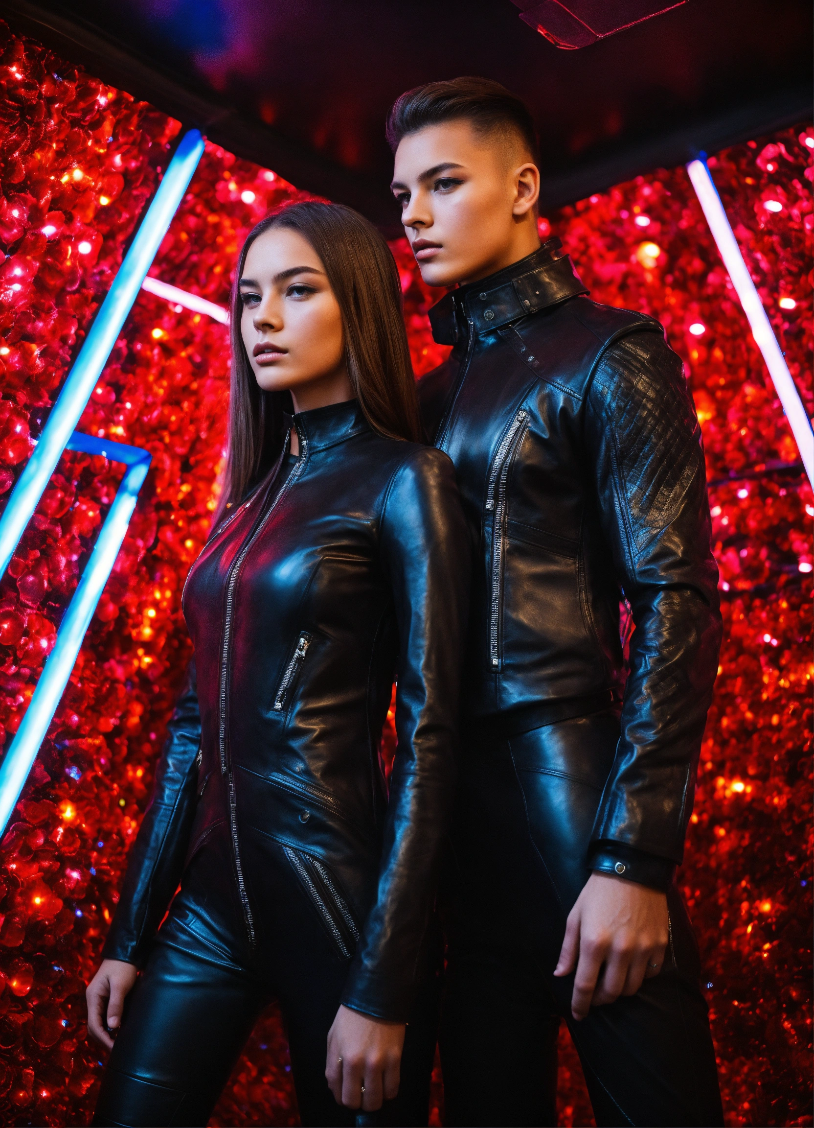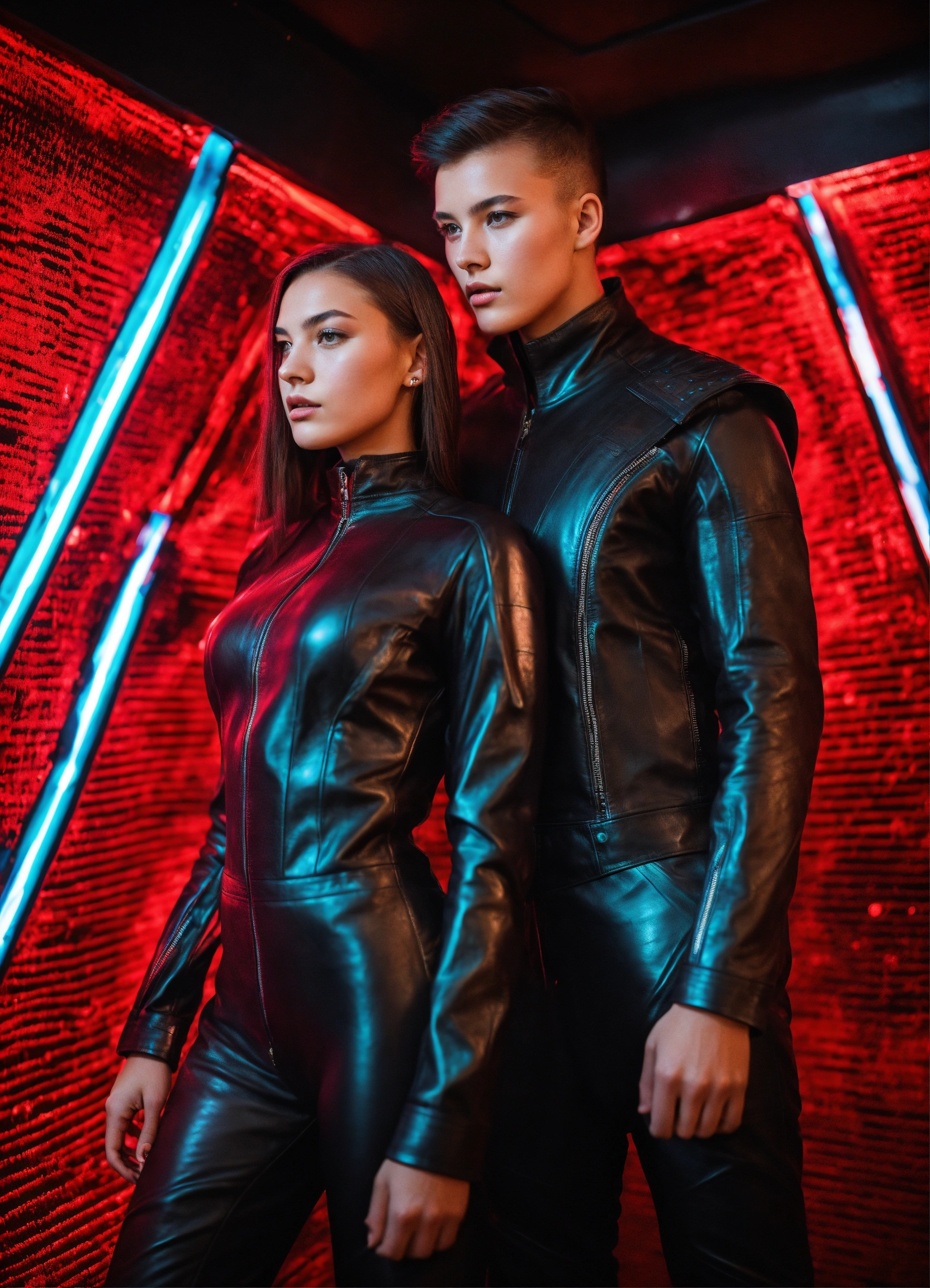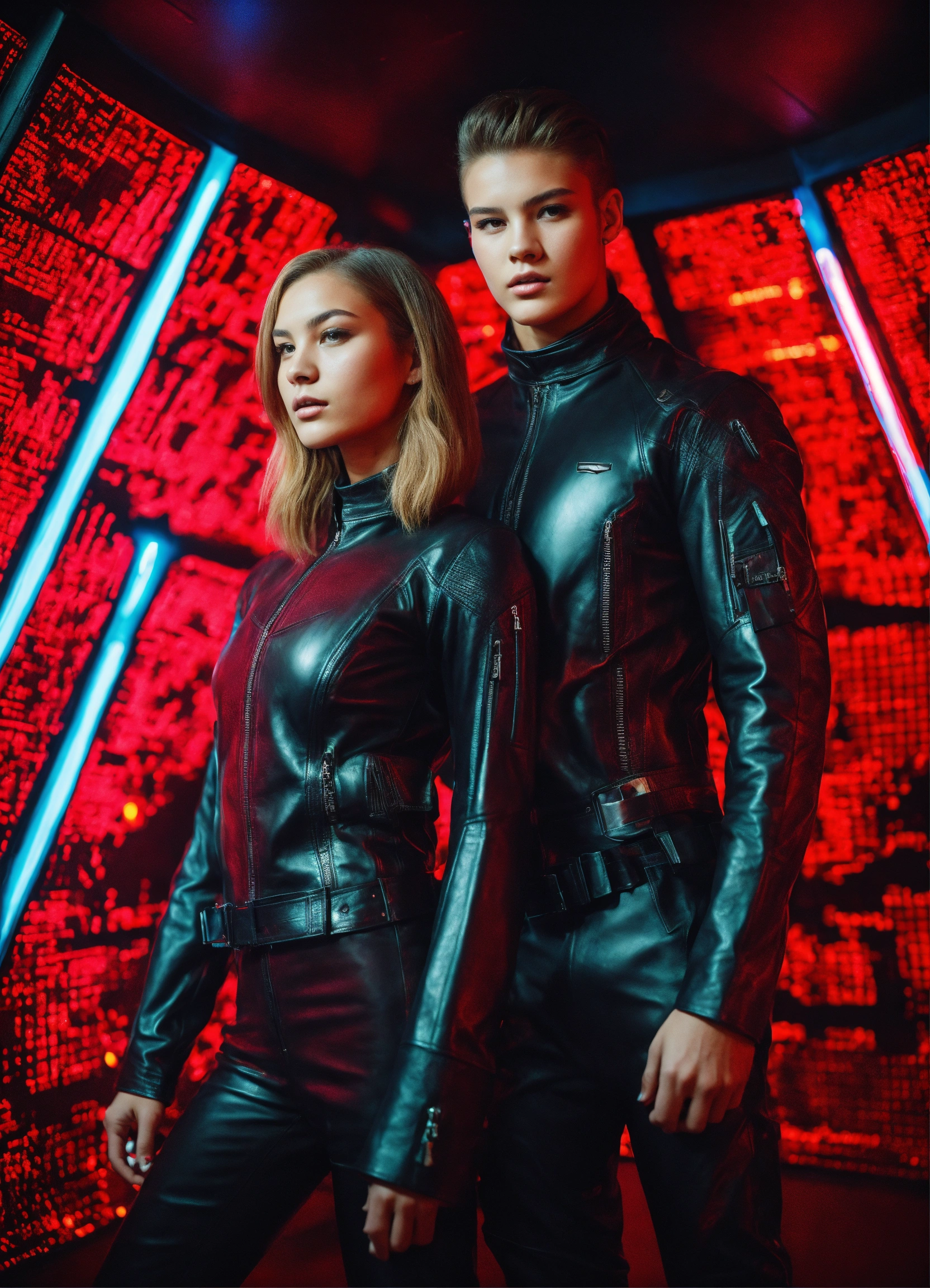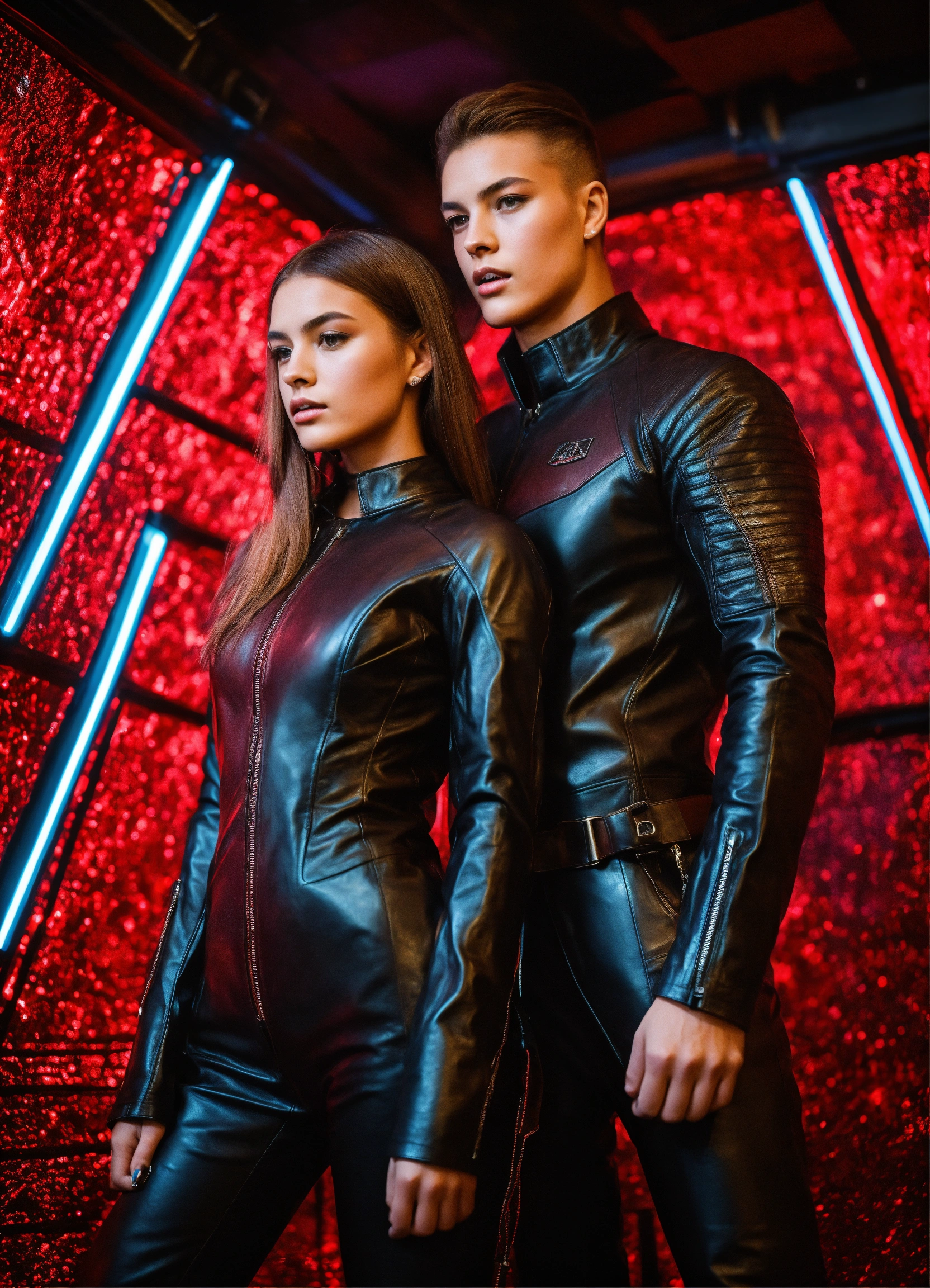 The man is tall, broad-shouldered, brutal, the girl is slender, very beautiful, 20 years old. both in leather suits of the future. space. love