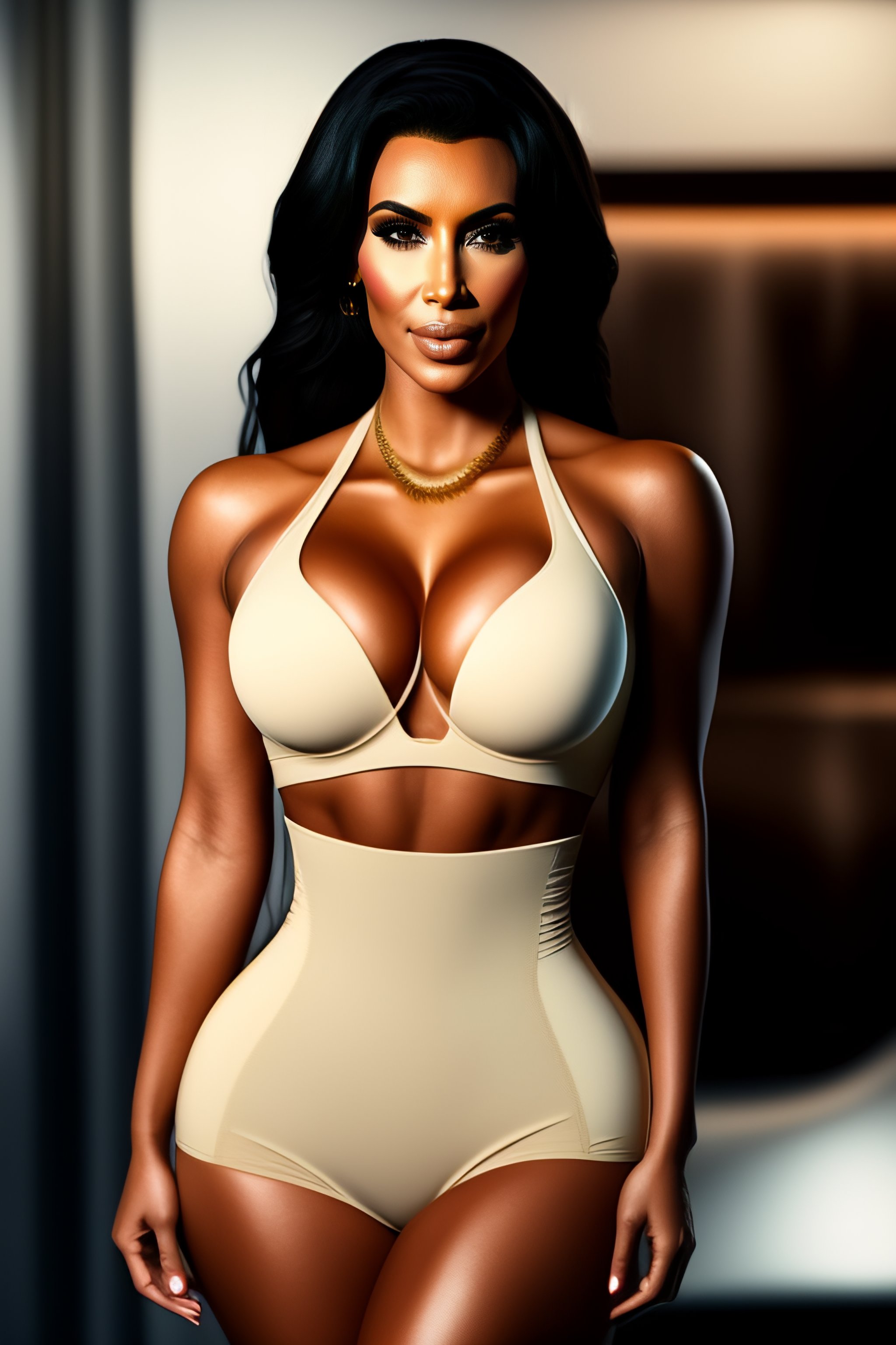 Kim kardashian perfect body, tight waist, skin tight uniform, 1988 product photography, plain background