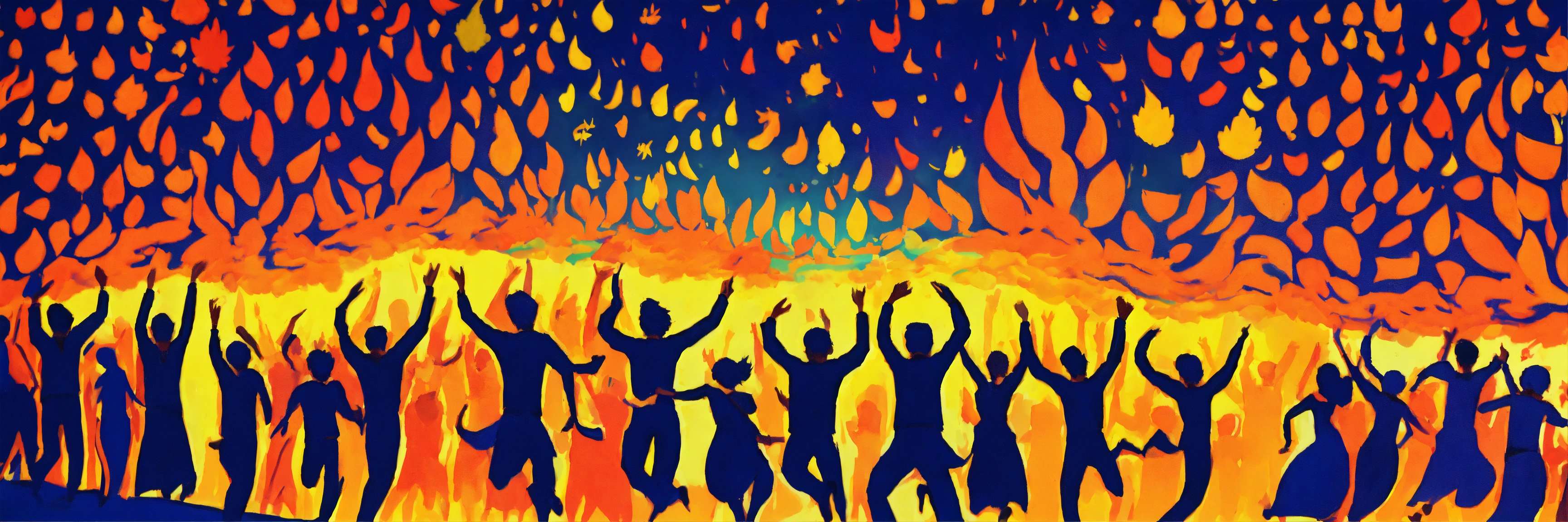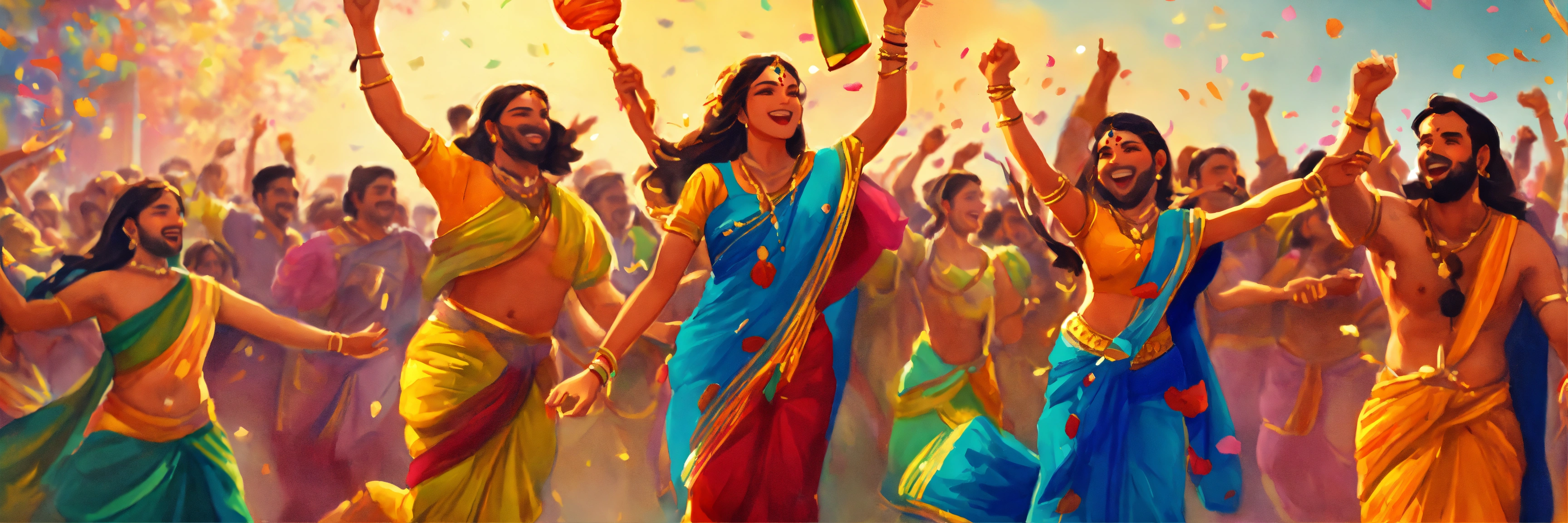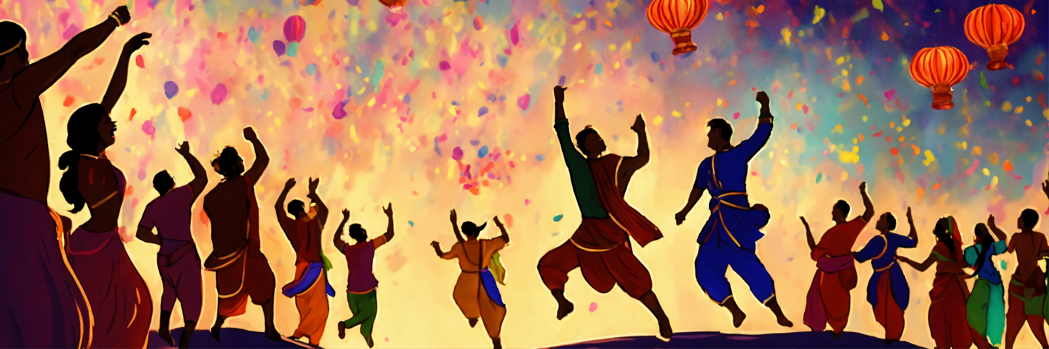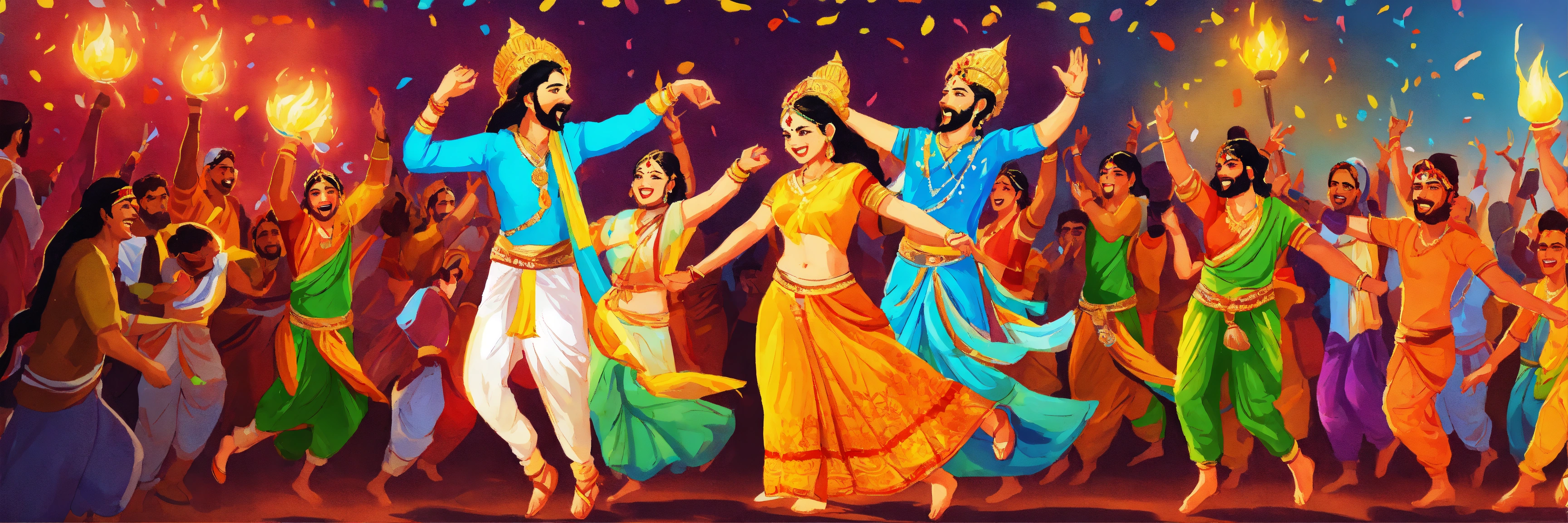 A hand drawn painting of a gathering of people jumping with joy and exuberance celebrating dushera, 4k, sharp, vibrant, lively