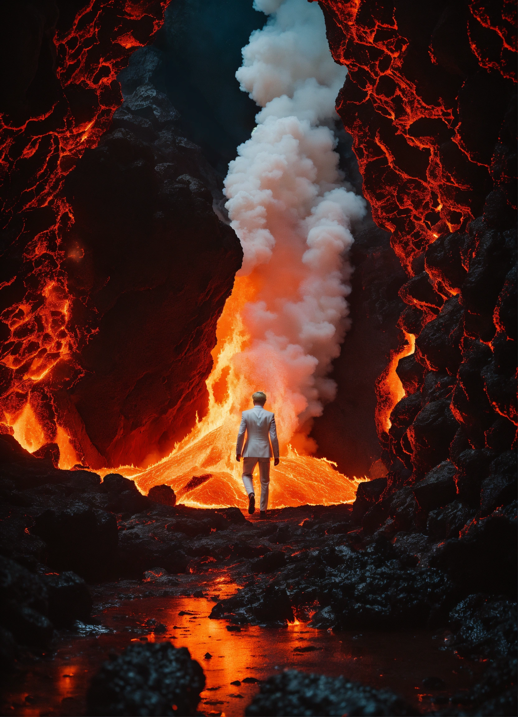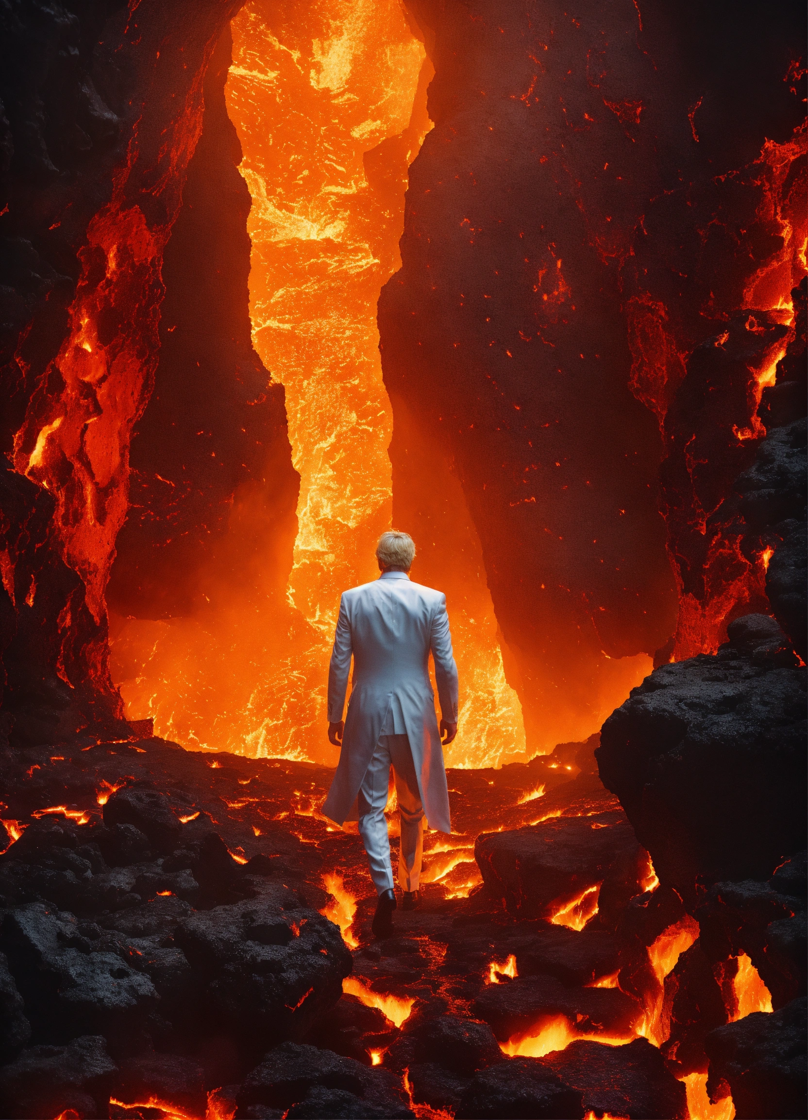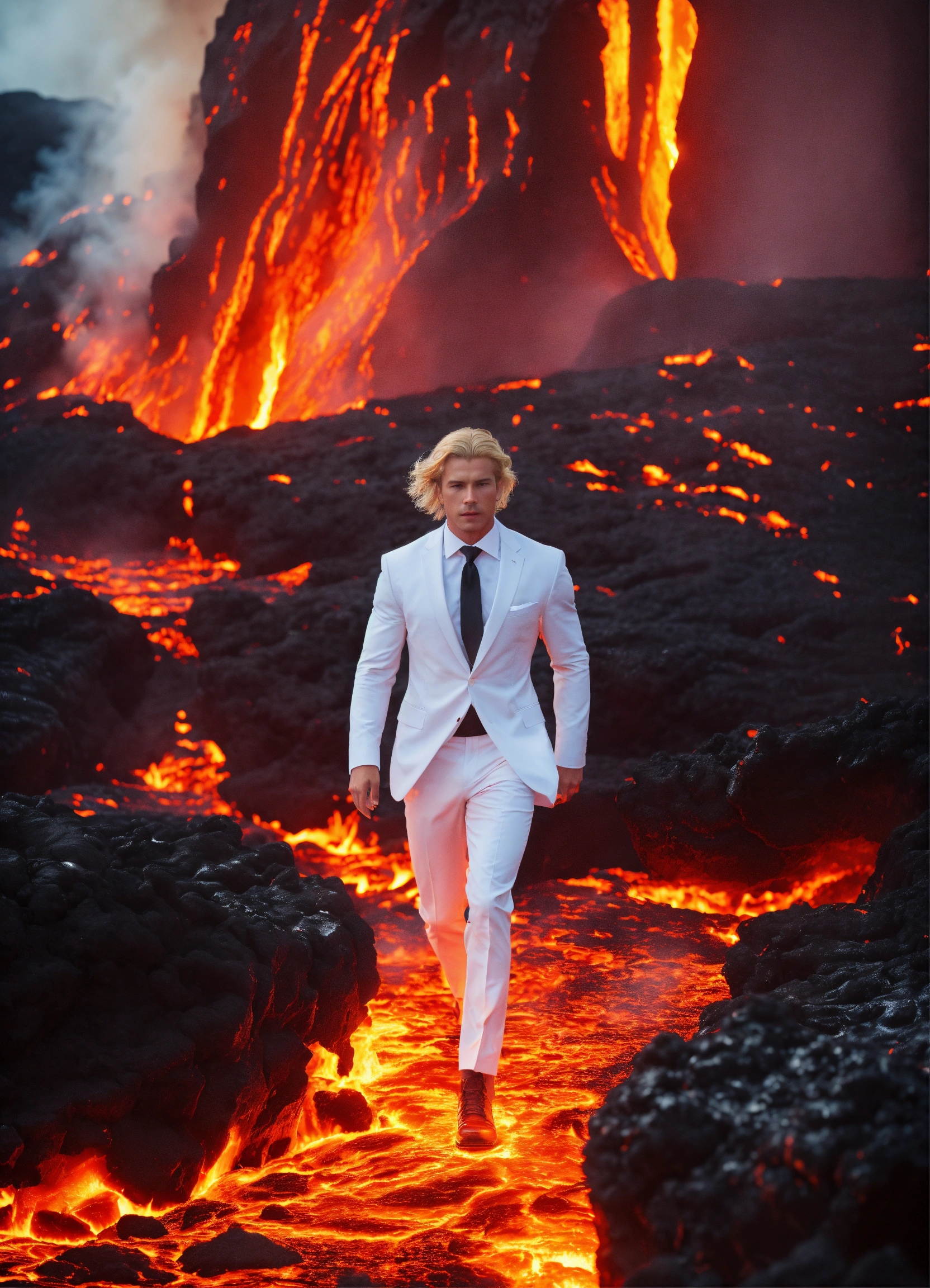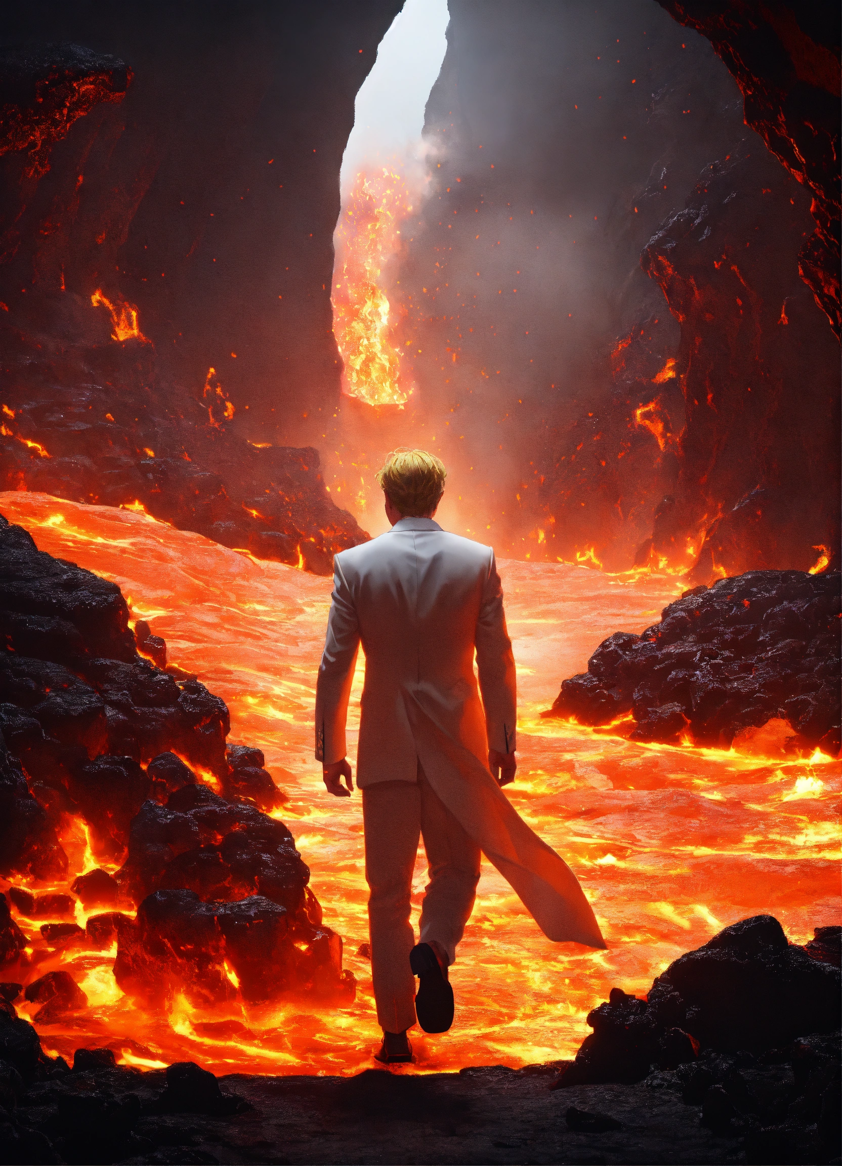 Dark cave with lava, and a man who is dressed in white formal clothing, blonde hair, walking across the lava, with fire and lava exploding on each side of him, sharp
