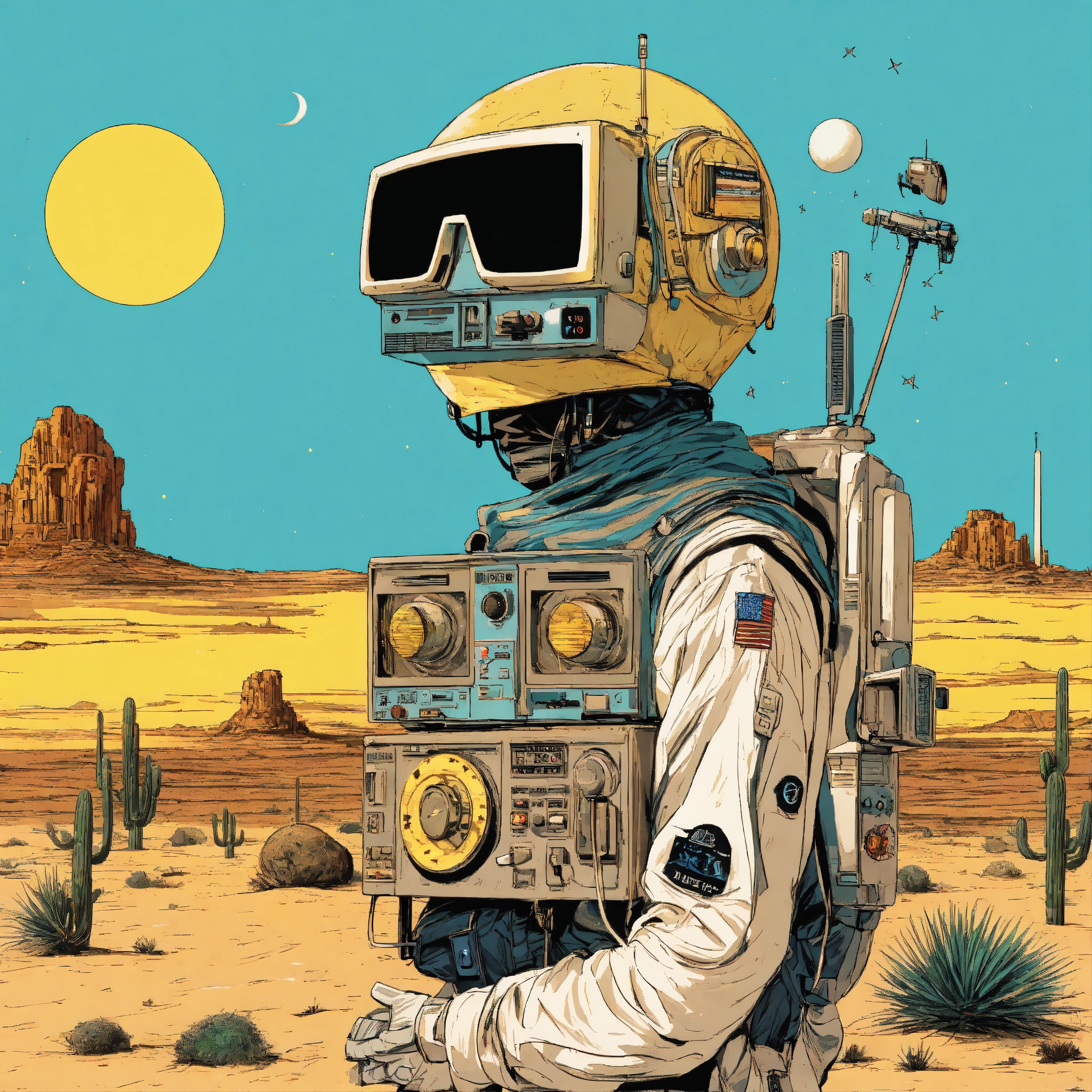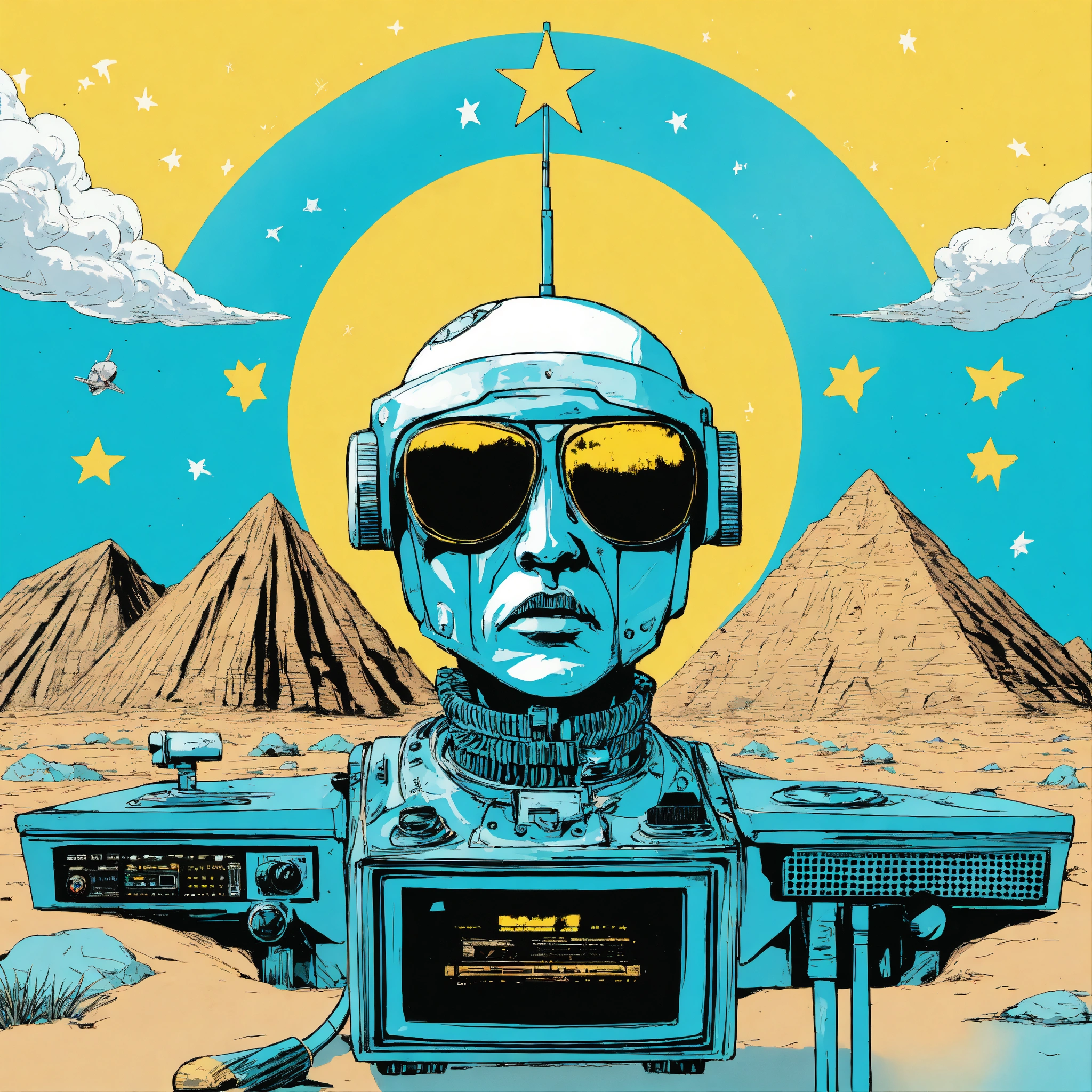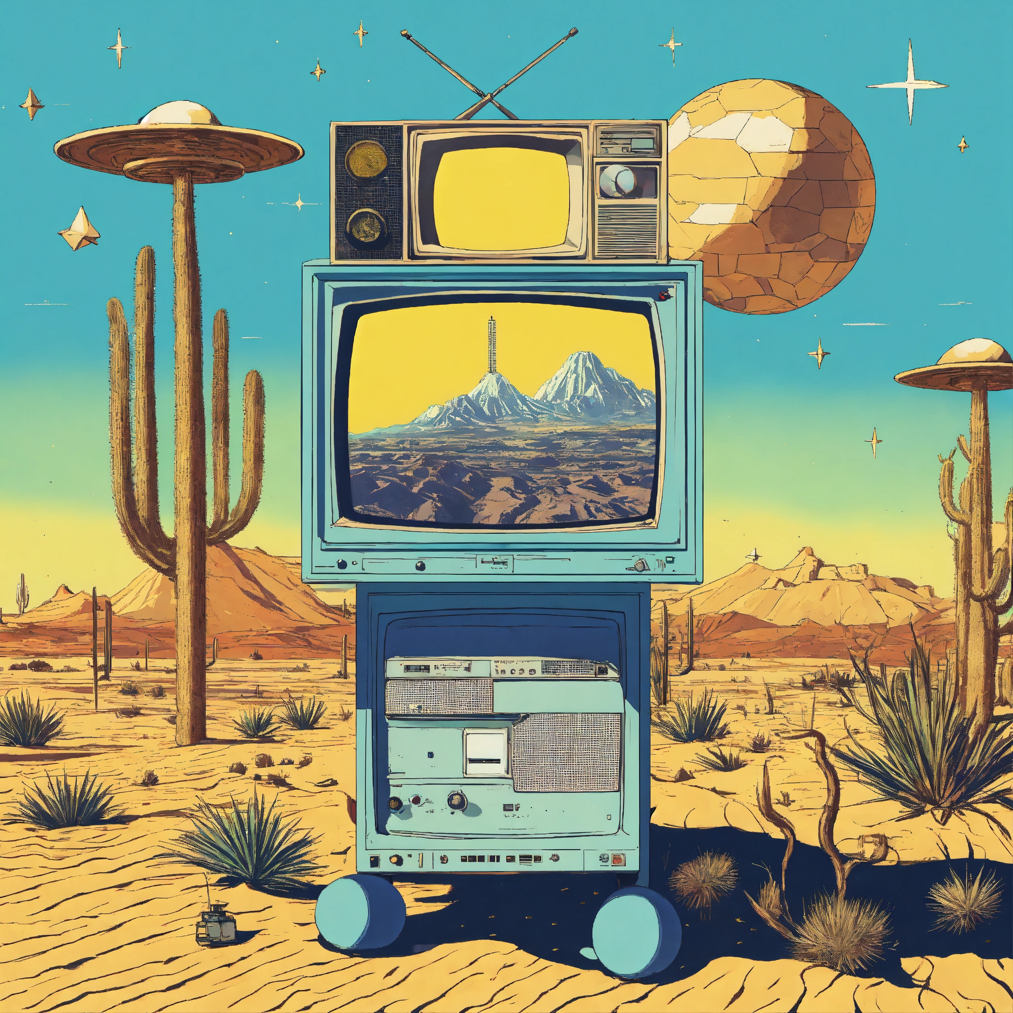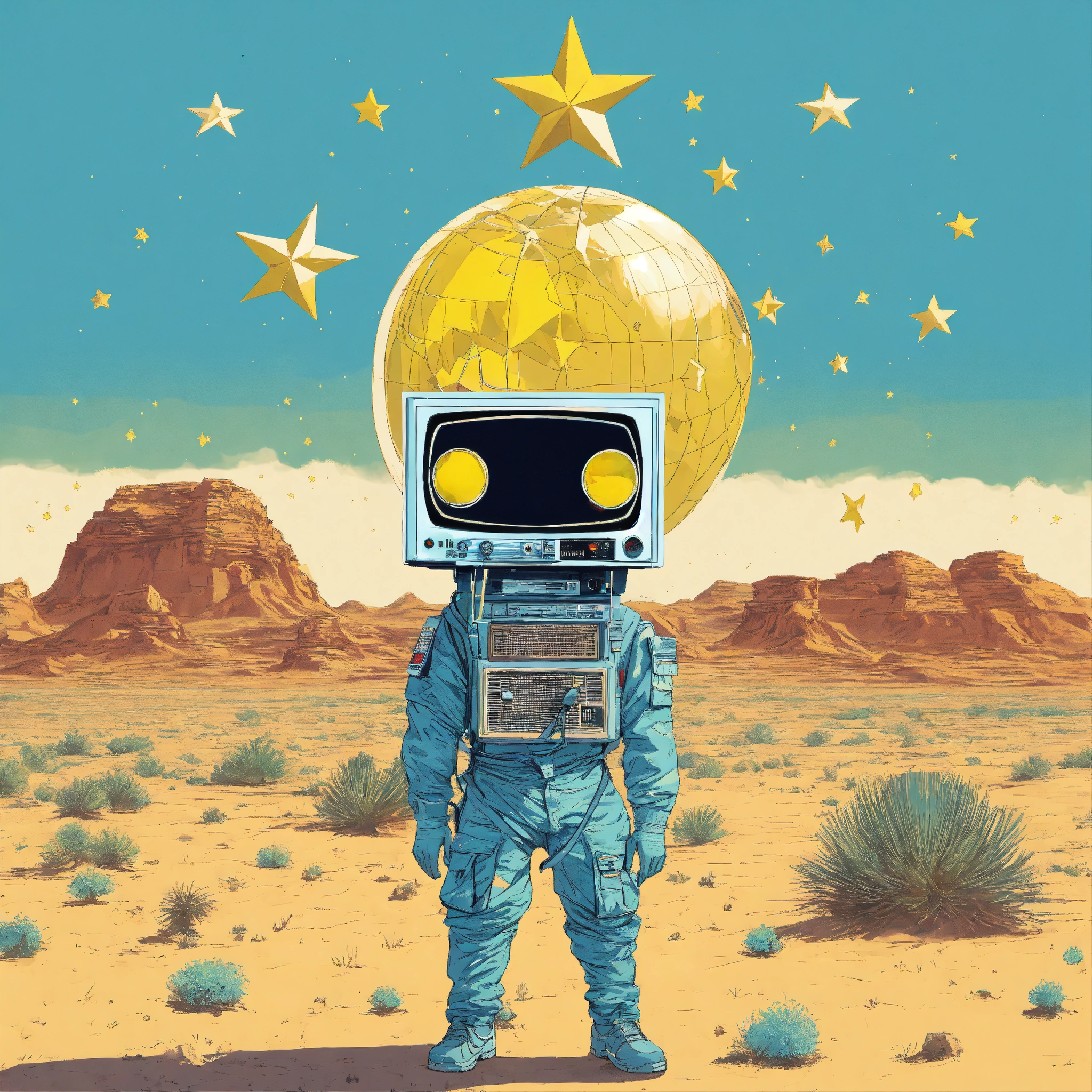 A human dictator with television-head on a war propagand art style sky blue and white colors 80’s with yellow stars on a desert punk planet