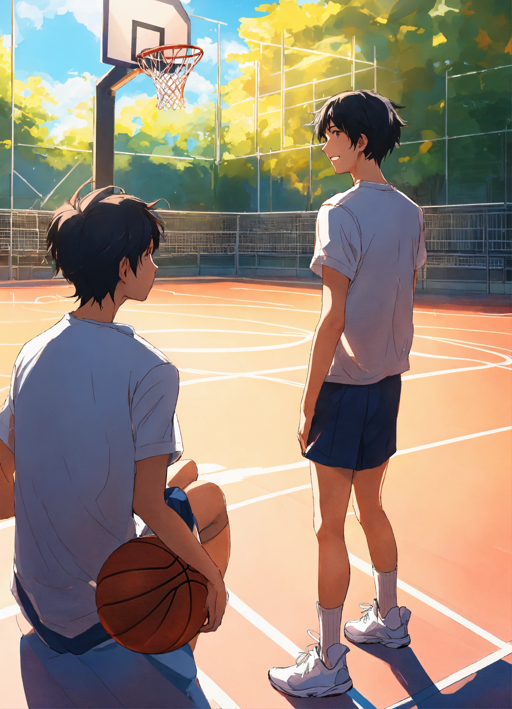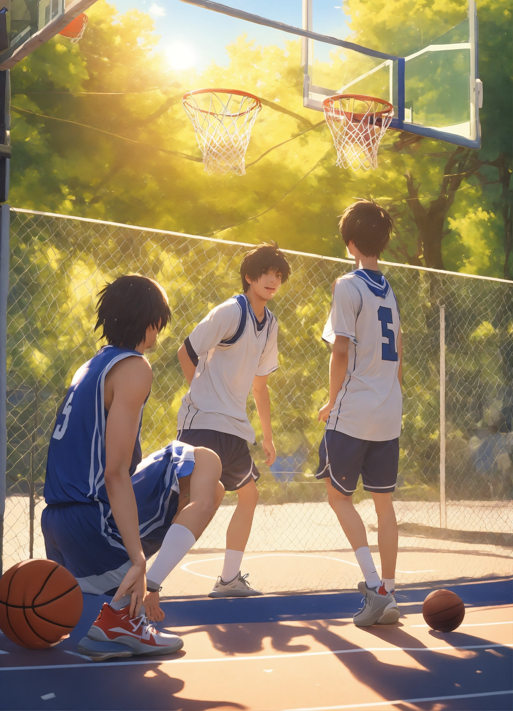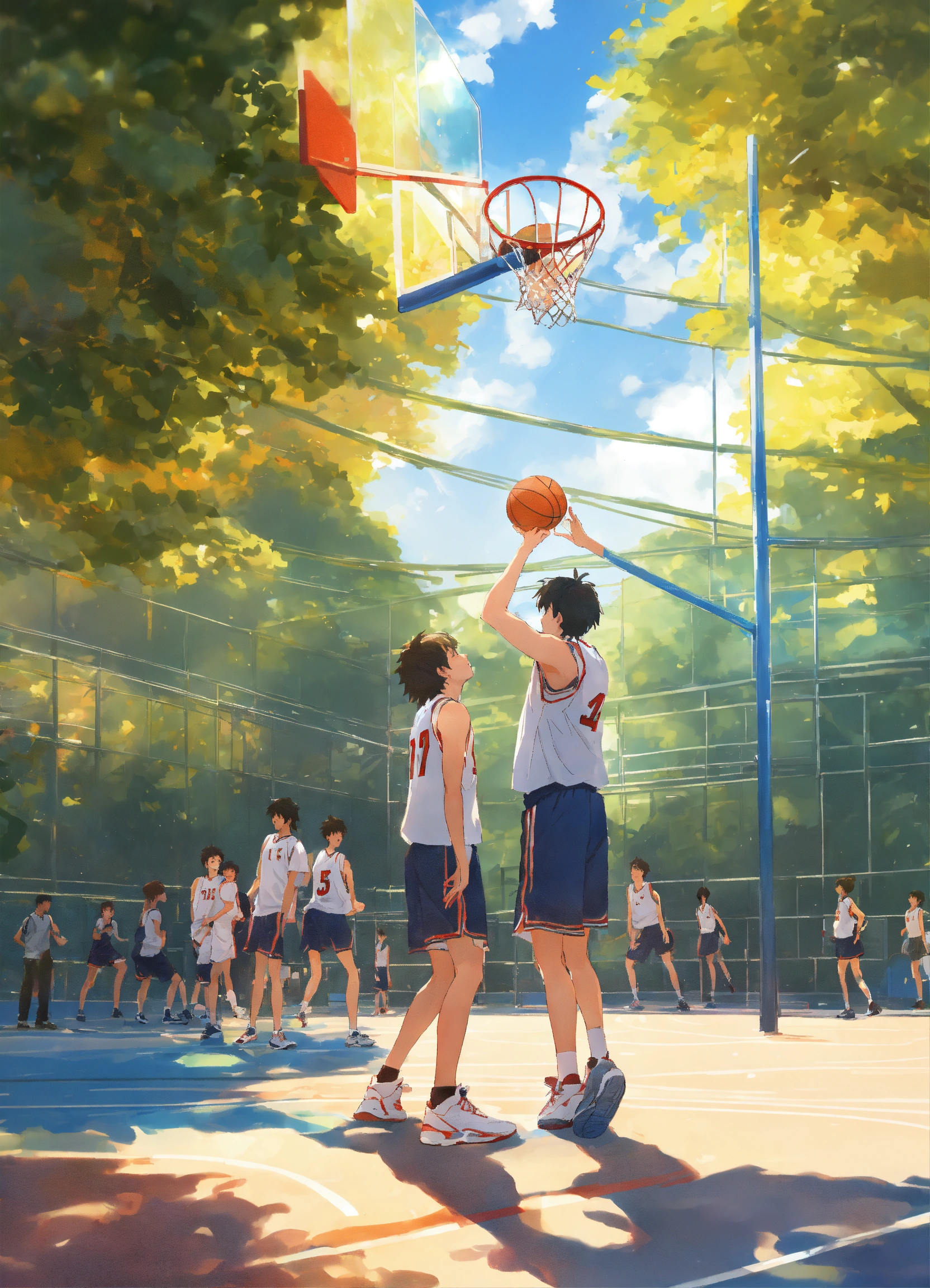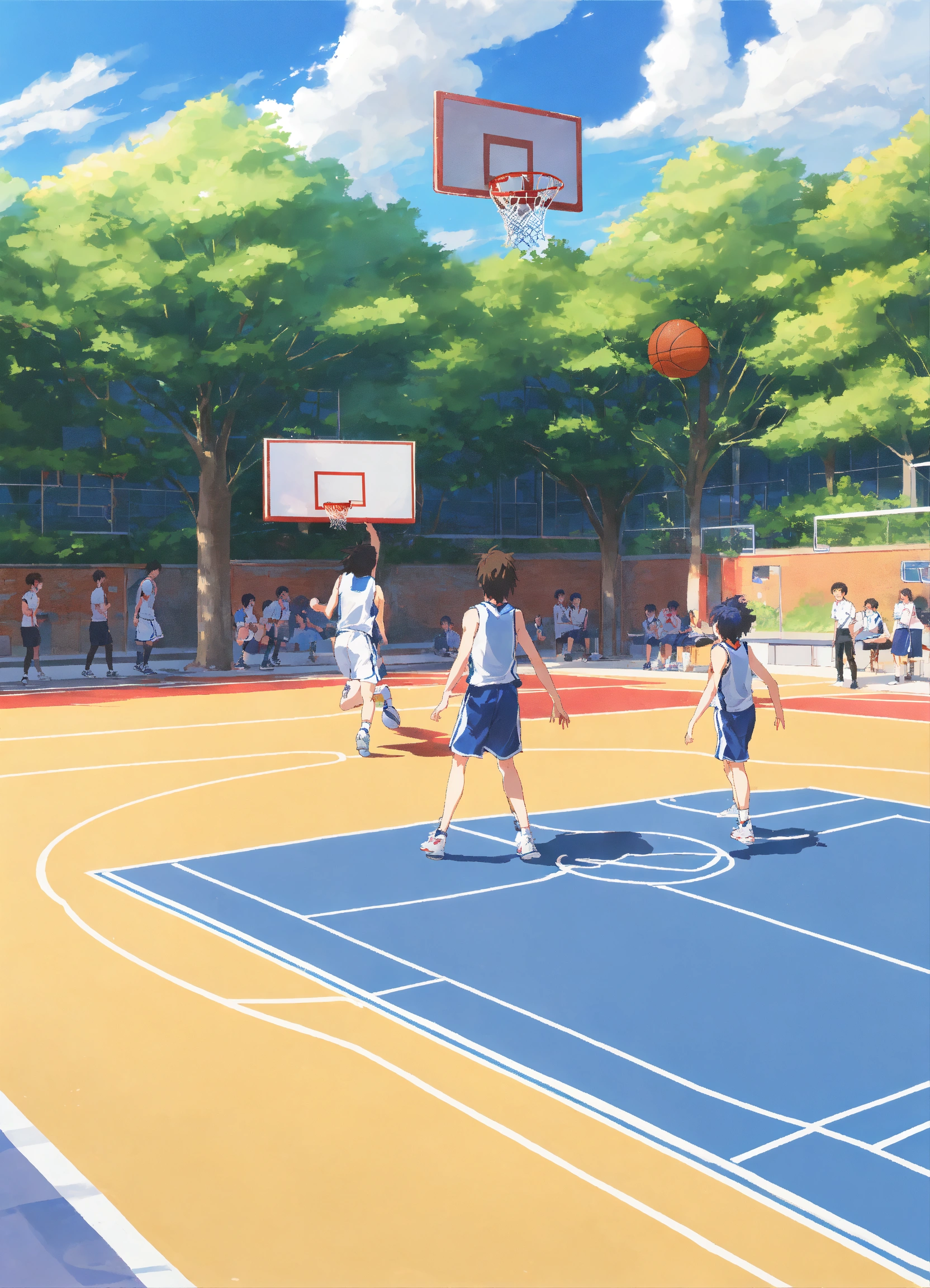 On a bright and sunny day, two male classmates were playing basketball on the school's basketball court. there were many female classmates sitting on the courtside, enthusiastically watching the game., makoto shinkai style