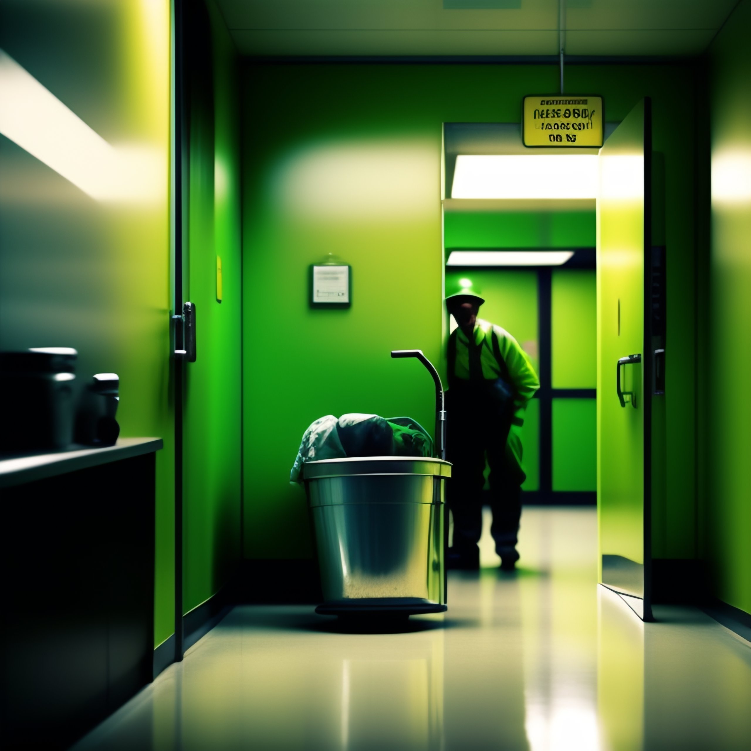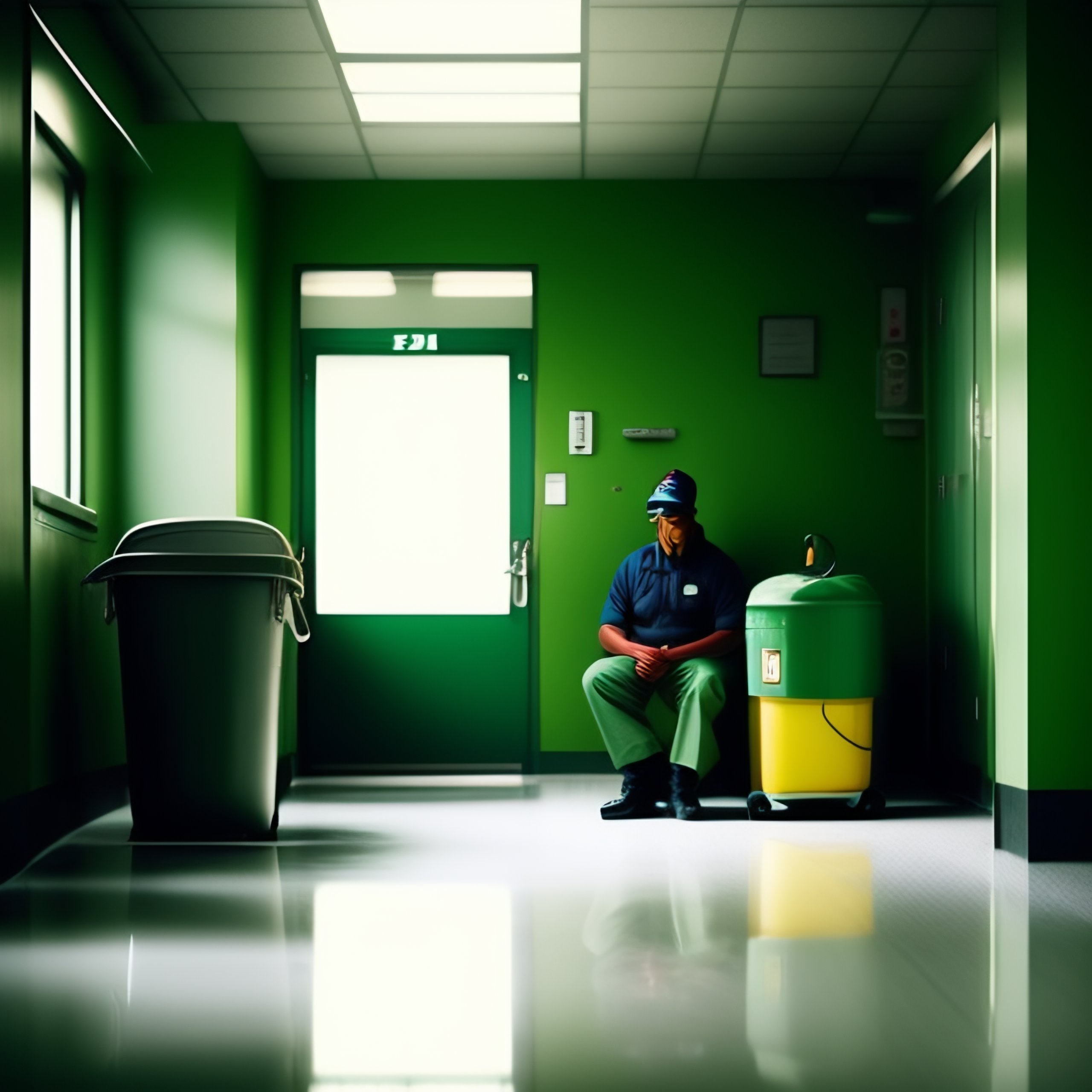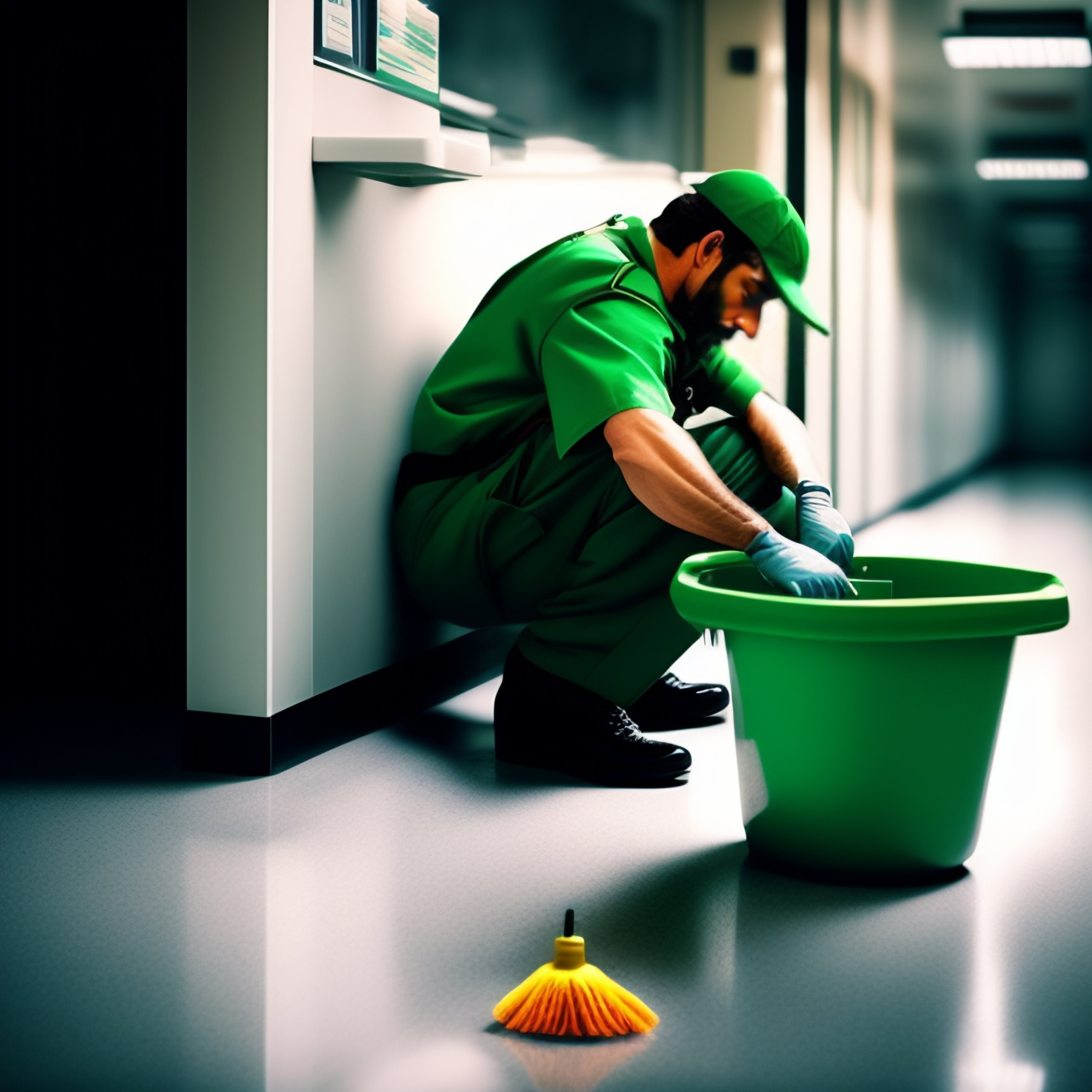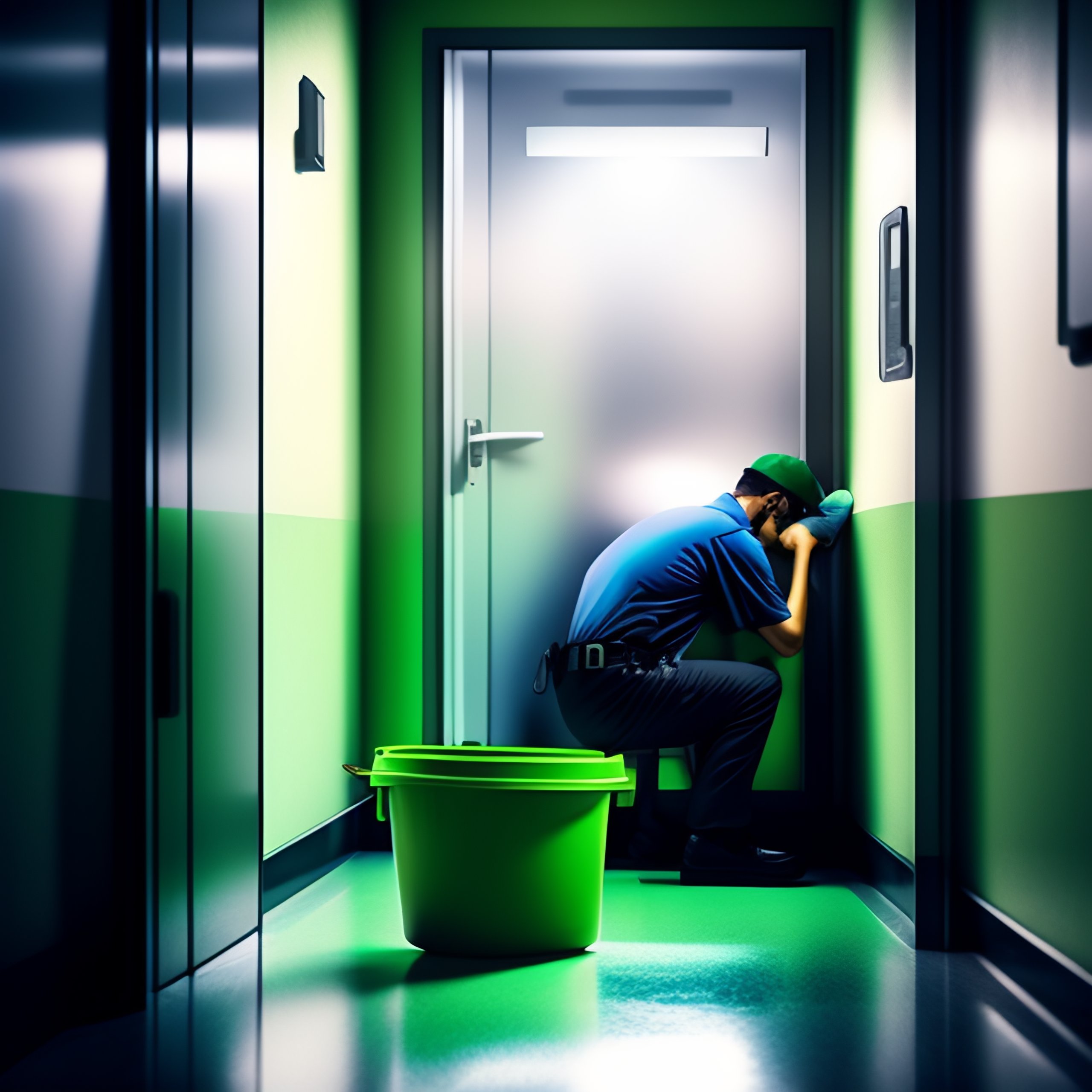 Mop and sleeping janitor - hat over face - asleep in janitor closet - 1960 era - office building - sleeping with mop - dull green - florescent lighting - humor - sleeping janitor - resting janitor - asleep - snoring - taking a nap - sleeping feet on chair - reclined - hat covering face - green janitor uniform - tired - bucket - rag - government office - cinematic - movie poster - shiny floor - cleaning supplies - sleeping janitor who should be working - hiding - dirty closet - open door - with mop