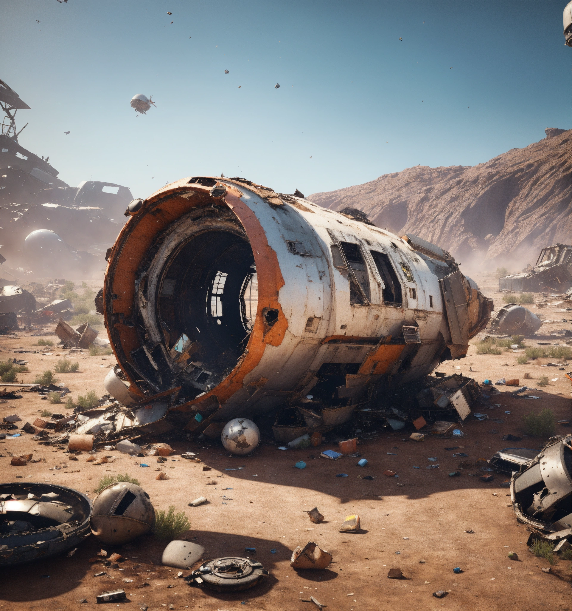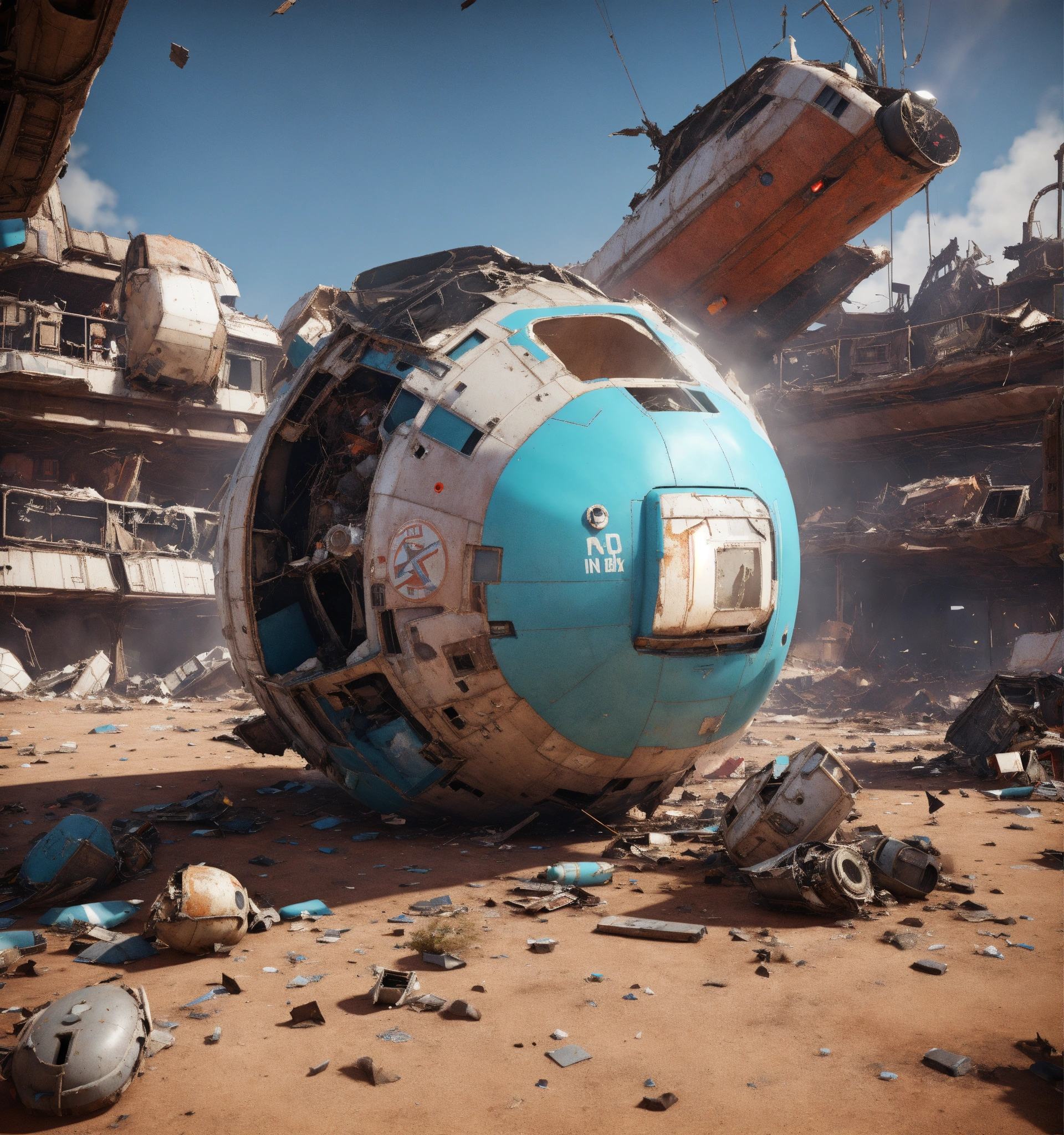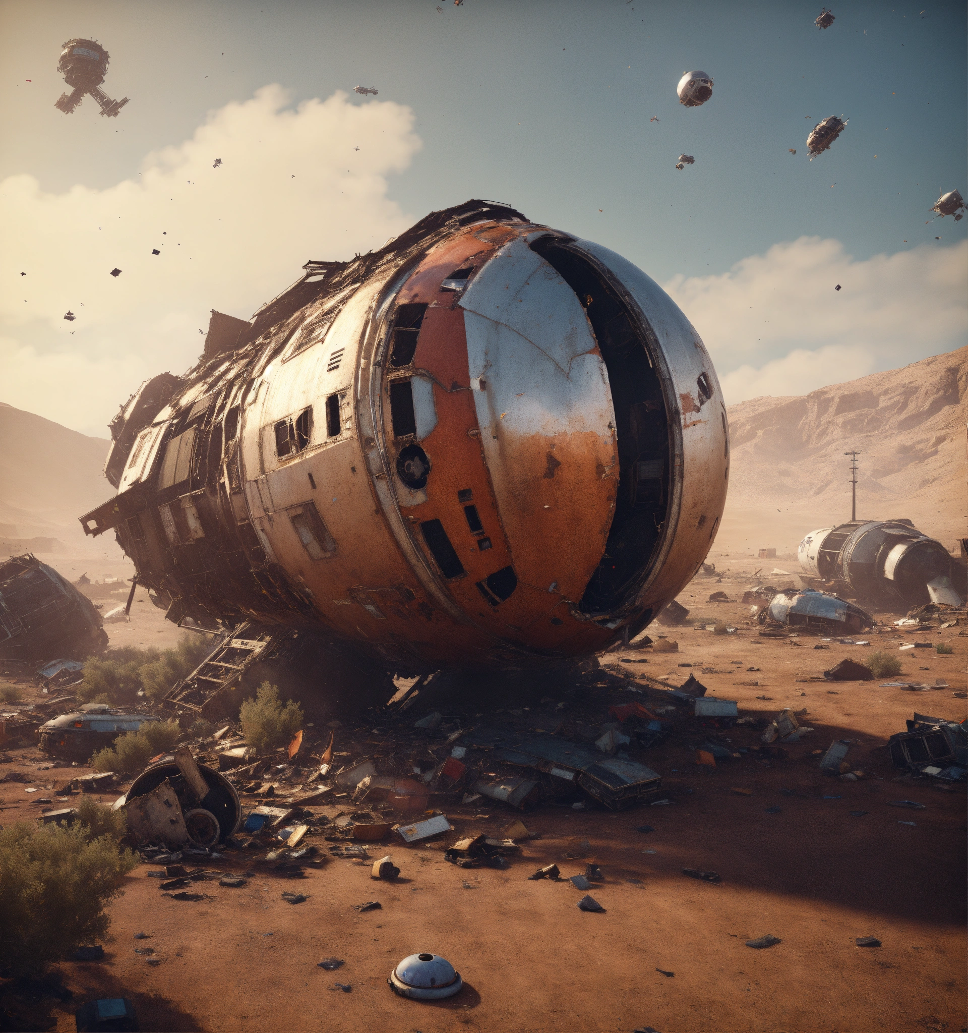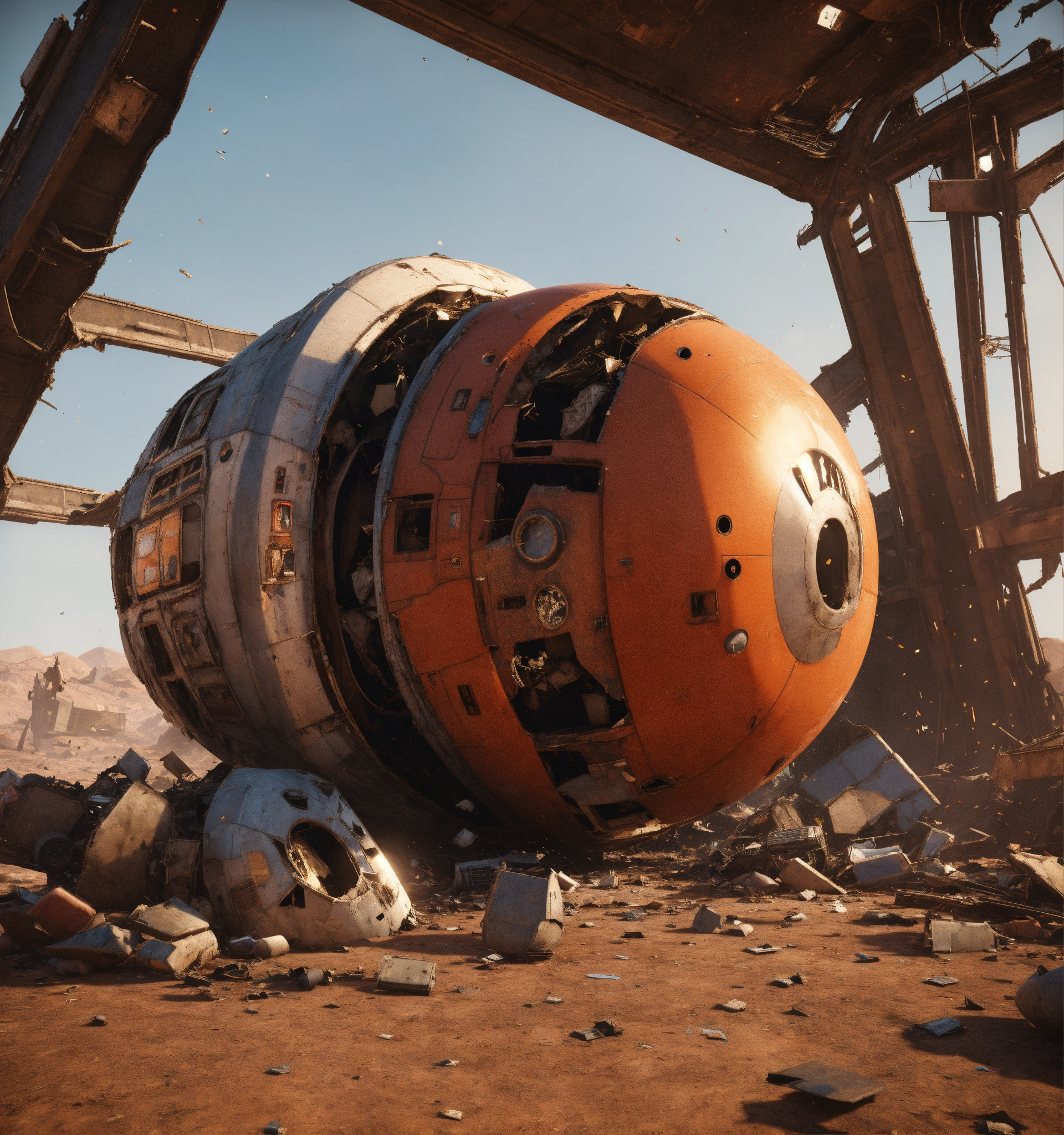 A small emergency escape capsule crashed and smashed into pieces in the middle of a starship junkyard, wasteland, realistic, futuristic, sci-fi, 8k, unreal engine, pixar