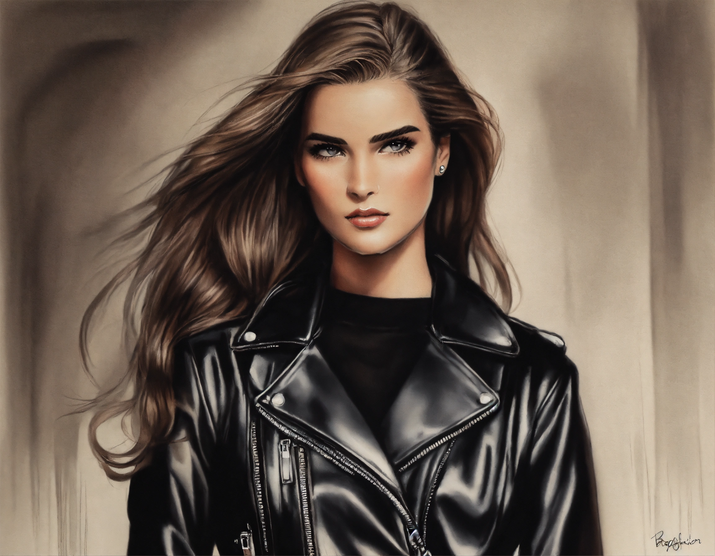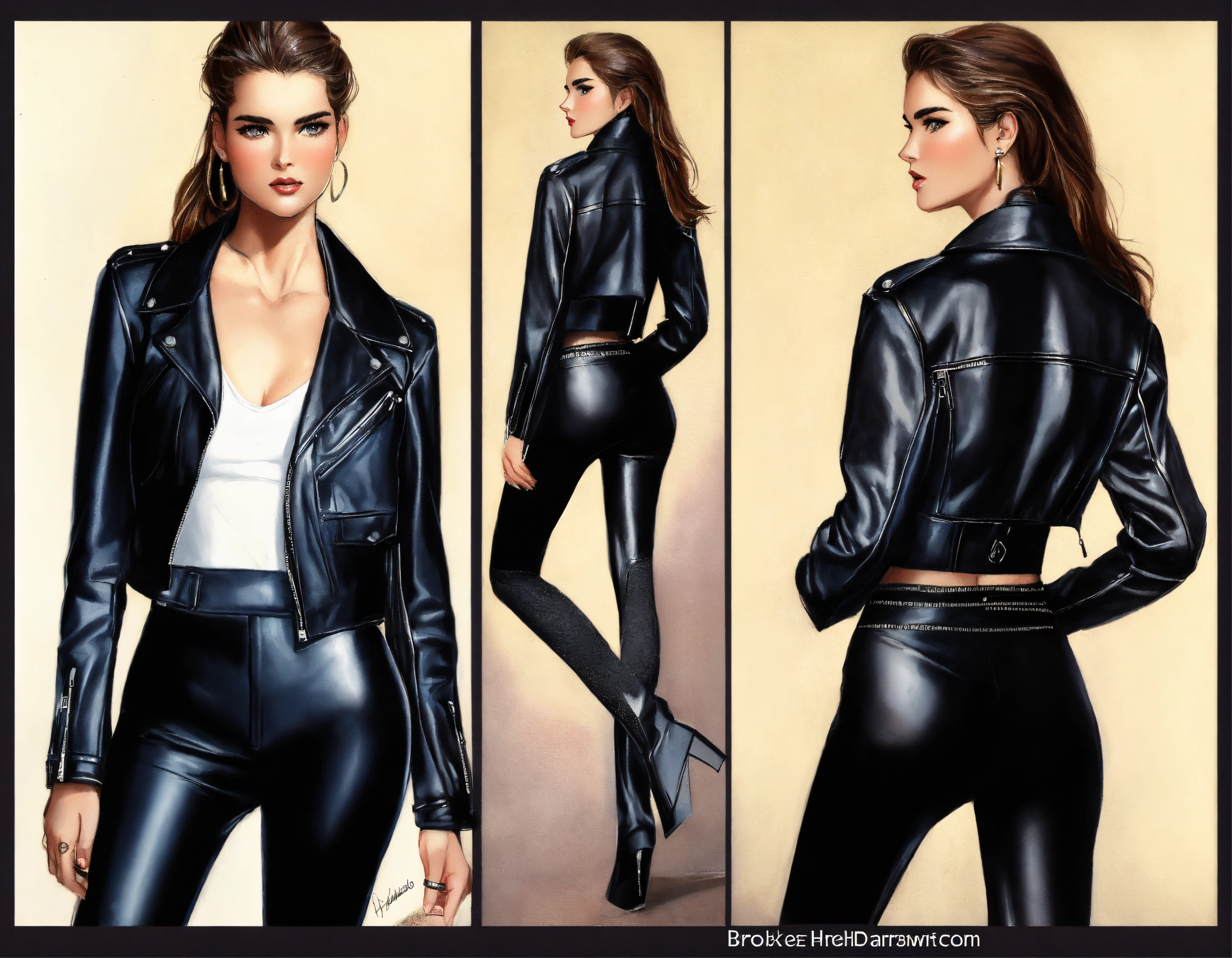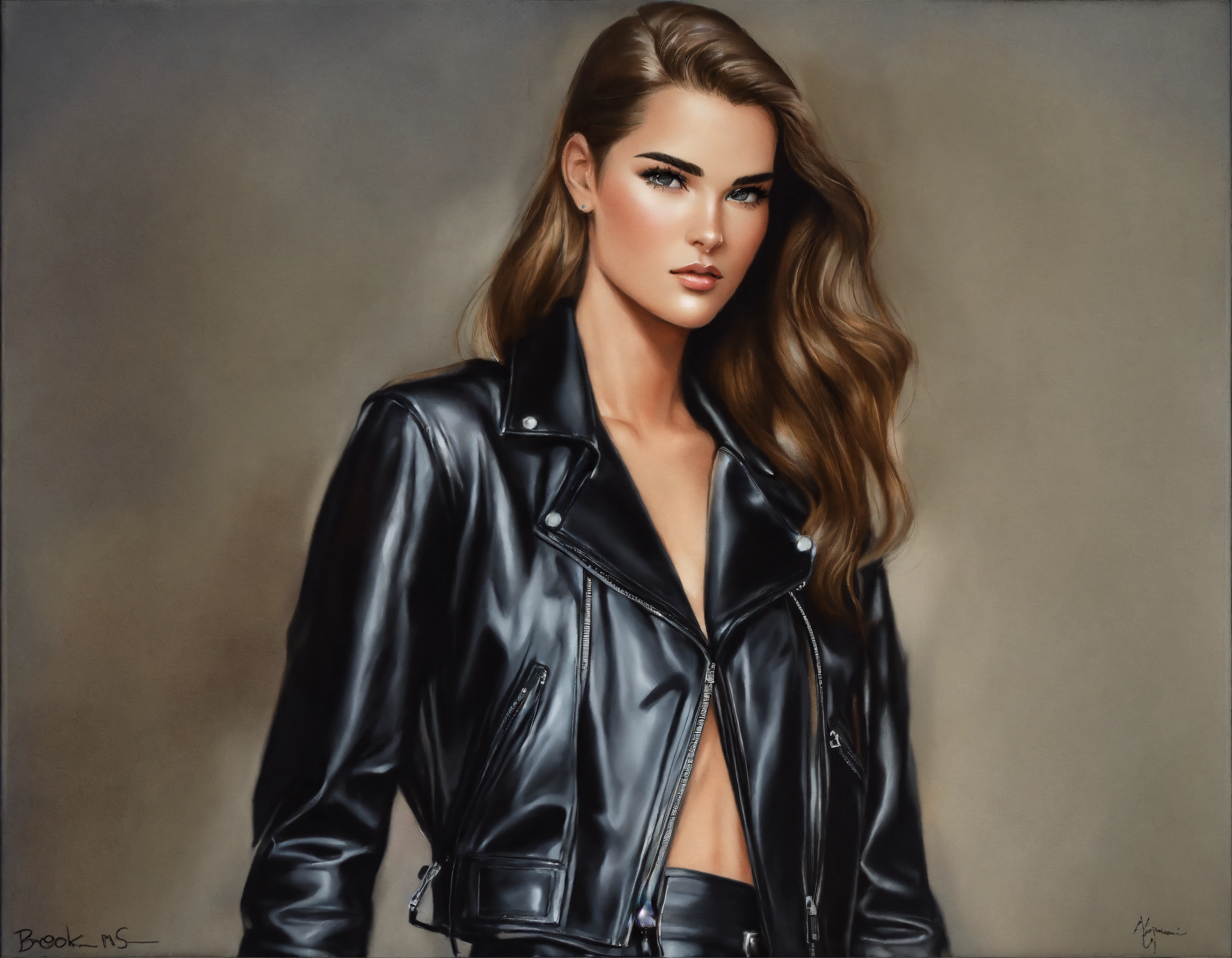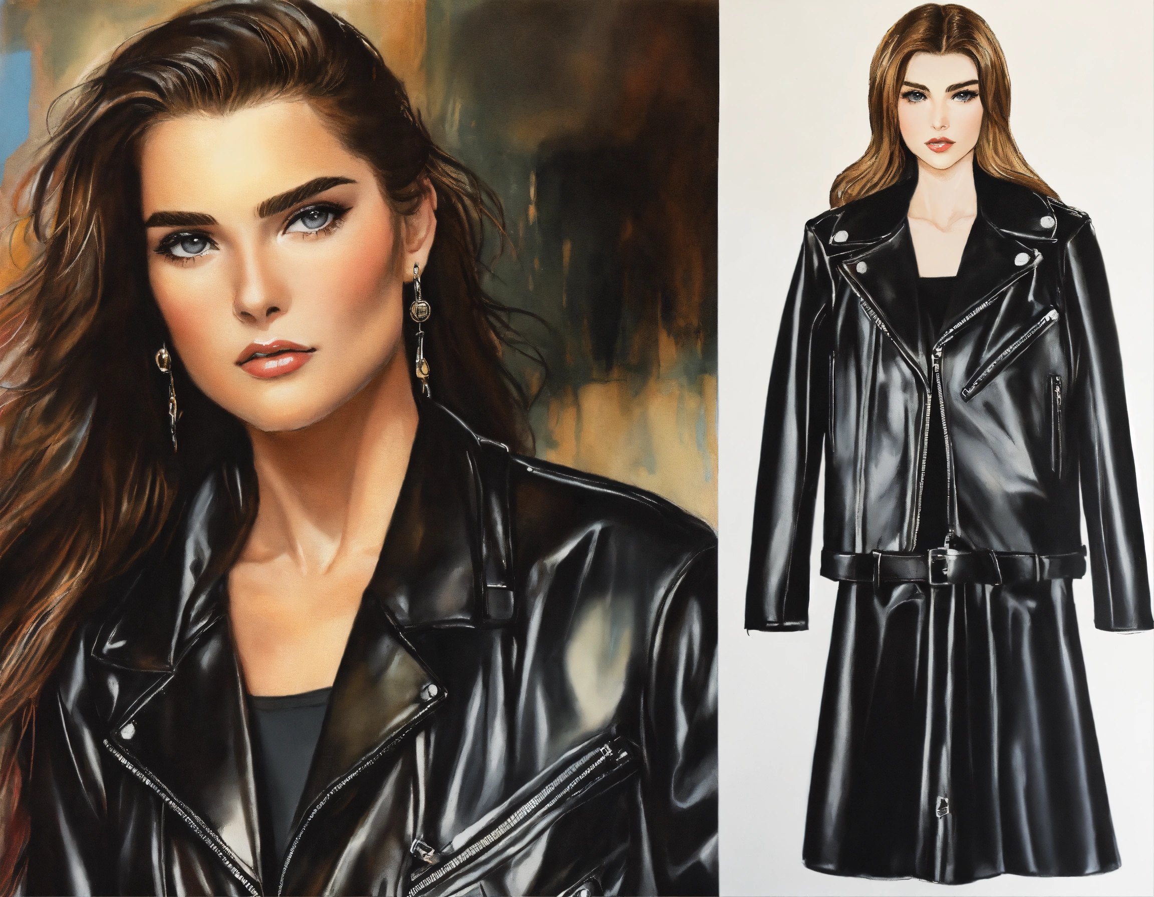 2d drawing, brooke shields, age 14. leather jacket. black moschino leather maxi dress with split. artgerm