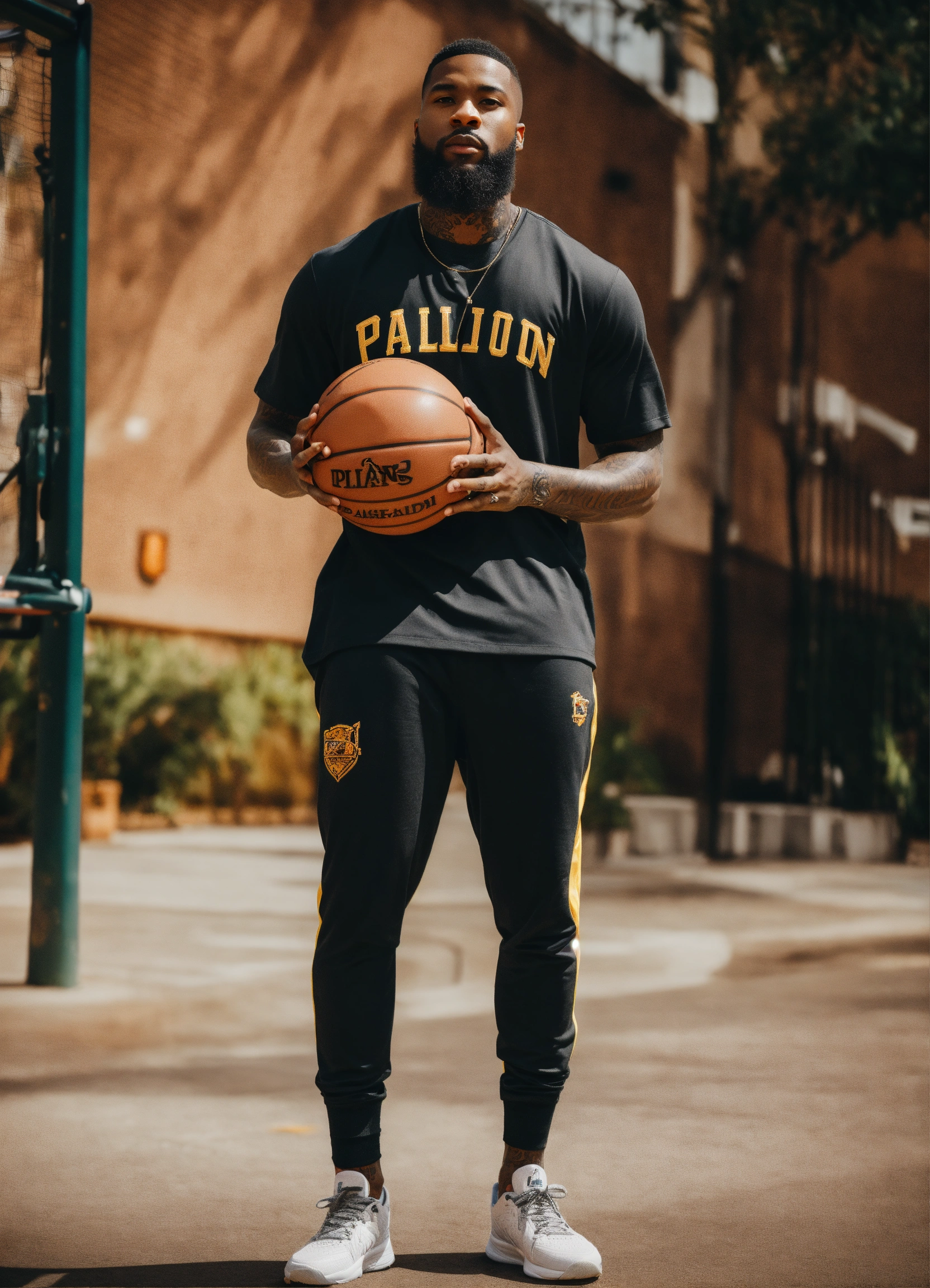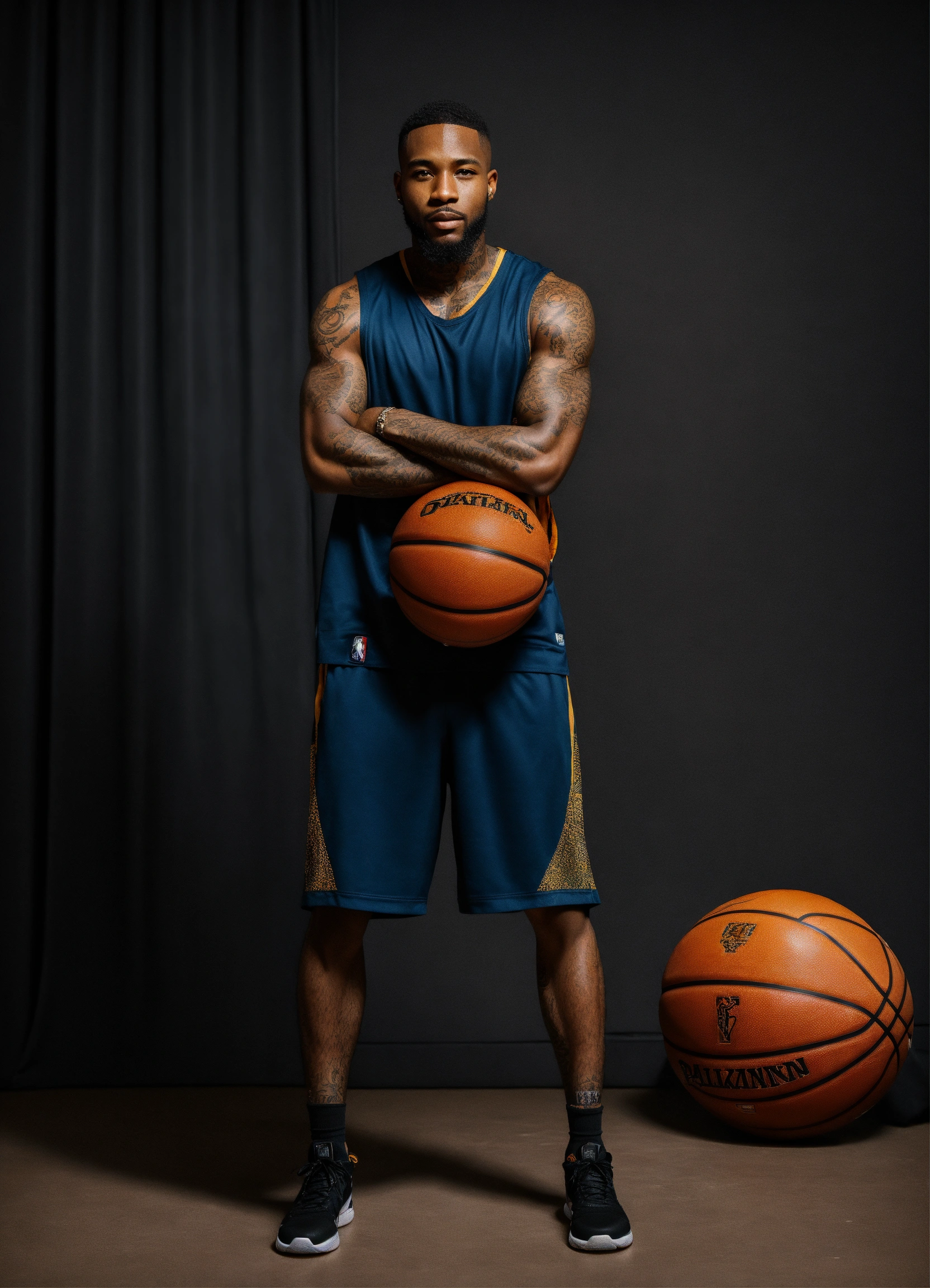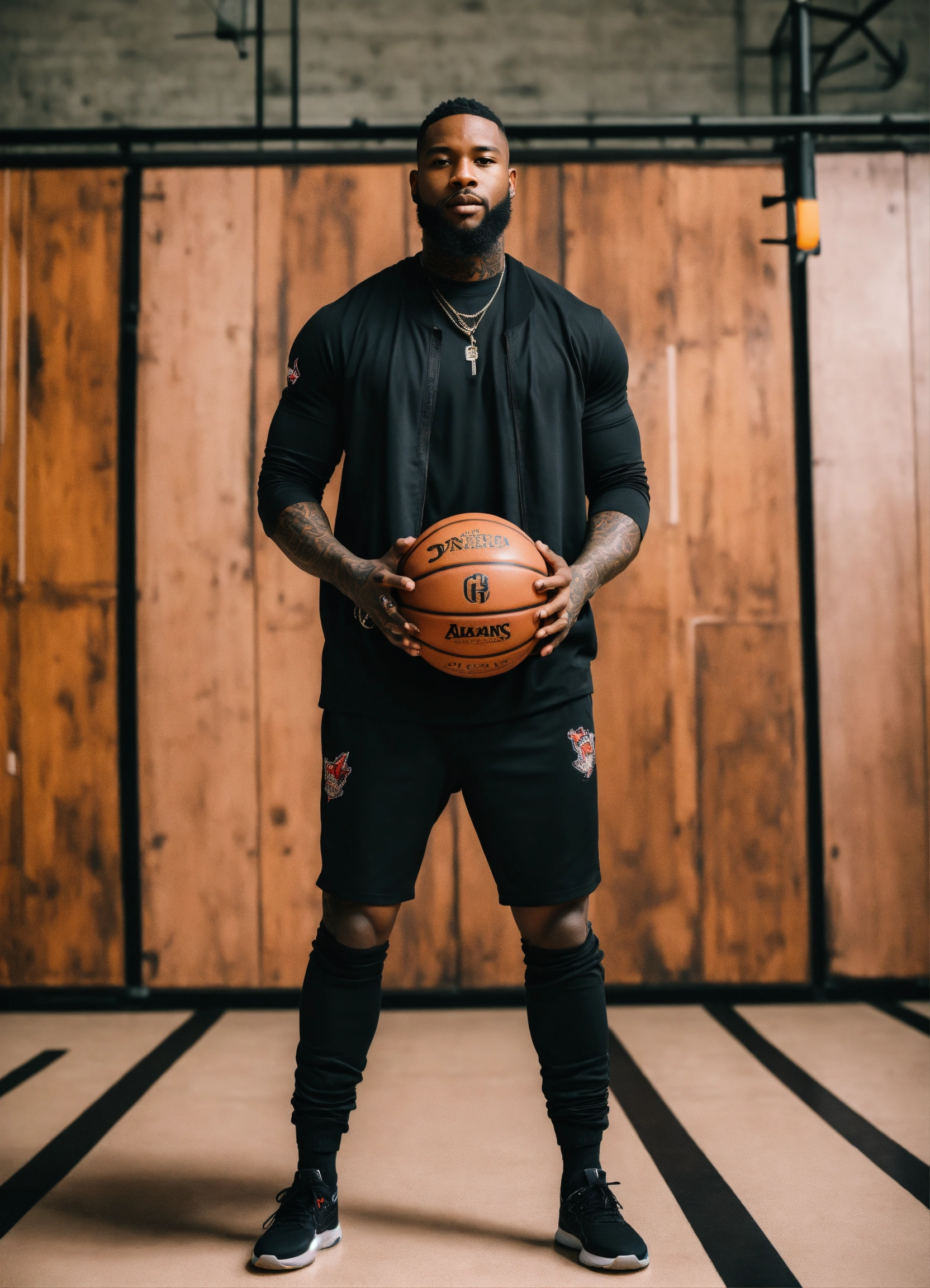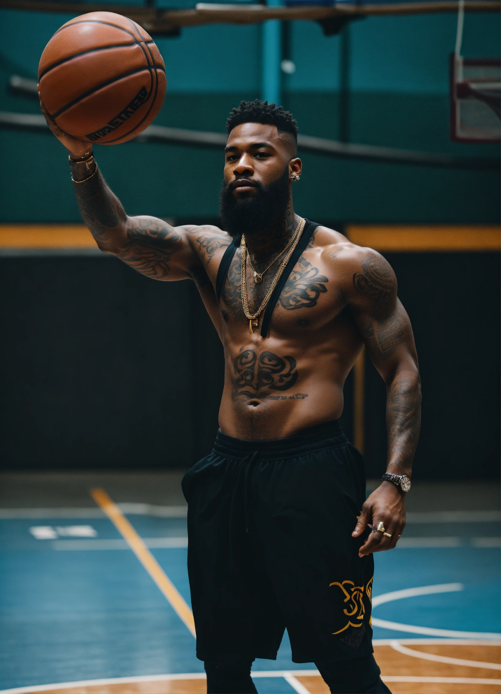 Handsome black male, low haircut, arms extended at his sides, palming a basketball, beard, tattoos on chest and shoulders, full body