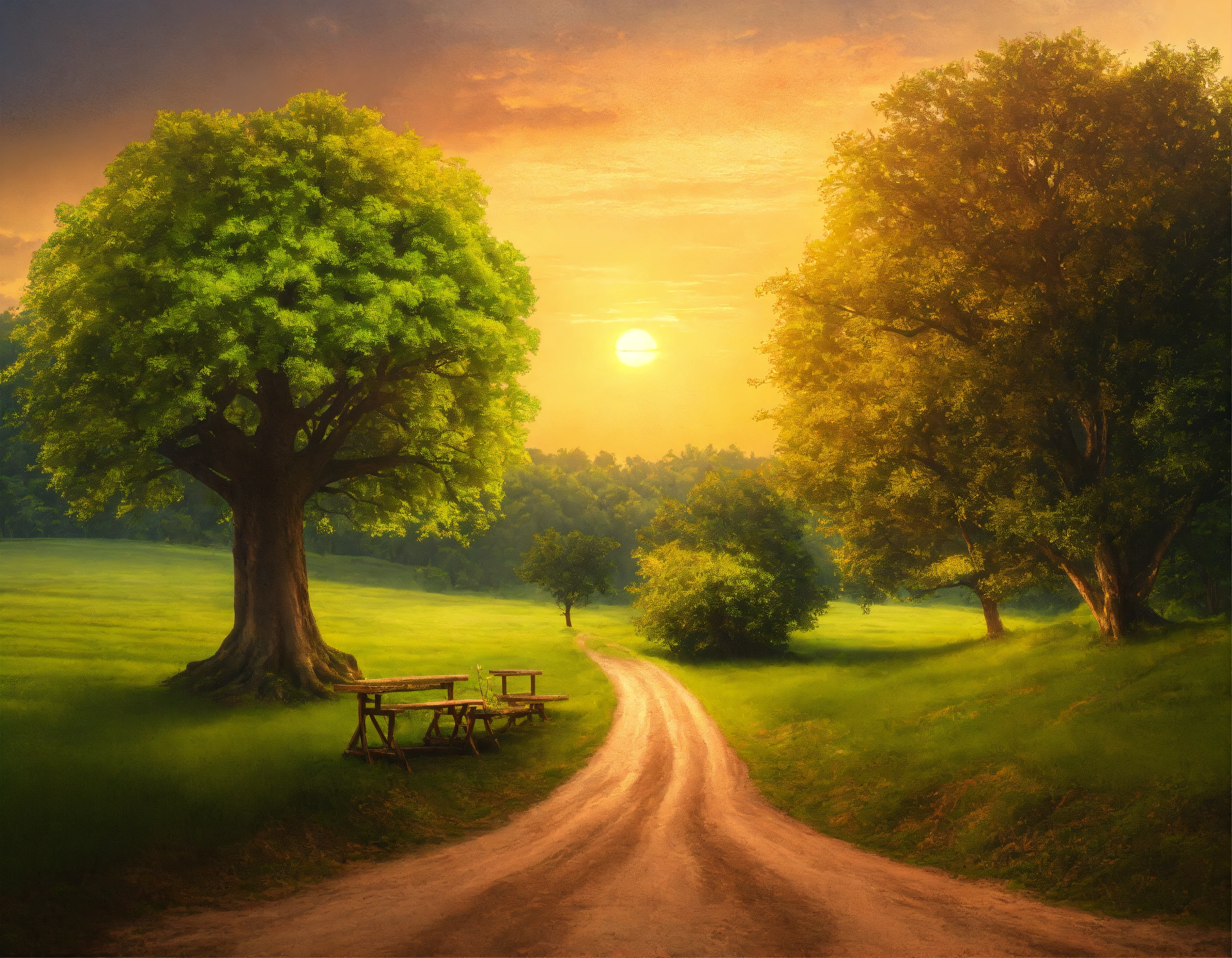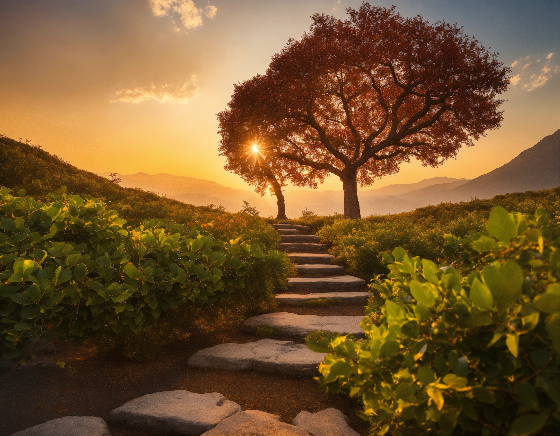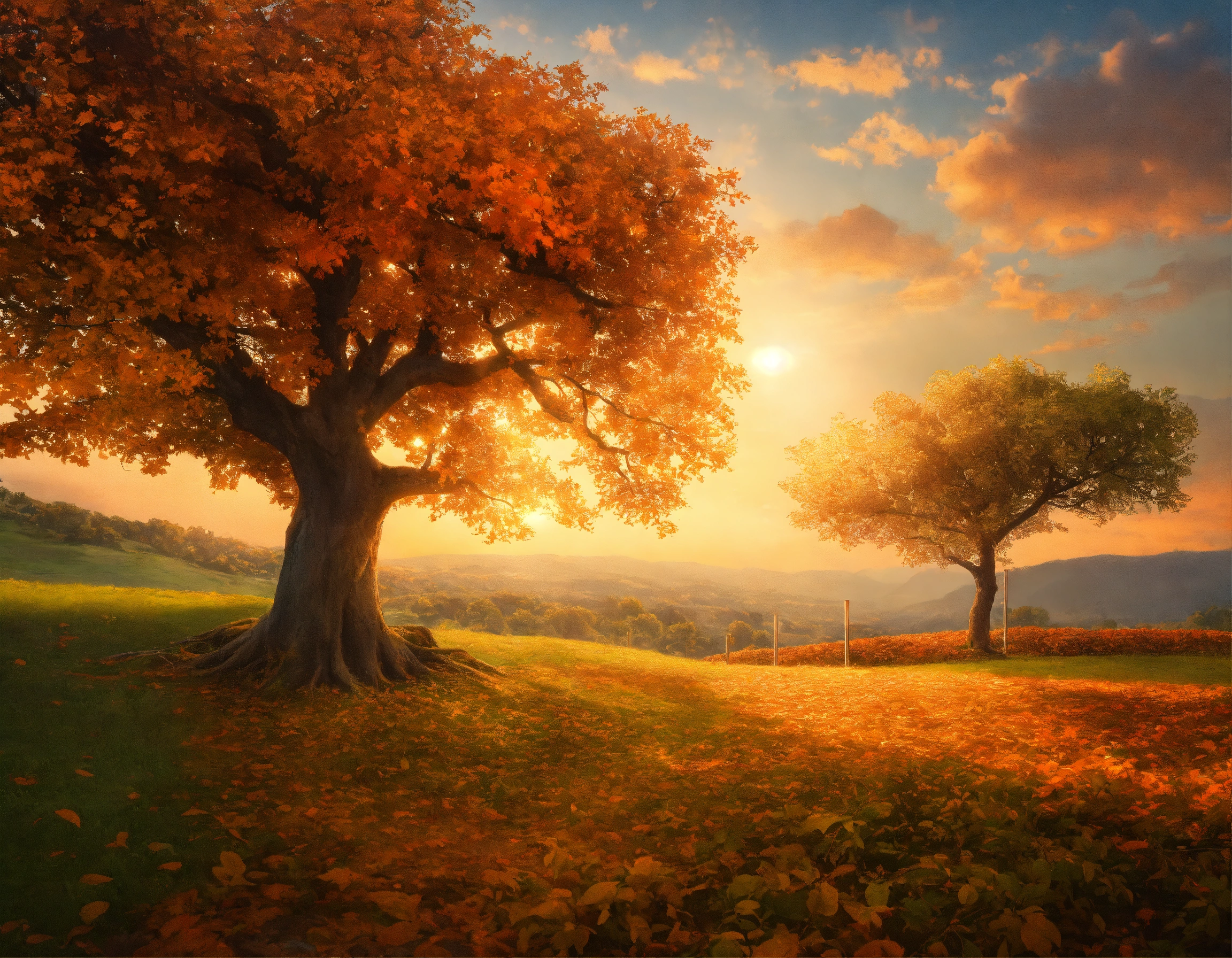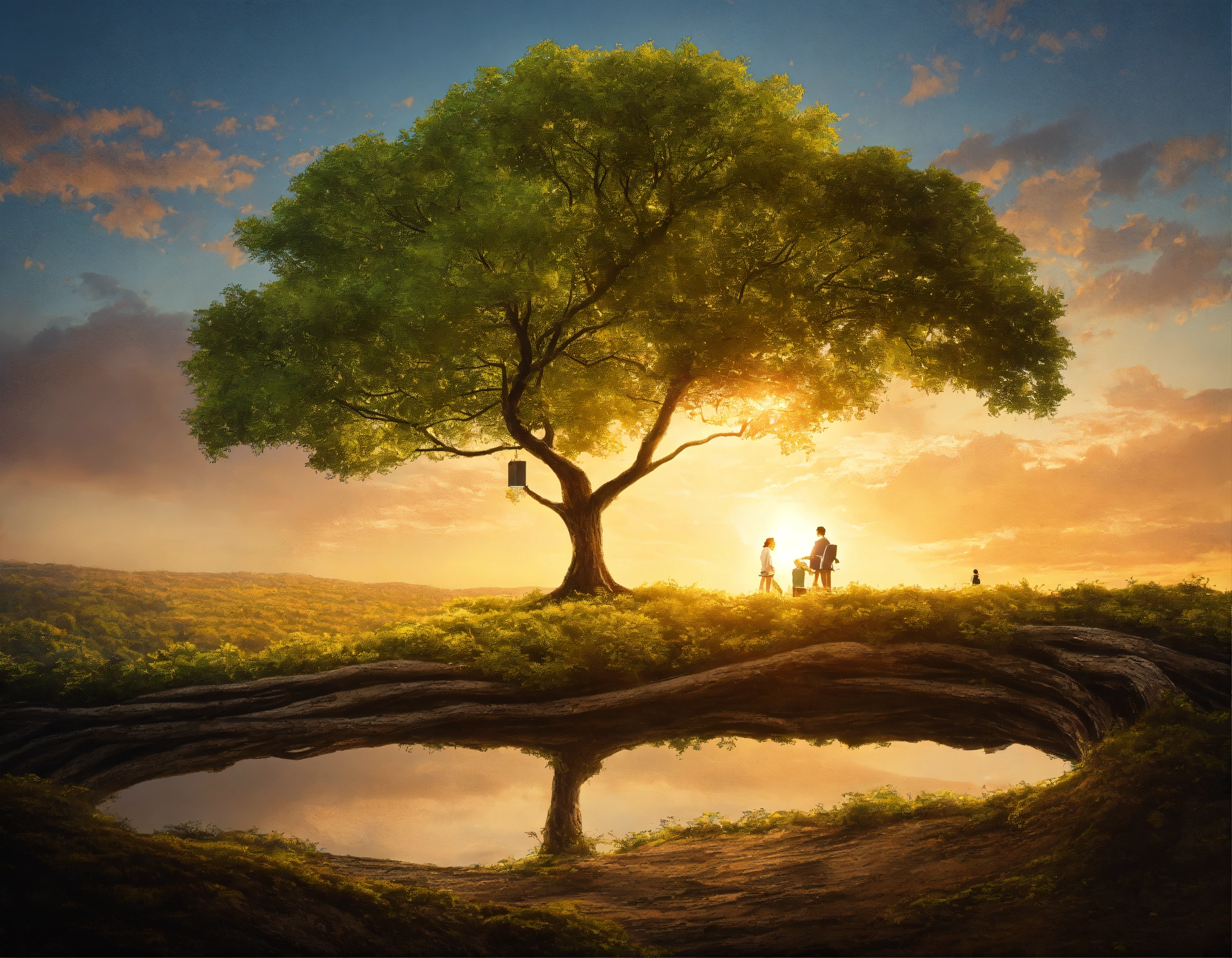 "create a visual representation of the intertwined nature of work and life. picture two trees, one symbolizing 'work' and the other 'life'. instead of standing apart, their roots and branches are seamlessly intertwined, showing the deep connection and mutual influence they have on one another. sprinkle some leaves, symbolizing moments of joy, challenges, and milestones, shared across both trees. in the background, showcase a harmonious environment perhaps a sunrise or sunset, indicating the balance and the cycle of day-to-day life. emphasize the idea of unity, interconnectedness, and the holistic approach to the work-life experience."