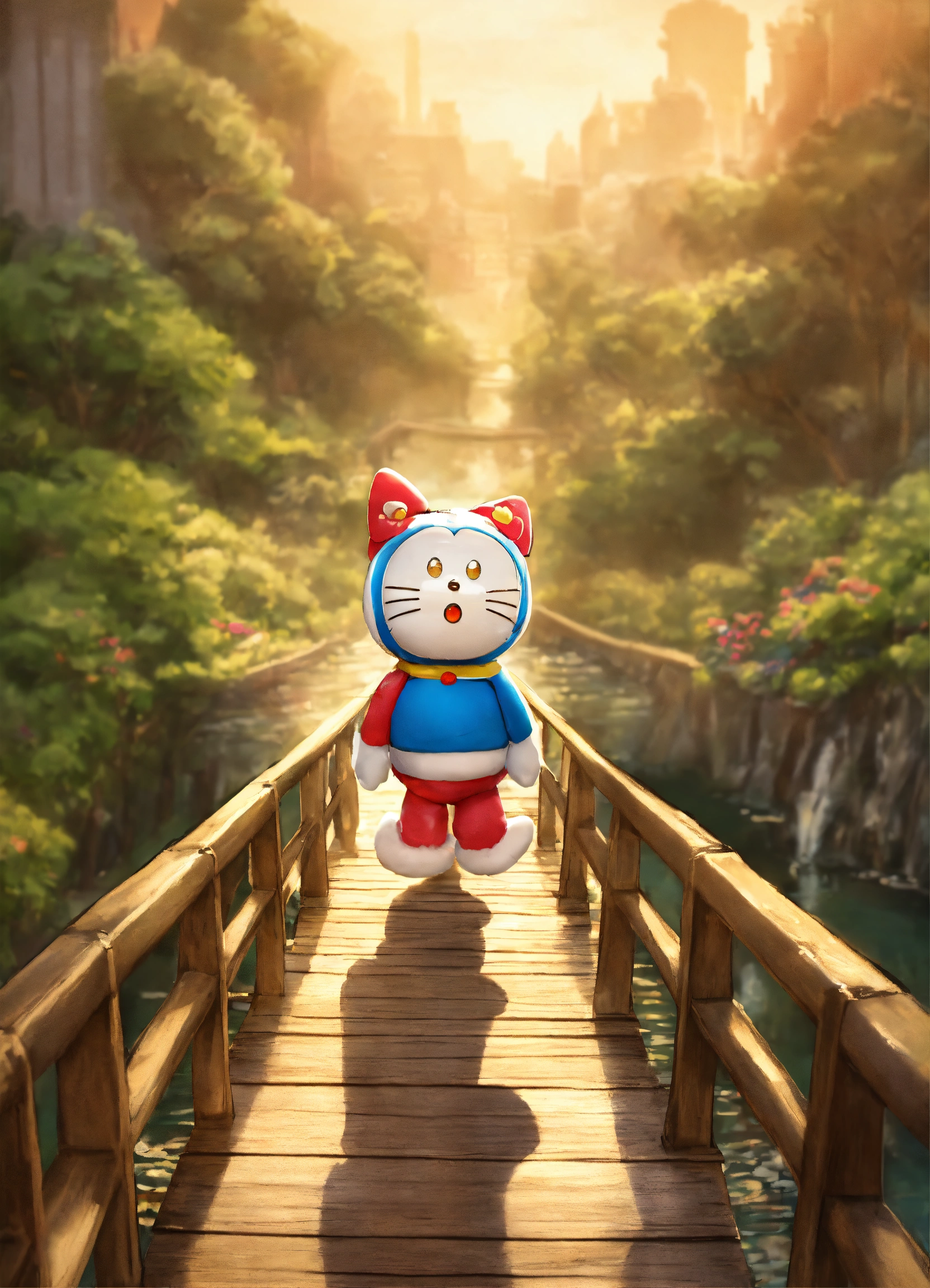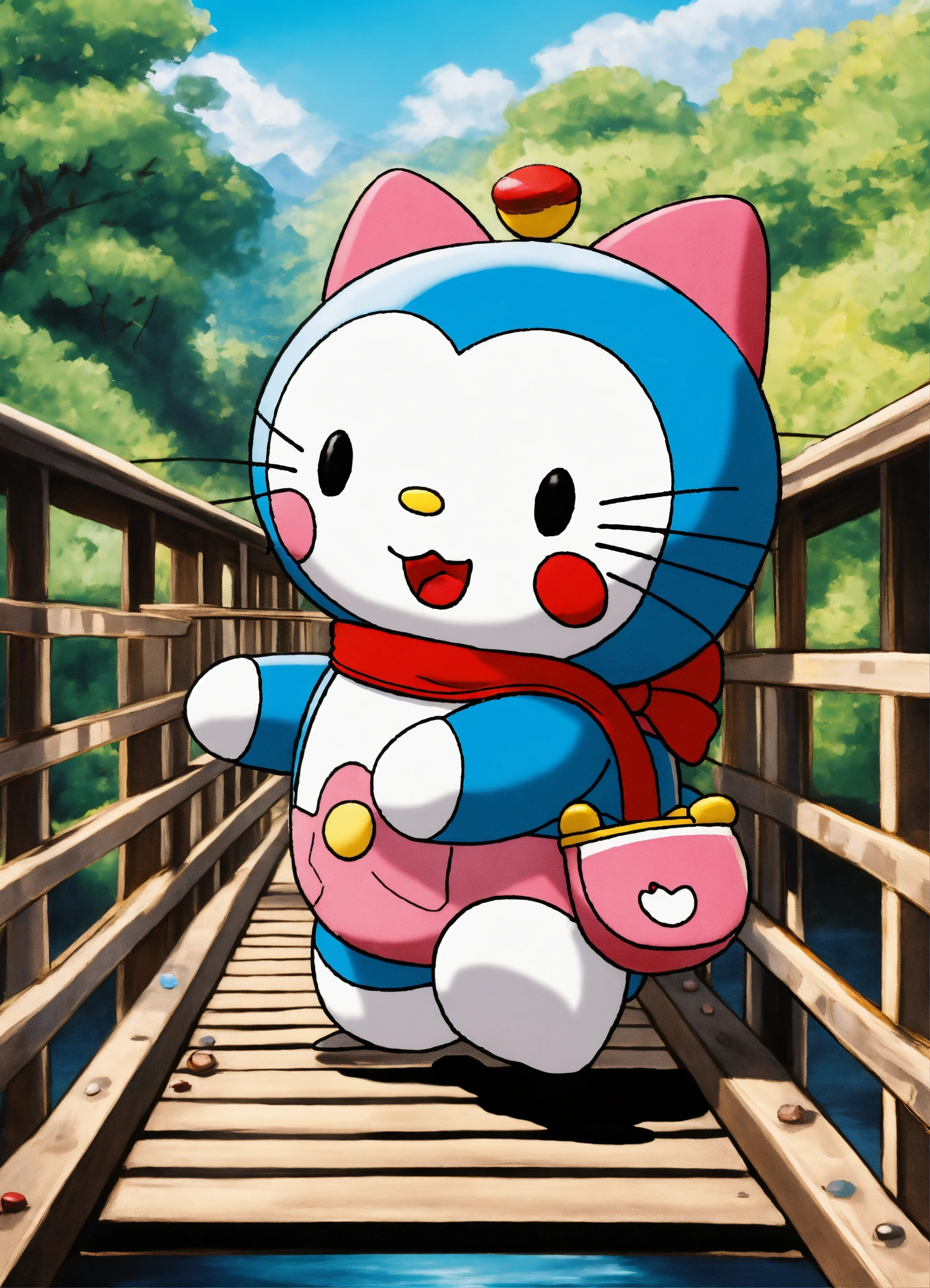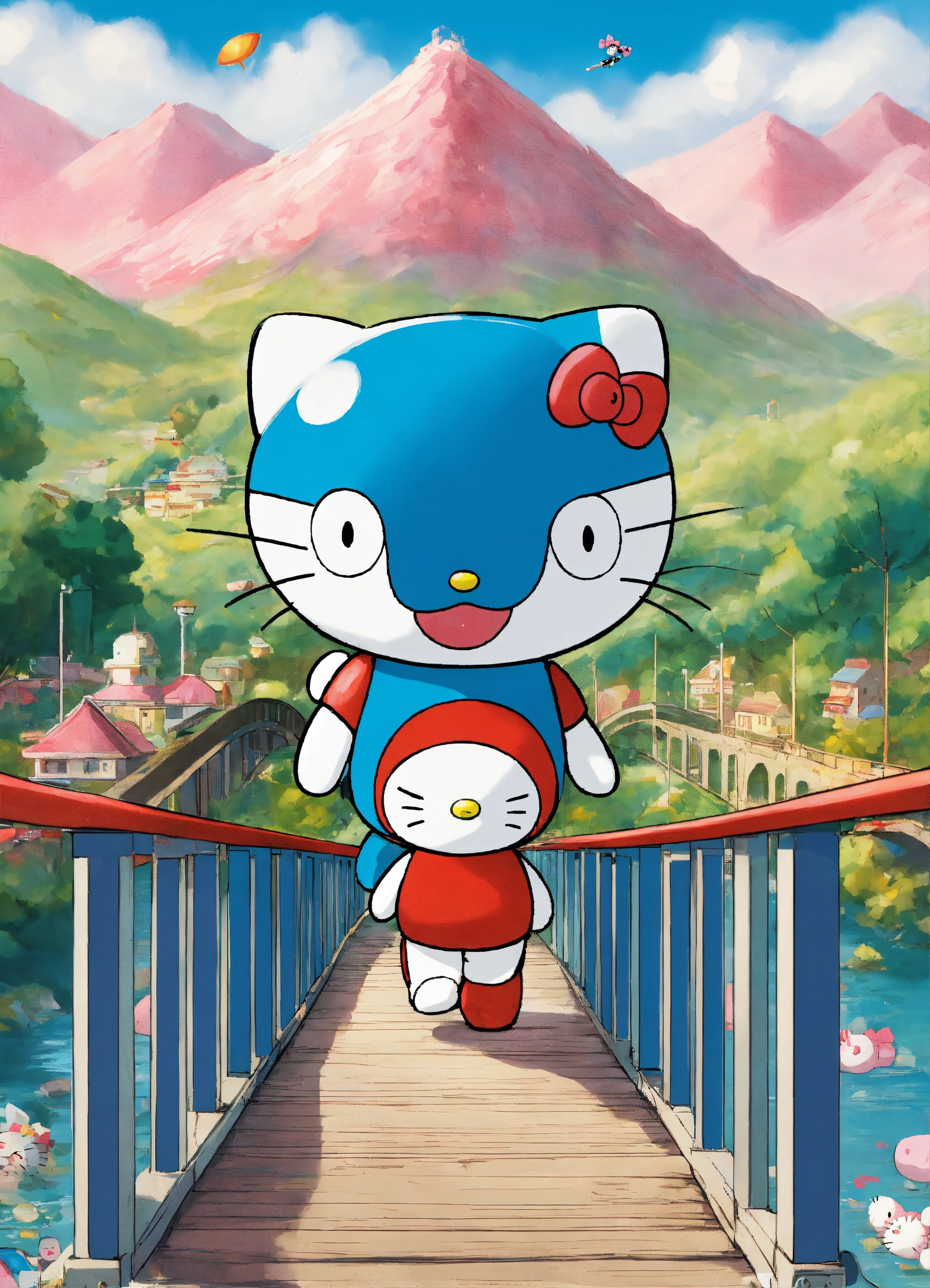 Doraemon walking on a bridge carrying hello kitty on the back