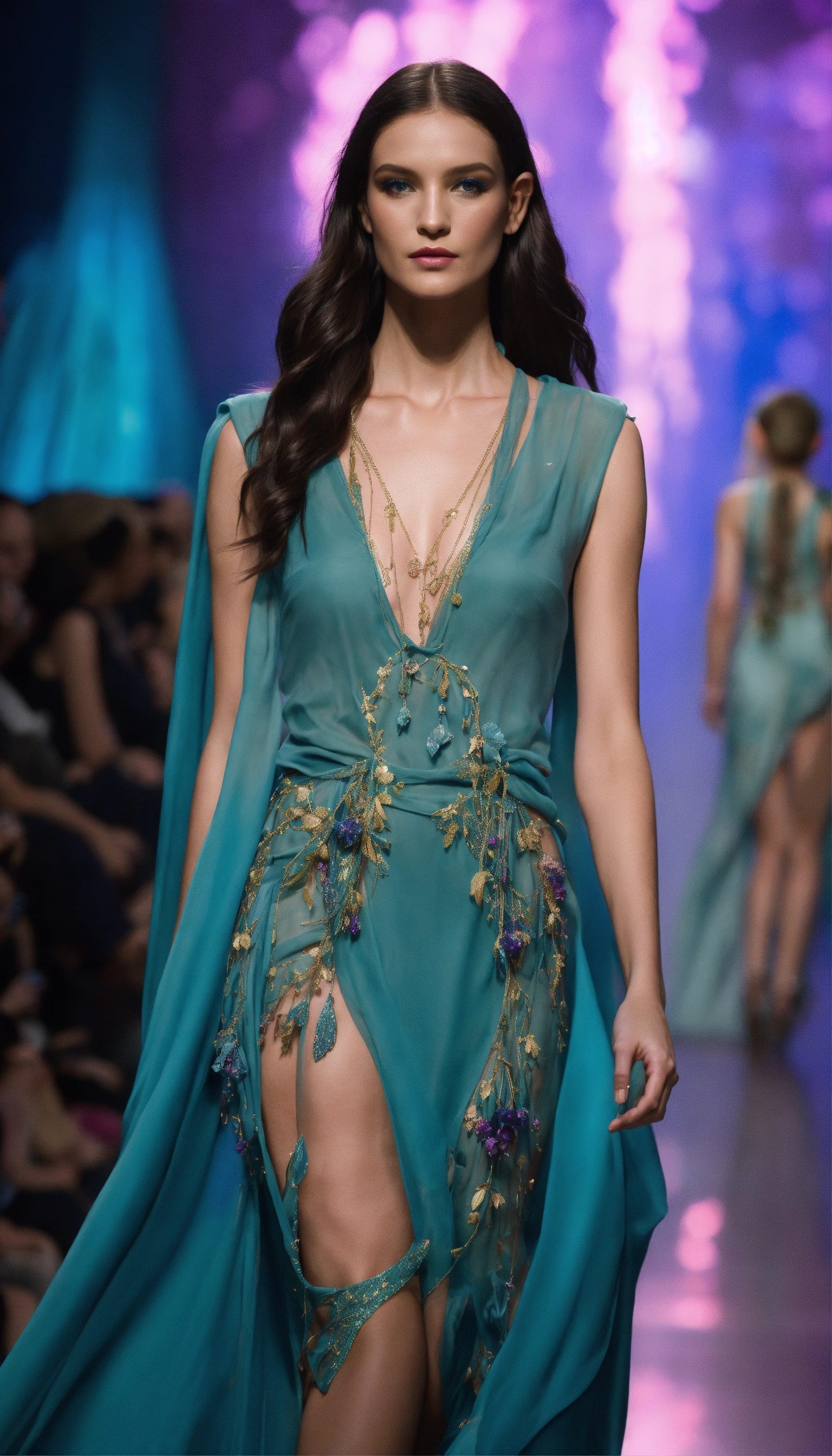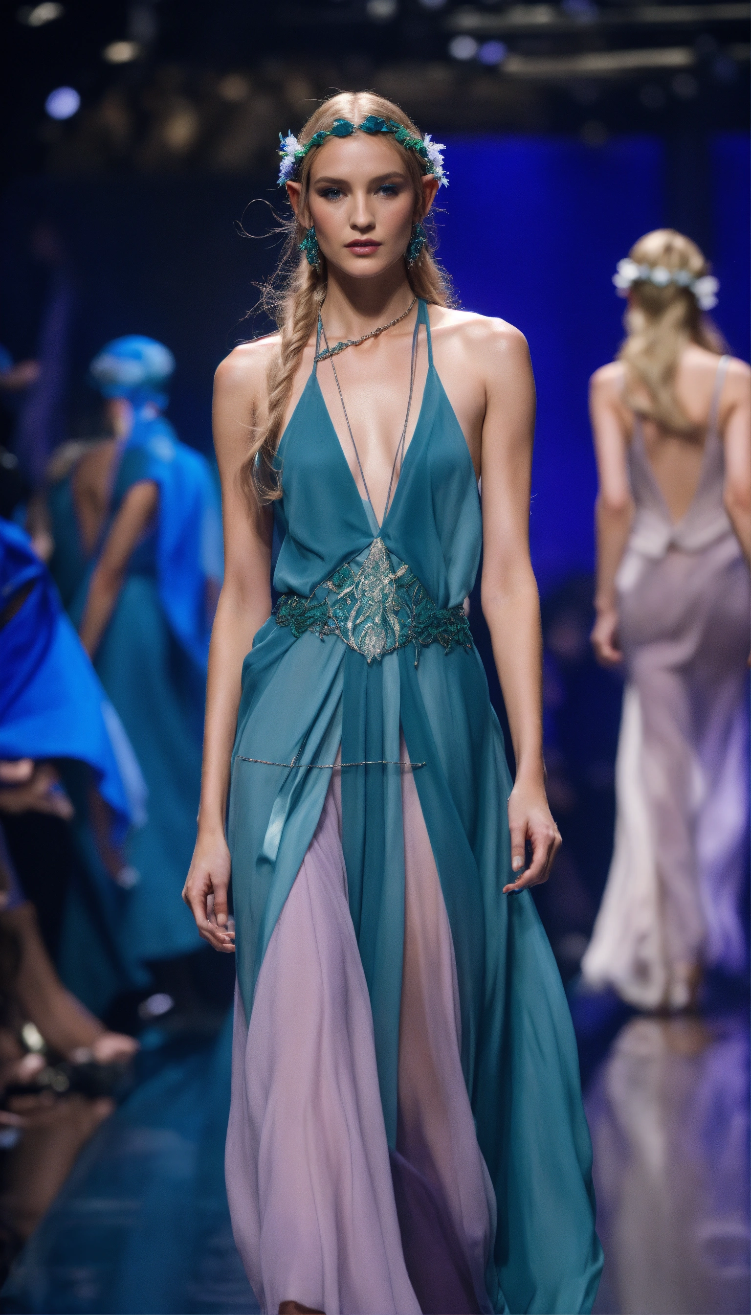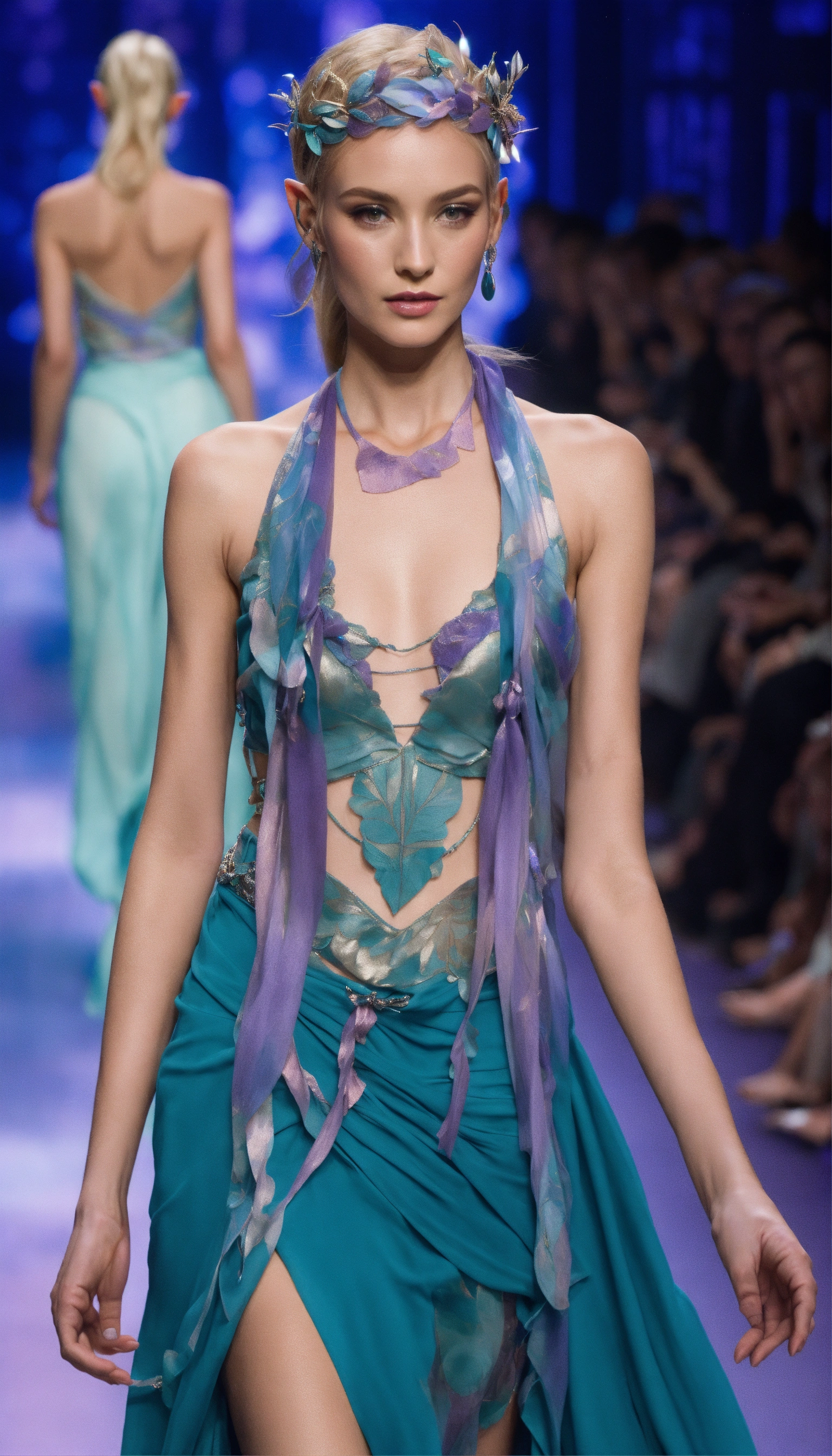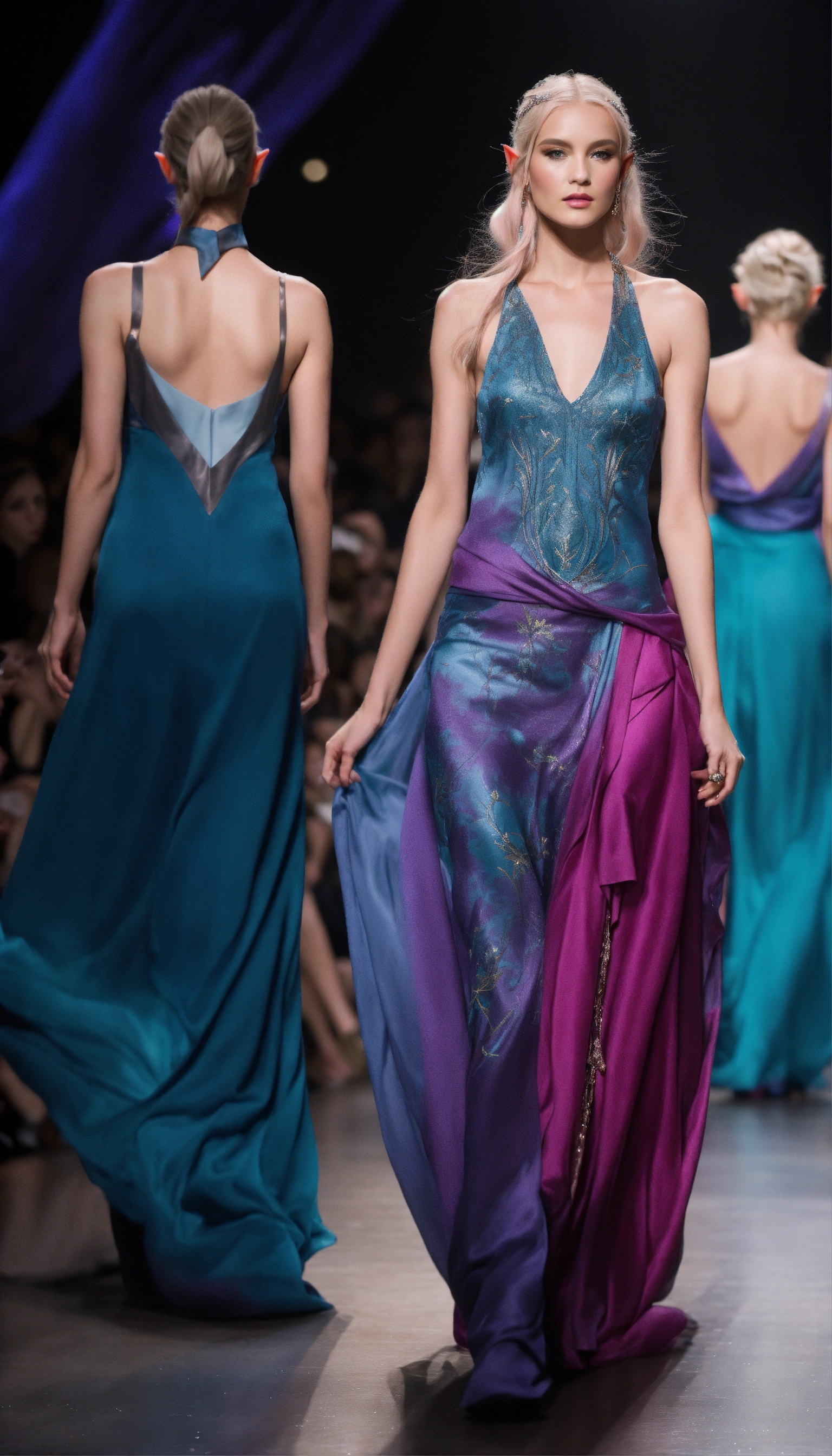 Lothlorien female elves walking runway during elvin fashion week wearing elvish donna karan fashion in blues, teals, purples, pinks, whites, metallics
