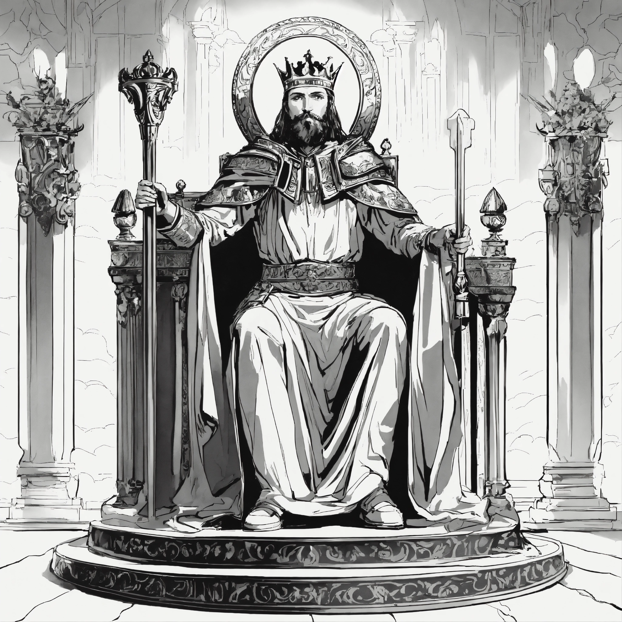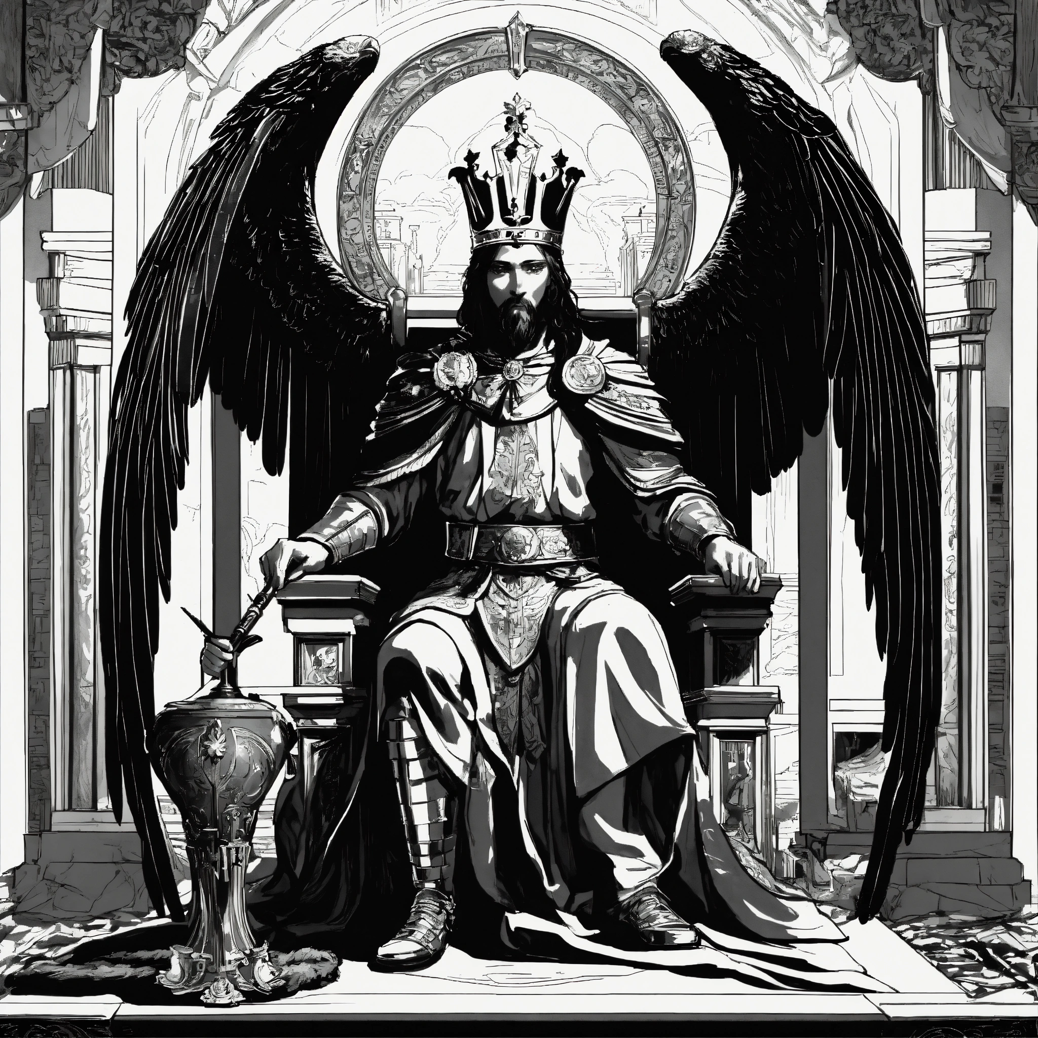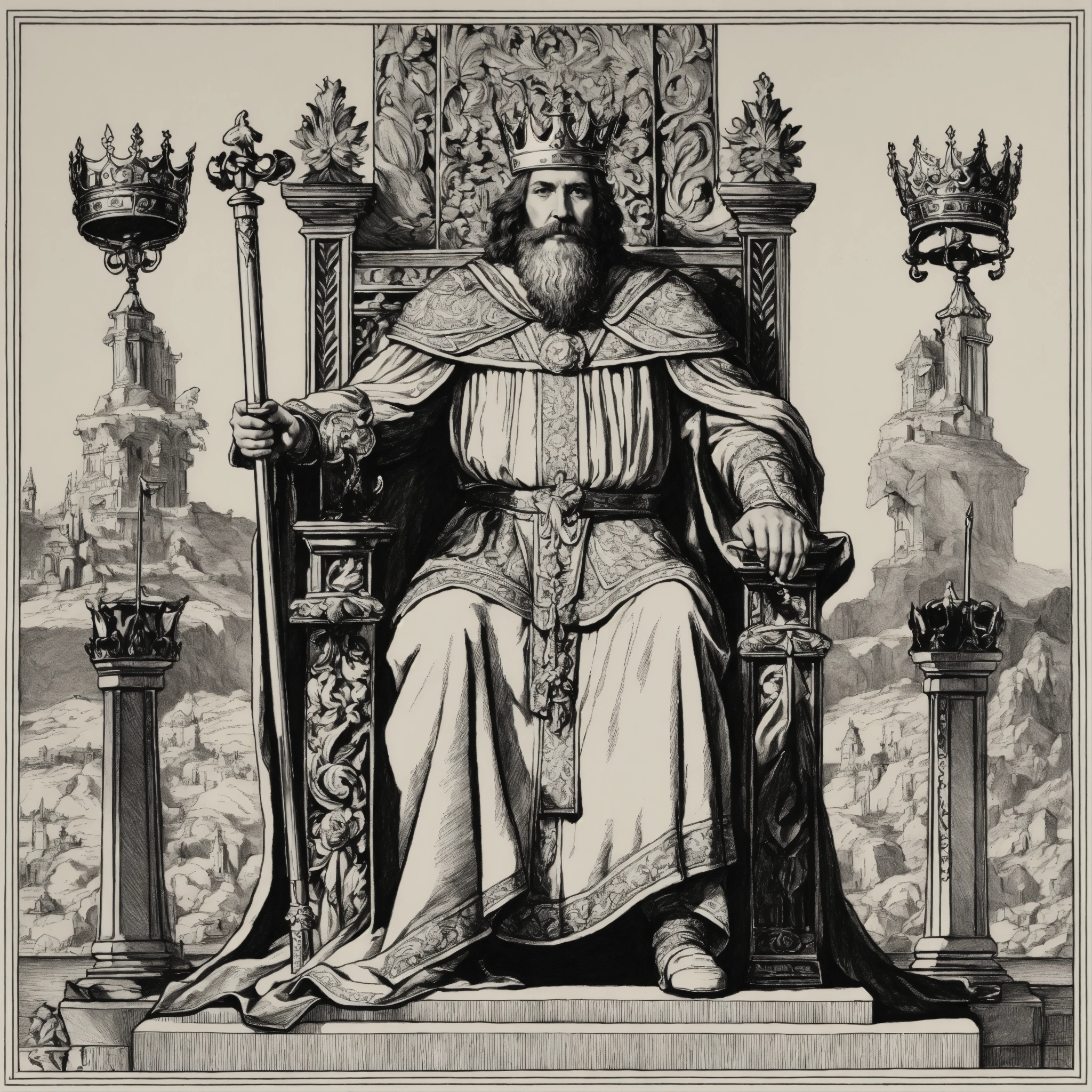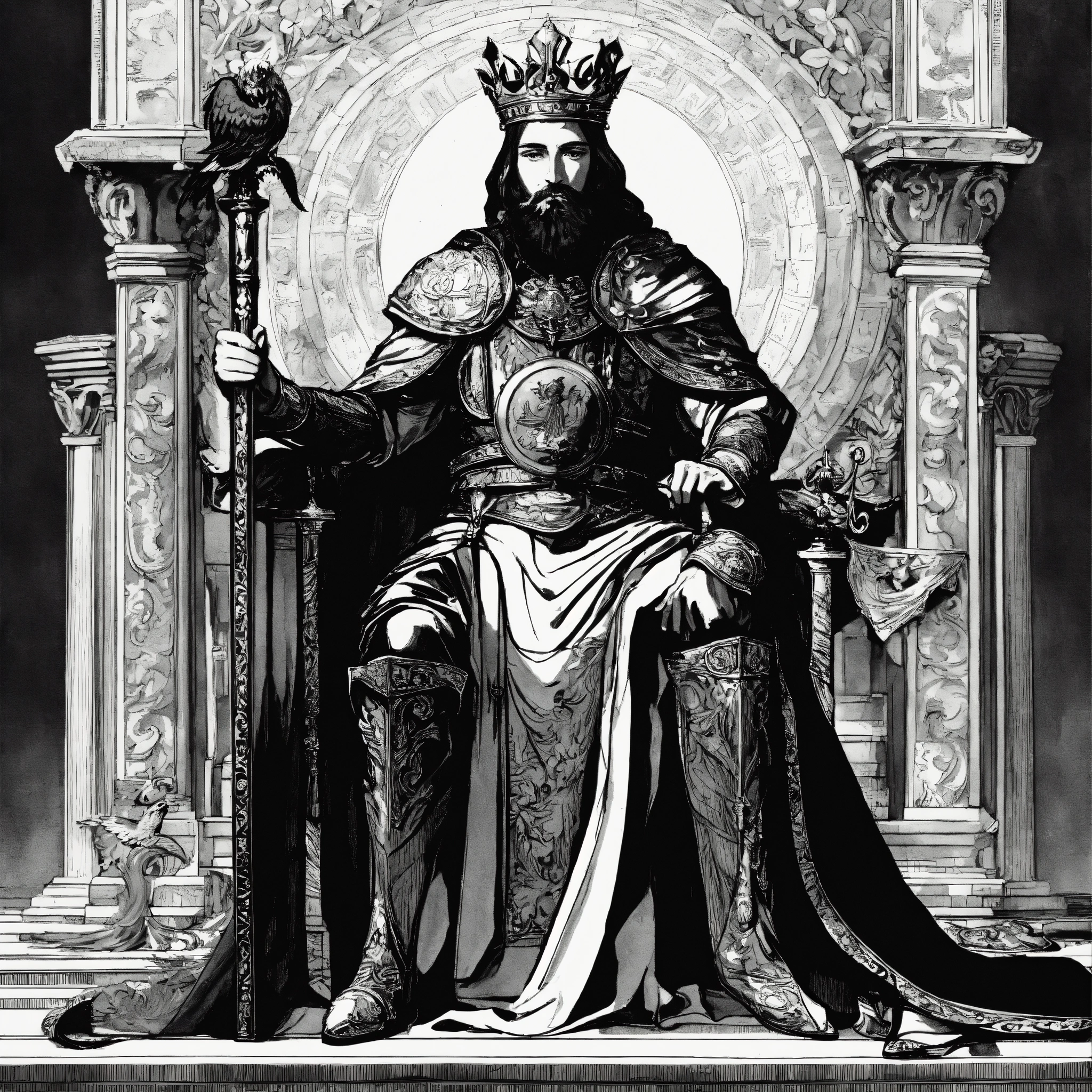 a king holding a scepter and sitting on his throne with an eagle