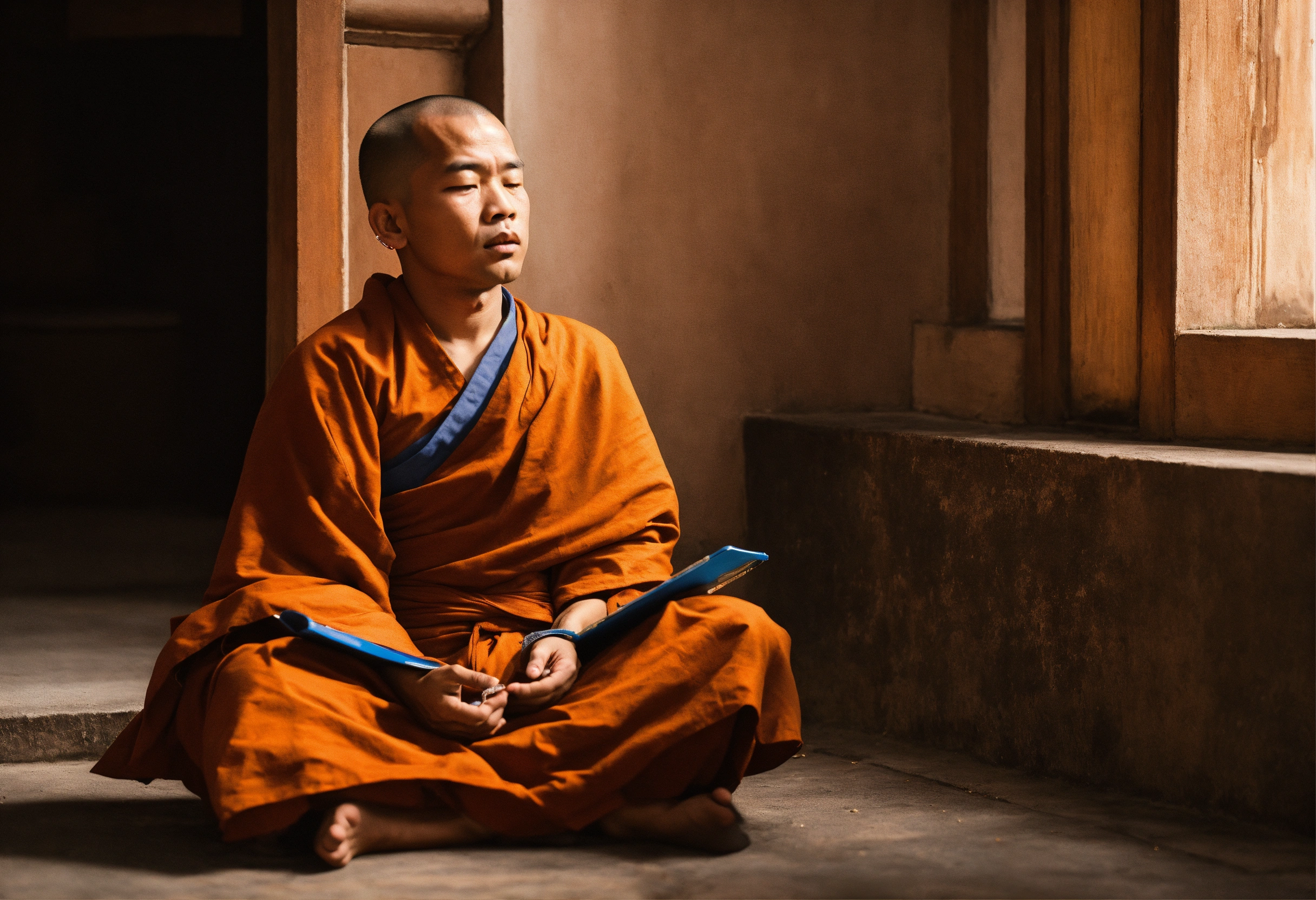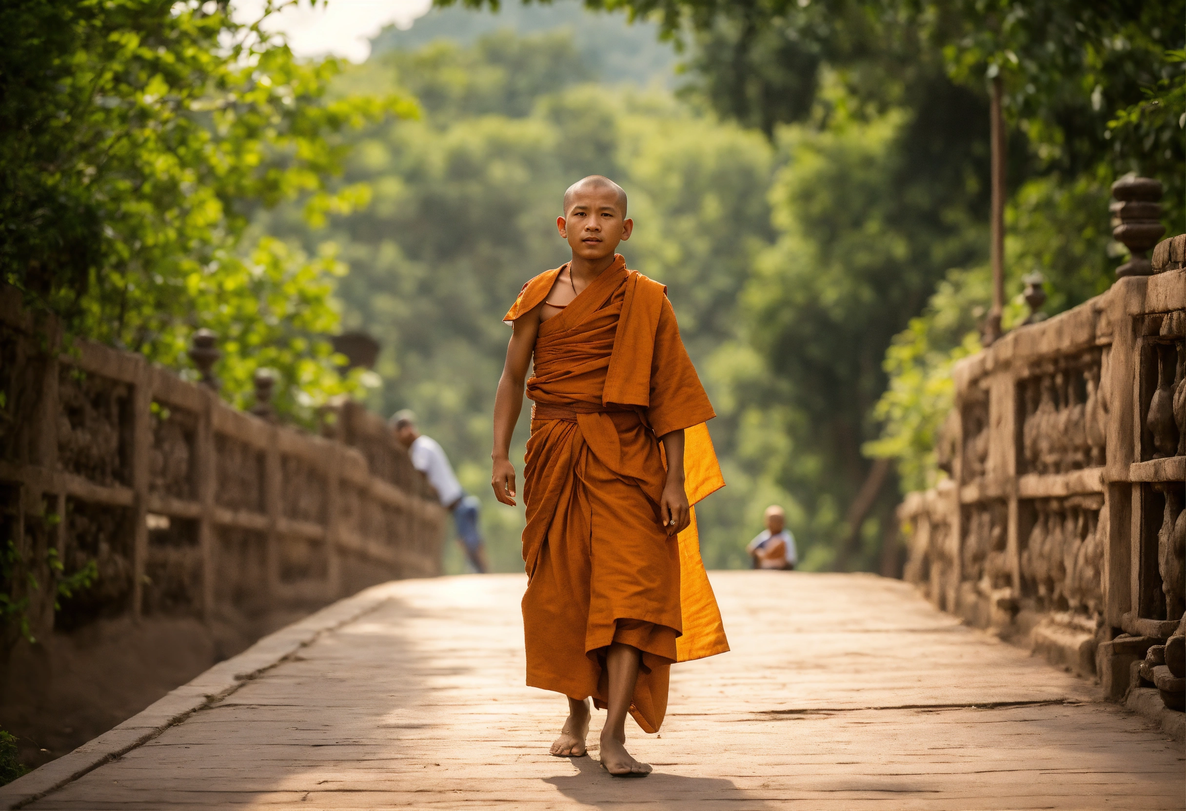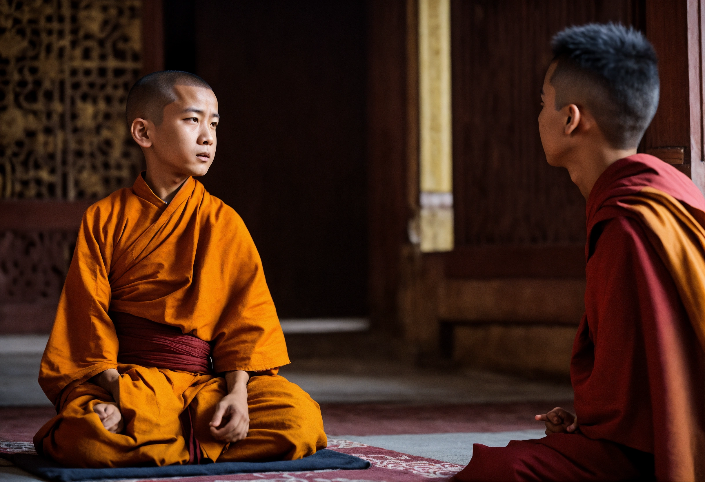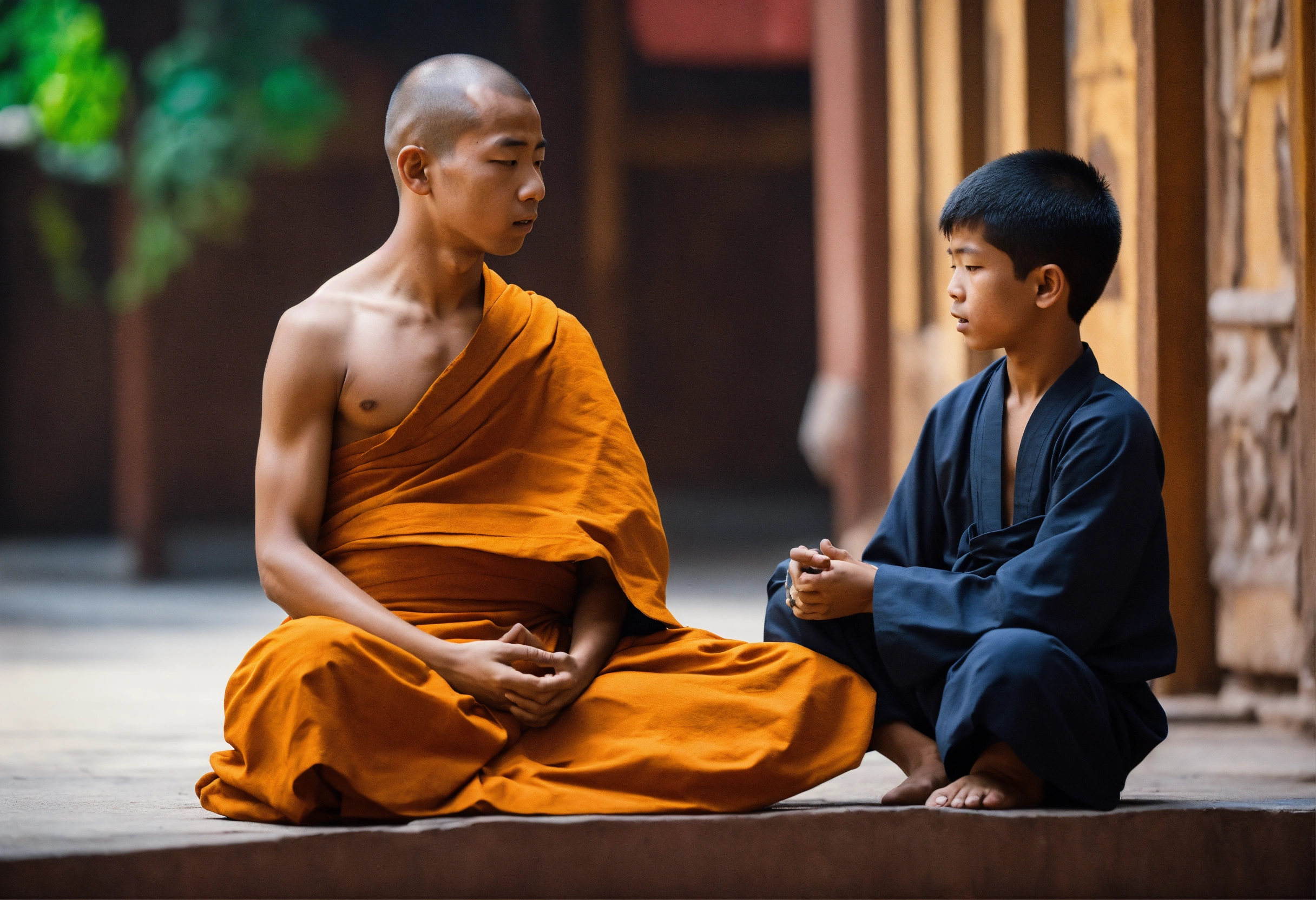 A monk who is calm and a boy who is reacting to the situation