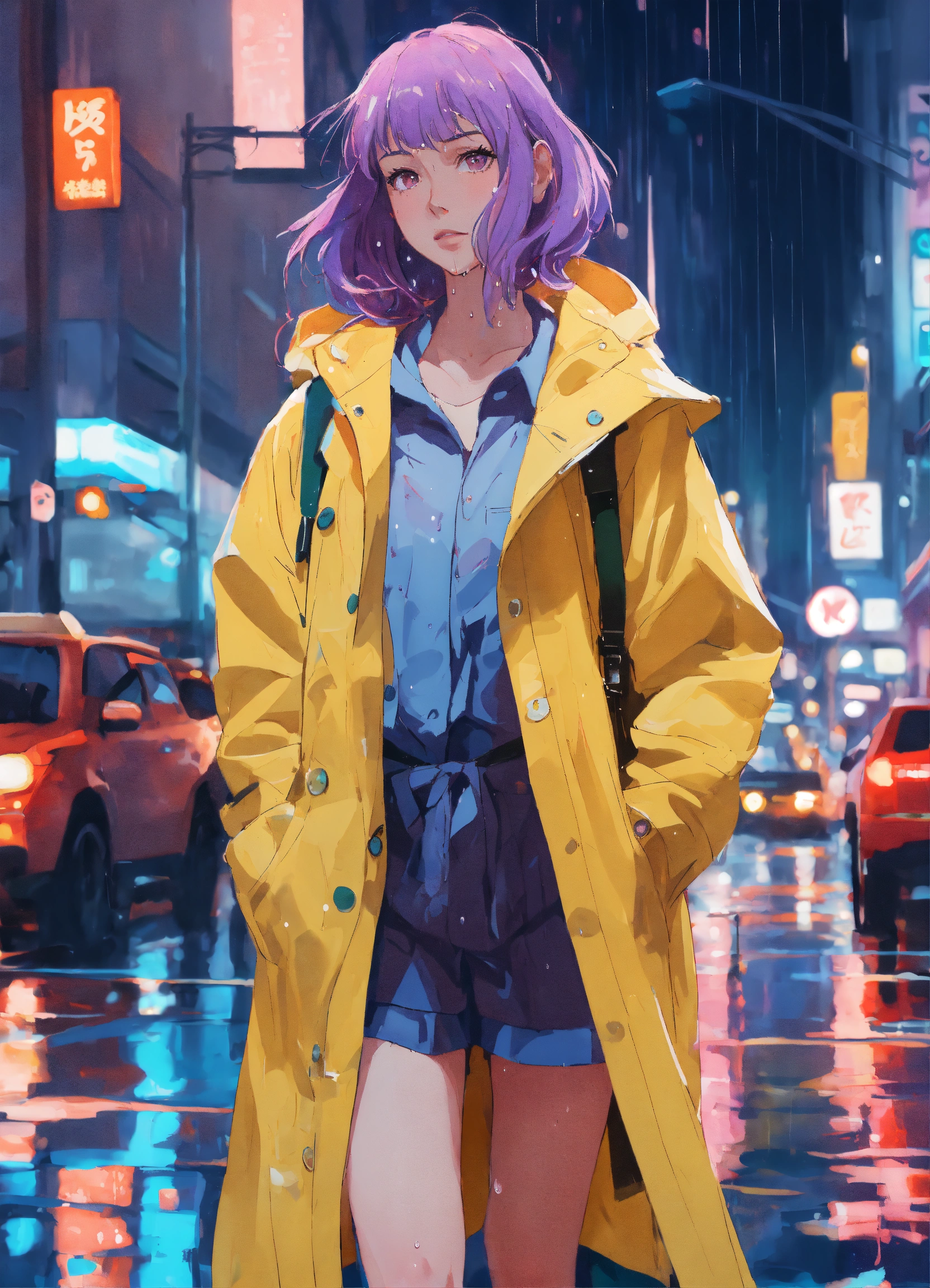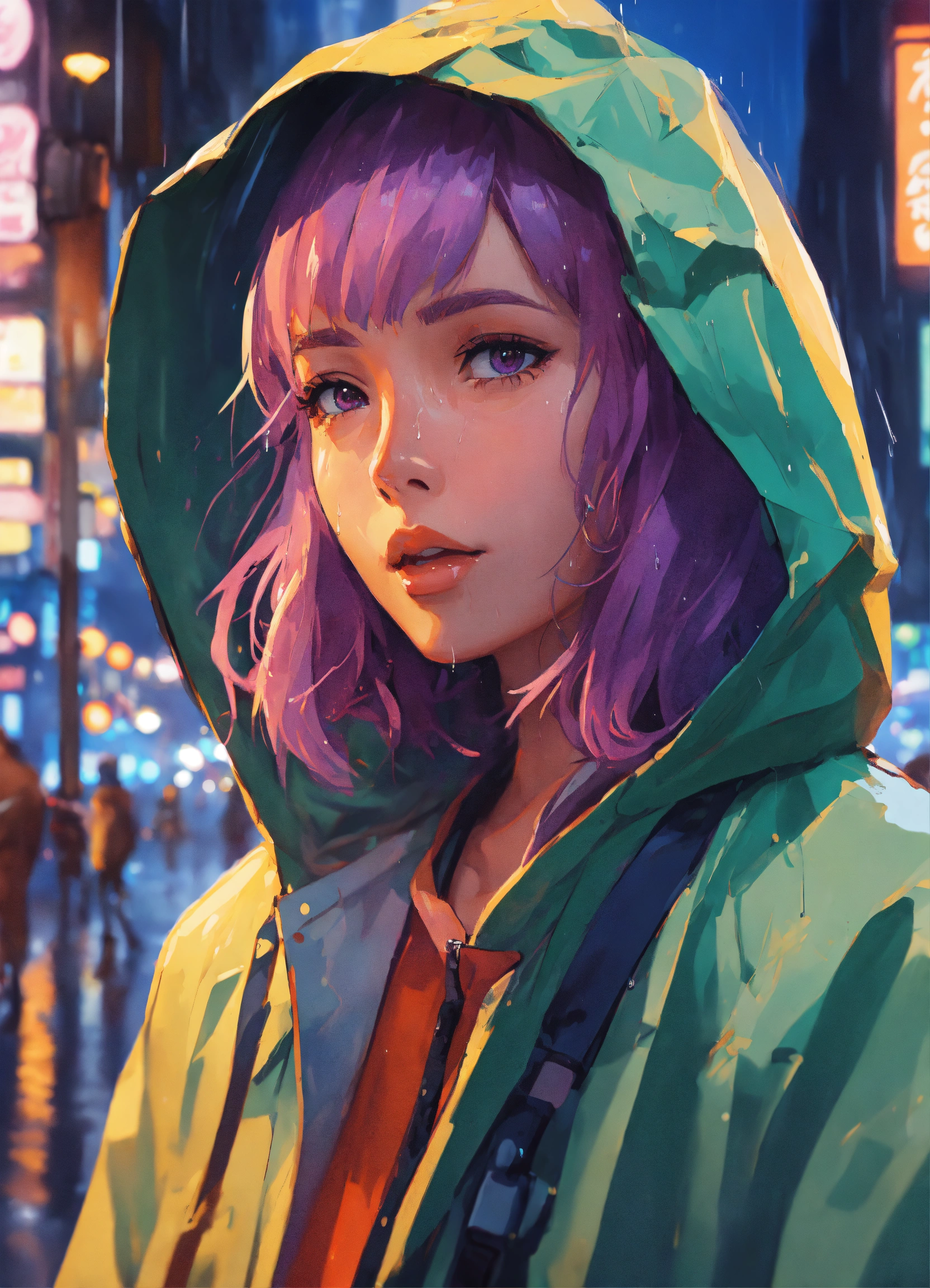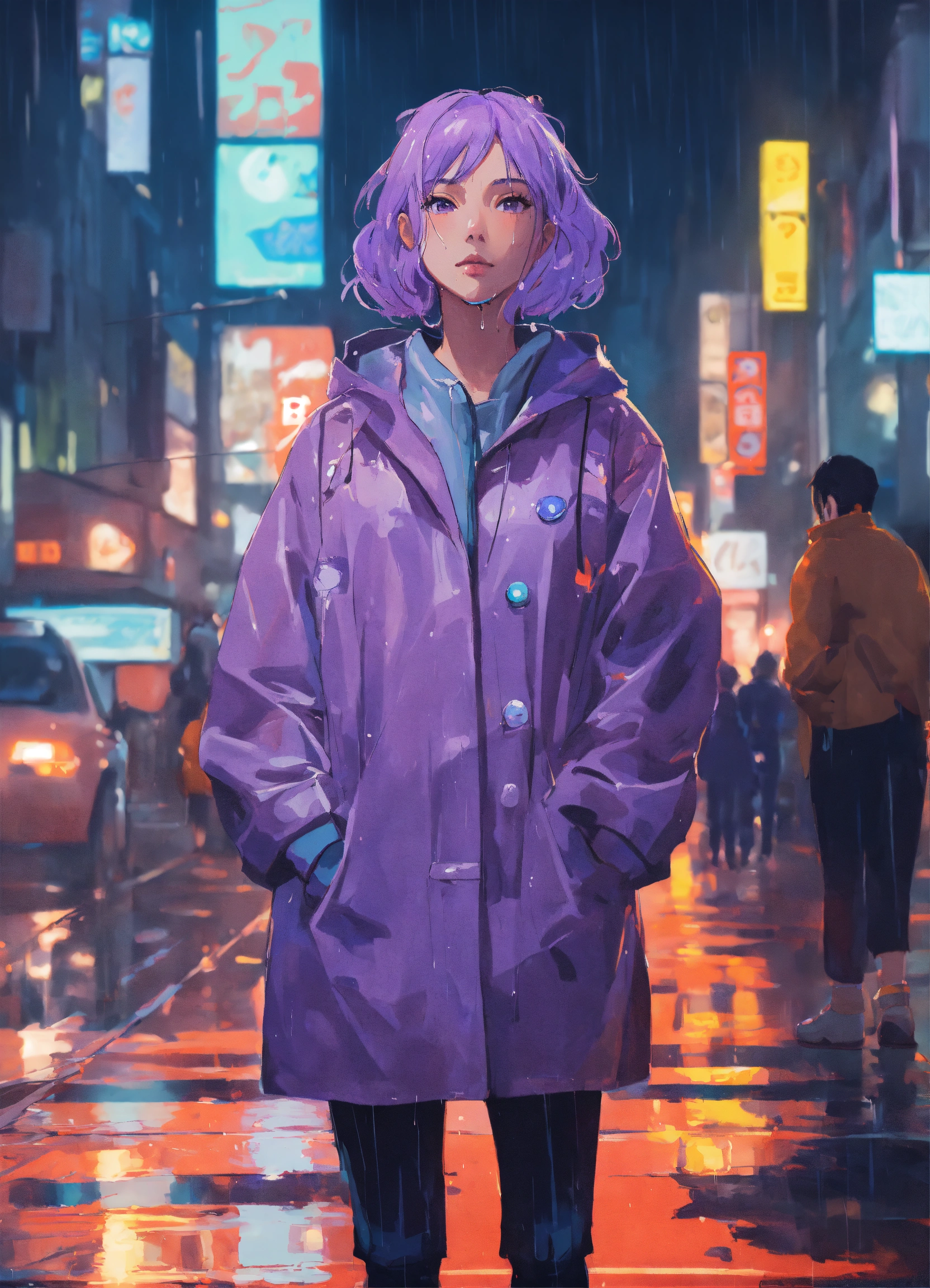 8k photo portrait of a stunning woman with violet hair in a pastel raincoat, looking at the camera, at a bustling crosswalk at night, wet reflections, highly detailed, studio ghibli, akira toriyama, james gilleard, genshin impact, trending pixiv fanbox, acrylic palette knife, 4k, vibrant colors