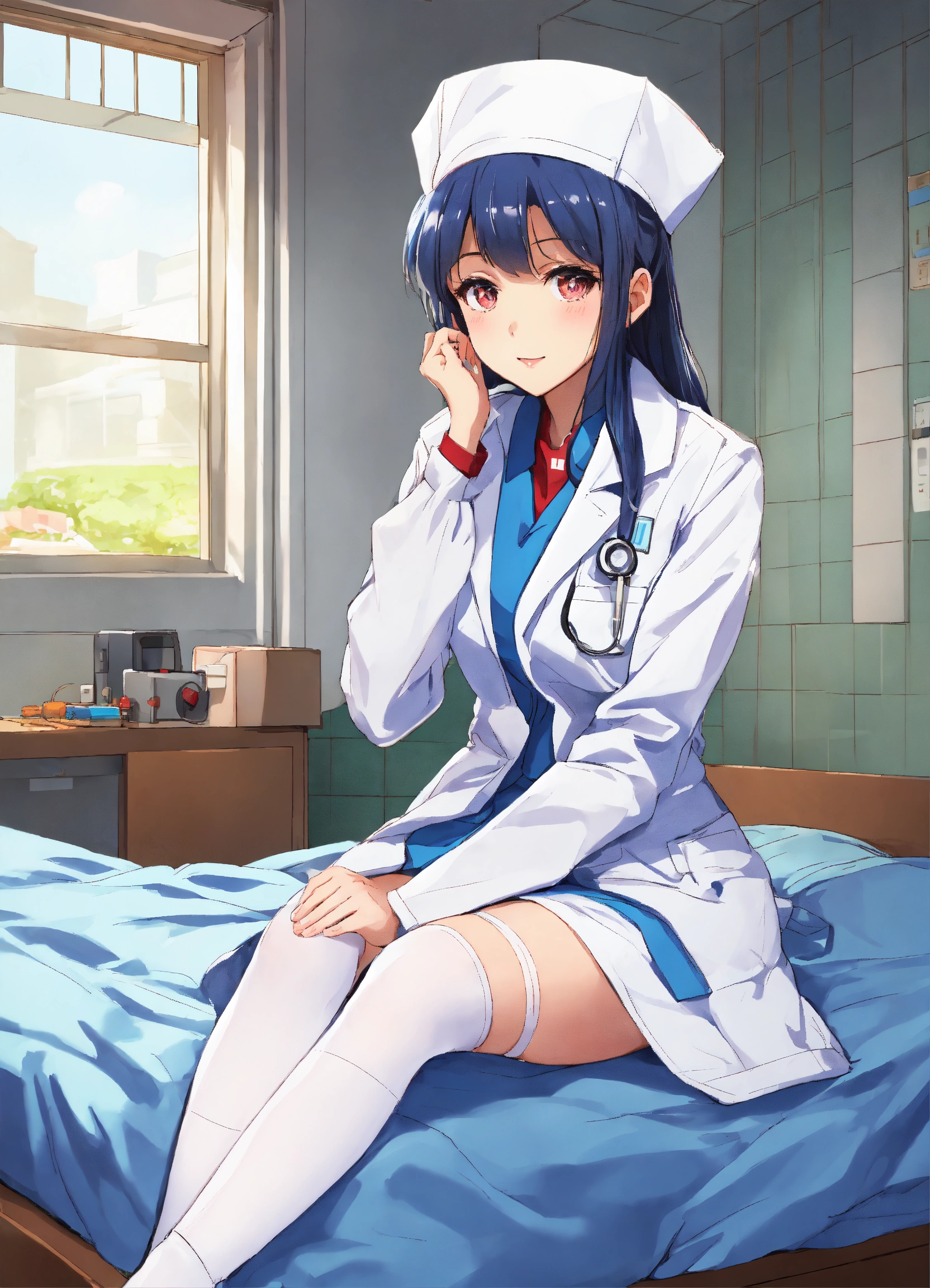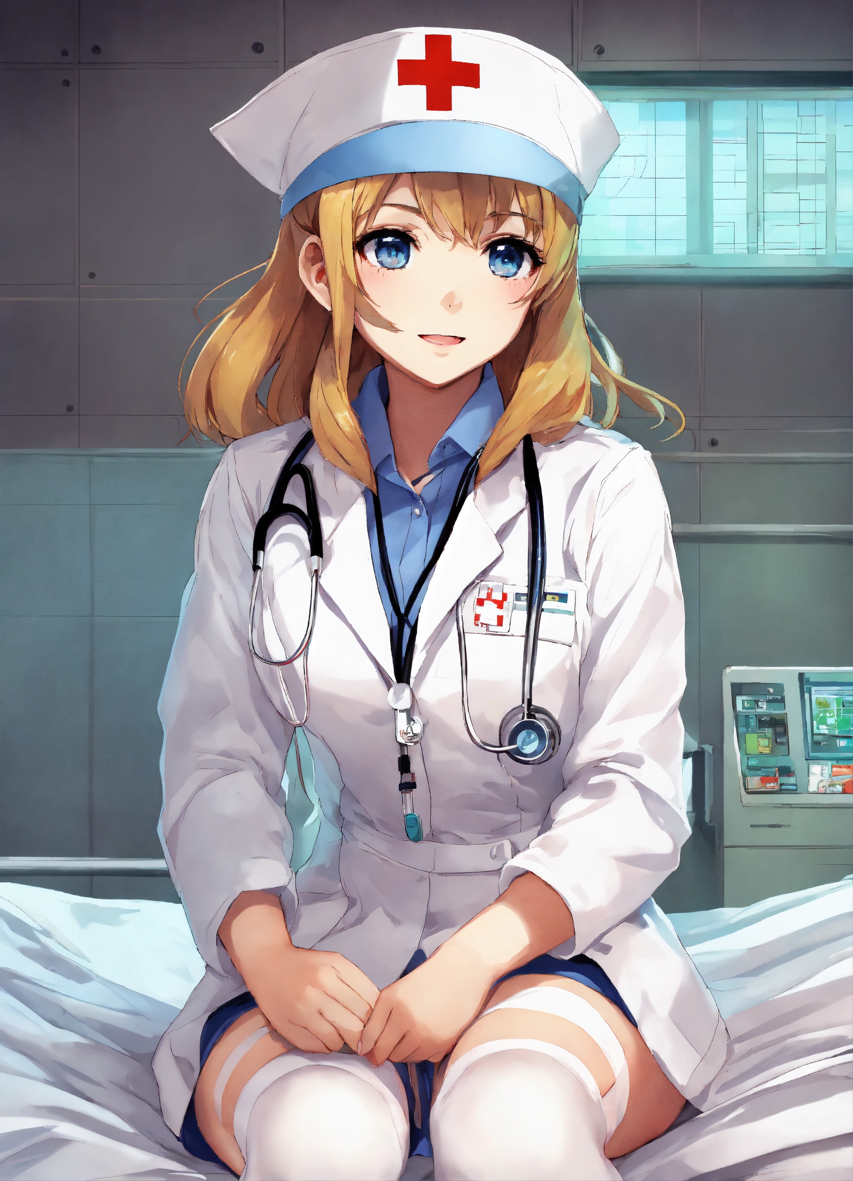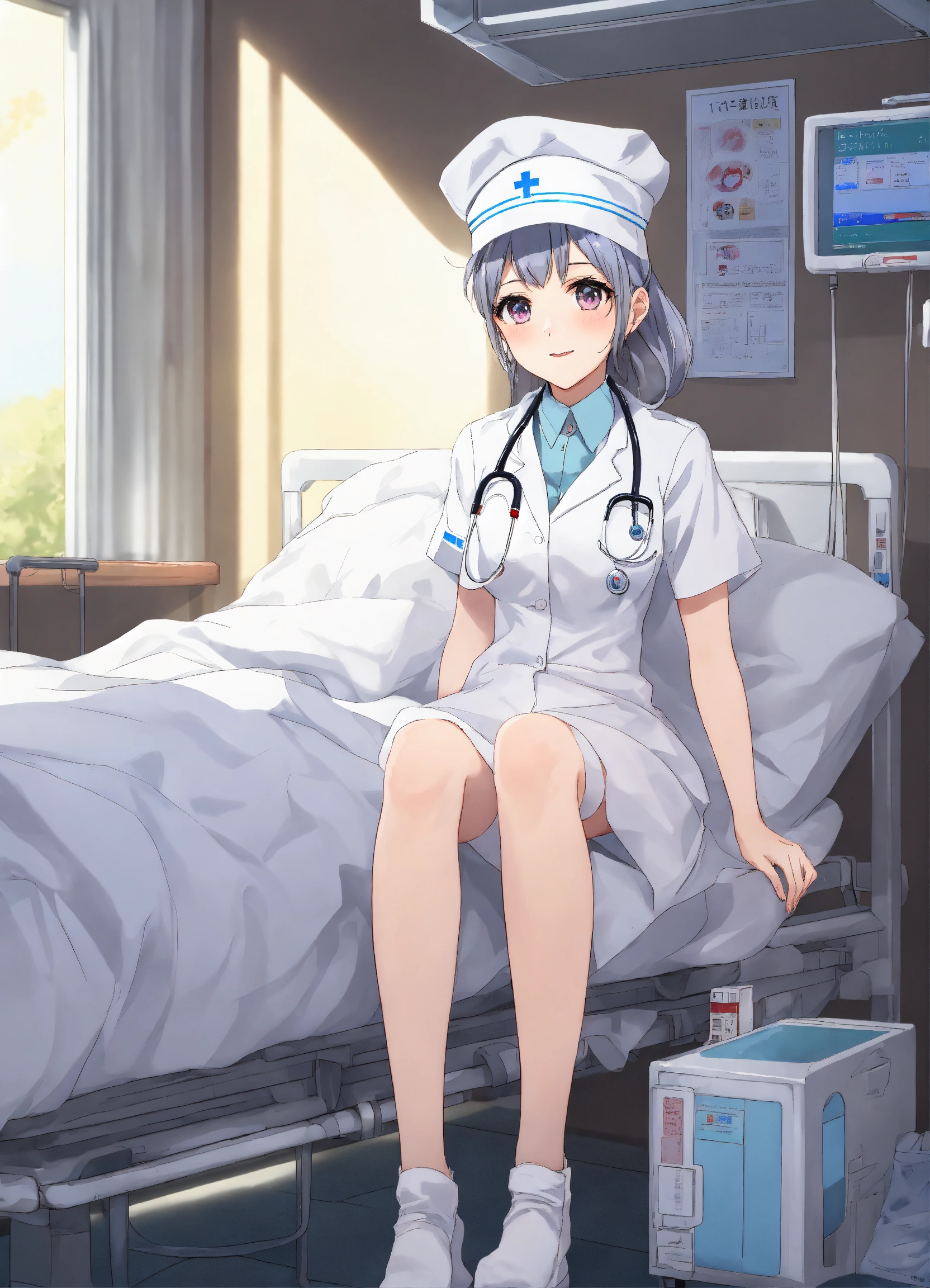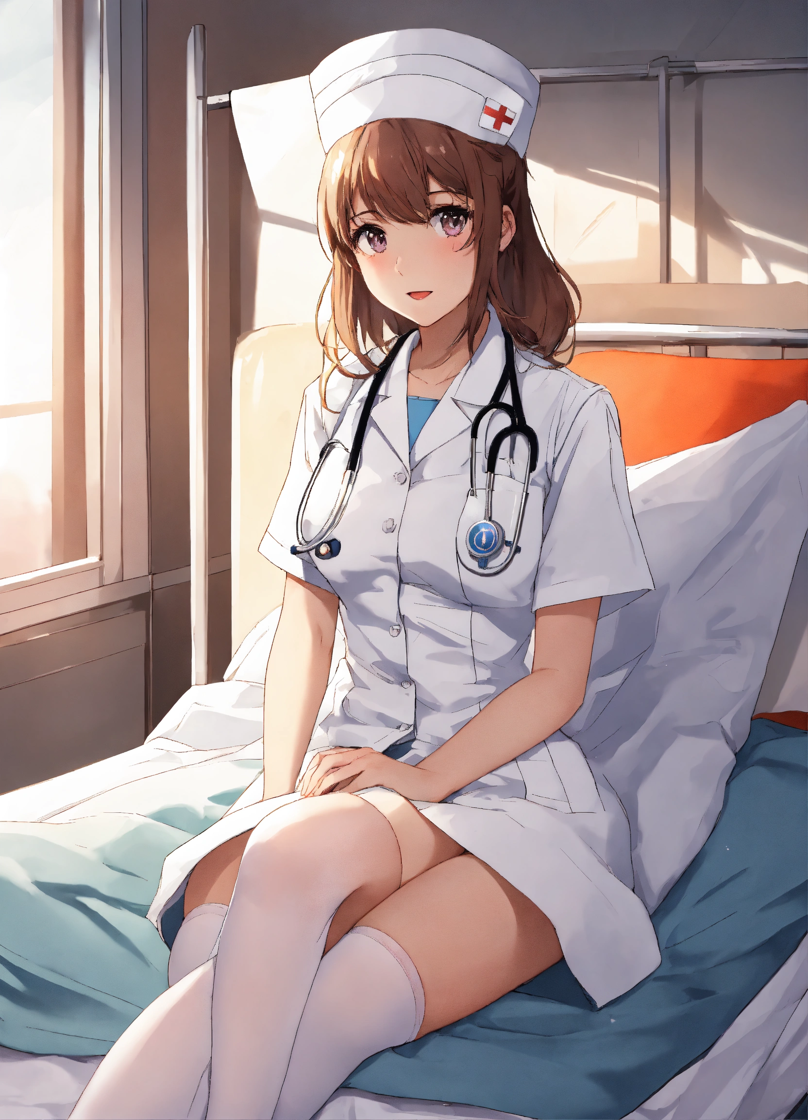 1 nurse girl in a white cap in a white coat, anime face, white high stockings on her feet, sitting on a hospital bed