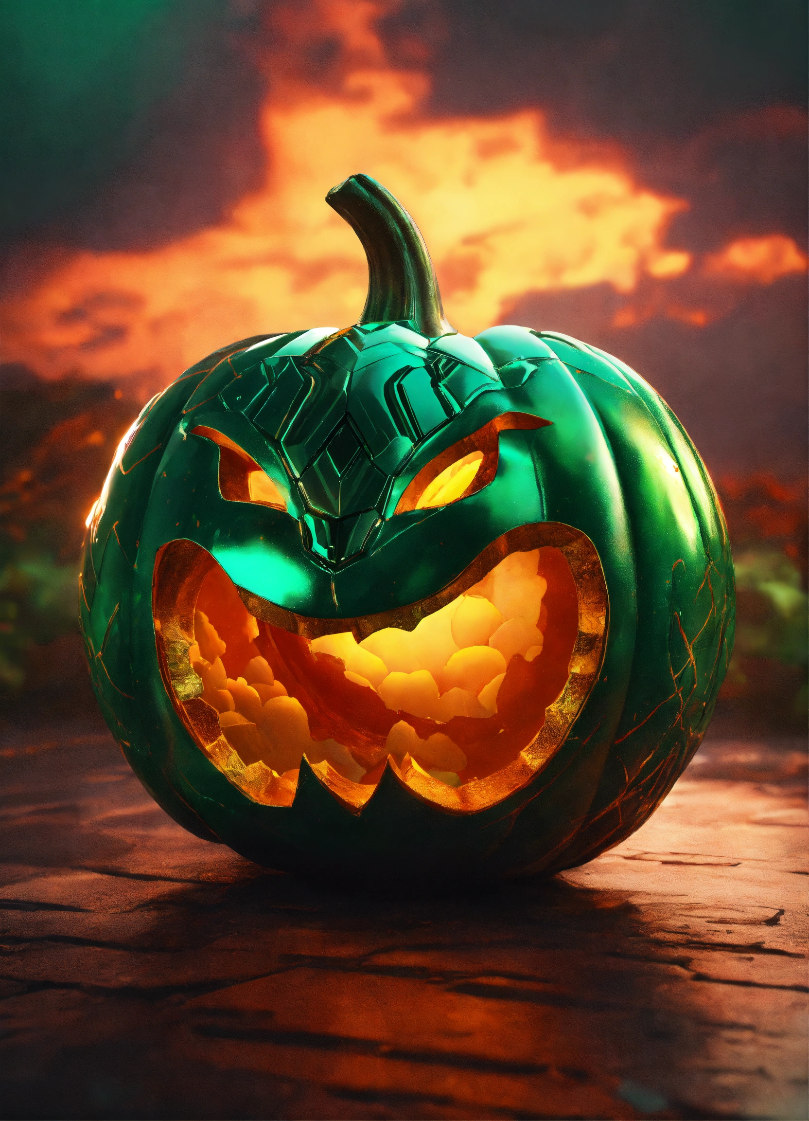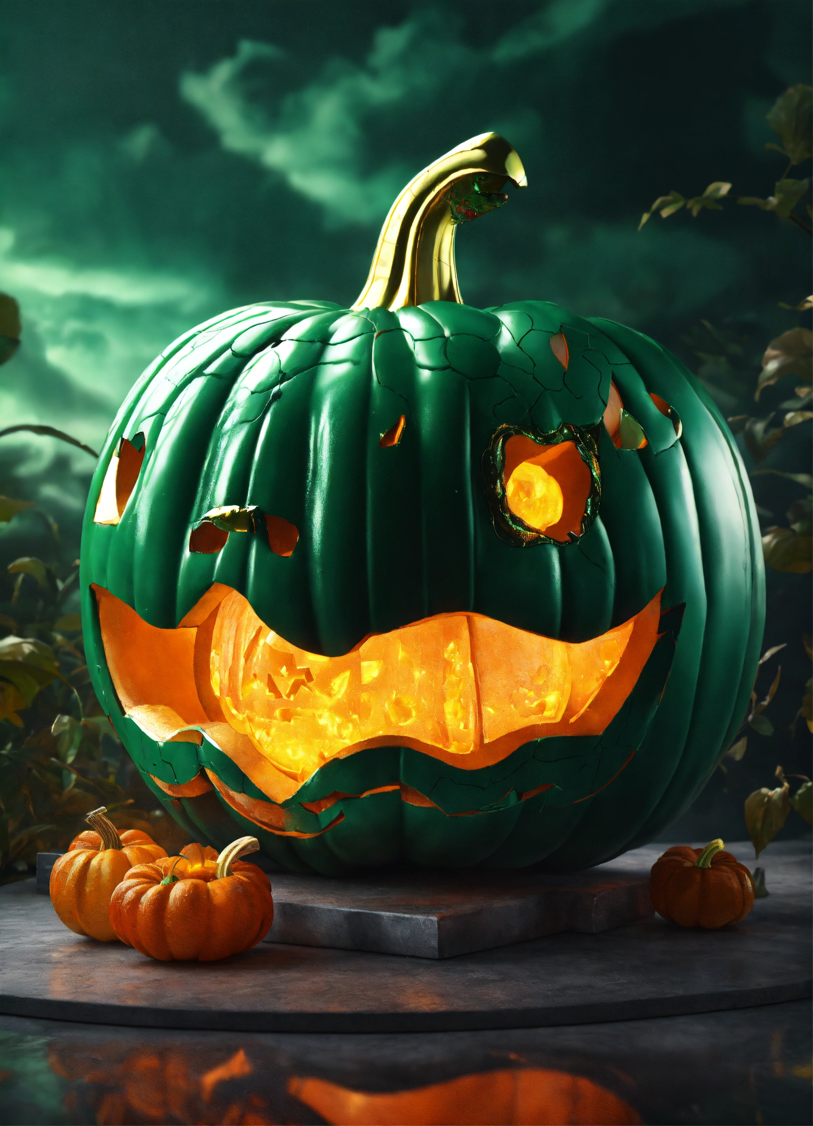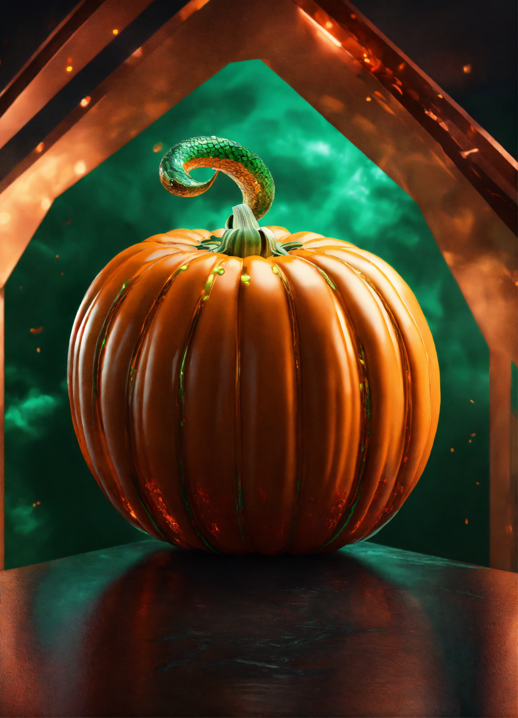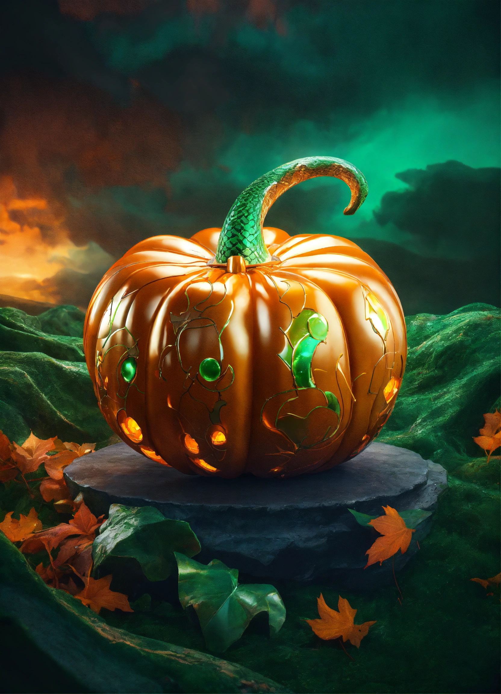 Orange ruby pumpkin concept, made out of green emerald snake dark clouds, luxury, futurist, stunning unreal engine render, product photography, 8k, hyper-realistic. surrealism