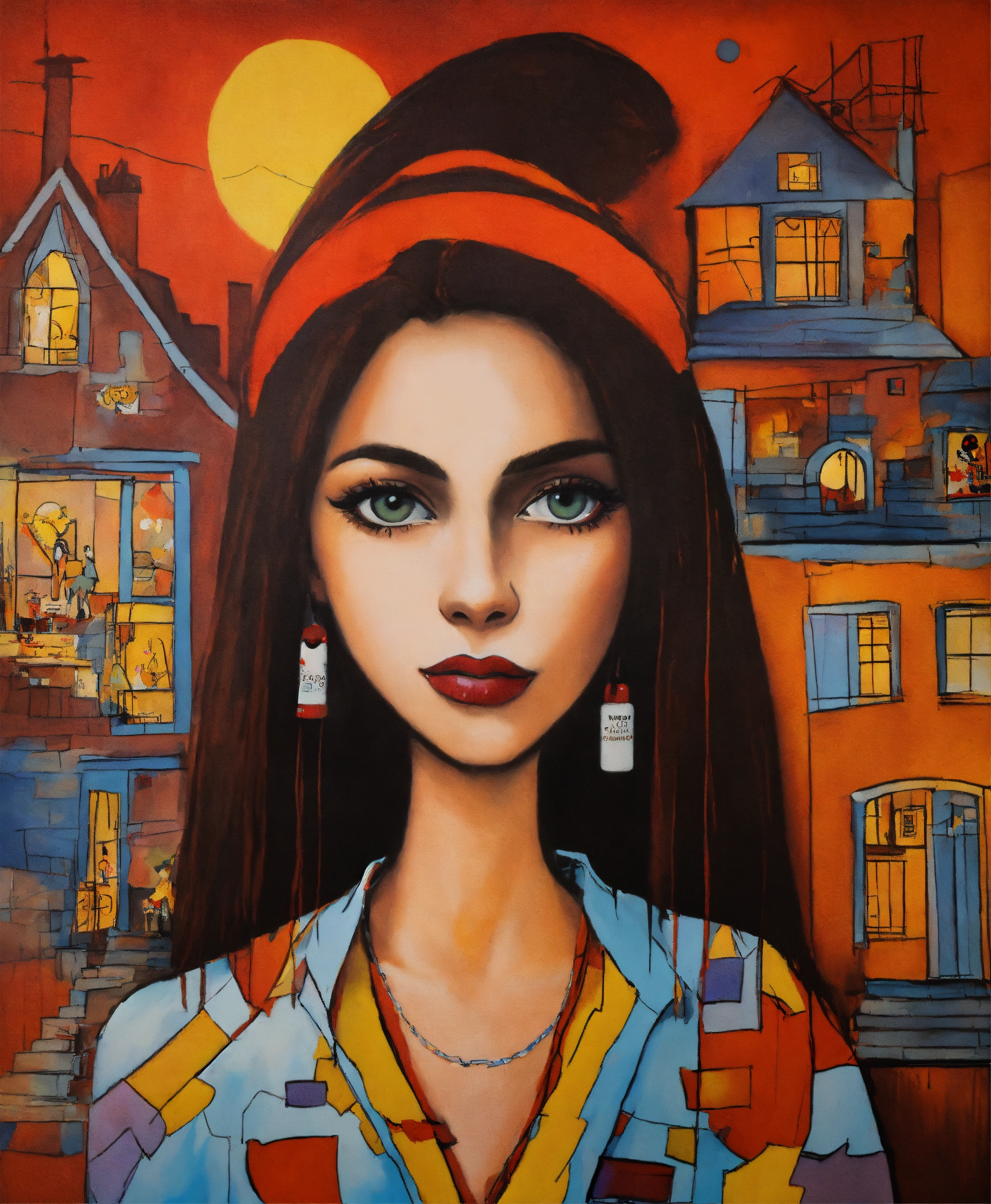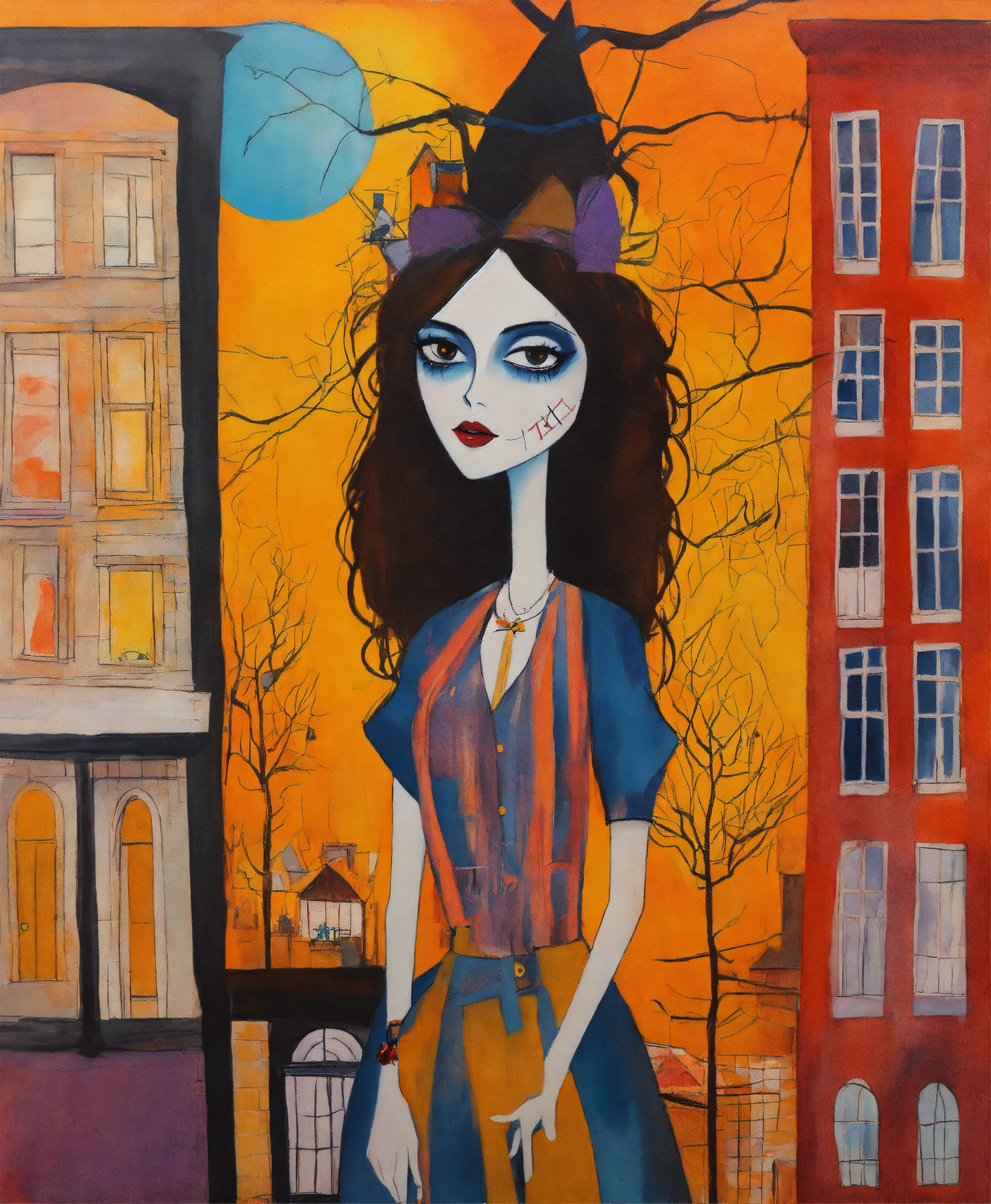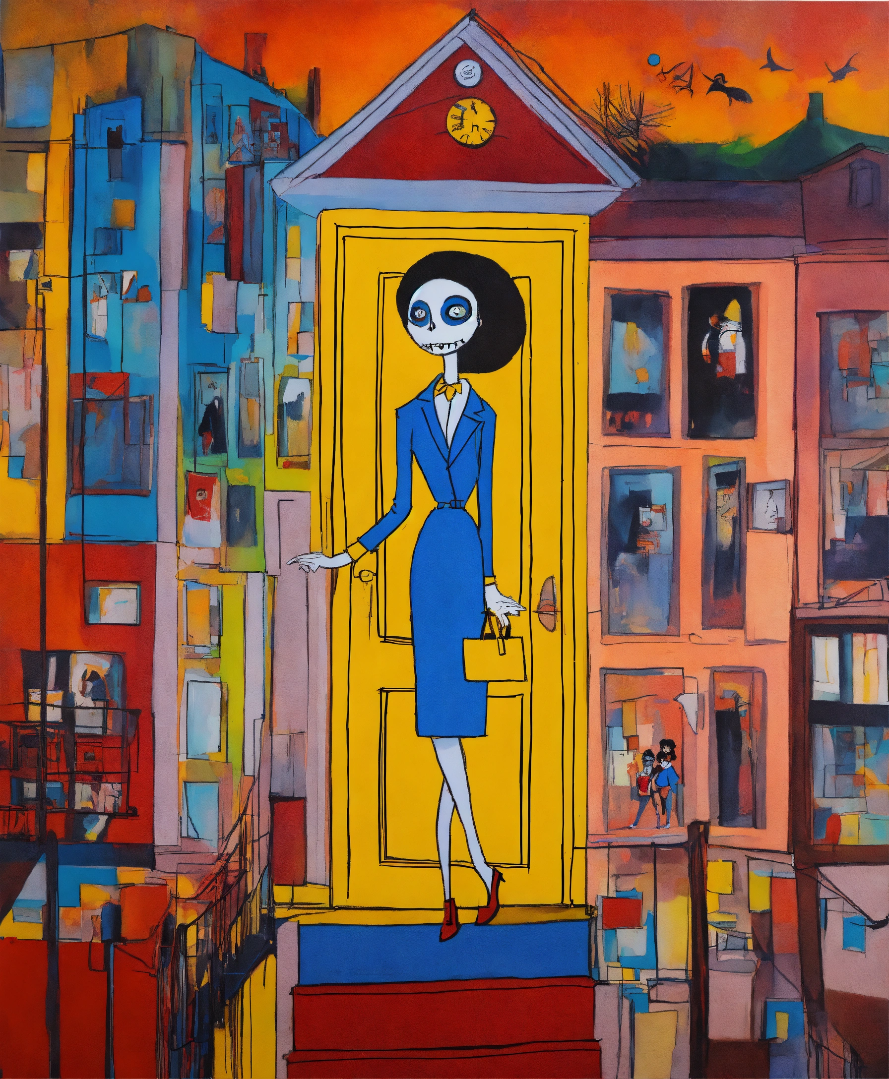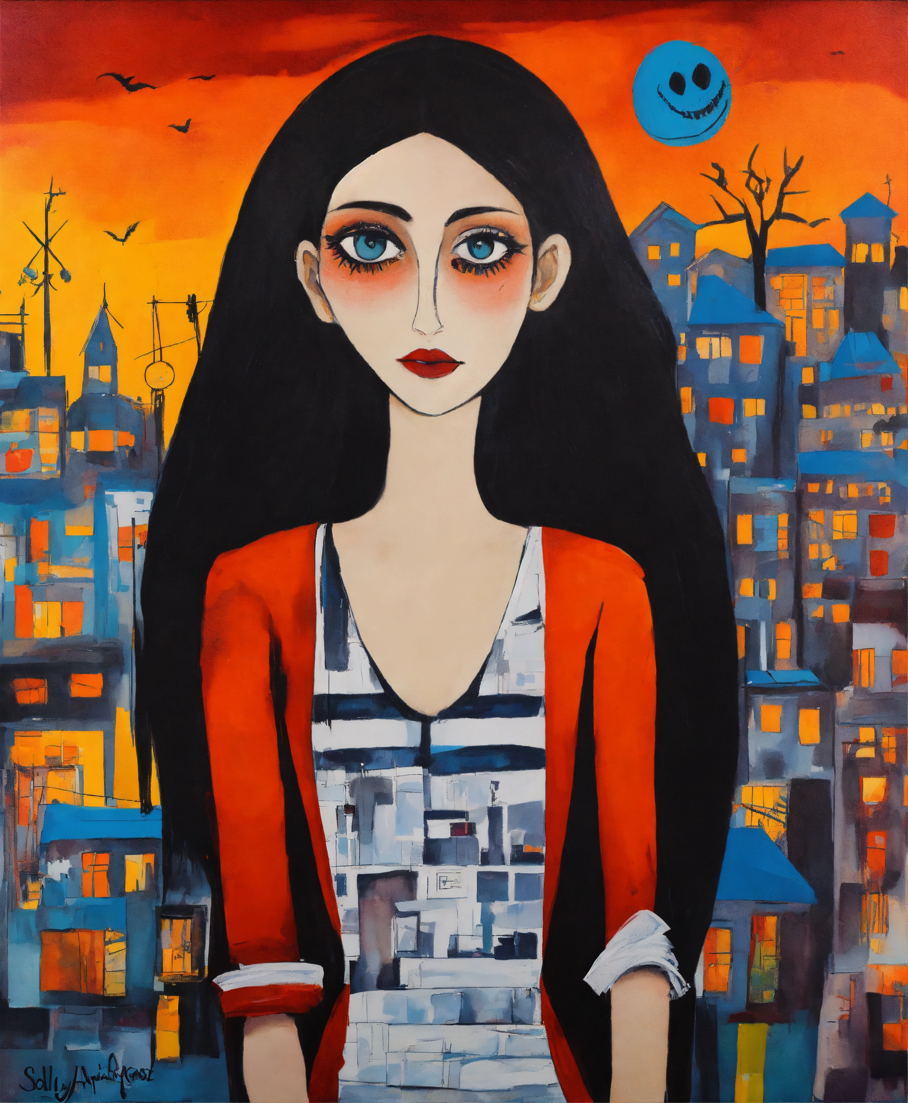 Create an neo-expressionist painting inspired by jean michael basquiat and blend it with the style of georges lepape drawings - create a painting of a brunette realtor woman that looks like sally from nightmare before christmas