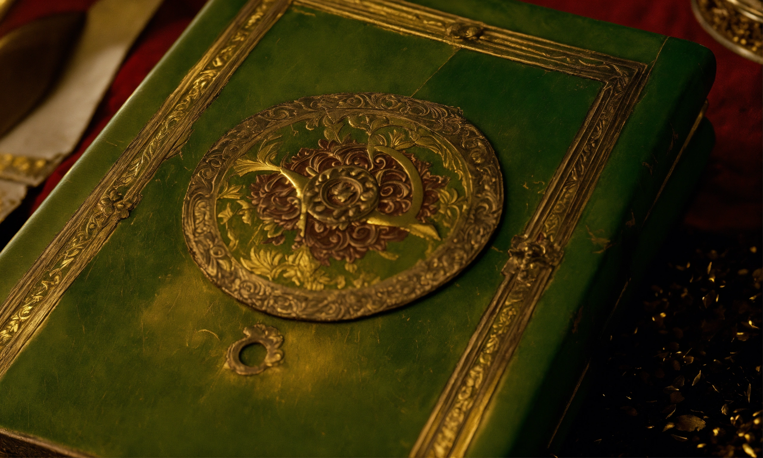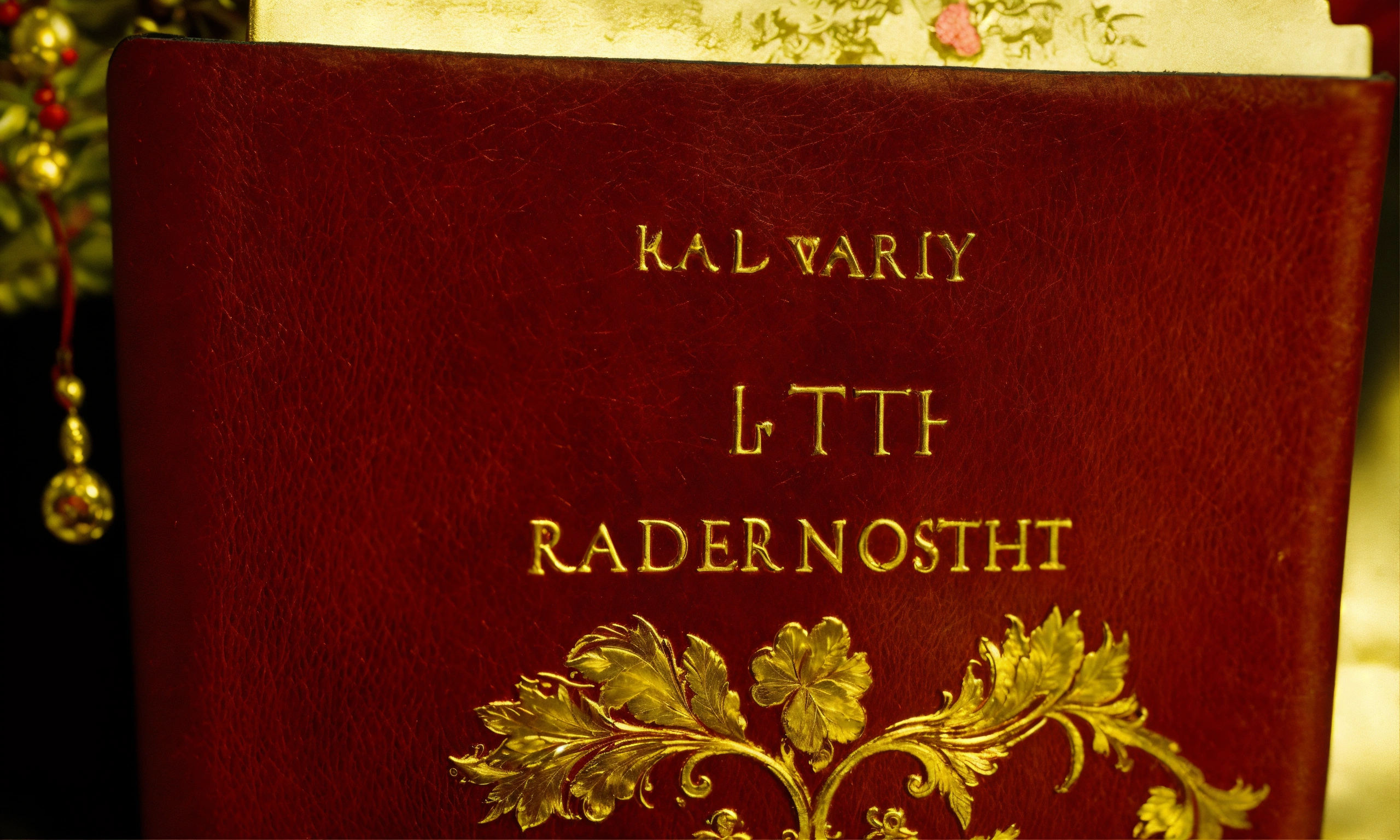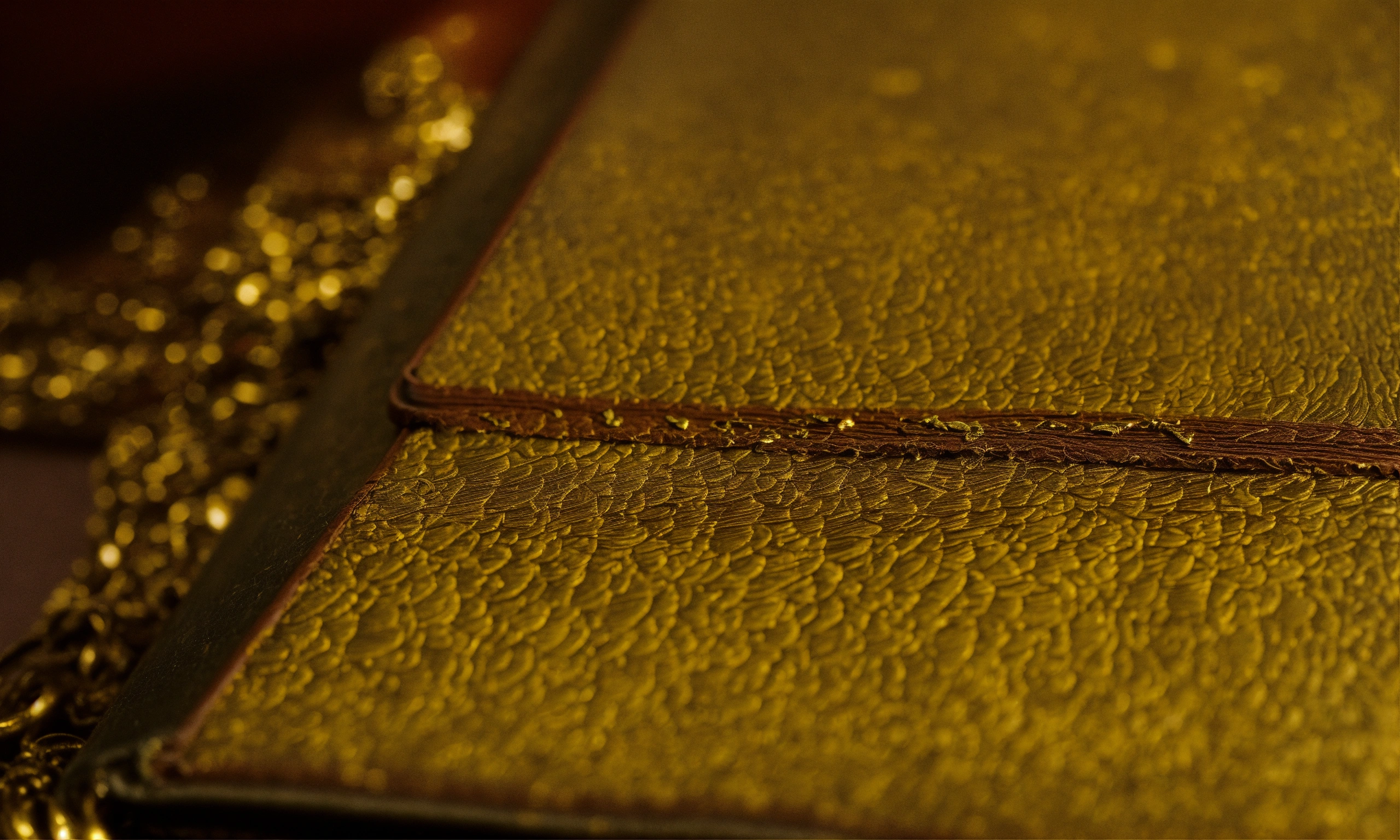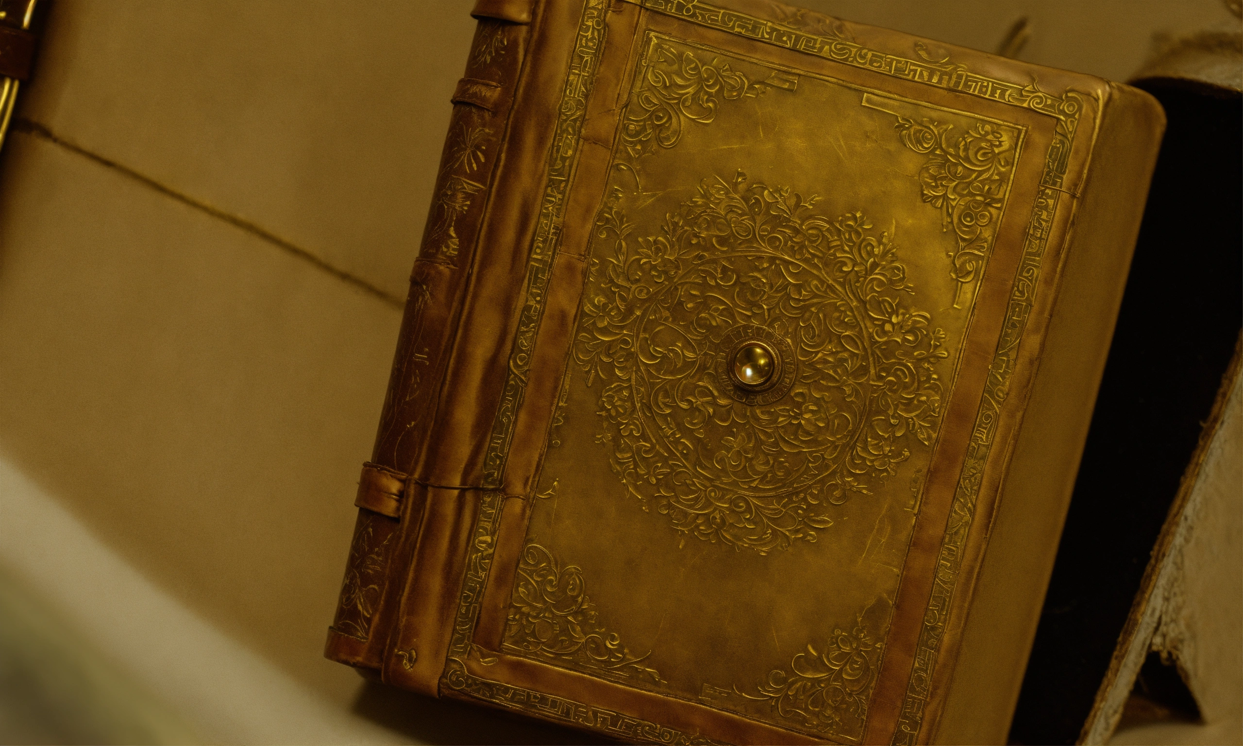 A close-up of the diary's cover, over the shoulder of lady, highlighting the aged leather, faded gold leaf accents, and the hint of secrets hidden within.