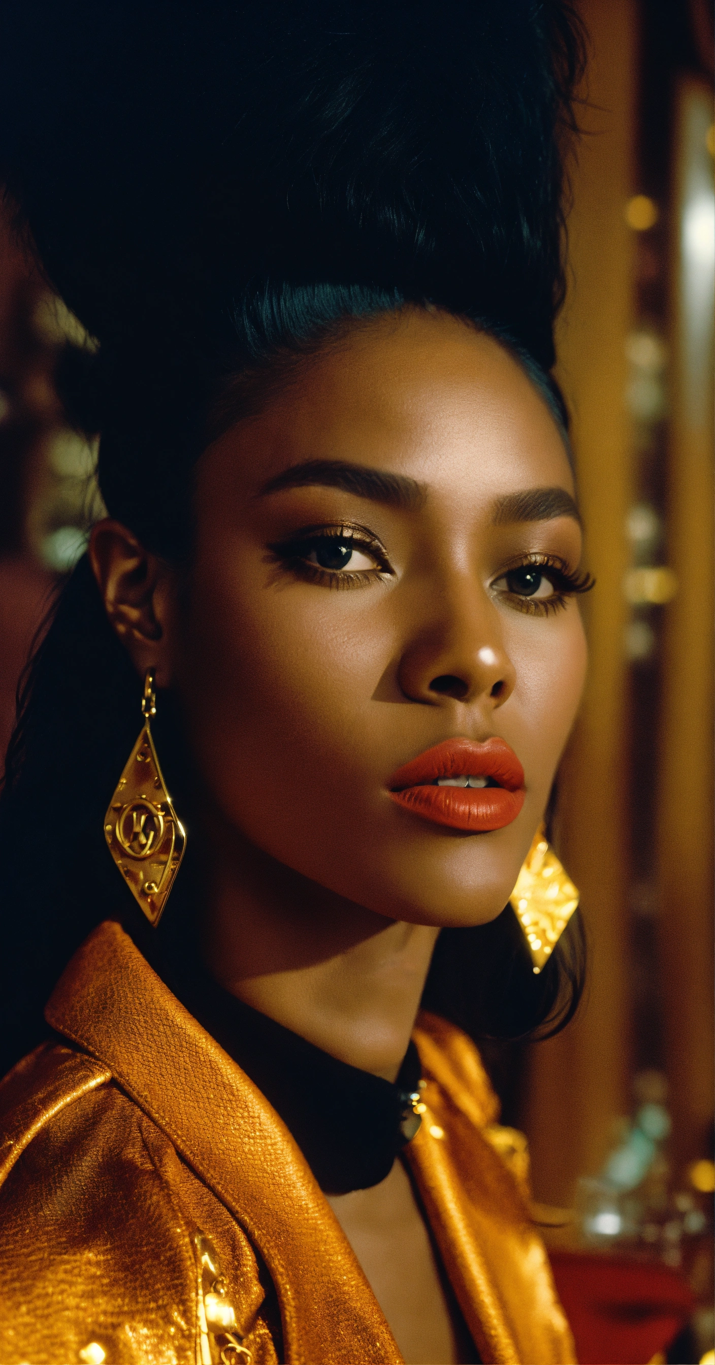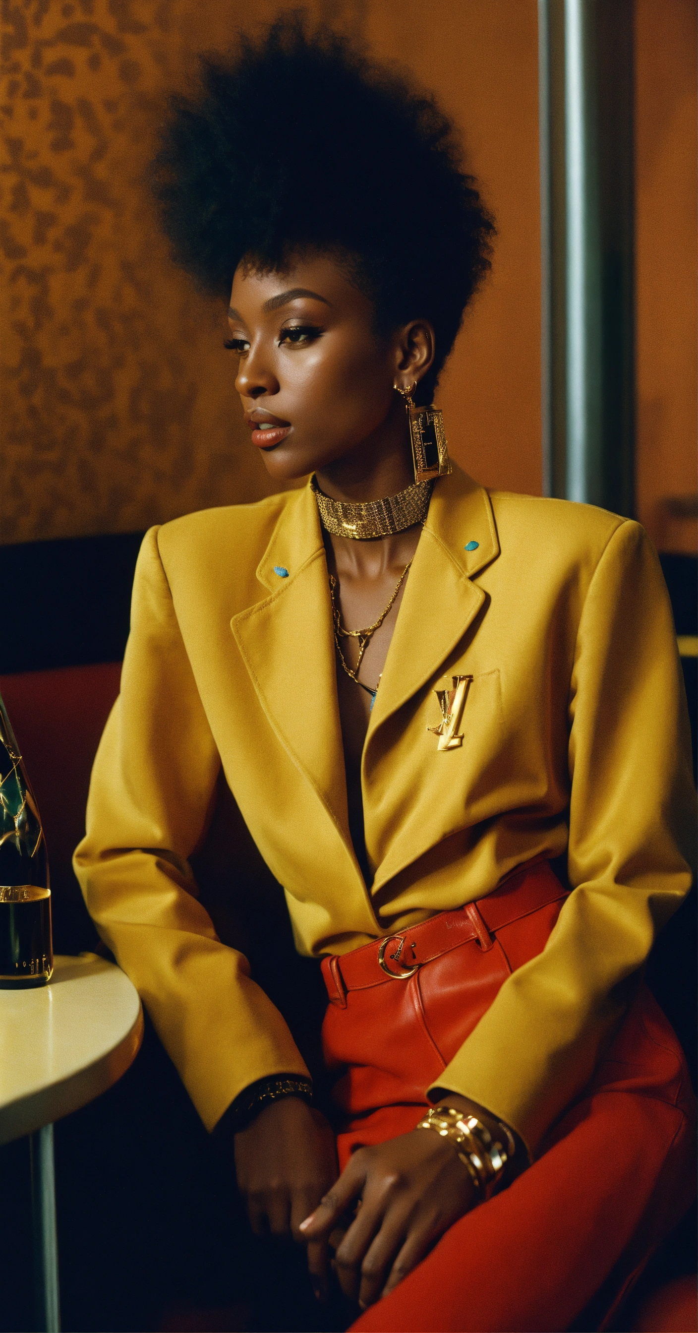 Side profile photograph of donyale luna in the 90s at a lounge, hyper realistic, 35mm film, editorial, high fashion, 8k resolution, hyper realistic, mid day, 35mm film, editorial, high fashion, louis vuitton, by virgil abloh