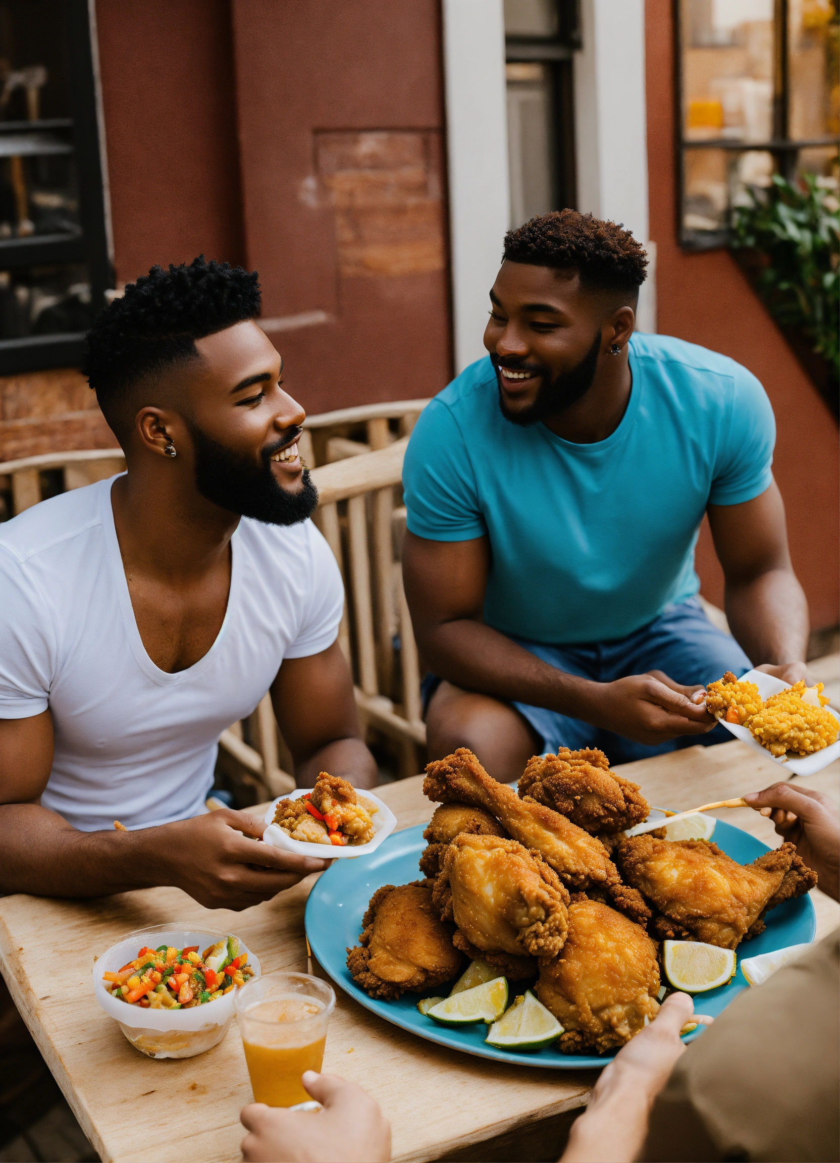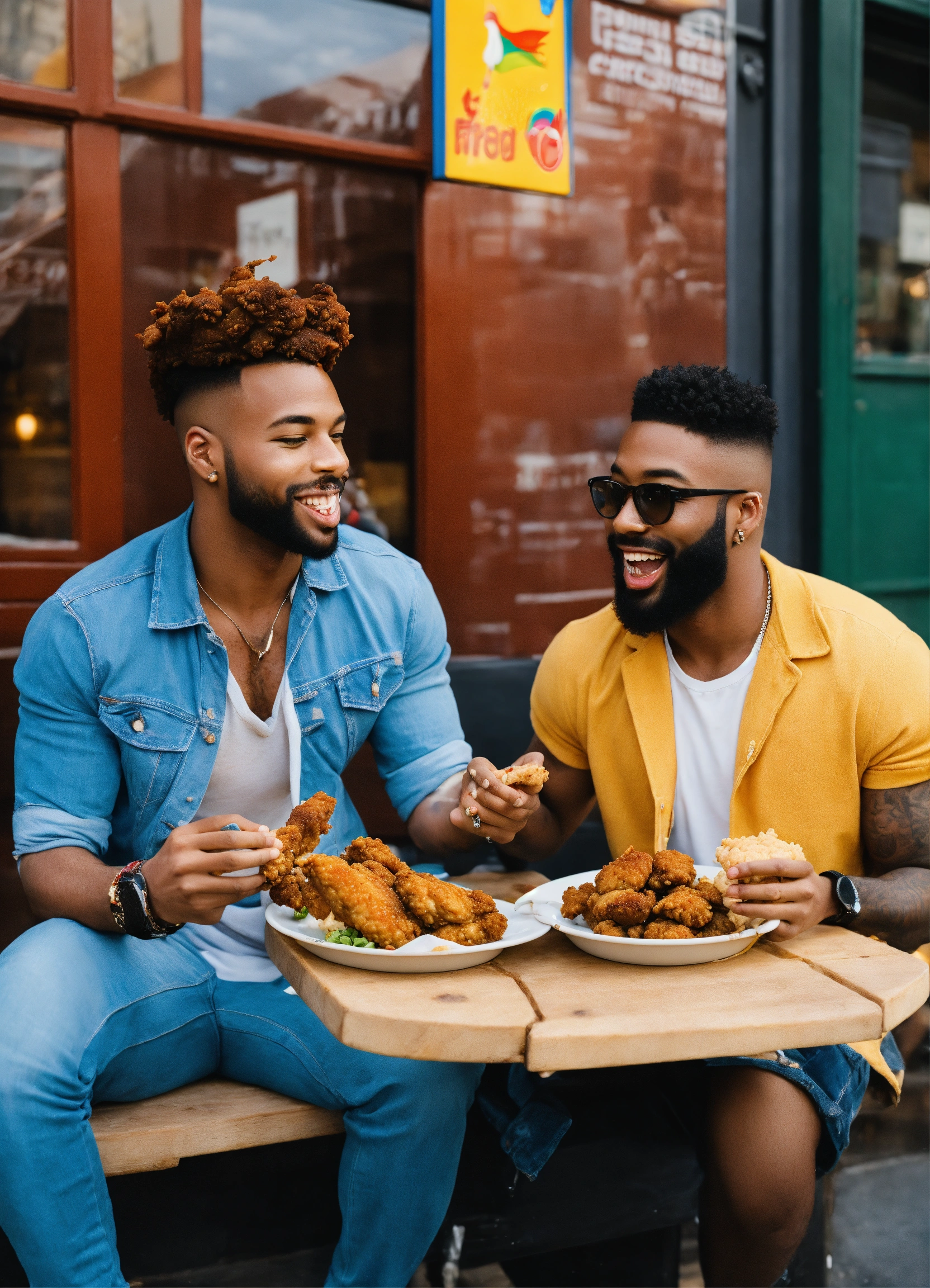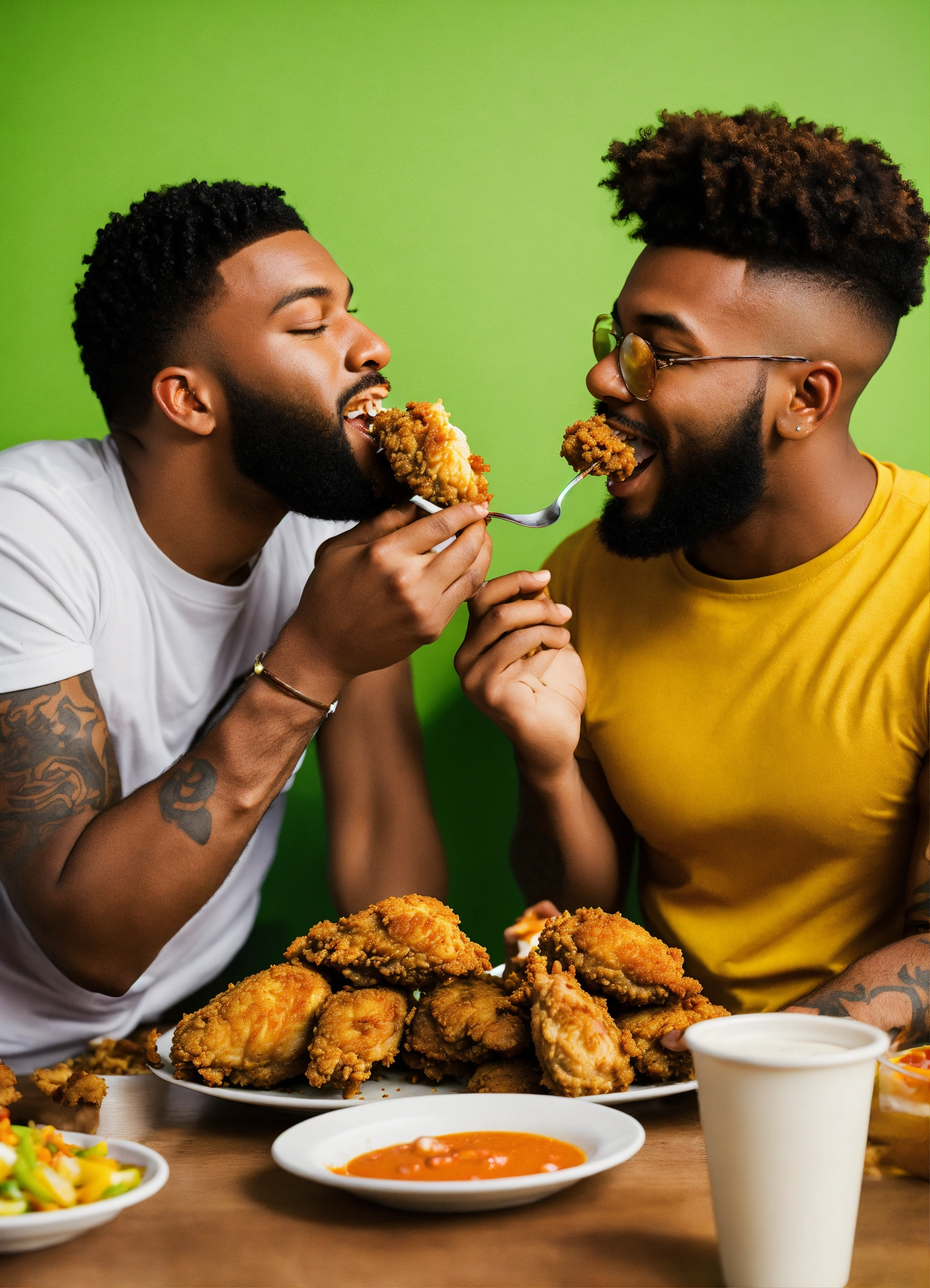 Diverse gay men eating fried chicken