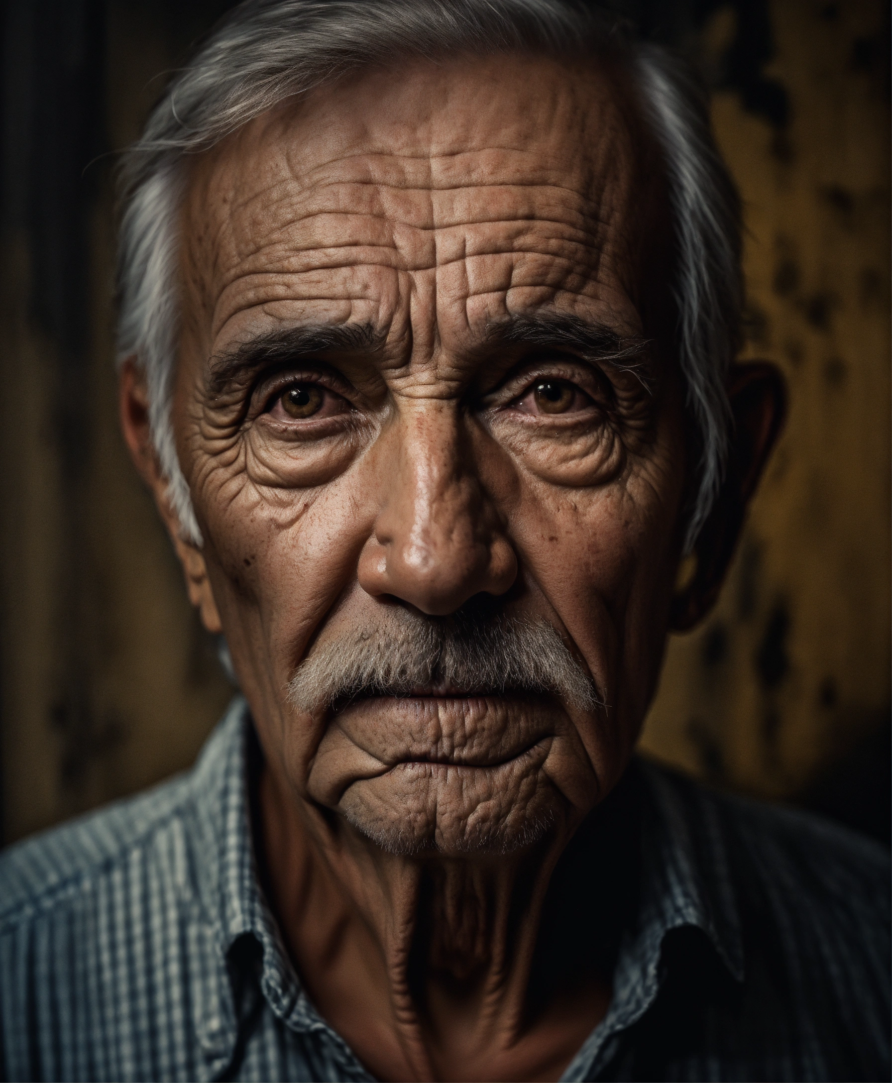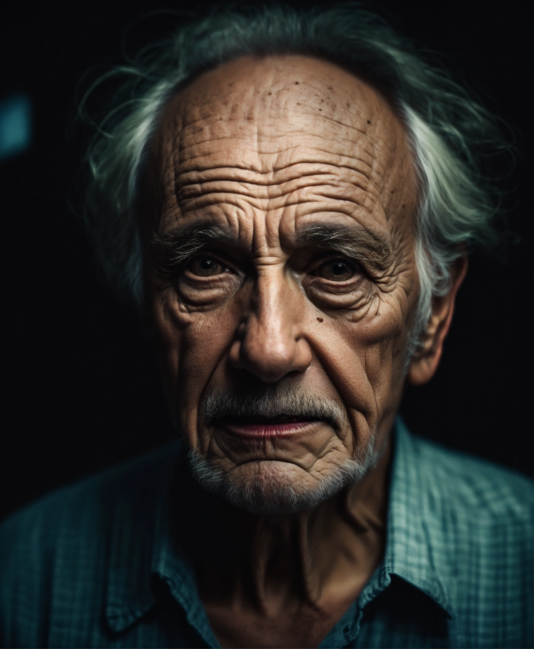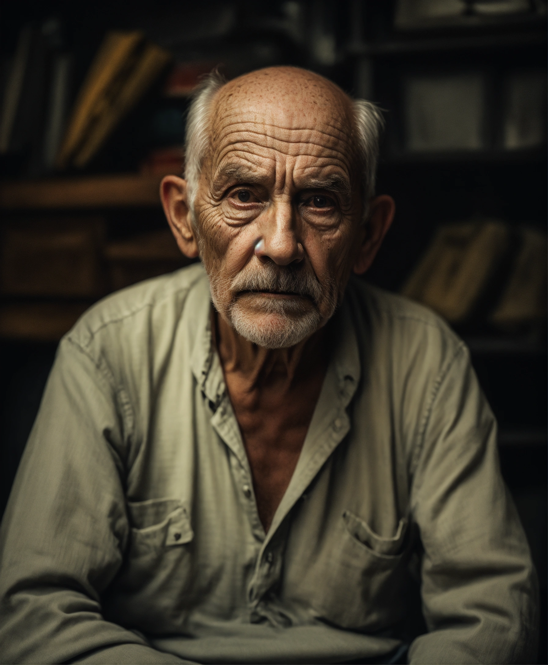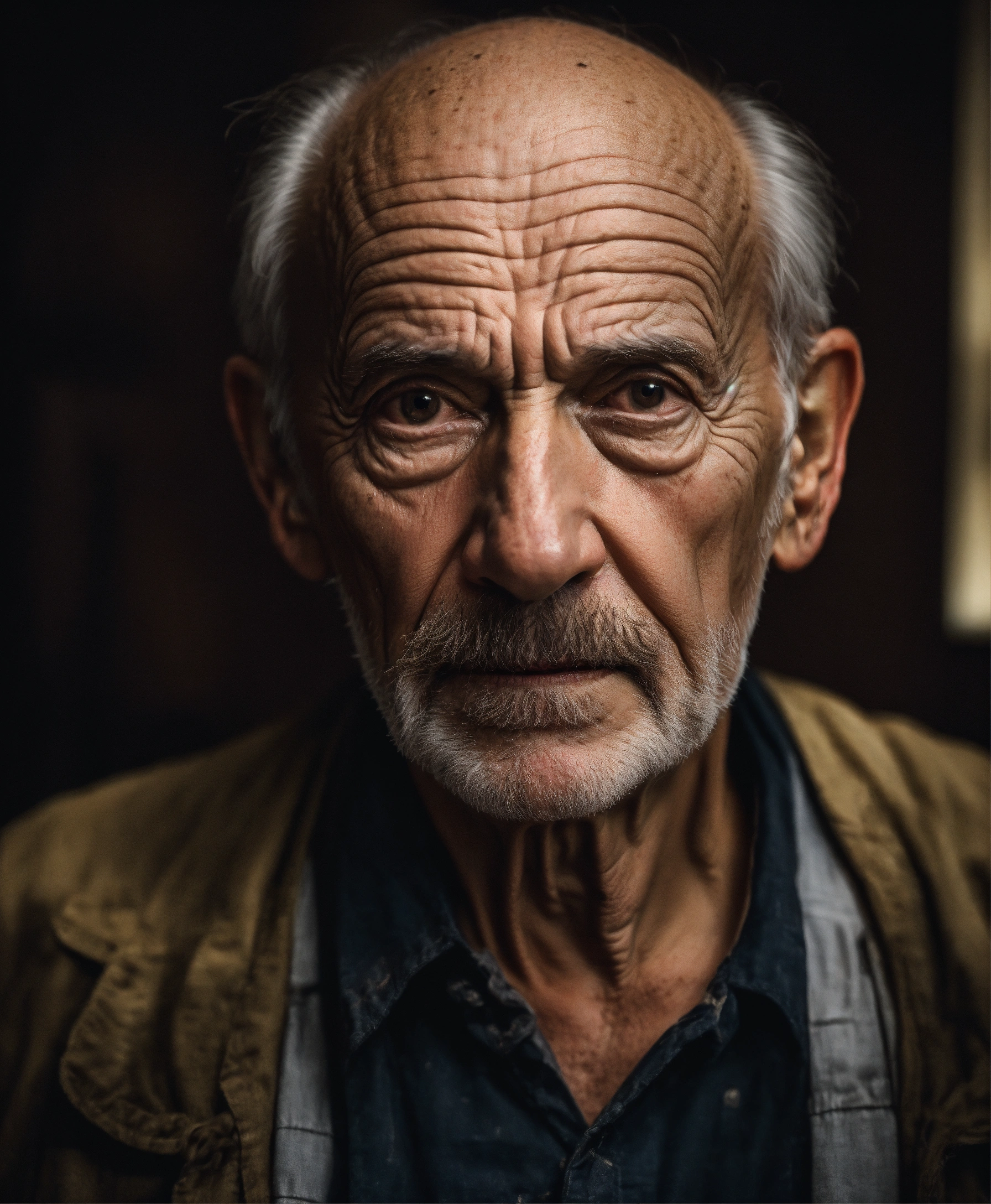 Waist-up portrait old very scary american man, picture to ththinning hair, small little eyes, with wrinkles and dark circles telling a story, dark room background