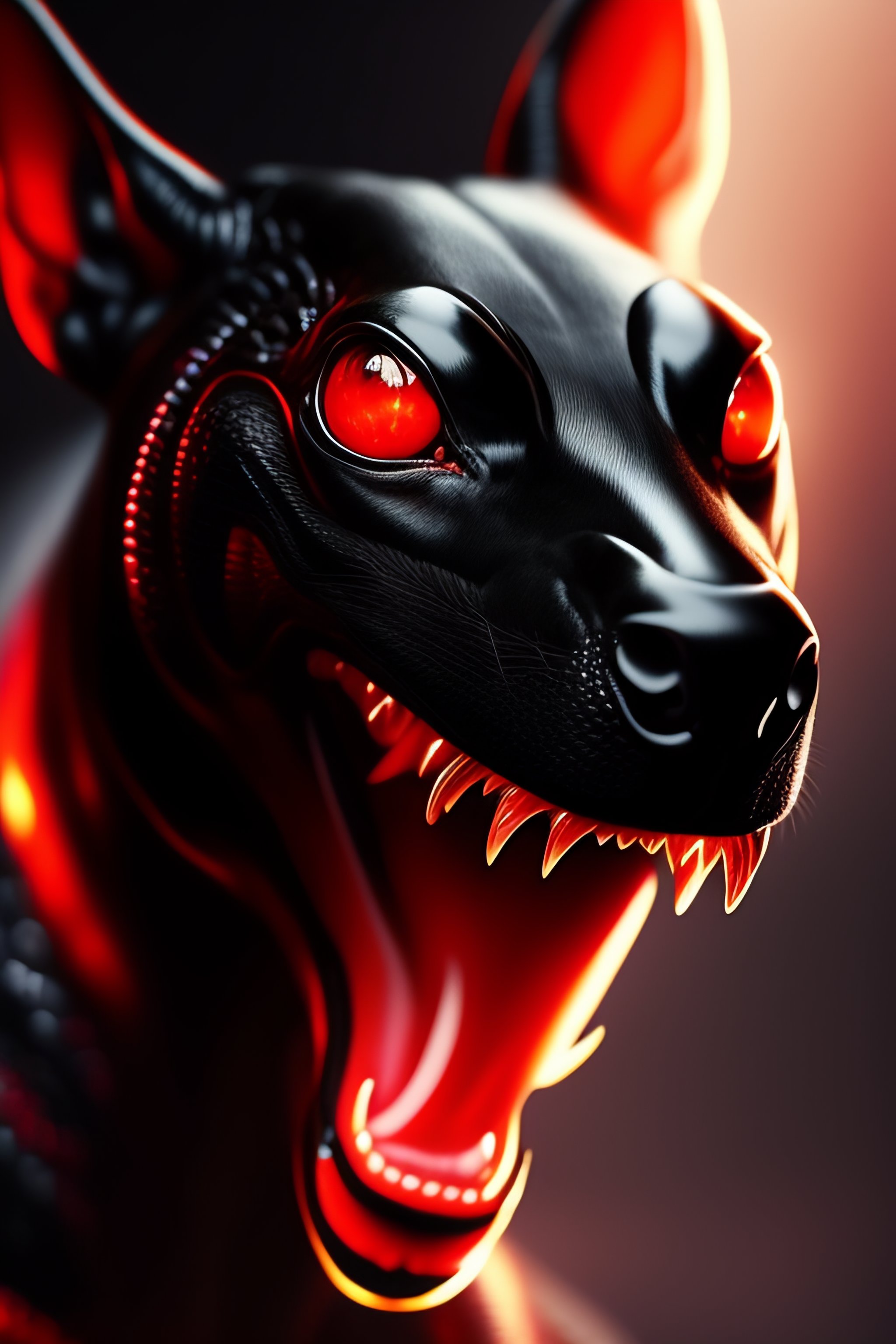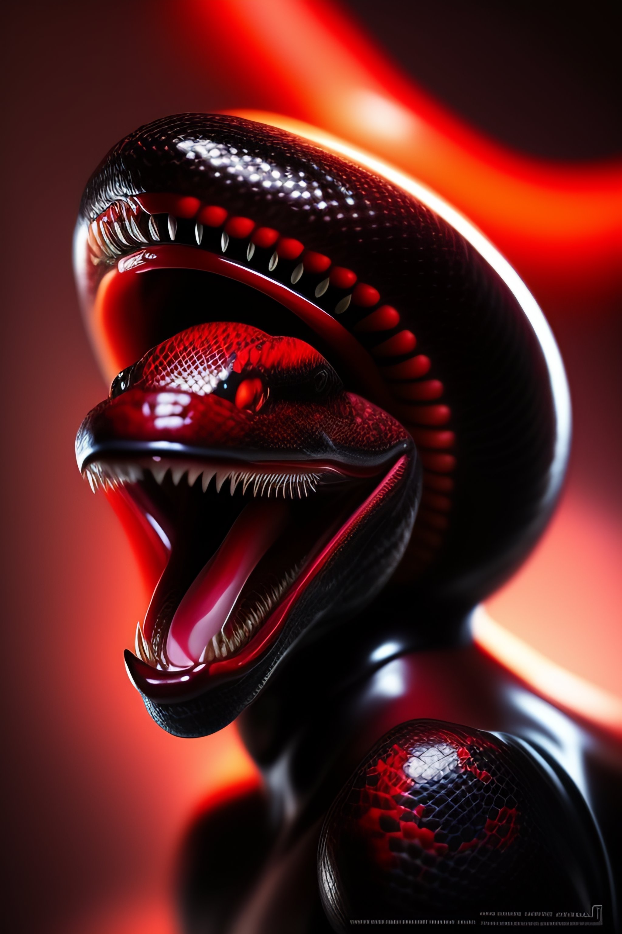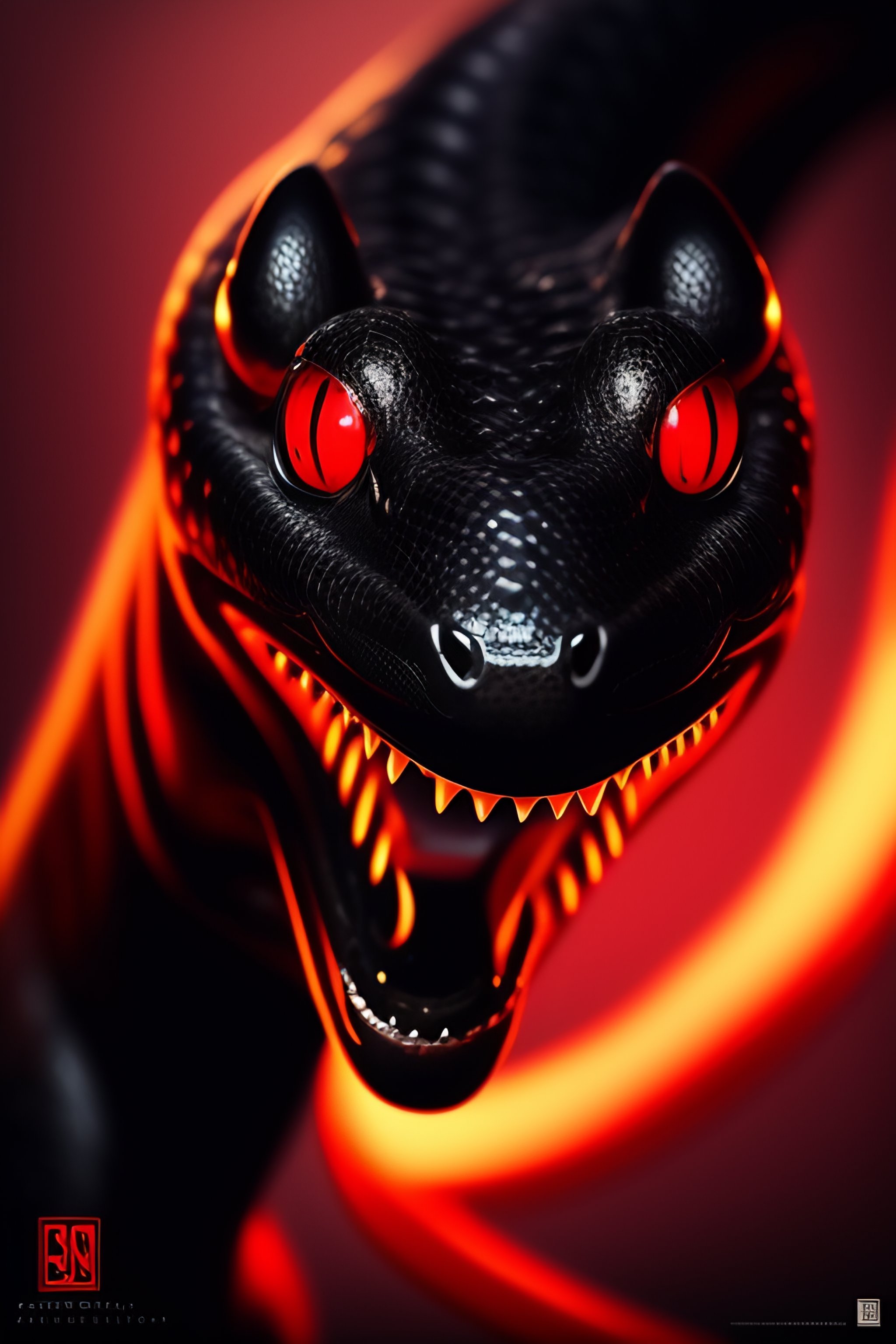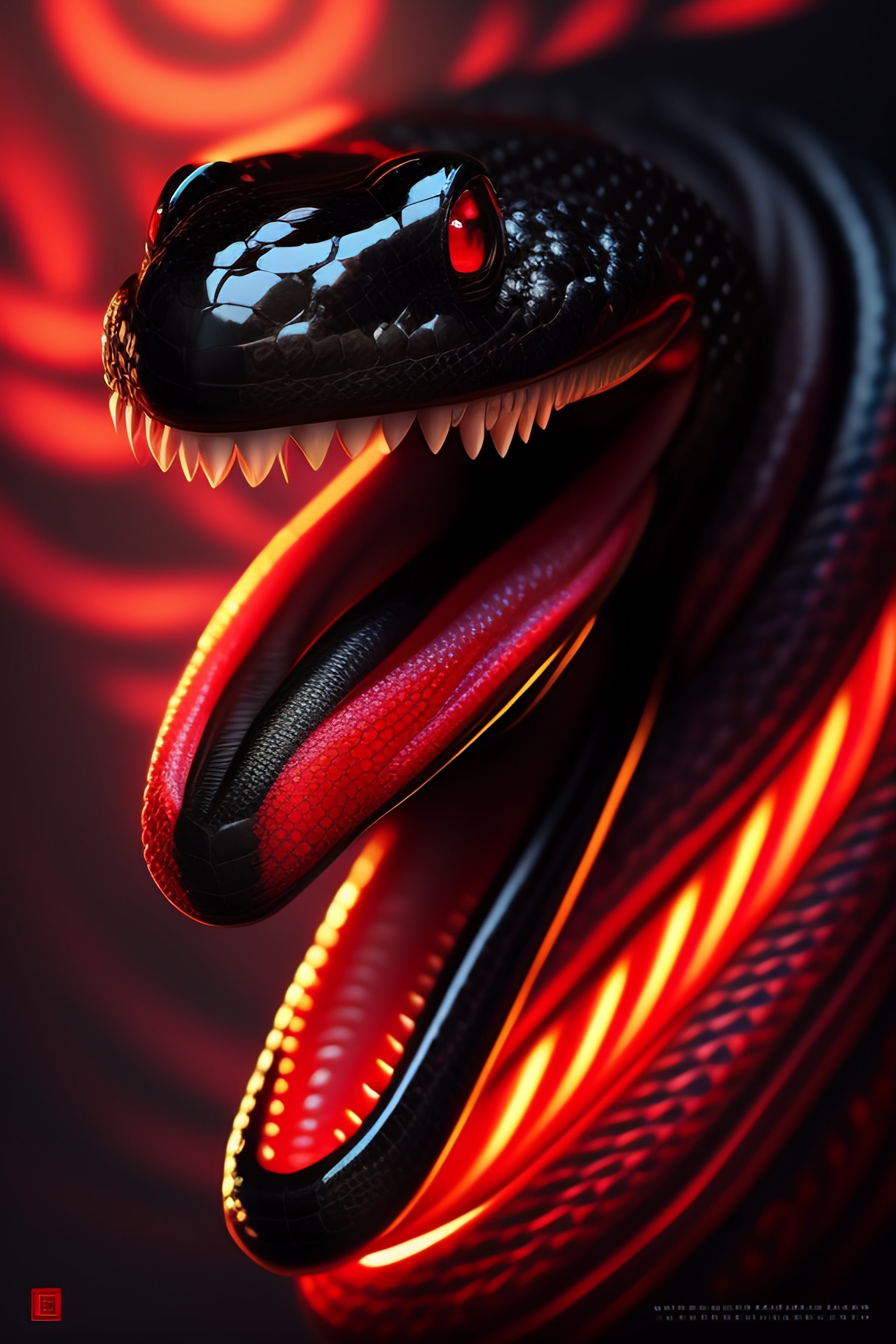 Black colored snake!, red snake eyes, toothy mouth with fangs, coiled body, threatening posture before attack, elegant pose, atmospheric lighting, cinematic composition, detail, art by artgerm