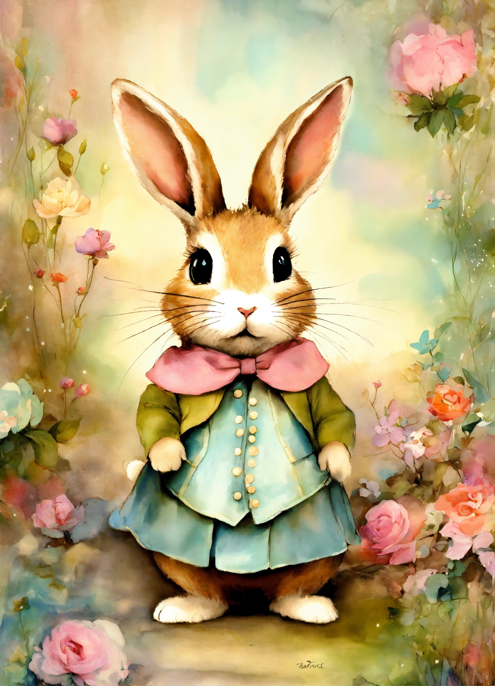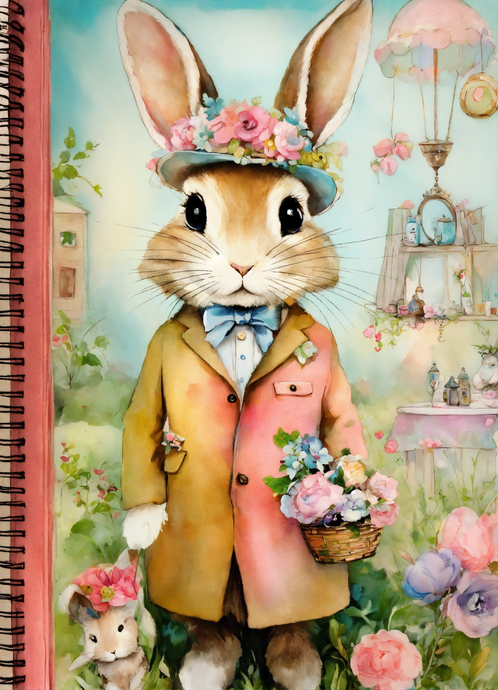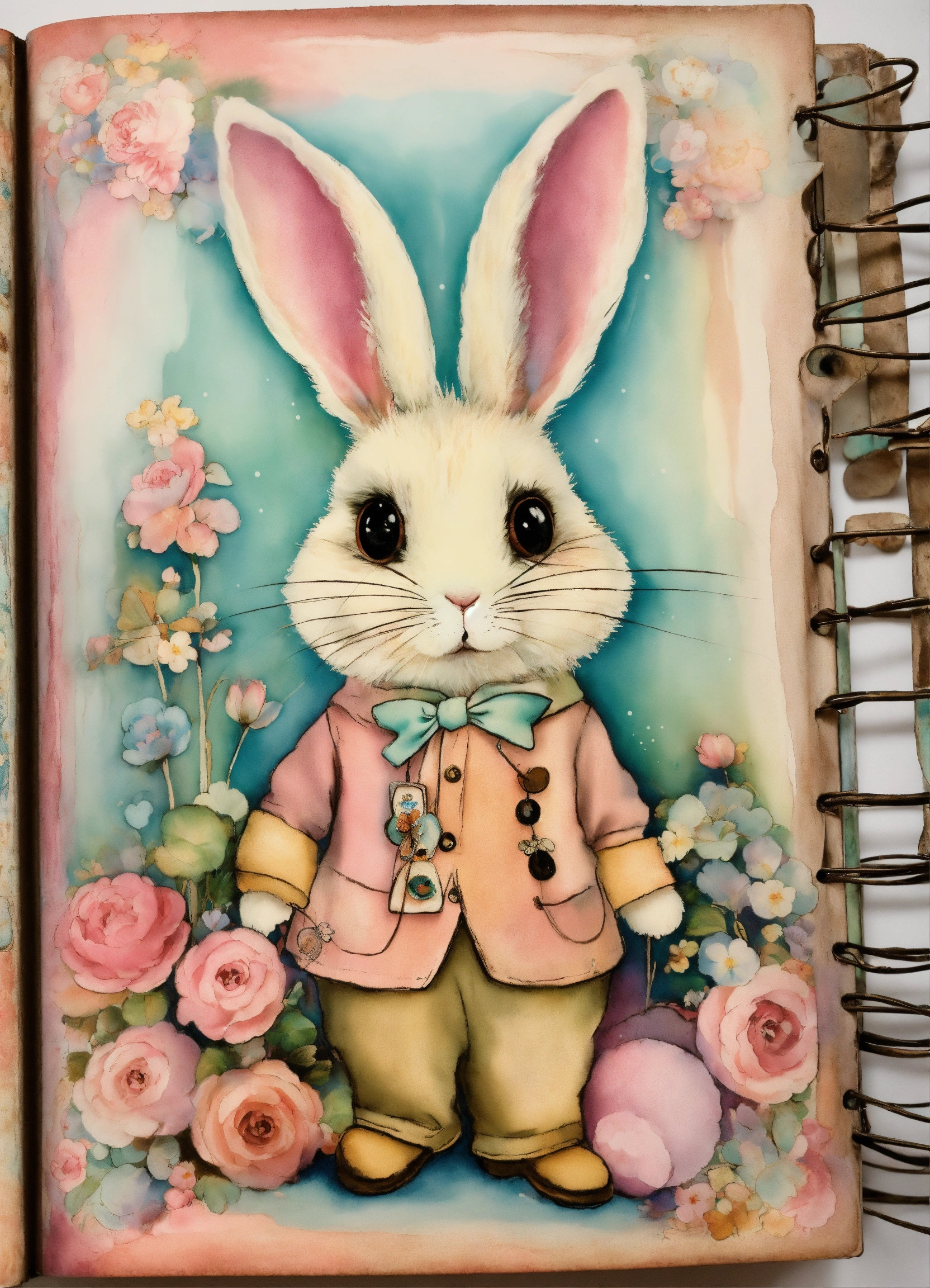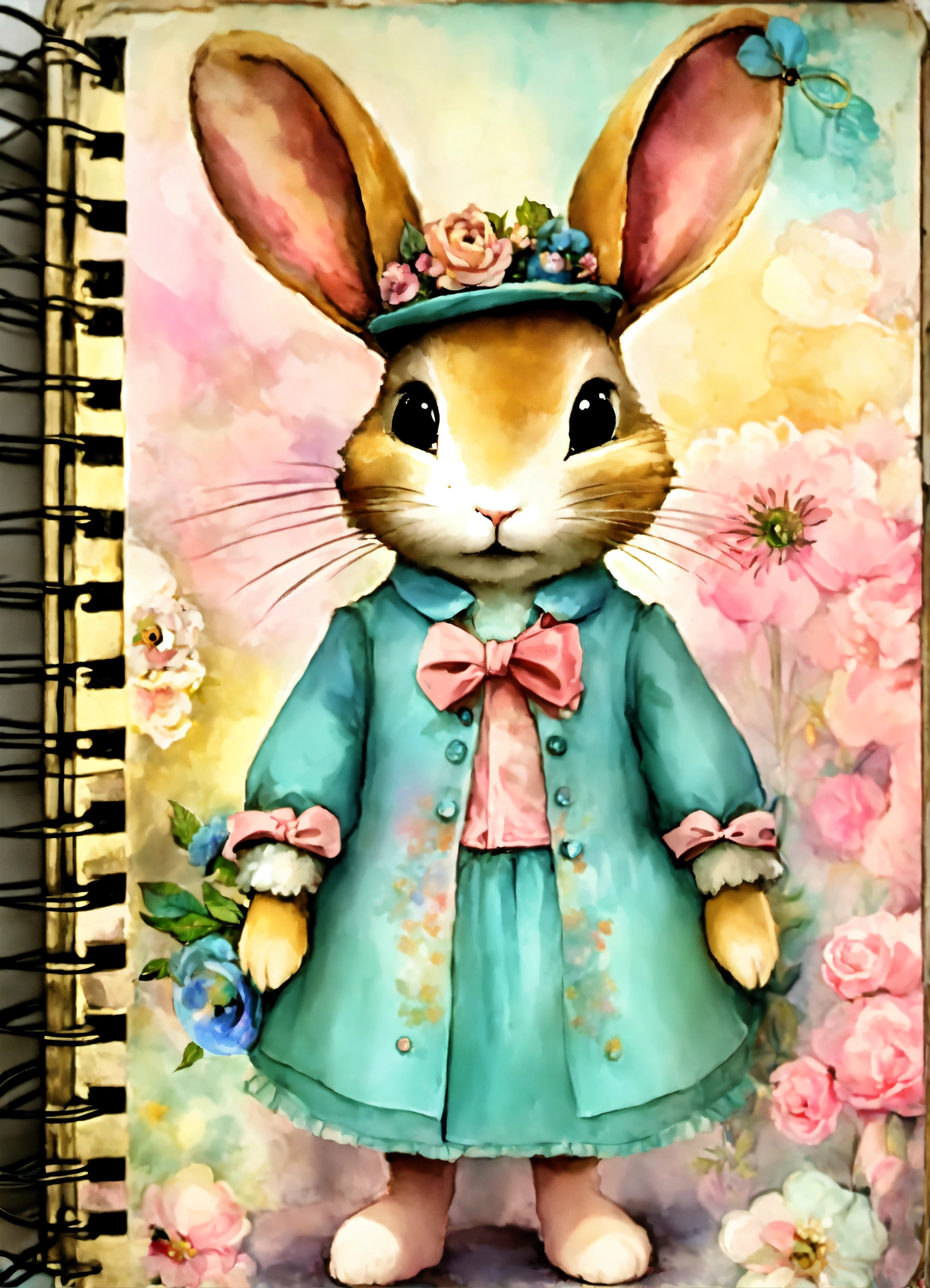 Shabby chic dreamy mist pastel junk journals whimsical cute quirky beatrix potter style "benjamin bunny" with big eyes in odd clothings, tamara laporte style, swirling magical fairytale abstract art style