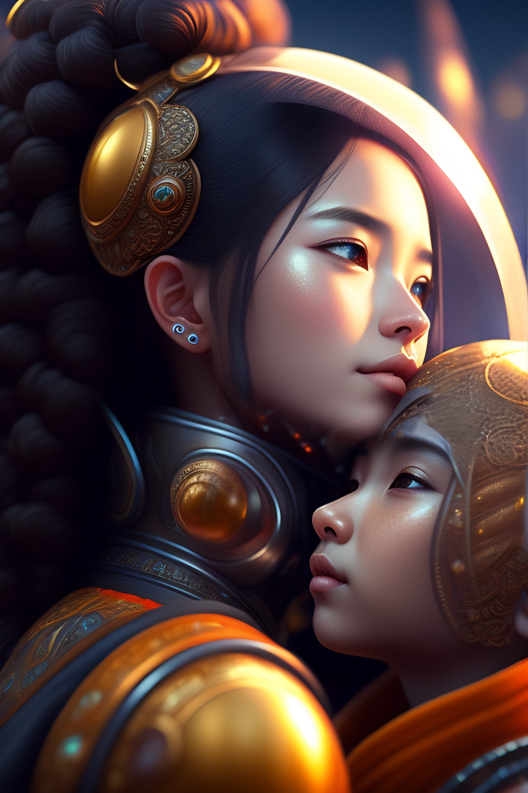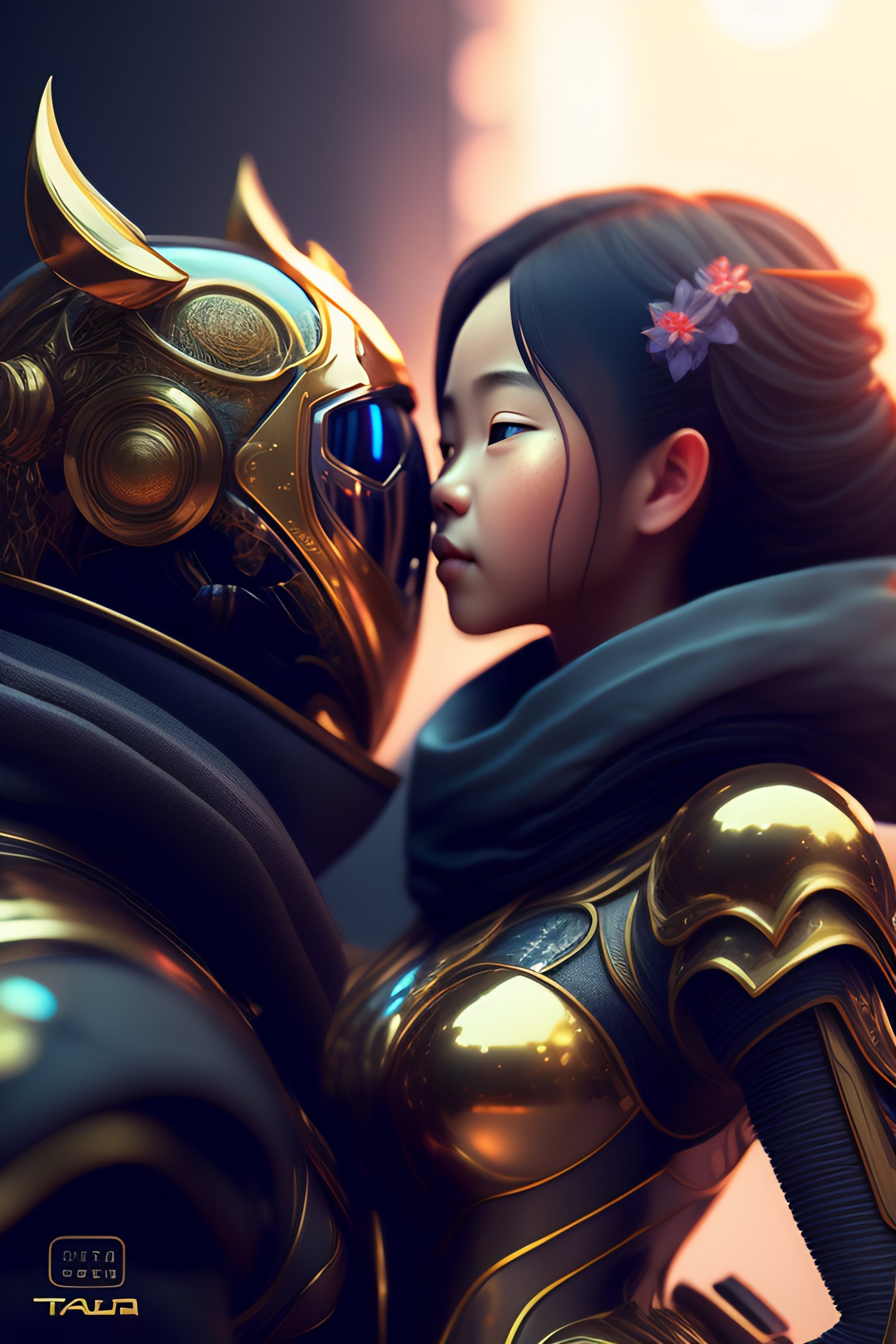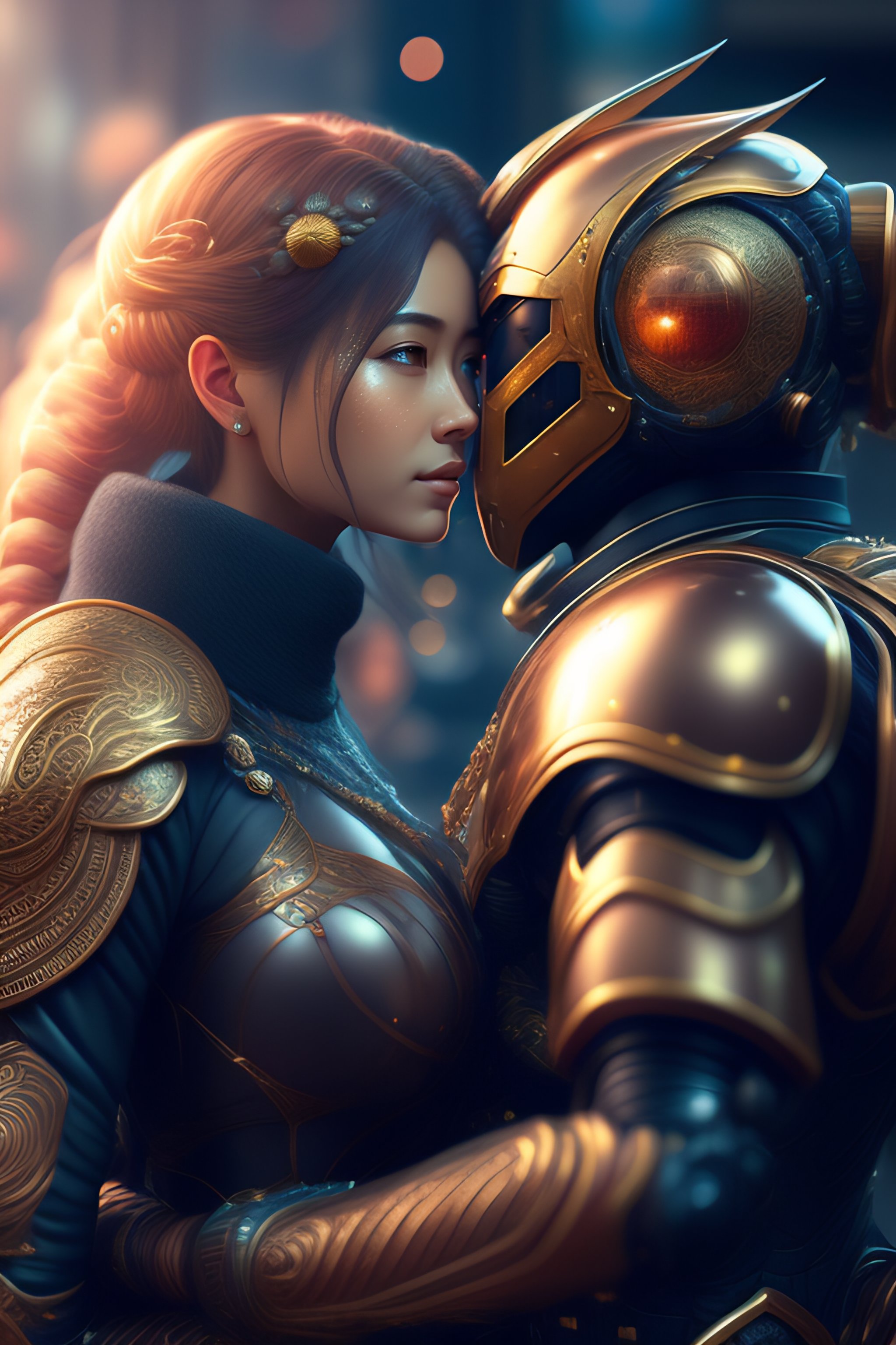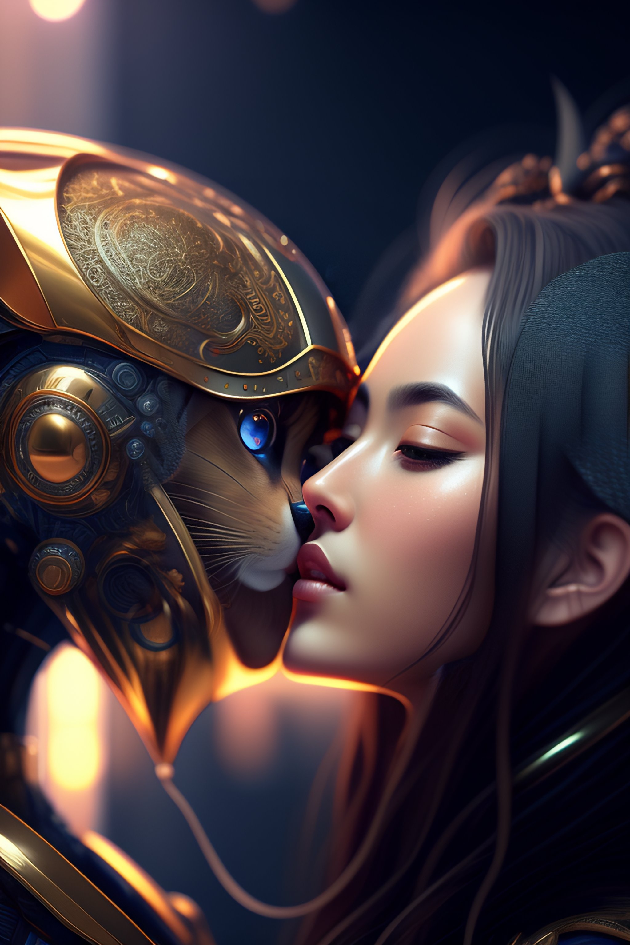Taiyo robotics nft kissing solana, epic, fantasy, intricate, hyper detailed, artstation, concept art, smooth, sharp focus, ray tracing, vibrant, photorealistic