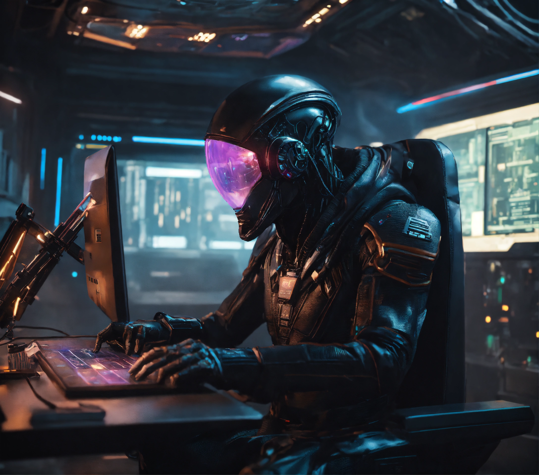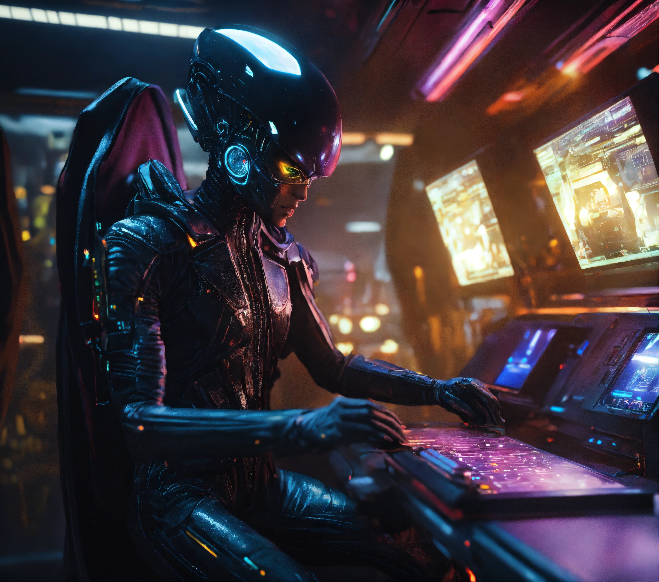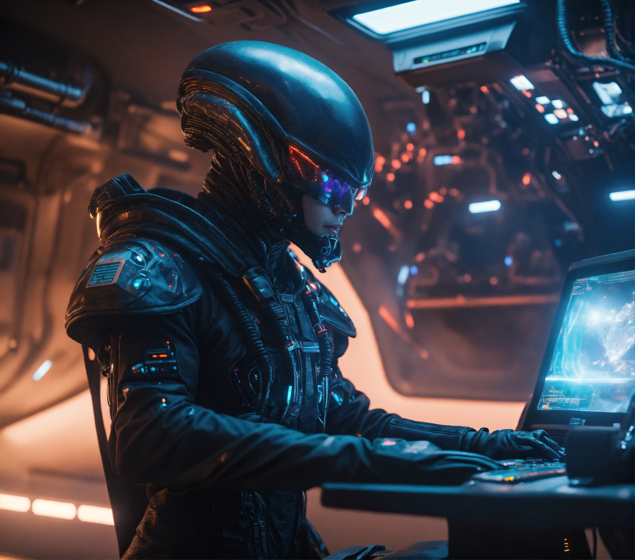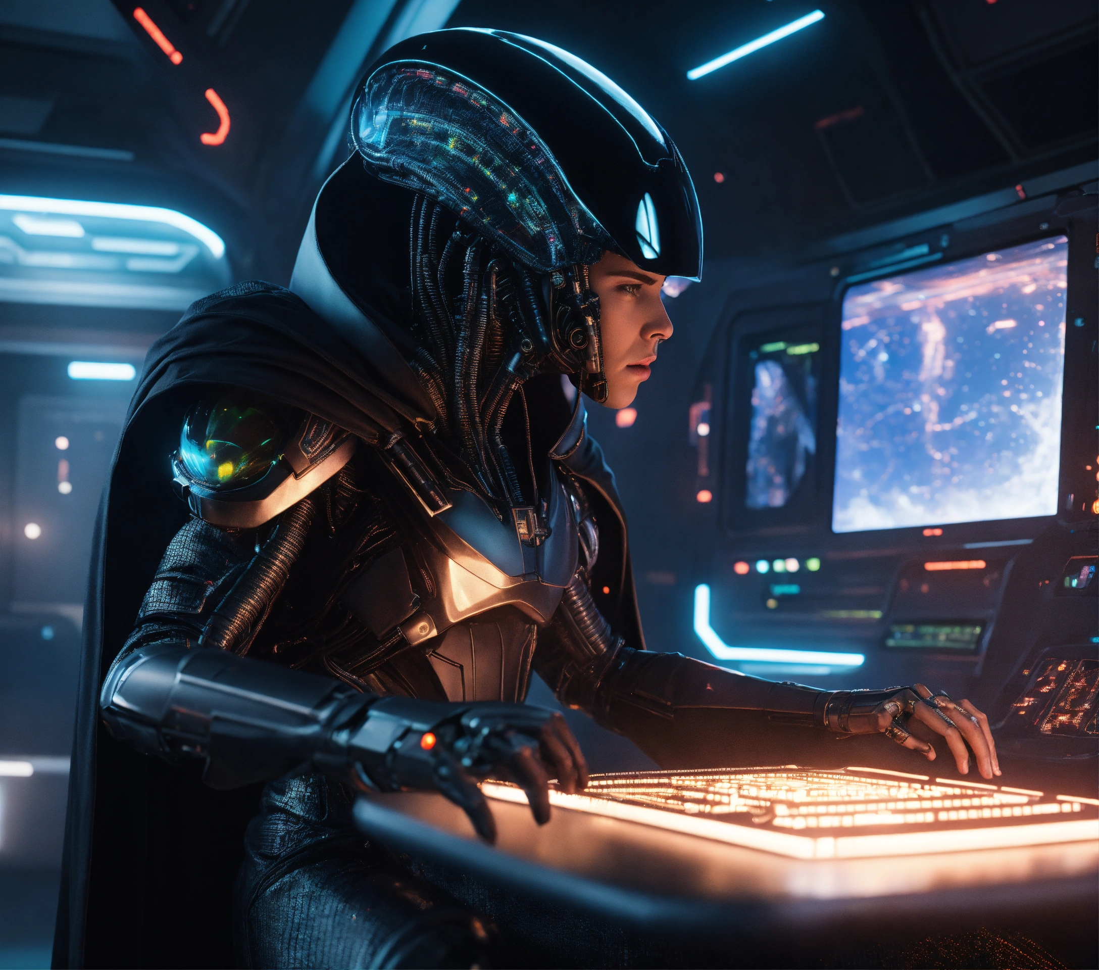 Alien mutant half cyborg half alien hacker with big brain, wearing a futuristic black clothing and cape, scalping holographic tickets in a spacecraft, sci fi, 8k, realistic, pixar