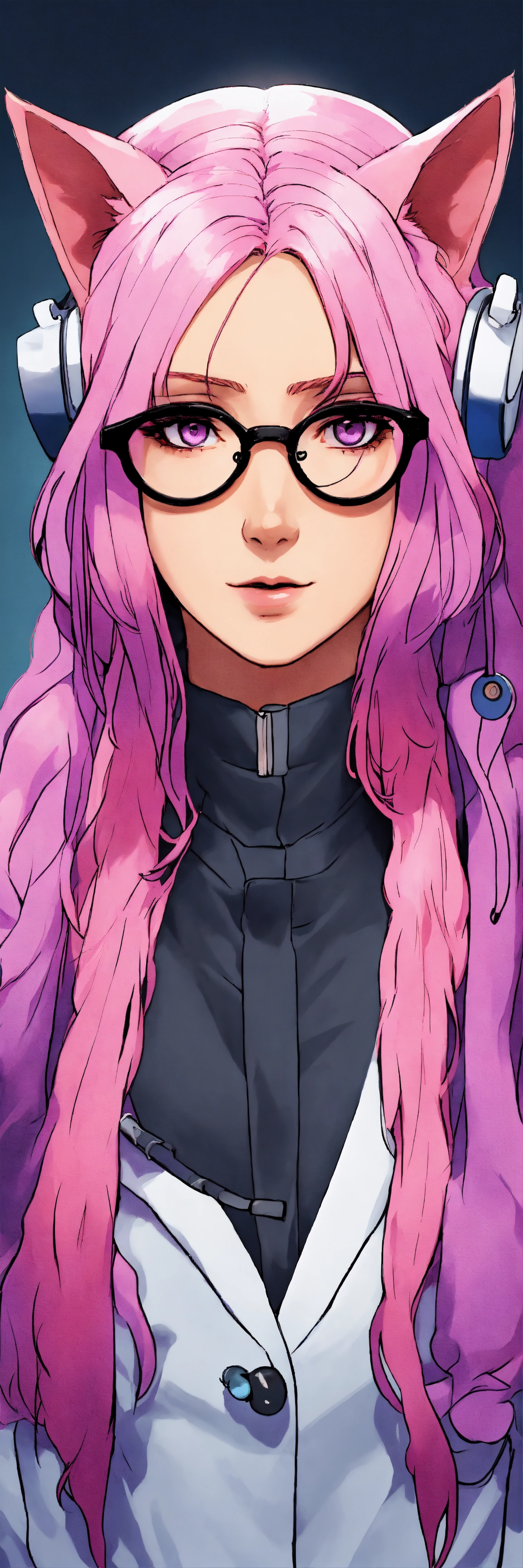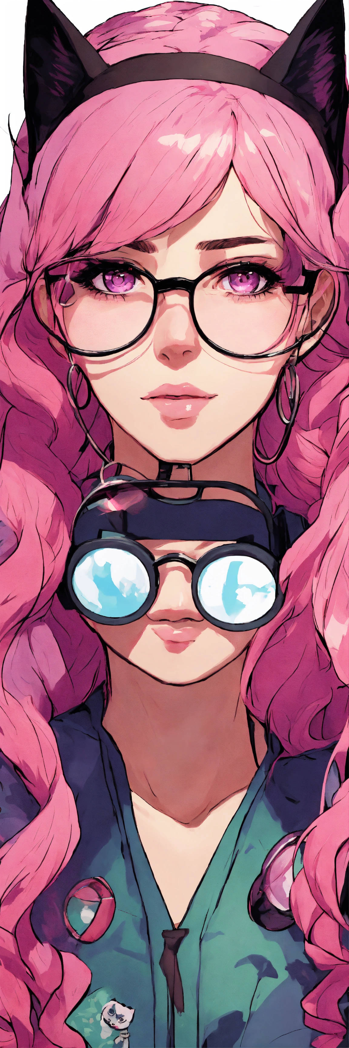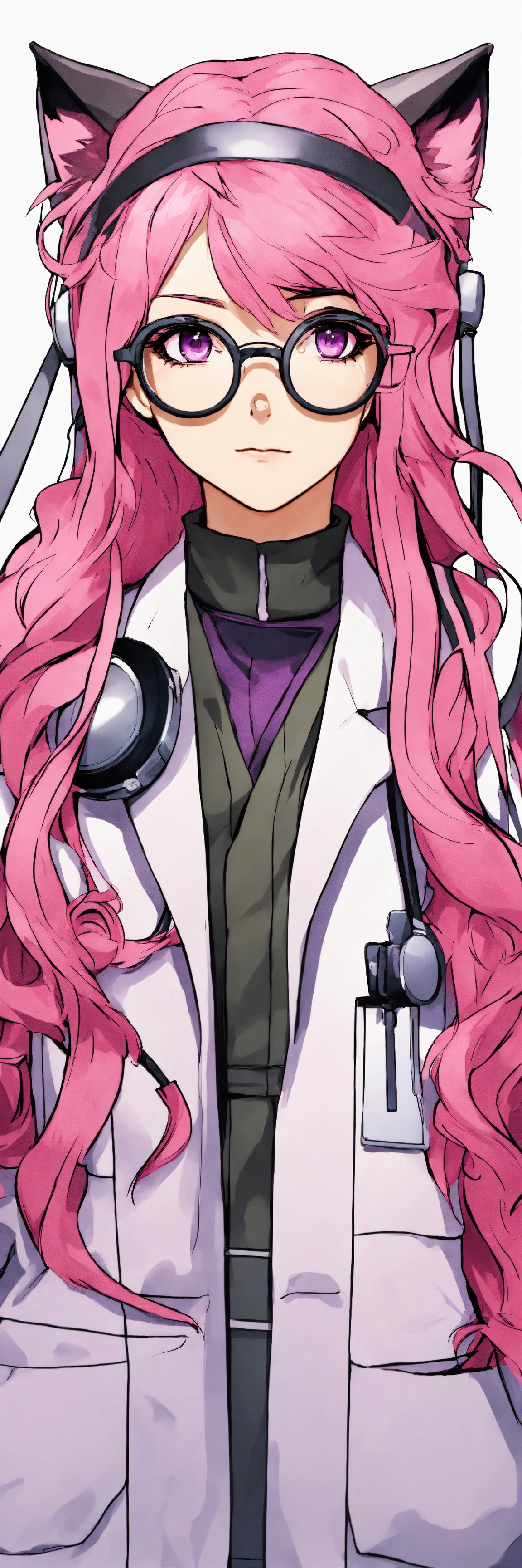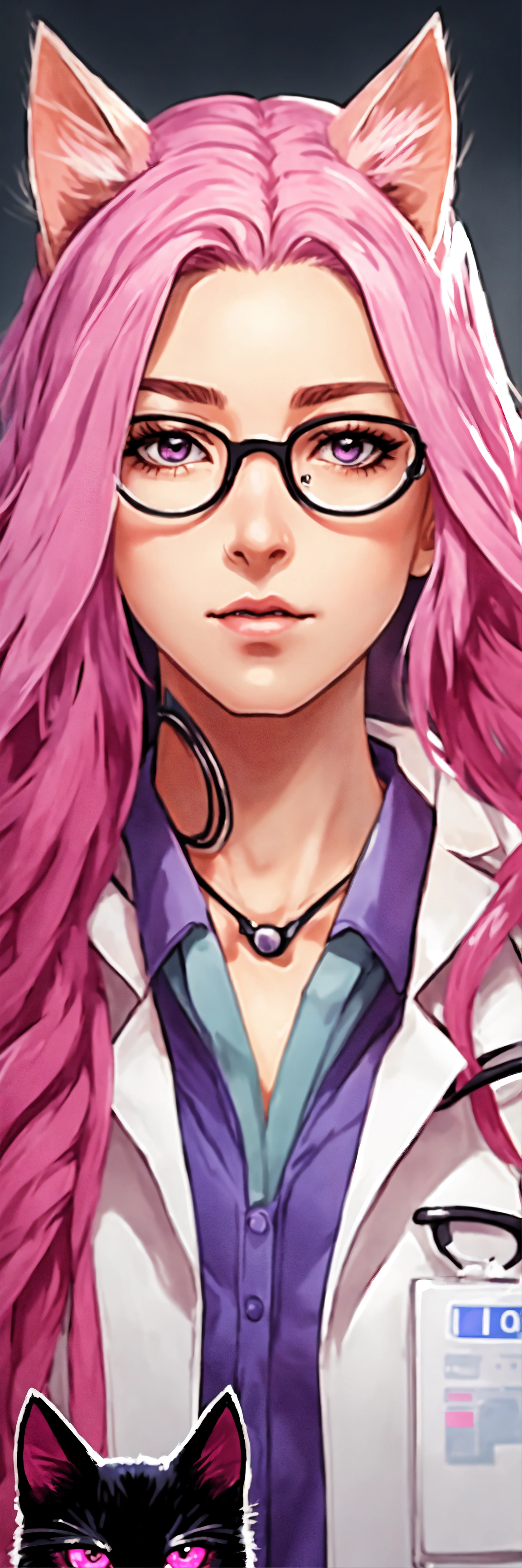 Female doctor, with long pink hair, with black cat disguise on her head, glasses and purple-pink eyes in hospital, manga style